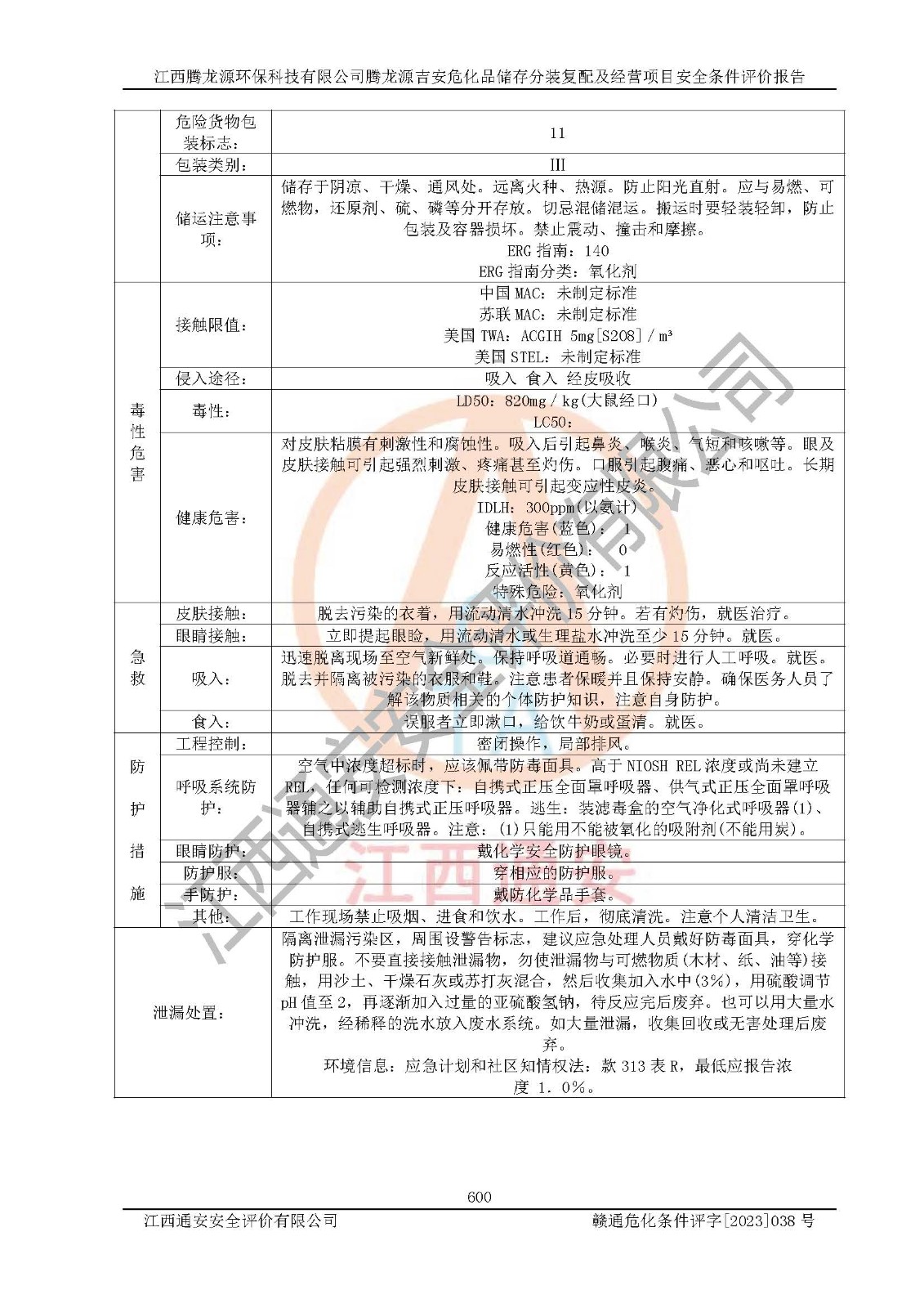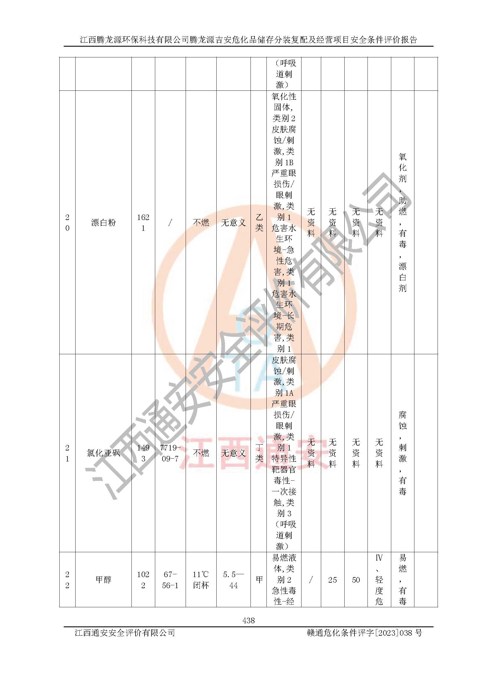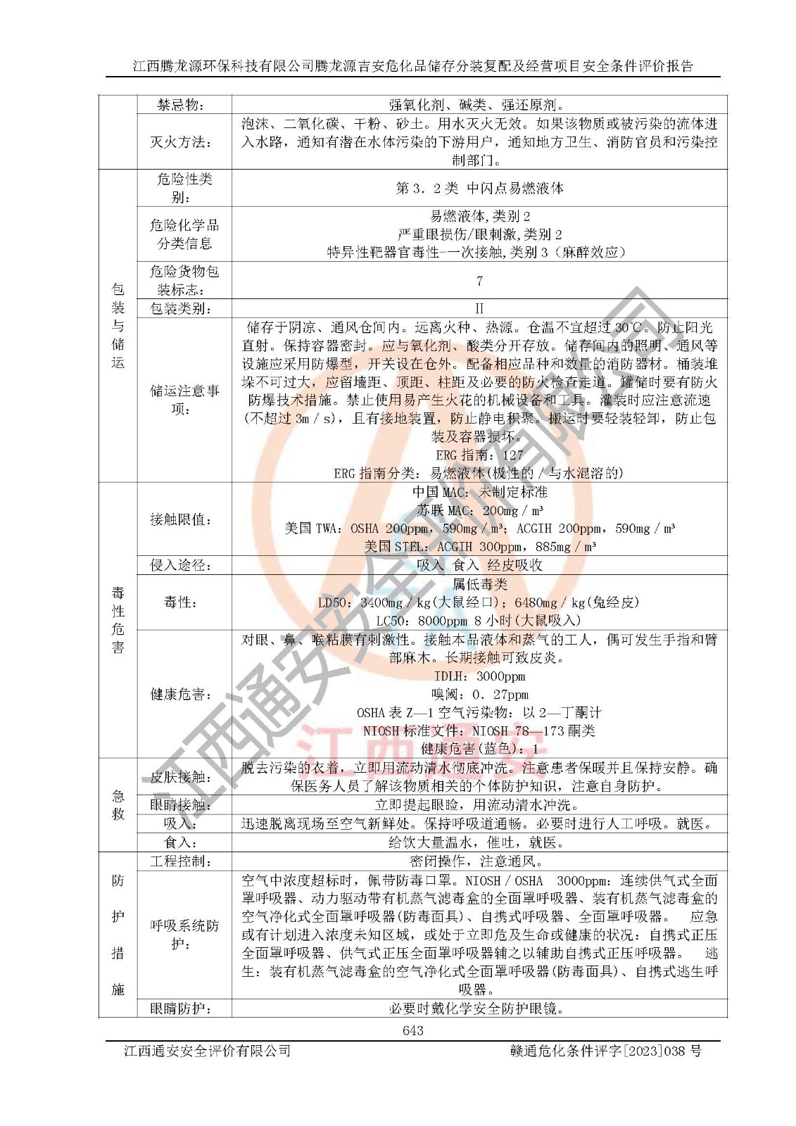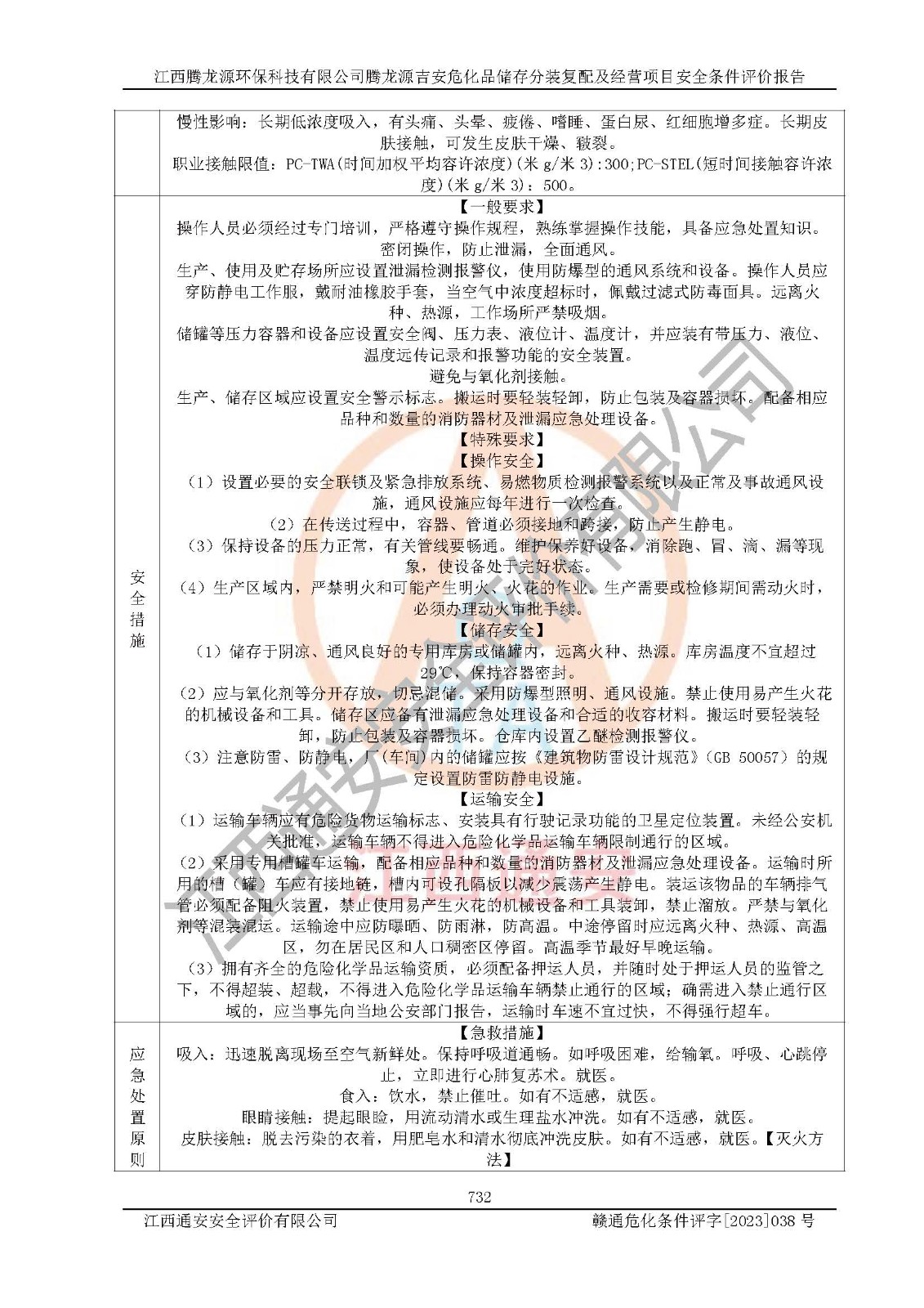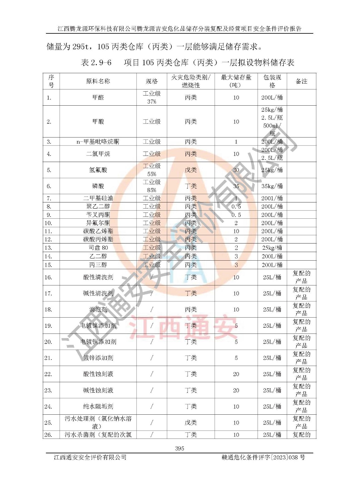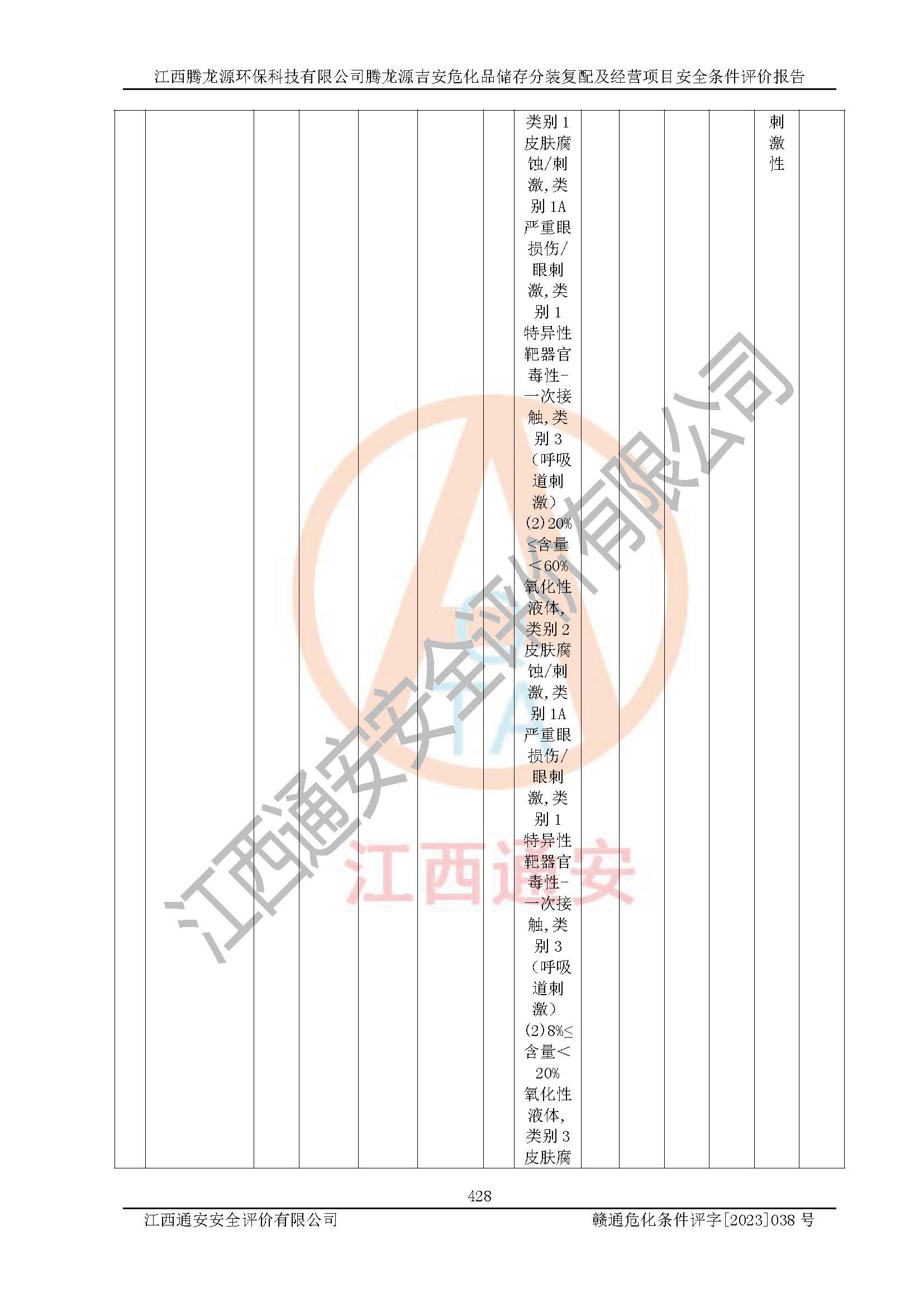 項(xiàng)目簡介 | 江西騰龍?jiān)?*科技有限公司成立于2022年6月20日,并取得吉水縣市場監(jiān)督管理局頒發(fā)的《營業(yè)執(zhí)照》,營業(yè)執(zhí)照統(tǒng)一社會信用代碼:91360822MABQK5GB5P。公司注冊住所:江西省吉安市吉水縣城西工業(yè)園區(qū)二期金龍路。法定**人:吳詩明。注冊資本壹仟萬元整。企業(yè)性質(zhì)為有限責(zé)任公司(自然人投資或控股)。營業(yè)執(zhí)照許可經(jīng)營范圍:一般項(xiàng)目:化工產(chǎn)品銷售(不含許可類化工產(chǎn)品)(除許可業(yè)務(wù)外,可自主依法經(jīng)營法律法規(guī)非禁止或限制的項(xiàng)目)。 江西騰龍?jiān)?*科技有限公司2023年2月24日取得吉水縣發(fā)展和改革委員會頒發(fā)的《江西省企業(yè)投資項(xiàng)目備案通知書》,備案項(xiàng)目名稱為:騰龍?jiān)醇参;穬Υ娣盅b復(fù)配及經(jīng)營項(xiàng)目。項(xiàng)目統(tǒng)一代碼為:2302-360822-04-01-318980。項(xiàng)目總投資20000萬元,項(xiàng)目總占地面積31.34畝。 根據(jù)《危險(xiǎn)化學(xué)品目錄(2015版)》(**安監(jiān)總局等十部門公告[2015]第5號)及應(yīng)急管理部、工業(yè)和信息化部、公安部、生態(tài)環(huán)境部、交通運(yùn)輸部、農(nóng)業(yè)農(nóng)村部、衛(wèi)生健康委、市場監(jiān)管總局、鐵路局、民航局決定調(diào)整《危險(xiǎn)化學(xué)品目錄(2015版)》(應(yīng)急管理部、工業(yè)和信息化部、公安部、生態(tài)環(huán)境部、交通運(yùn)輸部、農(nóng)業(yè)農(nóng)村部、衛(wèi)生健康委、市場監(jiān)管總局、鐵路局、民航局公告2022年第8號)等文件對該項(xiàng)目生產(chǎn)過程中所涉及的化學(xué)品進(jìn)行辨識:項(xiàng)目涉及的硫酸、鹽酸、雙氧水、硝酸、氫氧化鈉(固體和溶液)、次氯酸鈉溶液、氯酸鈉、氯酸鉀、鉻酸酐、高錳酸鈉、高錳酸鉀、硝酸鉀、重鉻酸鉀、重鉻酸鈉、硝酸鈉、亞硝酸鈉、過硫酸鈉、過硫酸銨、過硫酸鉀、漂白粉、氯化亞砜、甲醇、乙醇、二甲苯、甲苯、**、天那水、乙酸、乙酸乙酯、甲醛溶液、三氯乙烯、正丁醇、異丙醇、石油醚、醋酸酐、甲基乙基酮(丁酮)、三氯甲烷、乙醚、氨水(20%)、甲酸、二氯甲烷、**苯、乙酸丁酯、氫氟酸、磷酸、硫化鈉(無水)、氫氧化鉀、氨基磺酸、三氯化鐵、九水硝酸鐵、氯化鋅、硫脲、硼酸、硫酸鎳、氯化鎳、氟化氫銨、氟化氫鉀、氟化氫鈉、偏硅酸鈉、九水偏硅酸鈉、氟硅酸鈉、亞硫酸氫鈉、氟化鈉、氟化鉀、六次甲基四胺、結(jié)晶氯化鋁、碳酸二乙酯、碳酸二甲酯、酸性清洗劑、退鍍劑、開油水、洗網(wǎng)水、污水殺菌劑(復(fù)配的次氯酸鈉溶液)、電解液等屬于危險(xiǎn)化學(xué)品。 江西騰龍?jiān)?*科技有限公司騰龍?jiān)醇参;穬Υ娣盅b復(fù)配及經(jīng)營項(xiàng)目只進(jìn)行物理混合復(fù)配、分裝等作業(yè),不涉及化學(xué)反應(yīng)過程。因此該公司?;穫}儲經(jīng)營活動需要辦理《危險(xiǎn)化學(xué)品經(jīng)營許可證》。 根據(jù)《中華人民共和國監(jiān)控化學(xué)品管理?xiàng)l例》(中華人民共和國***令**90號,經(jīng)中華人民共和國***令第588號修改)及《各類監(jiān)控化學(xué)品名錄》(中華人民共和國工業(yè)和信息化部令第52號;2020年)、《列入第三類監(jiān)控化學(xué)品的新增品種清單》**石油和化學(xué)工業(yè)局令**號等規(guī)定進(jìn)行辨識:項(xiàng)目涉及的氯化亞砜屬于第三類監(jiān)控化學(xué)品。 根據(jù)《易制毒化學(xué)品管理?xiàng)l例》(***令第445號,經(jīng)***令第653號、***第666號、***第703號修改)及附表規(guī)定、中華人民共和國公安部 中華人民共和國商務(wù)部、**衛(wèi)生和計(jì)劃生育委員會、中華人民共和國海關(guān)總署、**安全生產(chǎn)監(jiān)督管理總局、**食品藥品監(jiān)督管理總局《關(guān)于將4-苯胺基-N-苯乙基哌啶、N-苯乙基-4-哌啶酮、N-甲基-1-苯基-1-氯-2-丙胺、溴素、1-苯基-1-**5種物質(zhì)列入易制毒化學(xué)品管理的公告》(國辦函[2017]**20號)、《***辦公廳關(guān)于同意將1-苯基-2-溴-1-**和3-氧-2-苯基丁腈列入易制毒化學(xué)品品種目錄的函》(國辦函[2014]第40號)、《***辦公廳關(guān)于同意將α-苯乙酰乙酸甲酯等6種物質(zhì)列入易制毒化學(xué)品品種目錄的函》(國辦函〔2021〕58號)等進(jìn)行辨識:項(xiàng)目涉及的硫酸、鹽酸、高錳酸鉀、甲苯、**、甲基乙基酮等屬于第三類易制毒化學(xué)品;醋酸酐、三氯甲烷、乙醚等屬于第二類易制毒化學(xué)品。 根據(jù)《危險(xiǎn)化學(xué)品名錄[2015年版]》(**安監(jiān)總局等十部門[2015]第5號)進(jìn)行劇毒化學(xué)品辨識:項(xiàng)目不涉及劇毒化學(xué)品。 根據(jù)《高毒物品目錄(2003年版)》(原衛(wèi)生部衛(wèi)法監(jiān)發(fā)[2003]142號)對項(xiàng)目涉及的化學(xué)品進(jìn)行高毒物品辨識:項(xiàng)目涉及的甲醛溶液、硫酸鎳、氯化鎳、氟化氫銨、氟化氫鉀、氟化氫鈉、氟化鈉、氟化鉀、鉻酸酐、高錳酸鉀、高錳酸鈉、重鉻酸鉀、重鉻酸鈉等屬于高毒物品。 根據(jù)中華人民共和國公安部《易制爆危險(xiǎn)化學(xué)品名錄》(2017年版)中規(guī)定進(jìn)行辨識:項(xiàng)目涉及的雙氧水、硝酸、氯酸鈉、氯酸鉀、高錳酸鉀、高錳酸鈉、硝酸鉀、重鉻酸鉀、重鉻酸鈉、硝酸鈉、六次甲基四胺等屬于易