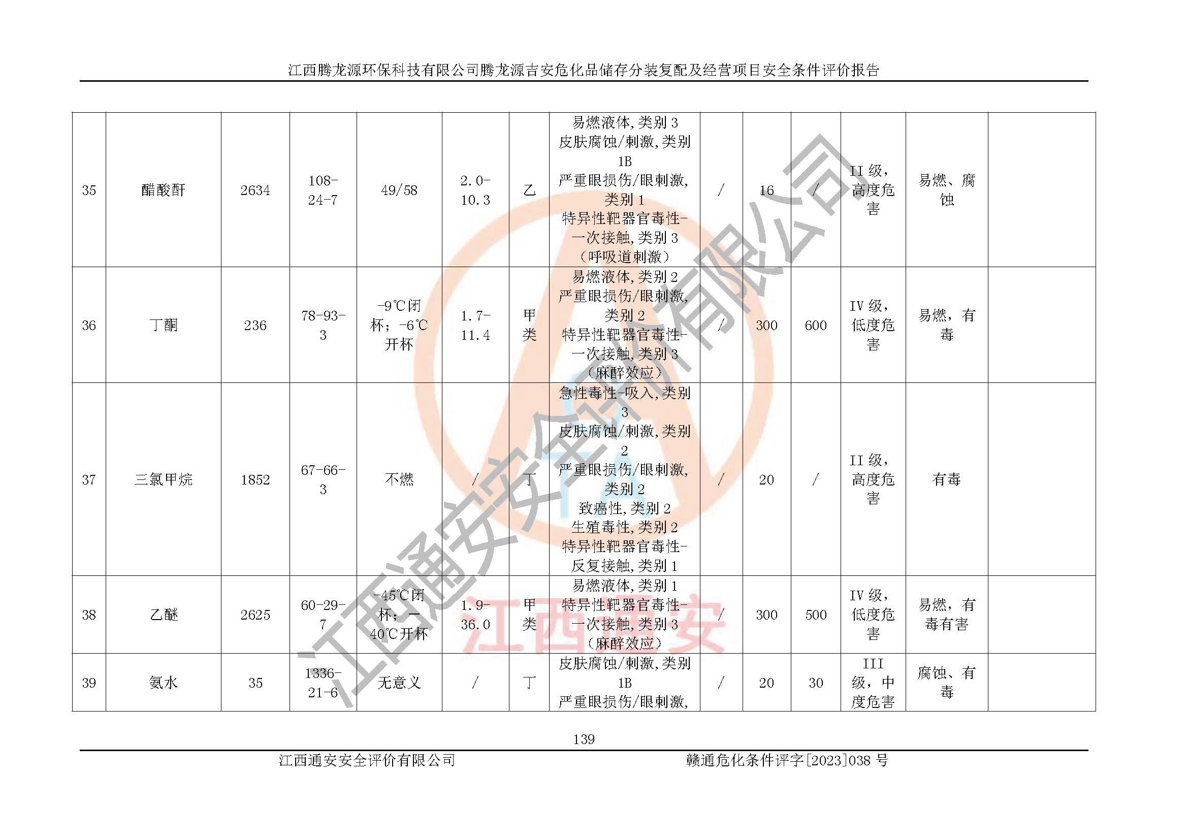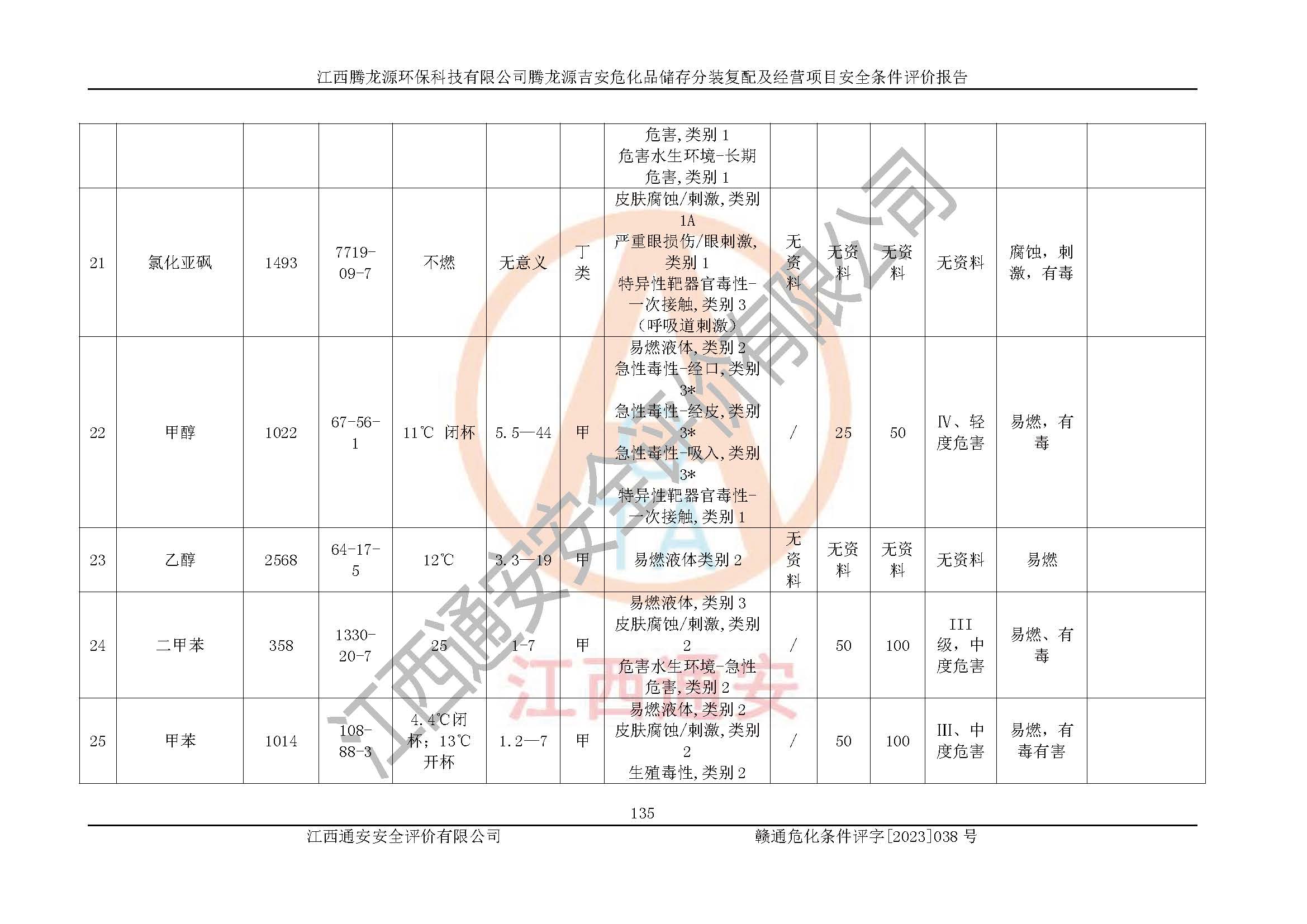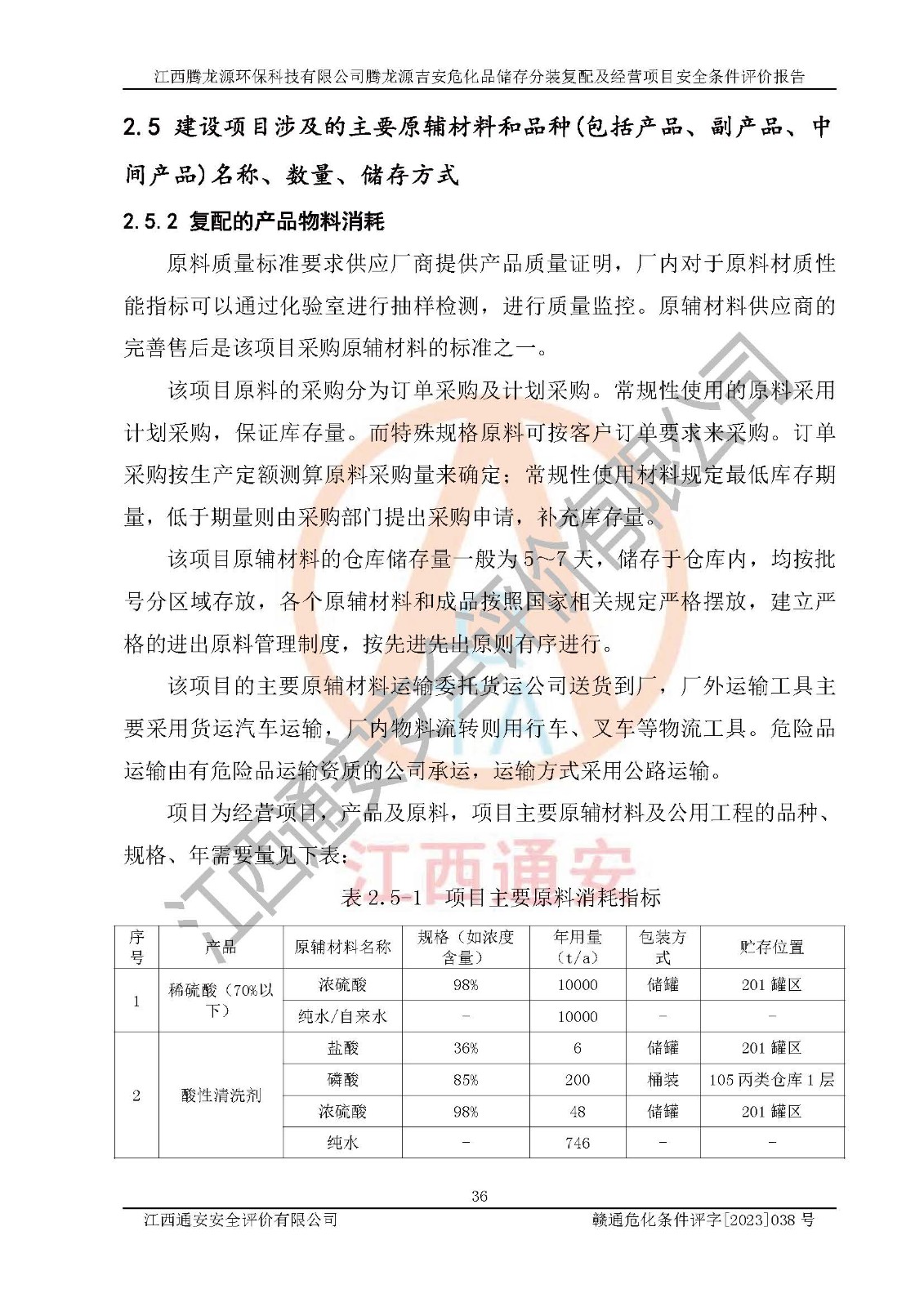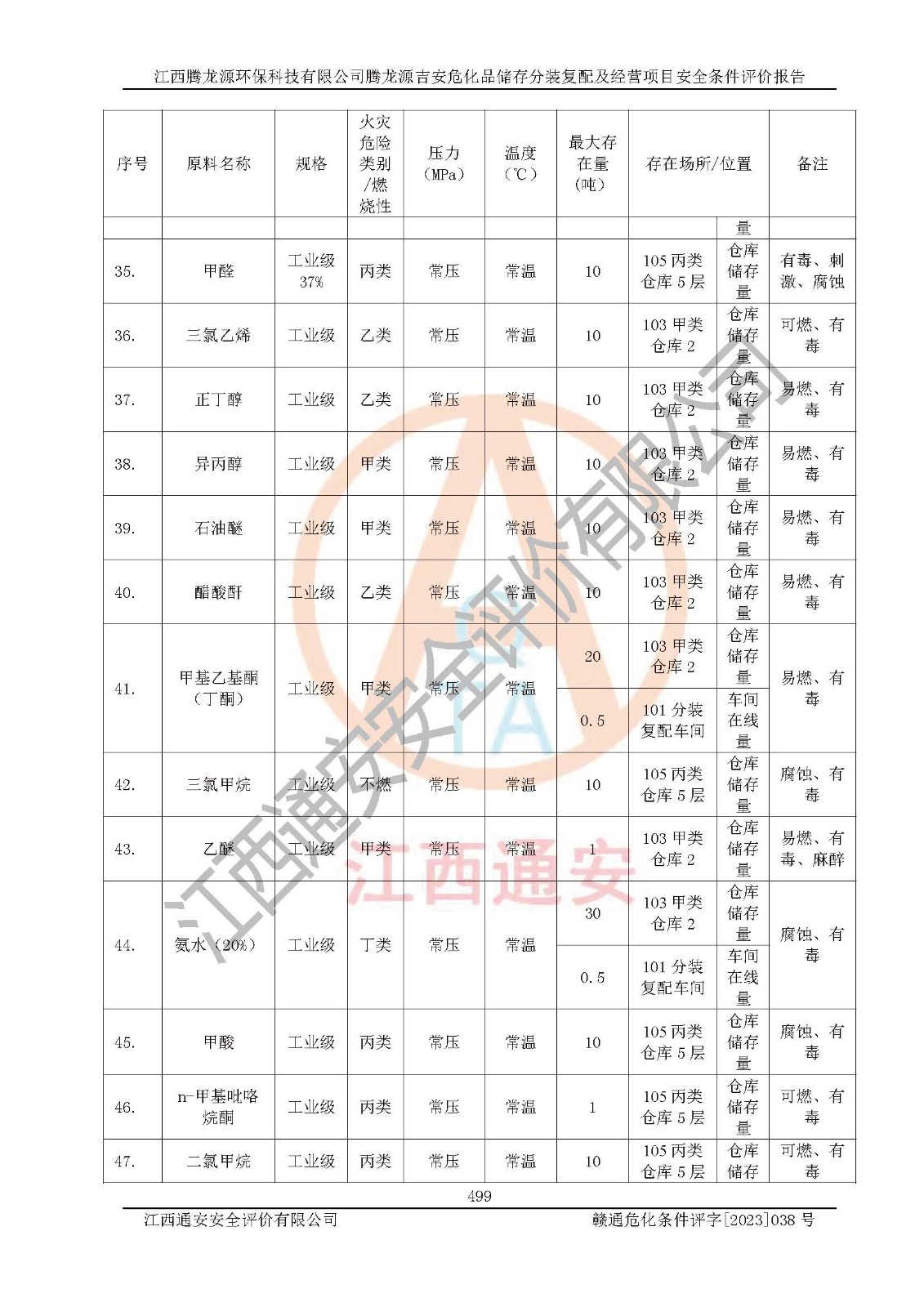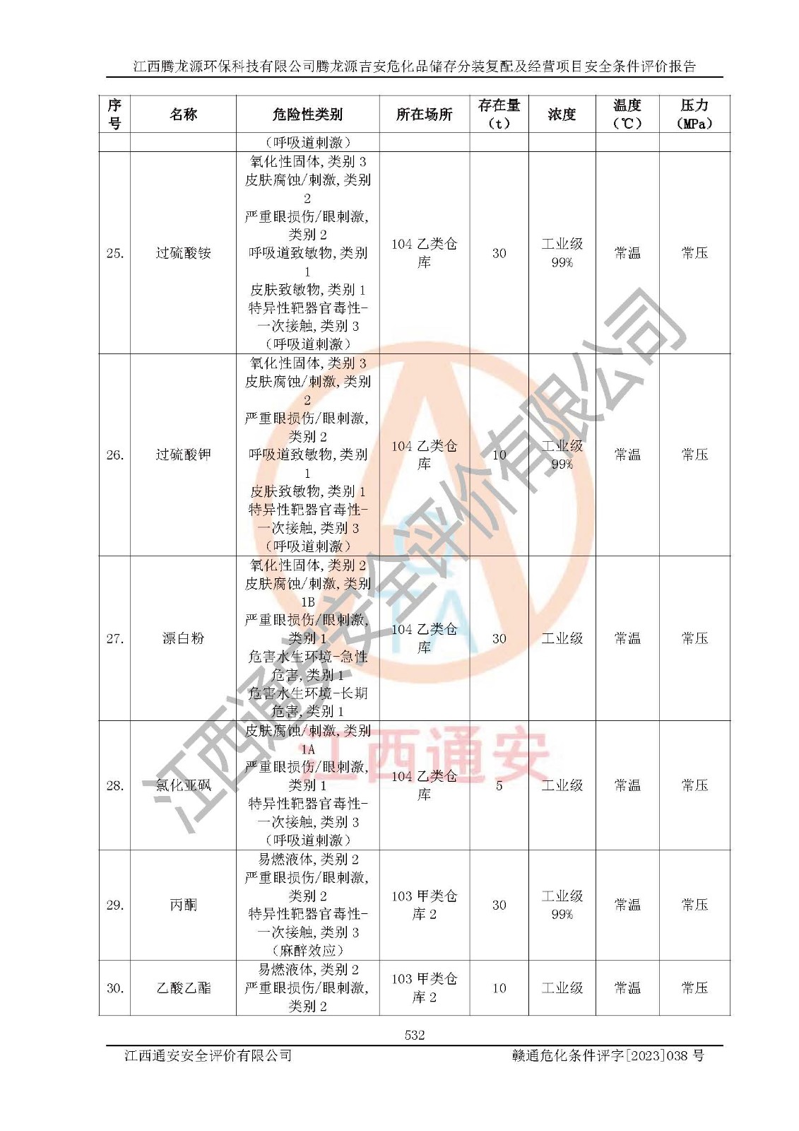 項(xiàng)目簡介 | 江西騰龍?jiān)?*科技有限公司成立于2022年6月20日,并取得吉水縣市場監(jiān)督管理局頒發(fā)的《營業(yè)執(zhí)照》,營業(yè)執(zhí)照統(tǒng)一社會信用代碼:91360822MABQK5GB5P。公司注冊住所:江西省吉安市吉水縣城西工業(yè)園區(qū)二期金龍路。法定**人:吳詩明。注冊資本壹仟萬元整。企業(yè)性質(zhì)為有限責(zé)任公司(自然人投資或控股)。營業(yè)執(zhí)照許可經(jīng)營范圍:一般項(xiàng)目:化工產(chǎn)品銷售(不含許可類化工產(chǎn)品)(除許可業(yè)務(wù)外,可自主依法經(jīng)營法律法規(guī)非禁止或限制的項(xiàng)目)。 江西騰龍?jiān)?*科技有限公司2023年2月24日取得吉水縣發(fā)展和改革委員會頒發(fā)的《江西省企業(yè)投資項(xiàng)目備案通知書》,備案項(xiàng)目名稱為:騰龍?jiān)醇参;穬Υ娣盅b復(fù)配及經(jīng)營項(xiàng)目。項(xiàng)目統(tǒng)一代碼為:2302-360822-04-01-318980。項(xiàng)目總投資20000萬元,項(xiàng)目總占地面積31.34畝。 根據(jù)《危險(xiǎn)化學(xué)品目錄(2015版)》(**安監(jiān)總局等十部門公告[2015]第5號)及應(yīng)急管理部、工業(yè)和信息化部、公安部、生態(tài)環(huán)境部、交通運(yùn)輸部、農(nóng)業(yè)農(nóng)村部、衛(wèi)生健康委、市場監(jiān)管總局、鐵路局、民航局決定調(diào)整《危險(xiǎn)化學(xué)品目錄(2015版)》(應(yīng)急管理部、工業(yè)和信息化部、公安部、生態(tài)環(huán)境部、交通運(yùn)輸部、農(nóng)業(yè)農(nóng)村部、衛(wèi)生健康委、市場監(jiān)管總局、鐵路局、民航局公告2022年第8號)等文件對該項(xiàng)目生產(chǎn)過程中所涉及的化學(xué)品進(jìn)行辨識:項(xiàng)目涉及的硫酸、鹽酸、雙氧水、硝酸、氫氧化鈉(固體和溶液)、次氯酸鈉溶液、氯酸鈉、氯酸鉀、鉻酸酐、高錳酸鈉、高錳酸鉀、硝酸鉀、重鉻酸鉀、重鉻酸鈉、硝酸鈉、亞硝酸鈉、過硫酸鈉、過硫酸銨、過硫酸鉀、漂白粉、氯化亞砜、甲醇、乙醇、二甲苯、甲苯、**、天那水、乙酸、乙酸乙酯、甲醛溶液、三氯乙烯、正丁醇、異丙醇、石油醚、醋酸酐、甲基乙基酮(丁酮)、三氯甲烷、乙醚、氨水(20%)、甲酸、二氯甲烷、**苯、乙酸丁酯、氫氟酸、磷酸、硫化鈉(無水)、氫氧化鉀、氨基磺酸、三氯化鐵、九水硝酸鐵、氯化鋅、硫脲、硼酸、硫酸鎳、氯化鎳、氟化氫銨、氟化氫鉀、氟化氫鈉、偏硅酸鈉、九水偏硅酸鈉、氟硅酸鈉、亞硫酸氫鈉、氟化鈉、氟化鉀、六次甲基四胺、結(jié)晶氯化鋁、碳酸二乙酯、碳酸二甲酯、酸性清洗劑、退鍍劑、開油水、洗網(wǎng)水、污水殺菌劑(復(fù)配的次氯酸鈉溶液)、電解液等屬于危險(xiǎn)化學(xué)品。 江西騰龍?jiān)?*科技有限公司騰龍?jiān)醇参;穬Υ娣盅b復(fù)配及經(jīng)營項(xiàng)目只進(jìn)行物理混合復(fù)配、分裝等作業(yè),不涉及化學(xué)反應(yīng)過程。因此該公司?;穫}儲經(jīng)營活動需要辦理《危險(xiǎn)化學(xué)品經(jīng)營許可證》。 根據(jù)《中華人民共和國監(jiān)控化學(xué)品管理?xiàng)l例》(中華人民共和國***令**90號,經(jīng)中華人民共和國***令第588號修改)及《各類監(jiān)控化學(xué)品名錄》(中華人民共和國工業(yè)和信息化部令第52號;2020年)、《列入第三類監(jiān)控化學(xué)品的新增品種清單》**石油和化學(xué)工業(yè)局令**號等規(guī)定進(jìn)行辨識:項(xiàng)目涉及的氯化亞砜屬于第三類監(jiān)控化學(xué)品。 根據(jù)《易制毒化學(xué)品管理?xiàng)l例》(***令第445號,經(jīng)***令第653號、***第666號、***第703號修改)及附表規(guī)定、中華人民共和國公安部 中華人民共和國商務(wù)部、**衛(wèi)生和計(jì)劃生育委員會、中華人民共和國海關(guān)總署、**安全生產(chǎn)監(jiān)督管理總局、**食品藥品監(jiān)督管理總局《關(guān)于將4-苯胺基-N-苯乙基哌啶、N-苯乙基-4-哌啶酮、N-甲基-1-苯基-1-氯-2-丙胺、溴素、1-苯基-1-**5種物質(zhì)列入易制毒化學(xué)品管理的公告》(國辦函[2017]**20號)、《***辦公廳關(guān)于同意將1-苯基-2-溴-1-**和3-氧-2-苯基丁腈列入易制毒化學(xué)品品種目錄的函》(國辦函[2014]第40號)、《***辦公廳關(guān)于同意將α-苯乙酰乙酸甲酯等6種物質(zhì)列入易制毒化學(xué)品品種目錄的函》(國辦函〔2021〕58號)等進(jìn)行辨識:項(xiàng)目涉及的硫酸、鹽酸、高錳酸鉀、甲苯、**、甲基乙基酮等屬于第三類易制毒化學(xué)品;醋酸酐、三氯甲烷、乙醚等屬于第二類易制毒化學(xué)品。 根據(jù)《危險(xiǎn)化學(xué)品名錄[2015年版]》(**安監(jiān)總局等十部門[2015]第5號)進(jìn)行劇毒化學(xué)品辨識:項(xiàng)目不涉及劇毒化學(xué)品。 根據(jù)《高毒物品目錄(2003年版)》(原衛(wèi)生部衛(wèi)法監(jiān)發(fā)[2003]142號)對項(xiàng)目涉及的化學(xué)品進(jìn)行高毒物品辨識:項(xiàng)目涉及的甲醛溶液、硫酸鎳、氯化鎳、氟化氫銨、氟化氫鉀、氟化氫鈉、氟化鈉、氟化鉀、鉻酸酐、高錳酸鉀、高錳酸鈉、重鉻酸鉀、重鉻酸鈉等屬于高毒物品。 根據(jù)中華人民共和國公安部《易制爆危險(xiǎn)化學(xué)品名錄》(2017年版)中規(guī)定進(jìn)行辨識:項(xiàng)目涉及的雙氧水、硝酸、氯酸鈉、氯酸鉀、高錳酸鉀、高錳酸鈉、硝酸鉀、重鉻酸鉀、重鉻酸鈉、硝酸鈉、六次甲基四胺等屬于易