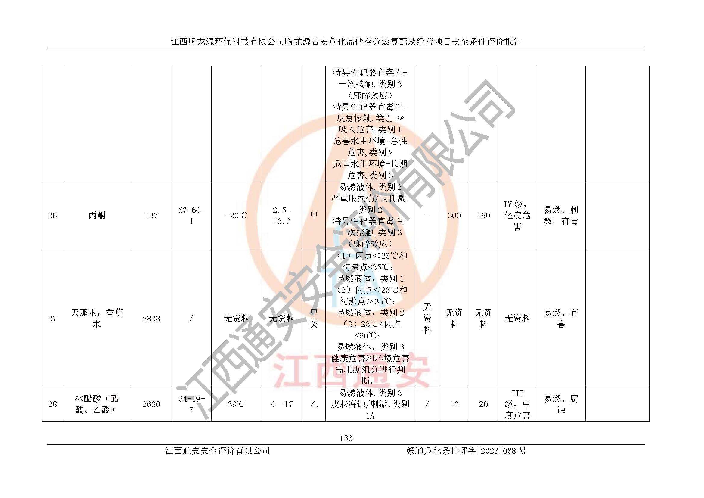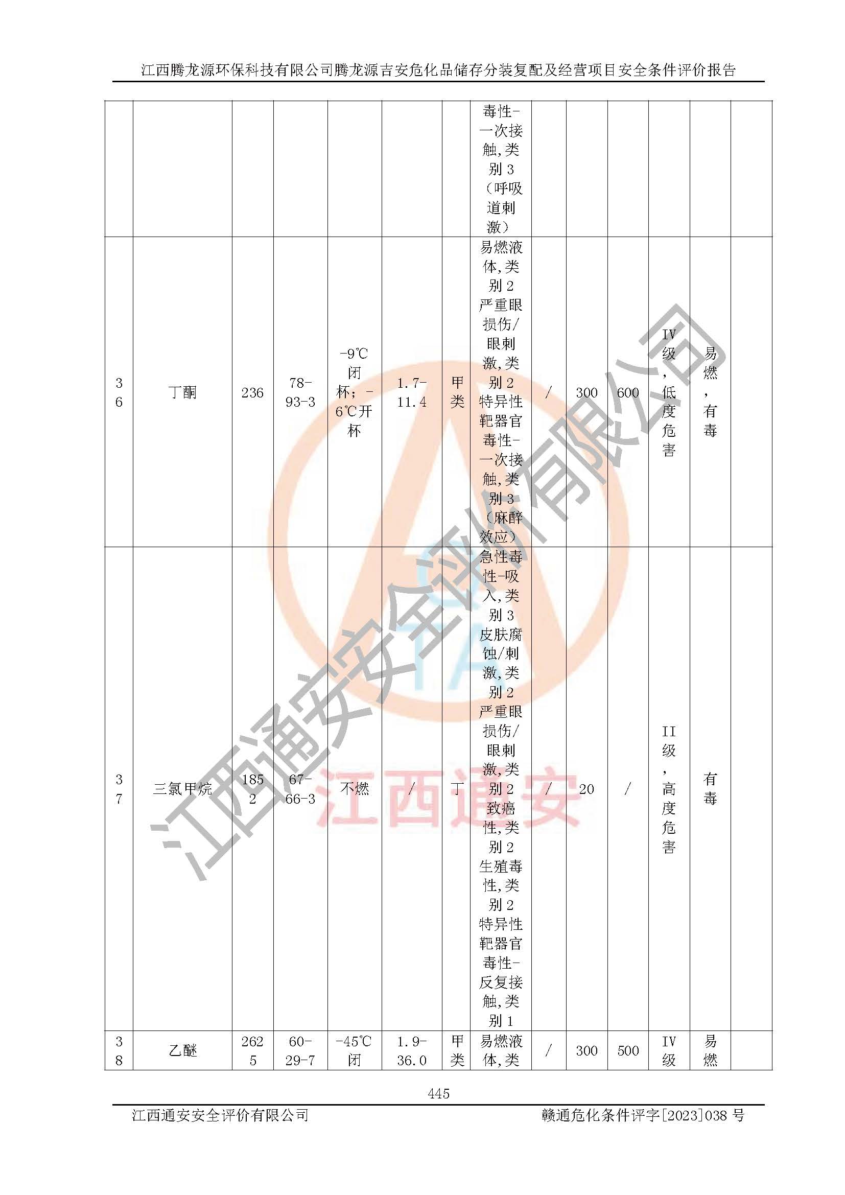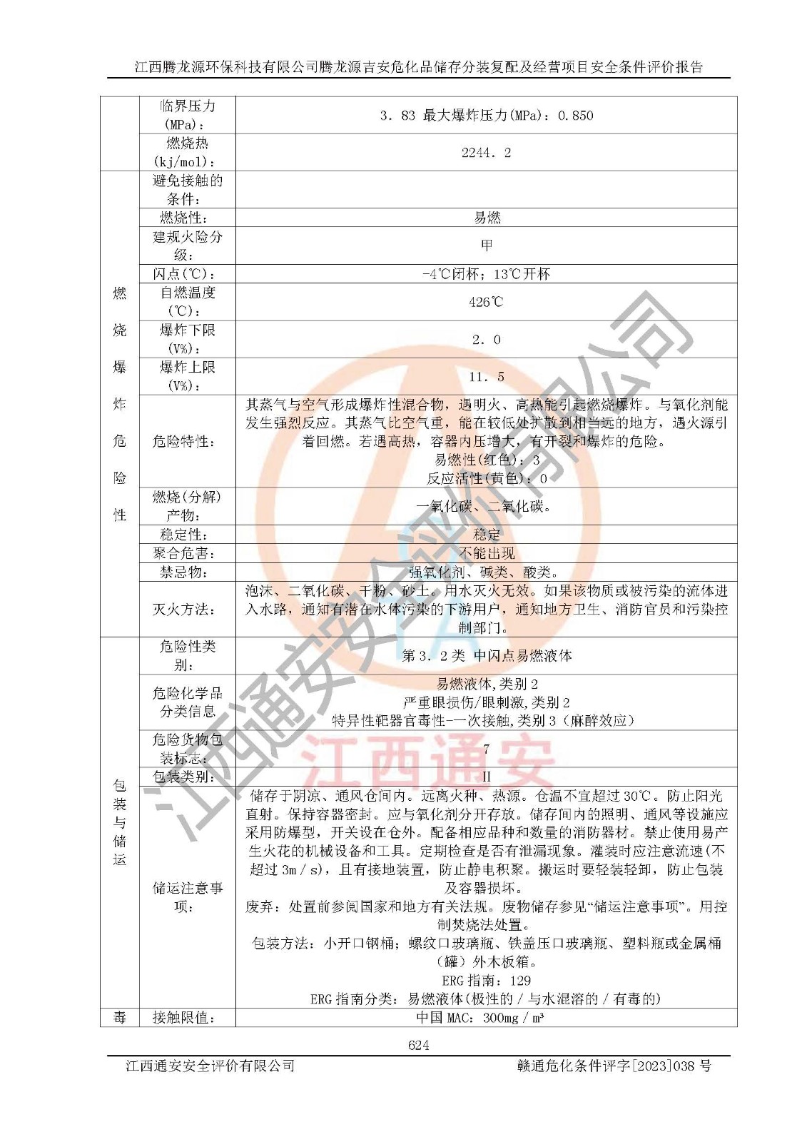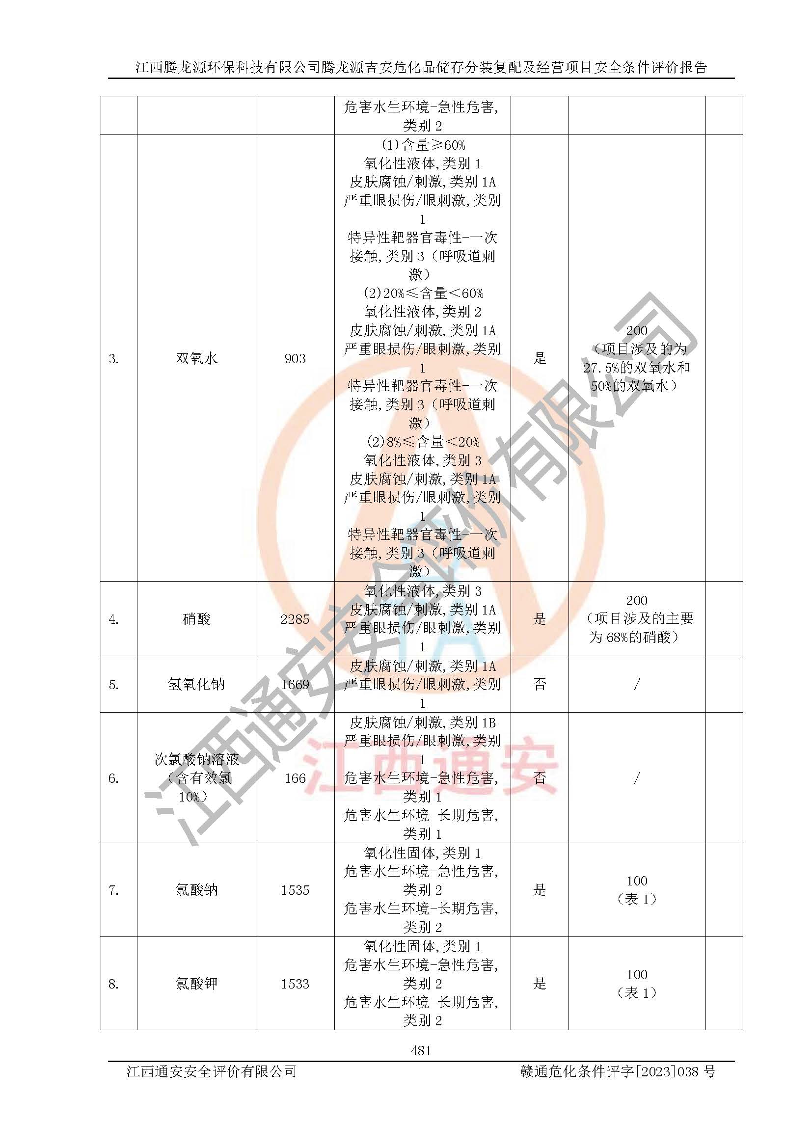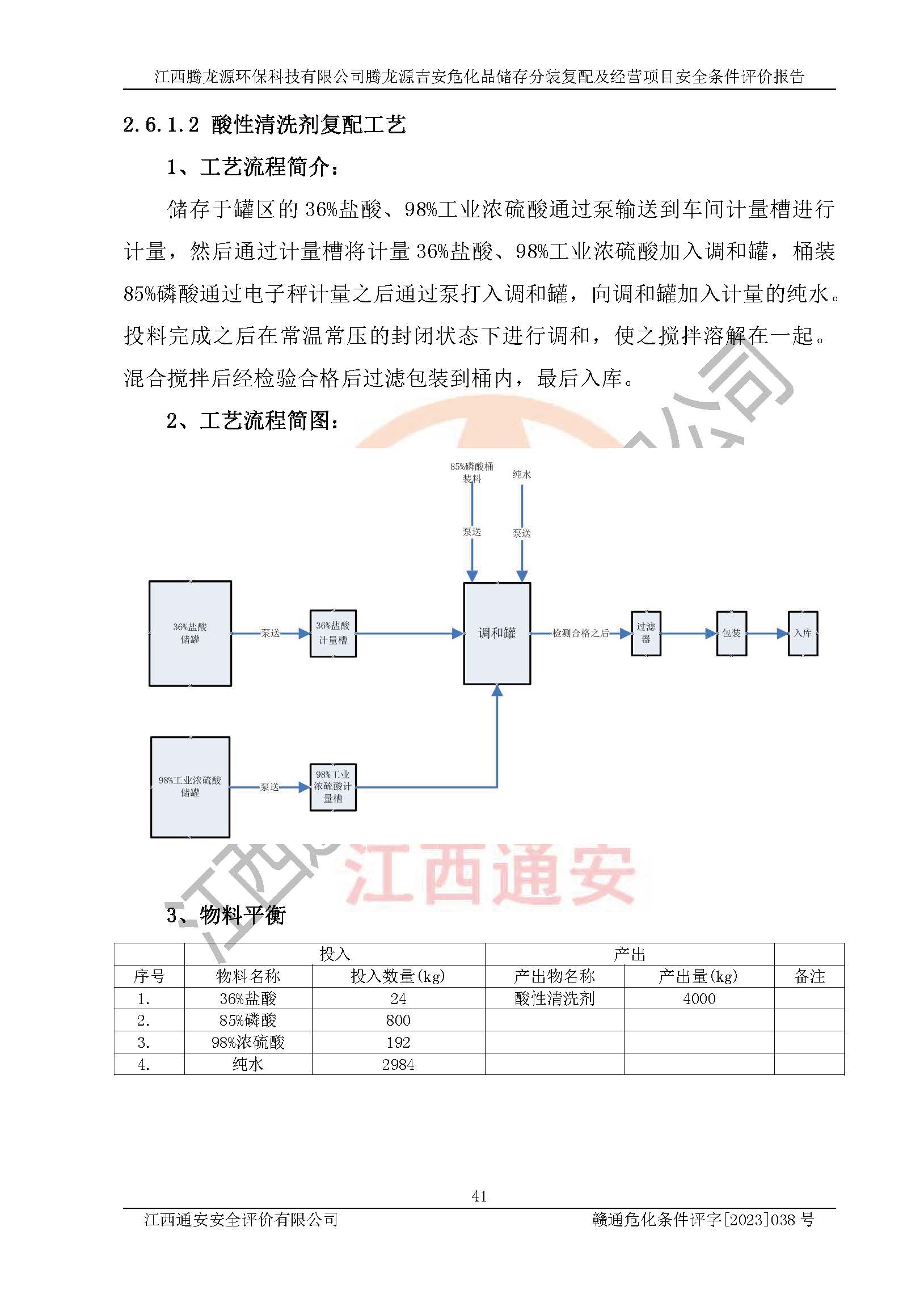 項(xiàng)目簡介 | 江西騰龍?jiān)?*科技有限公司成立于2022年6月20日,并取得吉水縣市場監(jiān)督管理局頒發(fā)的《營業(yè)執(zhí)照》,營業(yè)執(zhí)照統(tǒng)一社會信用代碼:91360822MABQK5GB5P。公司注冊住所:江西省吉安市吉水縣城西工業(yè)園區(qū)二期金龍路。法定**人:吳詩明。注冊資本壹仟萬元整。企業(yè)性質(zhì)為有限責(zé)任公司(自然人投資或控股)。營業(yè)執(zhí)照許可經(jīng)營范圍:一般項(xiàng)目:化工產(chǎn)品銷售(不含許可類化工產(chǎn)品)(除許可業(yè)務(wù)外,可自主依法經(jīng)營法律法規(guī)非禁止或限制的項(xiàng)目)。 江西騰龍?jiān)?*科技有限公司2023年2月24日取得吉水縣發(fā)展和改革委員會頒發(fā)的《江西省企業(yè)投資項(xiàng)目備案通知書》,備案項(xiàng)目名稱為:騰龍?jiān)醇参;穬Υ娣盅b復(fù)配及經(jīng)營項(xiàng)目。項(xiàng)目統(tǒng)一代碼為:2302-360822-04-01-318980。項(xiàng)目總投資20000萬元,項(xiàng)目總占地面積31.34畝。 根據(jù)《危險(xiǎn)化學(xué)品目錄(2015版)》(**安監(jiān)總局等十部門公告[2015]第5號)及應(yīng)急管理部、工業(yè)和信息化部、公安部、生態(tài)環(huán)境部、交通運(yùn)輸部、農(nóng)業(yè)農(nóng)村部、衛(wèi)生健康委、市場監(jiān)管總局、鐵路局、民航局決定調(diào)整《危險(xiǎn)化學(xué)品目錄(2015版)》(應(yīng)急管理部、工業(yè)和信息化部、公安部、生態(tài)環(huán)境部、交通運(yùn)輸部、農(nóng)業(yè)農(nóng)村部、衛(wèi)生健康委、市場監(jiān)管總局、鐵路局、民航局公告2022年第8號)等文件對該項(xiàng)目生產(chǎn)過程中所涉及的化學(xué)品進(jìn)行辨識:項(xiàng)目涉及的硫酸、鹽酸、雙氧水、硝酸、氫氧化鈉(固體和溶液)、次氯酸鈉溶液、氯酸鈉、氯酸鉀、鉻酸酐、高錳酸鈉、高錳酸鉀、硝酸鉀、重鉻酸鉀、重鉻酸鈉、硝酸鈉、亞硝酸鈉、過硫酸鈉、過硫酸銨、過硫酸鉀、漂白粉、氯化亞砜、甲醇、乙醇、二甲苯、甲苯、**、天那水、乙酸、乙酸乙酯、甲醛溶液、三氯乙烯、正丁醇、異丙醇、石油醚、醋酸酐、甲基乙基酮(丁酮)、三氯甲烷、乙醚、氨水(20%)、甲酸、二氯甲烷、**苯、乙酸丁酯、氫氟酸、磷酸、硫化鈉(無水)、氫氧化鉀、氨基磺酸、三氯化鐵、九水硝酸鐵、氯化鋅、硫脲、硼酸、硫酸鎳、氯化鎳、氟化氫銨、氟化氫鉀、氟化氫鈉、偏硅酸鈉、九水偏硅酸鈉、氟硅酸鈉、亞硫酸氫鈉、氟化鈉、氟化鉀、六次甲基四胺、結(jié)晶氯化鋁、碳酸二乙酯、碳酸二甲酯、酸性清洗劑、退鍍劑、開油水、洗網(wǎng)水、污水殺菌劑(復(fù)配的次氯酸鈉溶液)、電解液等屬于危險(xiǎn)化學(xué)品。 江西騰龍?jiān)?*科技有限公司騰龍?jiān)醇参;穬Υ娣盅b復(fù)配及經(jīng)營項(xiàng)目只進(jìn)行物理混合復(fù)配、分裝等作業(yè),不涉及化學(xué)反應(yīng)過程。因此該公司?;穫}儲經(jīng)營活動需要辦理《危險(xiǎn)化學(xué)品經(jīng)營許可證》。 根據(jù)《中華人民共和國監(jiān)控化學(xué)品管理?xiàng)l例》(中華人民共和國***令**90號,經(jīng)中華人民共和國***令第588號修改)及《各類監(jiān)控化學(xué)品名錄》(中華人民共和國工業(yè)和信息化部令第52號;2020年)、《列入第三類監(jiān)控化學(xué)品的新增品種清單》**石油和化學(xué)工業(yè)局令**號等規(guī)定進(jìn)行辨識:項(xiàng)目涉及的氯化亞砜屬于第三類監(jiān)控化學(xué)品。 根據(jù)《易制毒化學(xué)品管理?xiàng)l例》(***令第445號,經(jīng)***令第653號、***第666號、***第703號修改)及附表規(guī)定、中華人民共和國公安部 中華人民共和國商務(wù)部、**衛(wèi)生和計(jì)劃生育委員會、中華人民共和國海關(guān)總署、**安全生產(chǎn)監(jiān)督管理總局、**食品藥品監(jiān)督管理總局《關(guān)于將4-苯胺基-N-苯乙基哌啶、N-苯乙基-4-哌啶酮、N-甲基-1-苯基-1-氯-2-丙胺、溴素、1-苯基-1-**5種物質(zhì)列入易制毒化學(xué)品管理的公告》(國辦函[2017]**20號)、《***辦公廳關(guān)于同意將1-苯基-2-溴-1-**和3-氧-2-苯基丁腈列入易制毒化學(xué)品品種目錄的函》(國辦函[2014]第40號)、《***辦公廳關(guān)于同意將α-苯乙酰乙酸甲酯等6種物質(zhì)列入易制毒化學(xué)品品種目錄的函》(國辦函〔2021〕58號)等進(jìn)行辨識:項(xiàng)目涉及的硫酸、鹽酸、高錳酸鉀、甲苯、**、甲基乙基酮等屬于第三類易制毒化學(xué)品;醋酸酐、三氯甲烷、乙醚等屬于第二類易制毒化學(xué)品。 根據(jù)《危險(xiǎn)化學(xué)品名錄[2015年版]》(**安監(jiān)總局等十部門[2015]第5號)進(jìn)行劇毒化學(xué)品辨識:項(xiàng)目不涉及劇毒化學(xué)品。 根據(jù)《高毒物品目錄(2003年版)》(原衛(wèi)生部衛(wèi)法監(jiān)發(fā)[2003]142號)對項(xiàng)目涉及的化學(xué)品進(jìn)行高毒物品辨識:項(xiàng)目涉及的甲醛溶液、硫酸鎳、氯化鎳、氟化氫銨、氟化氫鉀、氟化氫鈉、氟化鈉、氟化鉀、鉻酸酐、高錳酸鉀、高錳酸鈉、重鉻酸鉀、重鉻酸鈉等屬于高毒物品。 根據(jù)中華人民共和國公安部《易制爆危險(xiǎn)化學(xué)品名錄》(2017年版)中規(guī)定進(jìn)行辨識:項(xiàng)目涉及的雙氧水、硝酸、氯酸鈉、氯酸鉀、高錳酸鉀、高錳酸鈉、硝酸鉀、重鉻酸鉀、重鉻酸鈉、硝酸鈉、六次甲基四胺等屬于易
