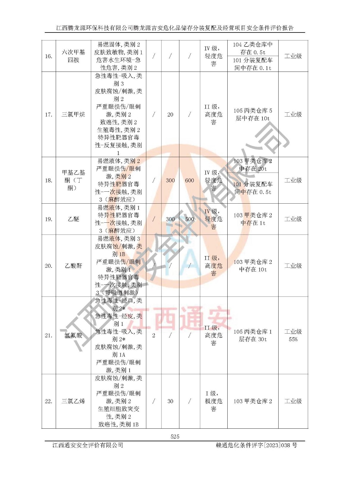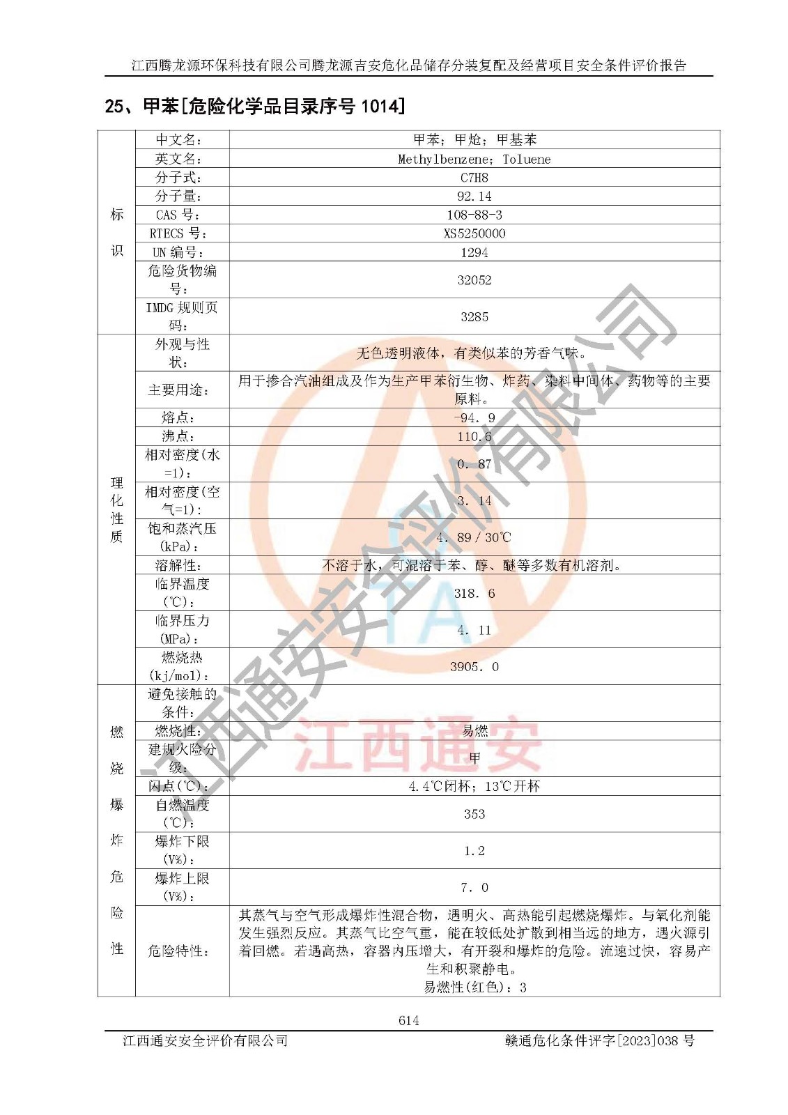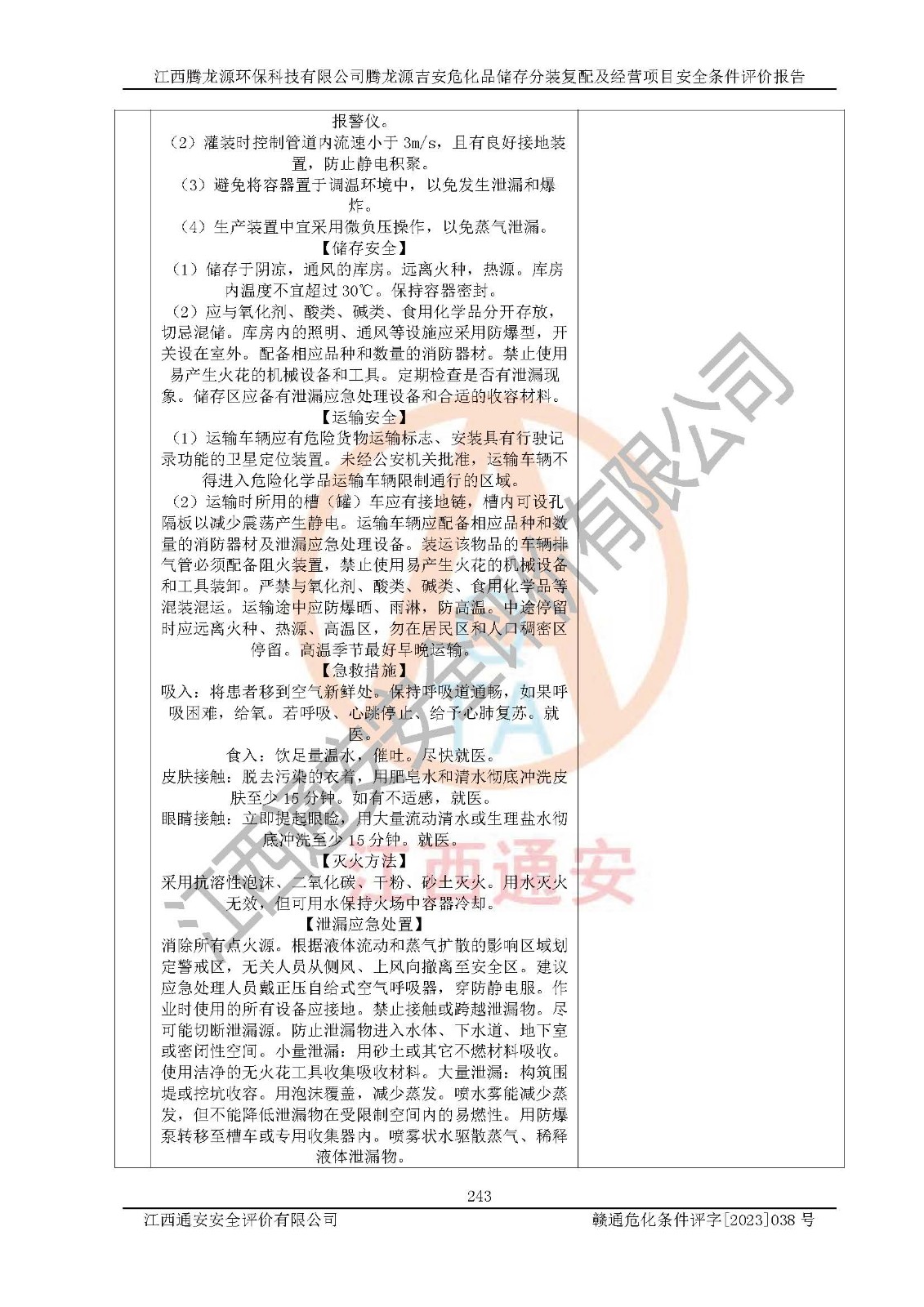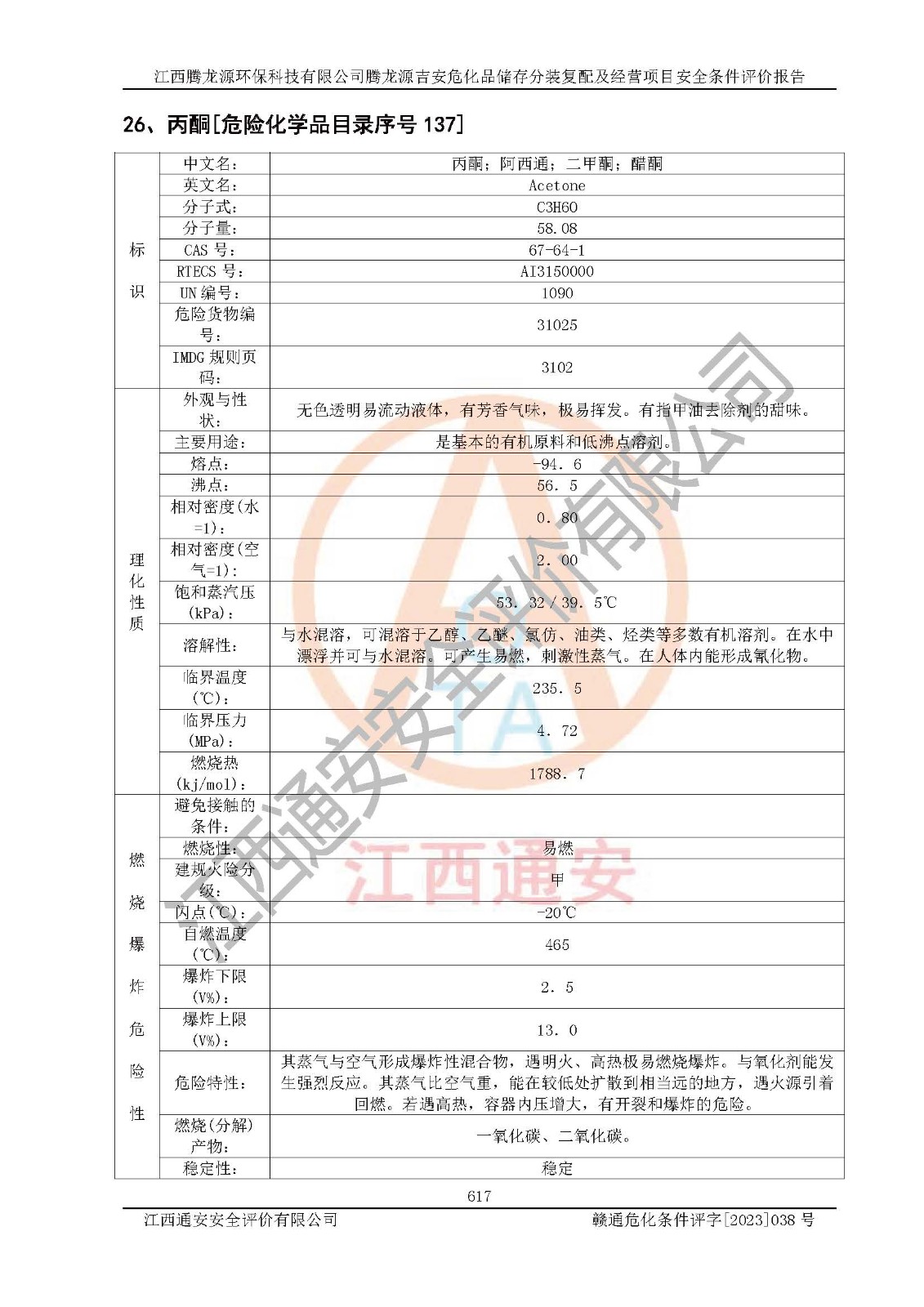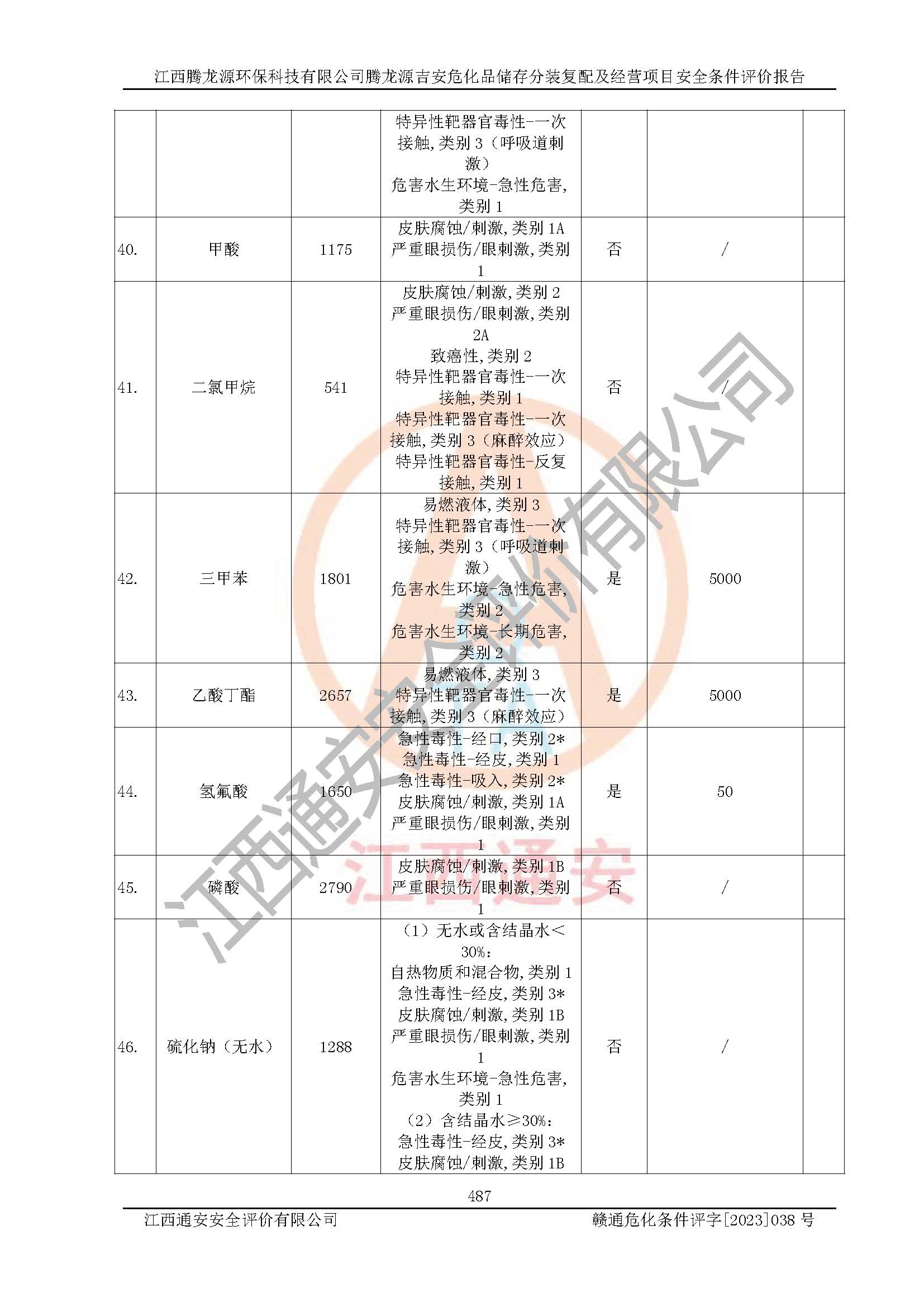 項(xiàng)目簡介 | 江西騰龍?jiān)?*科技有限公司成立于2022年6月20日,并取得吉水縣市場監(jiān)督管理局頒發(fā)的《營業(yè)執(zhí)照》,營業(yè)執(zhí)照統(tǒng)一社會信用代碼:91360822MABQK5GB5P。公司注冊住所:江西省吉安市吉水縣城西工業(yè)園區(qū)二期金龍路。法定**人:吳詩明。注冊資本壹仟萬元整。企業(yè)性質(zhì)為有限責(zé)任公司(自然人投資或控股)。營業(yè)執(zhí)照許可經(jīng)營范圍:一般項(xiàng)目:化工產(chǎn)品銷售(不含許可類化工產(chǎn)品)(除許可業(yè)務(wù)外,可自主依法經(jīng)營法律法規(guī)非禁止或限制的項(xiàng)目)。 江西騰龍?jiān)?*科技有限公司2023年2月24日取得吉水縣發(fā)展和改革委員會頒發(fā)的《江西省企業(yè)投資項(xiàng)目備案通知書》,備案項(xiàng)目名稱為:騰龍?jiān)醇参;穬Υ娣盅b復(fù)配及經(jīng)營項(xiàng)目。項(xiàng)目統(tǒng)一代碼為:2302-360822-04-01-318980。項(xiàng)目總投資20000萬元,項(xiàng)目總占地面積31.34畝。 根據(jù)《危險(xiǎn)化學(xué)品目錄(2015版)》(**安監(jiān)總局等十部門公告[2015]第5號)及應(yīng)急管理部、工業(yè)和信息化部、公安部、生態(tài)環(huán)境部、交通運(yùn)輸部、農(nóng)業(yè)農(nóng)村部、衛(wèi)生健康委、市場監(jiān)管總局、鐵路局、民航局決定調(diào)整《危險(xiǎn)化學(xué)品目錄(2015版)》(應(yīng)急管理部、工業(yè)和信息化部、公安部、生態(tài)環(huán)境部、交通運(yùn)輸部、農(nóng)業(yè)農(nóng)村部、衛(wèi)生健康委、市場監(jiān)管總局、鐵路局、民航局公告2022年第8號)等文件對該項(xiàng)目生產(chǎn)過程中所涉及的化學(xué)品進(jìn)行辨識:項(xiàng)目涉及的硫酸、鹽酸、雙氧水、硝酸、氫氧化鈉(固體和溶液)、次氯酸鈉溶液、氯酸鈉、氯酸鉀、鉻酸酐、高錳酸鈉、高錳酸鉀、硝酸鉀、重鉻酸鉀、重鉻酸鈉、硝酸鈉、亞硝酸鈉、過硫酸鈉、過硫酸銨、過硫酸鉀、漂白粉、氯化亞砜、甲醇、乙醇、二甲苯、甲苯、**、天那水、乙酸、乙酸乙酯、甲醛溶液、三氯乙烯、正丁醇、異丙醇、石油醚、醋酸酐、甲基乙基酮(丁酮)、三氯甲烷、乙醚、氨水(20%)、甲酸、二氯甲烷、**苯、乙酸丁酯、氫氟酸、磷酸、硫化鈉(無水)、氫氧化鉀、氨基磺酸、三氯化鐵、九水硝酸鐵、氯化鋅、硫脲、硼酸、硫酸鎳、氯化鎳、氟化氫銨、氟化氫鉀、氟化氫鈉、偏硅酸鈉、九水偏硅酸鈉、氟硅酸鈉、亞硫酸氫鈉、氟化鈉、氟化鉀、六次甲基四胺、結(jié)晶氯化鋁、碳酸二乙酯、碳酸二甲酯、酸性清洗劑、退鍍劑、開油水、洗網(wǎng)水、污水殺菌劑(復(fù)配的次氯酸鈉溶液)、電解液等屬于危險(xiǎn)化學(xué)品。 江西騰龍?jiān)?*科技有限公司騰龍?jiān)醇参;穬Υ娣盅b復(fù)配及經(jīng)營項(xiàng)目只進(jìn)行物理混合復(fù)配、分裝等作業(yè),不涉及化學(xué)反應(yīng)過程。因此該公司?;穫}儲經(jīng)營活動需要辦理《危險(xiǎn)化學(xué)品經(jīng)營許可證》。 根據(jù)《中華人民共和國監(jiān)控化學(xué)品管理?xiàng)l例》(中華人民共和國***令**90號,經(jīng)中華人民共和國***令第588號修改)及《各類監(jiān)控化學(xué)品名錄》(中華人民共和國工業(yè)和信息化部令第52號;2020年)、《列入第三類監(jiān)控化學(xué)品的新增品種清單》**石油和化學(xué)工業(yè)局令**號等規(guī)定進(jìn)行辨識:項(xiàng)目涉及的氯化亞砜屬于第三類監(jiān)控化學(xué)品。 根據(jù)《易制毒化學(xué)品管理?xiàng)l例》(***令第445號,經(jīng)***令第653號、***第666號、***第703號修改)及附表規(guī)定、中華人民共和國公安部 中華人民共和國商務(wù)部、**衛(wèi)生和計(jì)劃生育委員會、中華人民共和國海關(guān)總署、**安全生產(chǎn)監(jiān)督管理總局、**食品藥品監(jiān)督管理總局《關(guān)于將4-苯胺基-N-苯乙基哌啶、N-苯乙基-4-哌啶酮、N-甲基-1-苯基-1-氯-2-丙胺、溴素、1-苯基-1-**5種物質(zhì)列入易制毒化學(xué)品管理的公告》(國辦函[2017]**20號)、《***辦公廳關(guān)于同意將1-苯基-2-溴-1-**和3-氧-2-苯基丁腈列入易制毒化學(xué)品品種目錄的函》(國辦函[2014]第40號)、《***辦公廳關(guān)于同意將α-苯乙酰乙酸甲酯等6種物質(zhì)列入易制毒化學(xué)品品種目錄的函》(國辦函〔2021〕58號)等進(jìn)行辨識:項(xiàng)目涉及的硫酸、鹽酸、高錳酸鉀、甲苯、**、甲基乙基酮等屬于第三類易制毒化學(xué)品;醋酸酐、三氯甲烷、乙醚等屬于第二類易制毒化學(xué)品。 根據(jù)《危險(xiǎn)化學(xué)品名錄[2015年版]》(**安監(jiān)總局等十部門[2015]第5號)進(jìn)行劇毒化學(xué)品辨識:項(xiàng)目不涉及劇毒化學(xué)品。 根據(jù)《高毒物品目錄(2003年版)》(原衛(wèi)生部衛(wèi)法監(jiān)發(fā)[2003]142號)對項(xiàng)目涉及的化學(xué)品進(jìn)行高毒物品辨識:項(xiàng)目涉及的甲醛溶液、硫酸鎳、氯化鎳、氟化氫銨、氟化氫鉀、氟化氫鈉、氟化鈉、氟化鉀、鉻酸酐、高錳酸鉀、高錳酸鈉、重鉻酸鉀、重鉻酸鈉等屬于高毒物品。 根據(jù)中華人民共和國公安部《易制爆危險(xiǎn)化學(xué)品名錄》(2017年版)中規(guī)定進(jìn)行辨識:項(xiàng)目涉及的雙氧水、硝酸、氯酸鈉、氯酸鉀、高錳酸鉀、高錳酸鈉、硝酸鉀、重鉻酸鉀、重鉻酸鈉、硝酸鈉、六次甲基四胺等屬于易