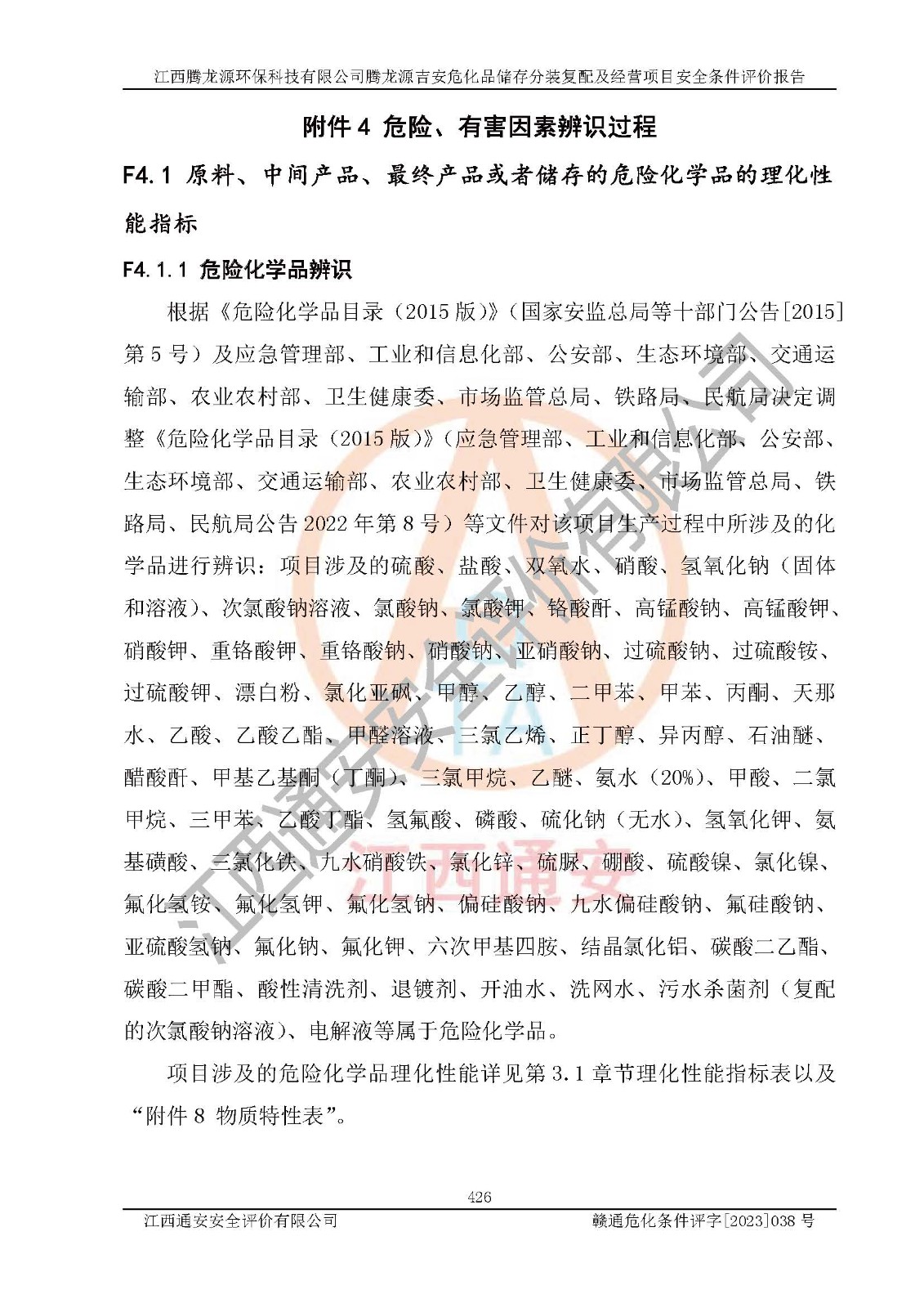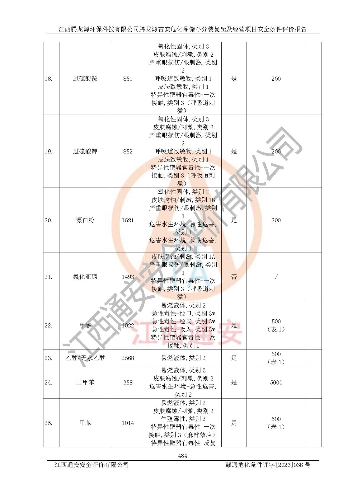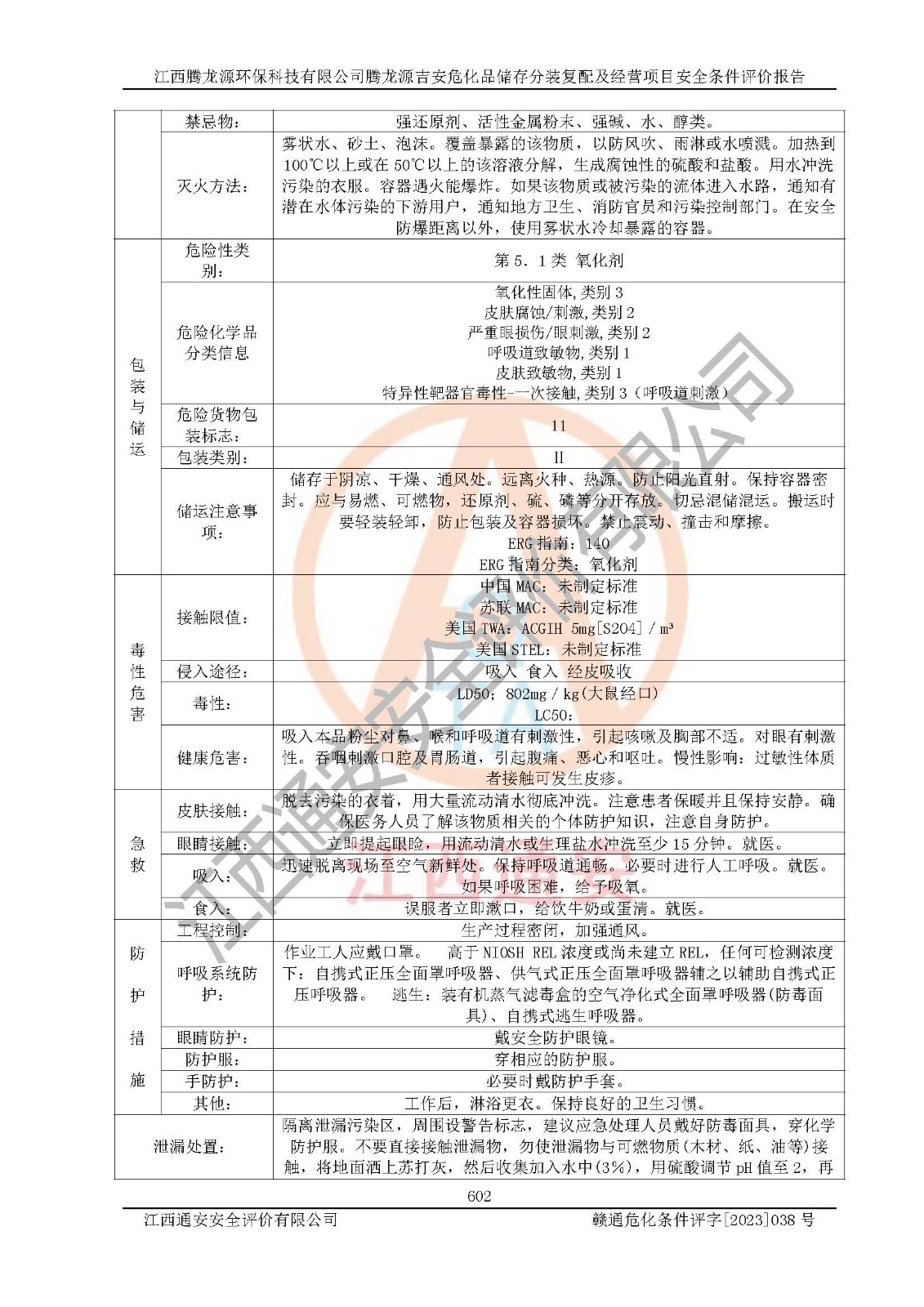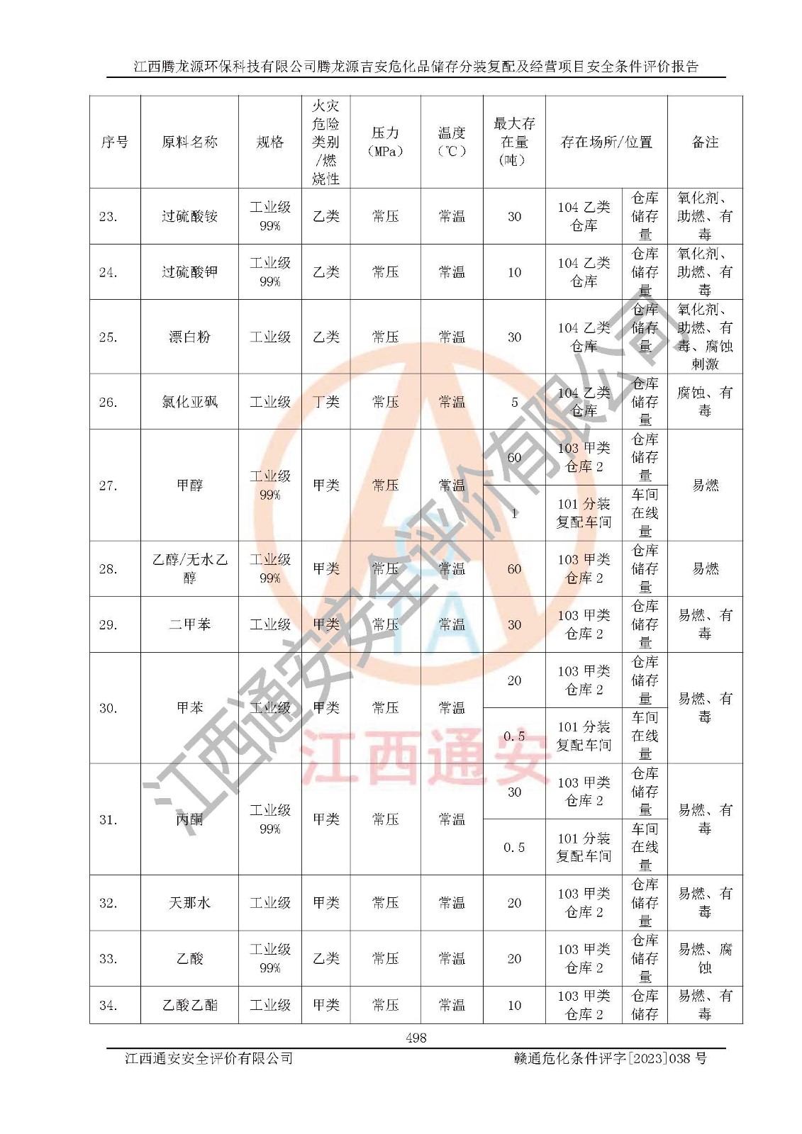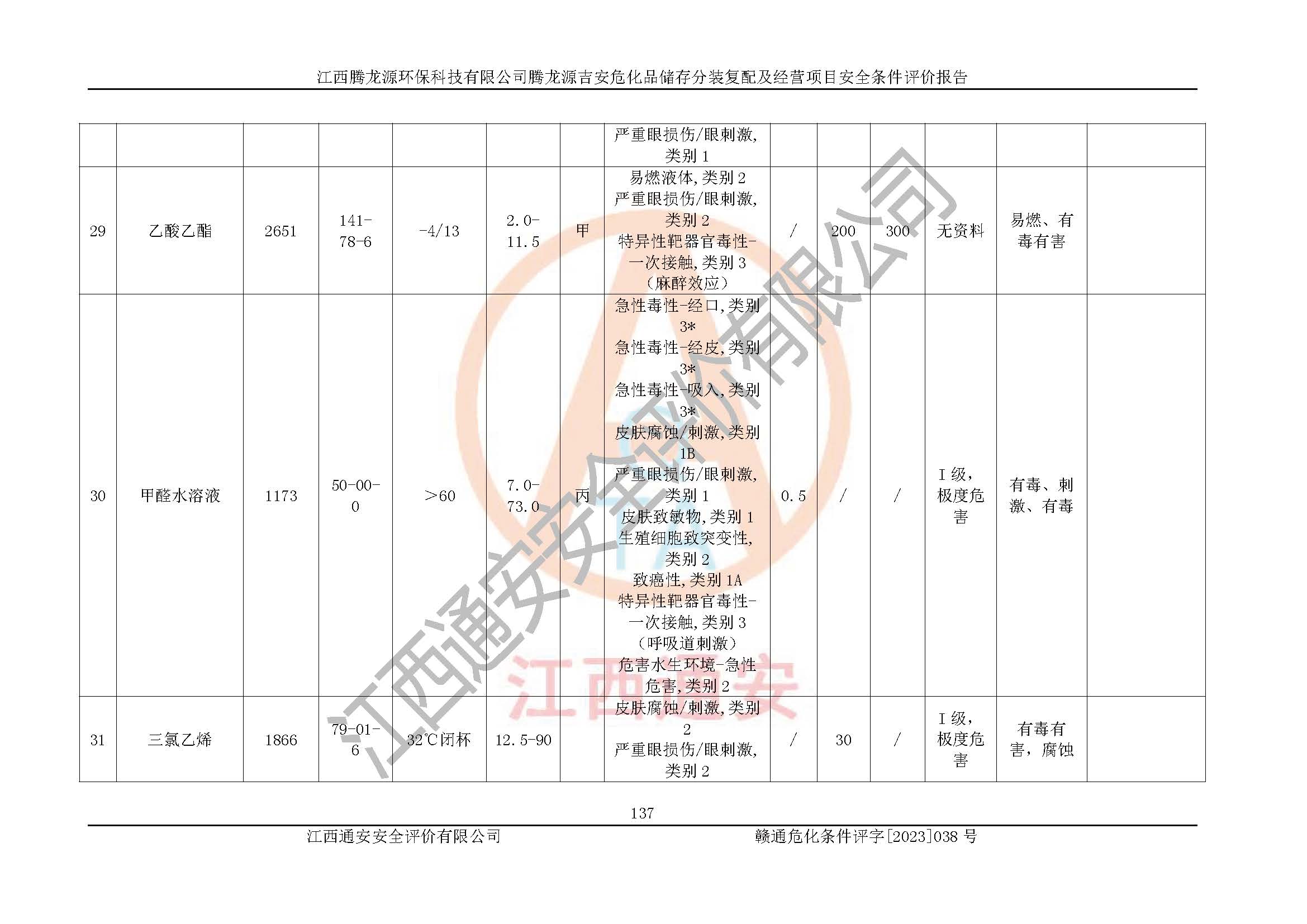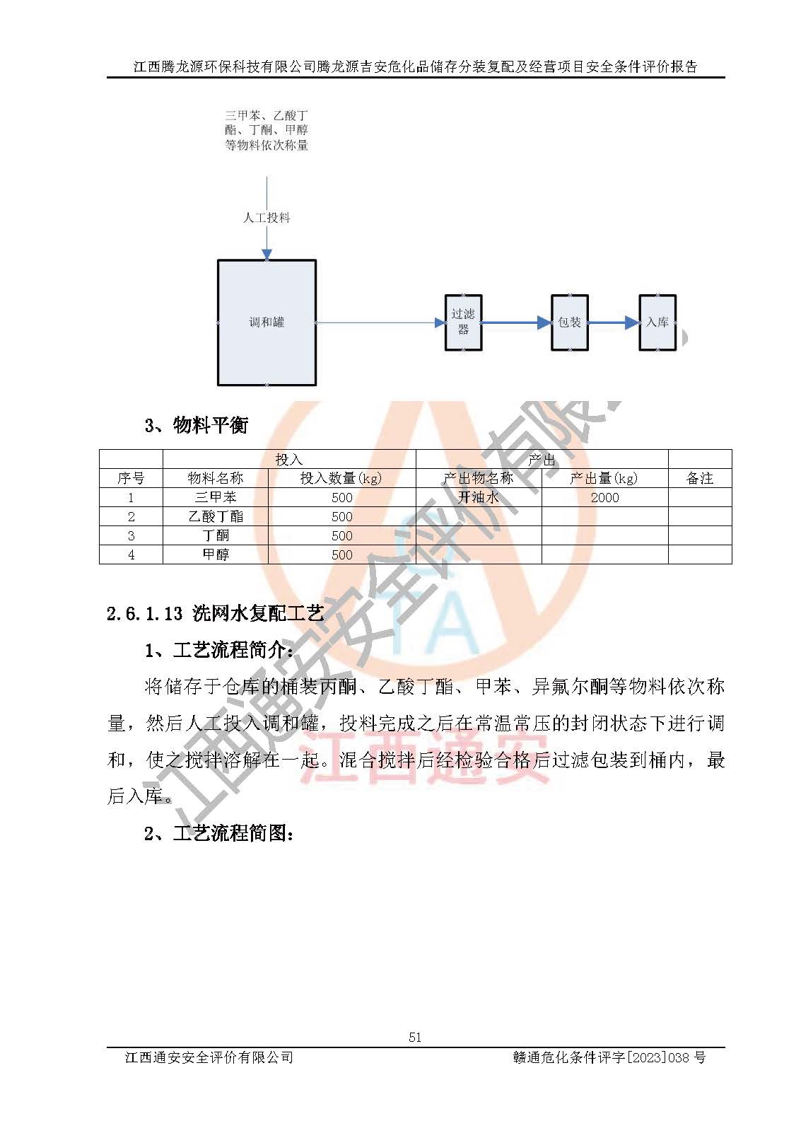 項(xiàng)目簡介 | 江西騰龍?jiān)?*科技有限公司成立于2022年6月20日,并取得吉水縣市場監(jiān)督管理局頒發(fā)的《營業(yè)執(zhí)照》,營業(yè)執(zhí)照統(tǒng)一社會信用代碼:91360822MABQK5GB5P。公司注冊住所:江西省吉安市吉水縣城西工業(yè)園區(qū)二期金龍路。法定**人:吳詩明。注冊資本壹仟萬元整。企業(yè)性質(zhì)為有限責(zé)任公司(自然人投資或控股)。營業(yè)執(zhí)照許可經(jīng)營范圍:一般項(xiàng)目:化工產(chǎn)品銷售(不含許可類化工產(chǎn)品)(除許可業(yè)務(wù)外,可自主依法經(jīng)營法律法規(guī)非禁止或限制的項(xiàng)目)。 江西騰龍?jiān)?*科技有限公司2023年2月24日取得吉水縣發(fā)展和改革委員會頒發(fā)的《江西省企業(yè)投資項(xiàng)目備案通知書》,備案項(xiàng)目名稱為:騰龍?jiān)醇参;穬Υ娣盅b復(fù)配及經(jīng)營項(xiàng)目。項(xiàng)目統(tǒng)一代碼為:2302-360822-04-01-318980。項(xiàng)目總投資20000萬元,項(xiàng)目總占地面積31.34畝。 根據(jù)《危險(xiǎn)化學(xué)品目錄(2015版)》(**安監(jiān)總局等十部門公告[2015]第5號)及應(yīng)急管理部、工業(yè)和信息化部、公安部、生態(tài)環(huán)境部、交通運(yùn)輸部、農(nóng)業(yè)農(nóng)村部、衛(wèi)生健康委、市場監(jiān)管總局、鐵路局、民航局決定調(diào)整《危險(xiǎn)化學(xué)品目錄(2015版)》(應(yīng)急管理部、工業(yè)和信息化部、公安部、生態(tài)環(huán)境部、交通運(yùn)輸部、農(nóng)業(yè)農(nóng)村部、衛(wèi)生健康委、市場監(jiān)管總局、鐵路局、民航局公告2022年第8號)等文件對該項(xiàng)目生產(chǎn)過程中所涉及的化學(xué)品進(jìn)行辨識:項(xiàng)目涉及的硫酸、鹽酸、雙氧水、硝酸、氫氧化鈉(固體和溶液)、次氯酸鈉溶液、氯酸鈉、氯酸鉀、鉻酸酐、高錳酸鈉、高錳酸鉀、硝酸鉀、重鉻酸鉀、重鉻酸鈉、硝酸鈉、亞硝酸鈉、過硫酸鈉、過硫酸銨、過硫酸鉀、漂白粉、氯化亞砜、甲醇、乙醇、二甲苯、甲苯、**、天那水、乙酸、乙酸乙酯、甲醛溶液、三氯乙烯、正丁醇、異丙醇、石油醚、醋酸酐、甲基乙基酮(丁酮)、三氯甲烷、乙醚、氨水(20%)、甲酸、二氯甲烷、**苯、乙酸丁酯、氫氟酸、磷酸、硫化鈉(無水)、氫氧化鉀、氨基磺酸、三氯化鐵、九水硝酸鐵、氯化鋅、硫脲、硼酸、硫酸鎳、氯化鎳、氟化氫銨、氟化氫鉀、氟化氫鈉、偏硅酸鈉、九水偏硅酸鈉、氟硅酸鈉、亞硫酸氫鈉、氟化鈉、氟化鉀、六次甲基四胺、結(jié)晶氯化鋁、碳酸二乙酯、碳酸二甲酯、酸性清洗劑、退鍍劑、開油水、洗網(wǎng)水、污水殺菌劑(復(fù)配的次氯酸鈉溶液)、電解液等屬于危險(xiǎn)化學(xué)品。 江西騰龍?jiān)?*科技有限公司騰龍?jiān)醇参;穬Υ娣盅b復(fù)配及經(jīng)營項(xiàng)目只進(jìn)行物理混合復(fù)配、分裝等作業(yè),不涉及化學(xué)反應(yīng)過程。因此該公司?;穫}儲經(jīng)營活動需要辦理《危險(xiǎn)化學(xué)品經(jīng)營許可證》。 根據(jù)《中華人民共和國監(jiān)控化學(xué)品管理?xiàng)l例》(中華人民共和國***令**90號,經(jīng)中華人民共和國***令第588號修改)及《各類監(jiān)控化學(xué)品名錄》(中華人民共和國工業(yè)和信息化部令第52號;2020年)、《列入第三類監(jiān)控化學(xué)品的新增品種清單》**石油和化學(xué)工業(yè)局令**號等規(guī)定進(jìn)行辨識:項(xiàng)目涉及的氯化亞砜屬于第三類監(jiān)控化學(xué)品。 根據(jù)《易制毒化學(xué)品管理?xiàng)l例》(***令第445號,經(jīng)***令第653號、***第666號、***第703號修改)及附表規(guī)定、中華人民共和國公安部 中華人民共和國商務(wù)部、**衛(wèi)生和計(jì)劃生育委員會、中華人民共和國海關(guān)總署、**安全生產(chǎn)監(jiān)督管理總局、**食品藥品監(jiān)督管理總局《關(guān)于將4-苯胺基-N-苯乙基哌啶、N-苯乙基-4-哌啶酮、N-甲基-1-苯基-1-氯-2-丙胺、溴素、1-苯基-1-**5種物質(zhì)列入易制毒化學(xué)品管理的公告》(國辦函[2017]**20號)、《***辦公廳關(guān)于同意將1-苯基-2-溴-1-**和3-氧-2-苯基丁腈列入易制毒化學(xué)品品種目錄的函》(國辦函[2014]第40號)、《***辦公廳關(guān)于同意將α-苯乙酰乙酸甲酯等6種物質(zhì)列入易制毒化學(xué)品品種目錄的函》(國辦函〔2021〕58號)等進(jìn)行辨識:項(xiàng)目涉及的硫酸、鹽酸、高錳酸鉀、甲苯、**、甲基乙基酮等屬于第三類易制毒化學(xué)品;醋酸酐、三氯甲烷、乙醚等屬于第二類易制毒化學(xué)品。 根據(jù)《危險(xiǎn)化學(xué)品名錄[2015年版]》(**安監(jiān)總局等十部門[2015]第5號)進(jìn)行劇毒化學(xué)品辨識:項(xiàng)目不涉及劇毒化學(xué)品。 根據(jù)《高毒物品目錄(2003年版)》(原衛(wèi)生部衛(wèi)法監(jiān)發(fā)[2003]142號)對項(xiàng)目涉及的化學(xué)品進(jìn)行高毒物品辨識:項(xiàng)目涉及的甲醛溶液、硫酸鎳、氯化鎳、氟化氫銨、氟化氫鉀、氟化氫鈉、氟化鈉、氟化鉀、鉻酸酐、高錳酸鉀、高錳酸鈉、重鉻酸鉀、重鉻酸鈉等屬于高毒物品。 根據(jù)中華人民共和國公安部《易制爆危險(xiǎn)化學(xué)品名錄》(2017年版)中規(guī)定進(jìn)行辨識:項(xiàng)目涉及的雙氧水、硝酸、氯酸鈉、氯酸鉀、高錳酸鉀、高錳酸鈉、硝酸鉀、重鉻酸鉀、重鉻酸鈉、硝酸鈉、六次甲基四胺等屬于易