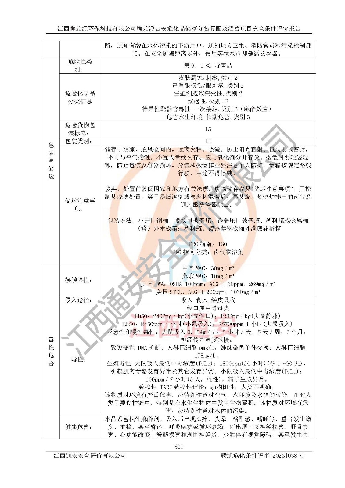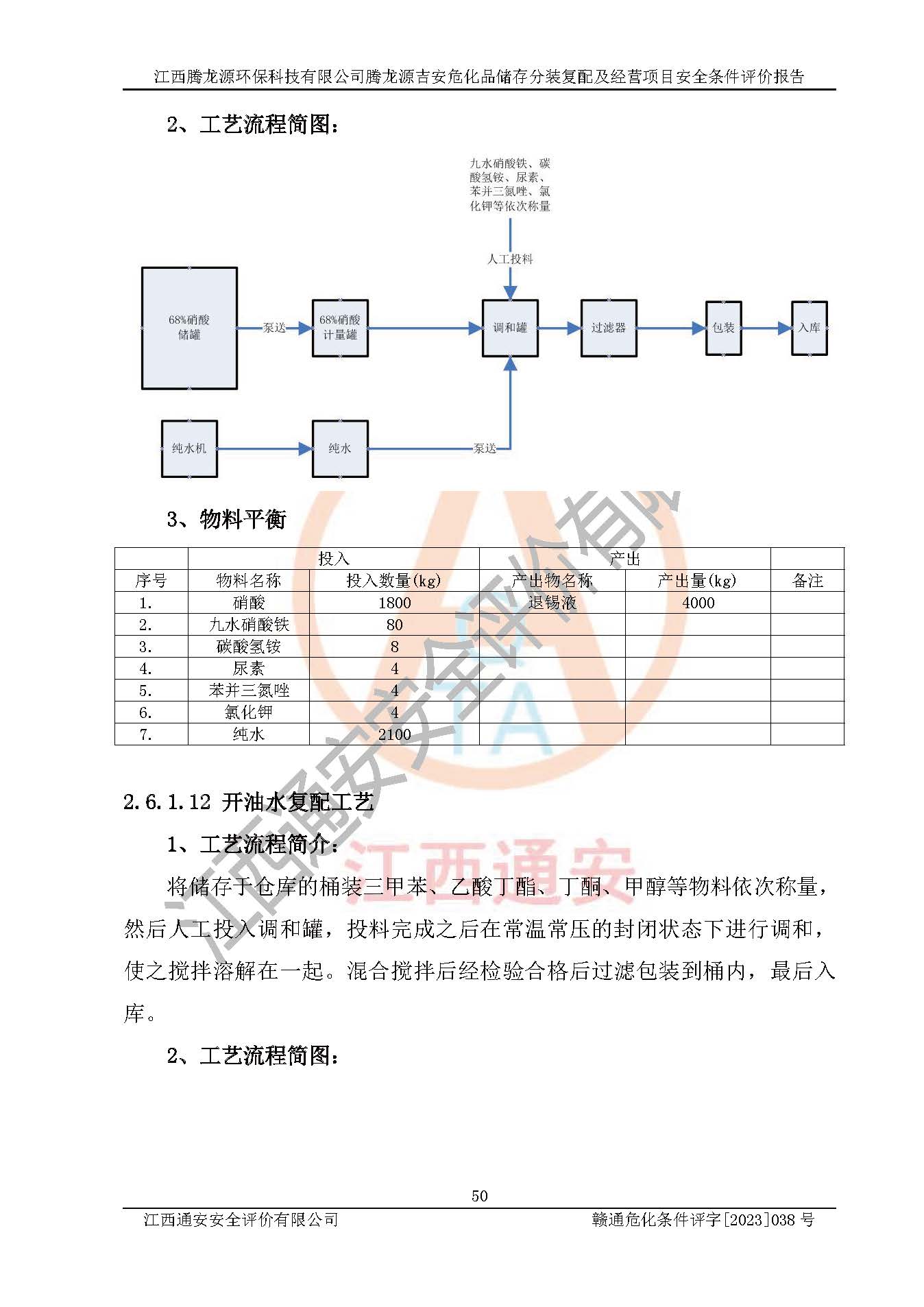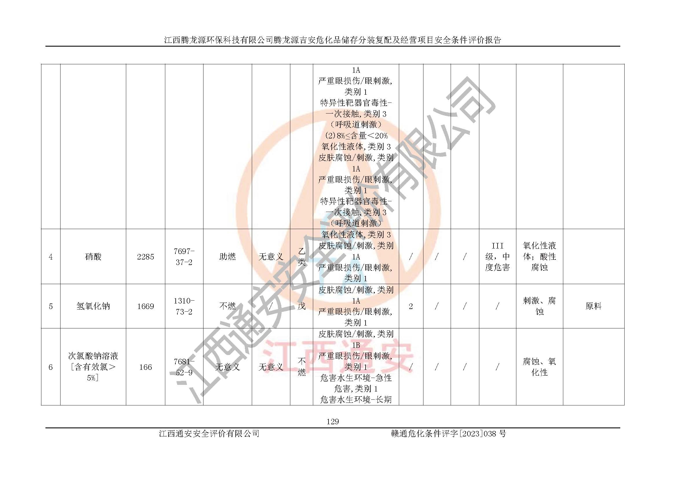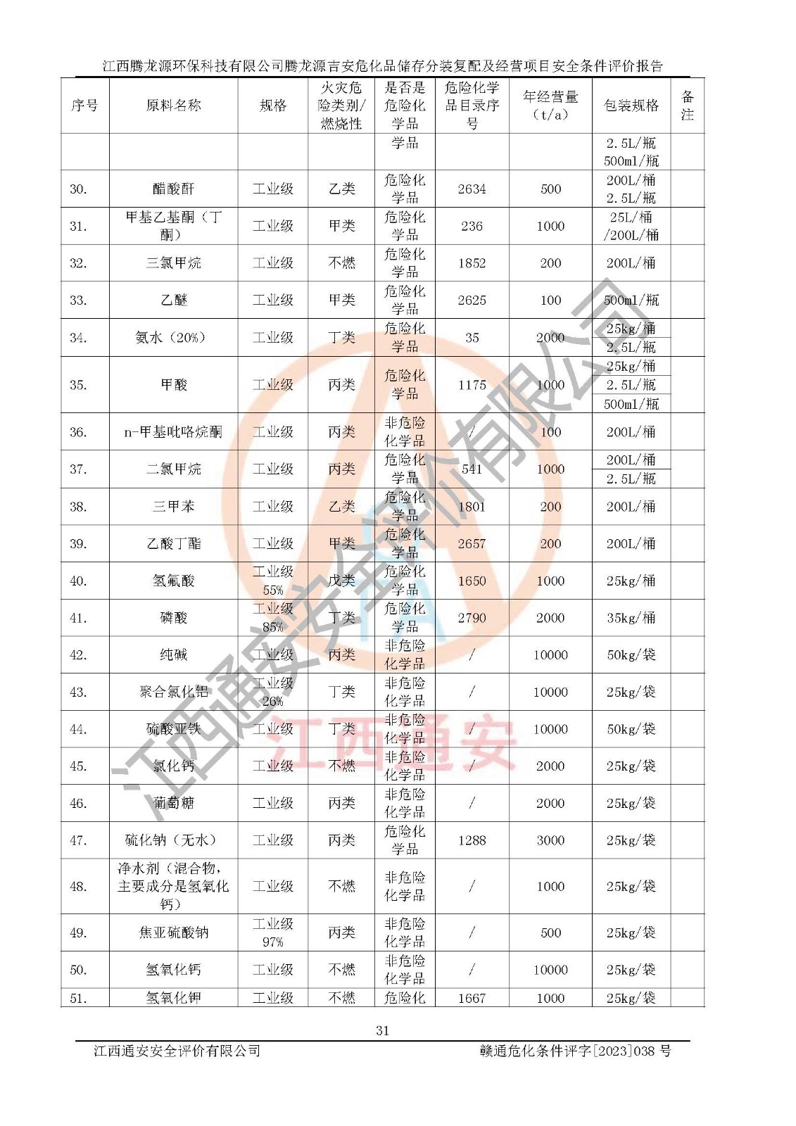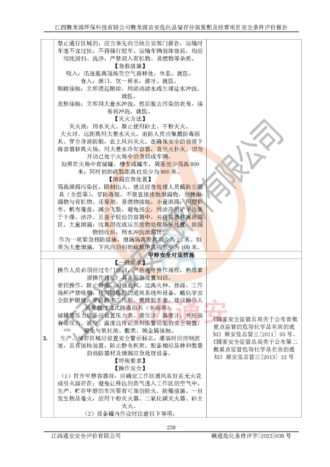 項(xiàng)目簡介 | 江西騰龍?jiān)?*科技有限公司成立于2022年6月20日,并取得吉水縣市場監(jiān)督管理局頒發(fā)的《營業(yè)執(zhí)照》,營業(yè)執(zhí)照統(tǒng)一社會信用代碼:91360822MABQK5GB5P。公司注冊住所:江西省吉安市吉水縣城西工業(yè)園區(qū)二期金龍路。法定**人:吳詩明。注冊資本壹仟萬元整。企業(yè)性質(zhì)為有限責(zé)任公司(自然人投資或控股)。營業(yè)執(zhí)照許可經(jīng)營范圍:一般項(xiàng)目:化工產(chǎn)品銷售(不含許可類化工產(chǎn)品)(除許可業(yè)務(wù)外,可自主依法經(jīng)營法律法規(guī)非禁止或限制的項(xiàng)目)。 江西騰龍?jiān)?*科技有限公司2023年2月24日取得吉水縣發(fā)展和改革委員會頒發(fā)的《江西省企業(yè)投資項(xiàng)目備案通知書》,備案項(xiàng)目名稱為:騰龍?jiān)醇参;穬Υ娣盅b復(fù)配及經(jīng)營項(xiàng)目。項(xiàng)目統(tǒng)一代碼為:2302-360822-04-01-318980。項(xiàng)目總投資20000萬元,項(xiàng)目總占地面積31.34畝。 根據(jù)《危險(xiǎn)化學(xué)品目錄(2015版)》(**安監(jiān)總局等十部門公告[2015]第5號)及應(yīng)急管理部、工業(yè)和信息化部、公安部、生態(tài)環(huán)境部、交通運(yùn)輸部、農(nóng)業(yè)農(nóng)村部、衛(wèi)生健康委、市場監(jiān)管總局、鐵路局、民航局決定調(diào)整《危險(xiǎn)化學(xué)品目錄(2015版)》(應(yīng)急管理部、工業(yè)和信息化部、公安部、生態(tài)環(huán)境部、交通運(yùn)輸部、農(nóng)業(yè)農(nóng)村部、衛(wèi)生健康委、市場監(jiān)管總局、鐵路局、民航局公告2022年第8號)等文件對該項(xiàng)目生產(chǎn)過程中所涉及的化學(xué)品進(jìn)行辨識:項(xiàng)目涉及的硫酸、鹽酸、雙氧水、硝酸、氫氧化鈉(固體和溶液)、次氯酸鈉溶液、氯酸鈉、氯酸鉀、鉻酸酐、高錳酸鈉、高錳酸鉀、硝酸鉀、重鉻酸鉀、重鉻酸鈉、硝酸鈉、亞硝酸鈉、過硫酸鈉、過硫酸銨、過硫酸鉀、漂白粉、氯化亞砜、甲醇、乙醇、二甲苯、甲苯、**、天那水、乙酸、乙酸乙酯、甲醛溶液、三氯乙烯、正丁醇、異丙醇、石油醚、醋酸酐、甲基乙基酮(丁酮)、三氯甲烷、乙醚、氨水(20%)、甲酸、二氯甲烷、**苯、乙酸丁酯、氫氟酸、磷酸、硫化鈉(無水)、氫氧化鉀、氨基磺酸、三氯化鐵、九水硝酸鐵、氯化鋅、硫脲、硼酸、硫酸鎳、氯化鎳、氟化氫銨、氟化氫鉀、氟化氫鈉、偏硅酸鈉、九水偏硅酸鈉、氟硅酸鈉、亞硫酸氫鈉、氟化鈉、氟化鉀、六次甲基四胺、結(jié)晶氯化鋁、碳酸二乙酯、碳酸二甲酯、酸性清洗劑、退鍍劑、開油水、洗網(wǎng)水、污水殺菌劑(復(fù)配的次氯酸鈉溶液)、電解液等屬于危險(xiǎn)化學(xué)品。 江西騰龍?jiān)?*科技有限公司騰龍?jiān)醇参;穬Υ娣盅b復(fù)配及經(jīng)營項(xiàng)目只進(jìn)行物理混合復(fù)配、分裝等作業(yè),不涉及化學(xué)反應(yīng)過程。因此該公司?;穫}儲經(jīng)營活動需要辦理《危險(xiǎn)化學(xué)品經(jīng)營許可證》。 根據(jù)《中華人民共和國監(jiān)控化學(xué)品管理?xiàng)l例》(中華人民共和國***令**90號,經(jīng)中華人民共和國***令第588號修改)及《各類監(jiān)控化學(xué)品名錄》(中華人民共和國工業(yè)和信息化部令第52號;2020年)、《列入第三類監(jiān)控化學(xué)品的新增品種清單》**石油和化學(xué)工業(yè)局令**號等規(guī)定進(jìn)行辨識:項(xiàng)目涉及的氯化亞砜屬于第三類監(jiān)控化學(xué)品。 根據(jù)《易制毒化學(xué)品管理?xiàng)l例》(***令第445號,經(jīng)***令第653號、***第666號、***第703號修改)及附表規(guī)定、中華人民共和國公安部 中華人民共和國商務(wù)部、**衛(wèi)生和計(jì)劃生育委員會、中華人民共和國海關(guān)總署、**安全生產(chǎn)監(jiān)督管理總局、**食品藥品監(jiān)督管理總局《關(guān)于將4-苯胺基-N-苯乙基哌啶、N-苯乙基-4-哌啶酮、N-甲基-1-苯基-1-氯-2-丙胺、溴素、1-苯基-1-**5種物質(zhì)列入易制毒化學(xué)品管理的公告》(國辦函[2017]**20號)、《***辦公廳關(guān)于同意將1-苯基-2-溴-1-**和3-氧-2-苯基丁腈列入易制毒化學(xué)品品種目錄的函》(國辦函[2014]第40號)、《***辦公廳關(guān)于同意將α-苯乙酰乙酸甲酯等6種物質(zhì)列入易制毒化學(xué)品品種目錄的函》(國辦函〔2021〕58號)等進(jìn)行辨識:項(xiàng)目涉及的硫酸、鹽酸、高錳酸鉀、甲苯、**、甲基乙基酮等屬于第三類易制毒化學(xué)品;醋酸酐、三氯甲烷、乙醚等屬于第二類易制毒化學(xué)品。 根據(jù)《危險(xiǎn)化學(xué)品名錄[2015年版]》(**安監(jiān)總局等十部門[2015]第5號)進(jìn)行劇毒化學(xué)品辨識:項(xiàng)目不涉及劇毒化學(xué)品。 根據(jù)《高毒物品目錄(2003年版)》(原衛(wèi)生部衛(wèi)法監(jiān)發(fā)[2003]142號)對項(xiàng)目涉及的化學(xué)品進(jìn)行高毒物品辨識:項(xiàng)目涉及的甲醛溶液、硫酸鎳、氯化鎳、氟化氫銨、氟化氫鉀、氟化氫鈉、氟化鈉、氟化鉀、鉻酸酐、高錳酸鉀、高錳酸鈉、重鉻酸鉀、重鉻酸鈉等屬于高毒物品。 根據(jù)中華人民共和國公安部《易制爆危險(xiǎn)化學(xué)品名錄》(2017年版)中規(guī)定進(jìn)行辨識:項(xiàng)目涉及的雙氧水、硝酸、氯酸鈉、氯酸鉀、高錳酸鉀、高錳酸鈉、硝酸鉀、重鉻酸鉀、重鉻酸鈉、硝酸鈉、六次甲基四胺等屬于易