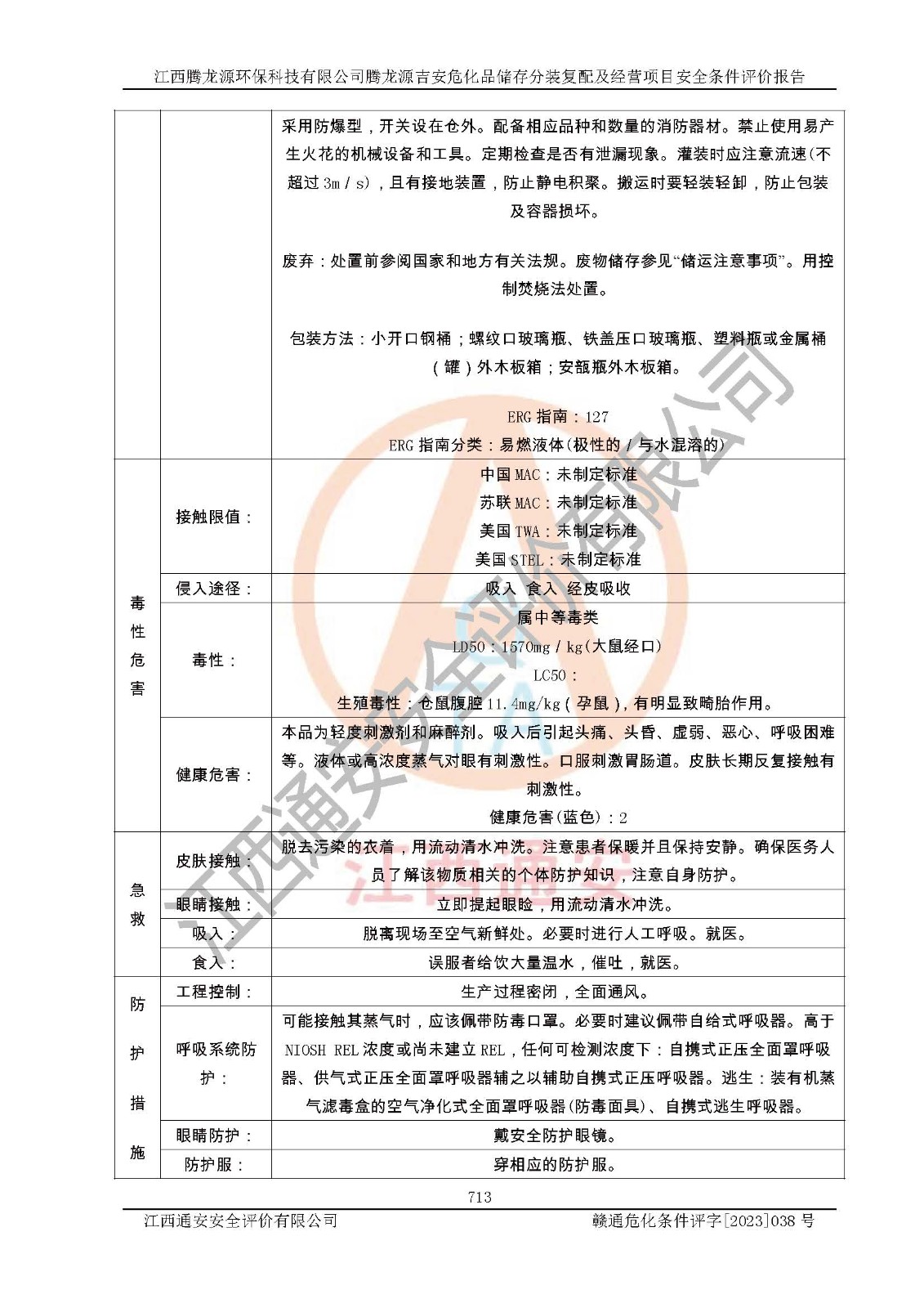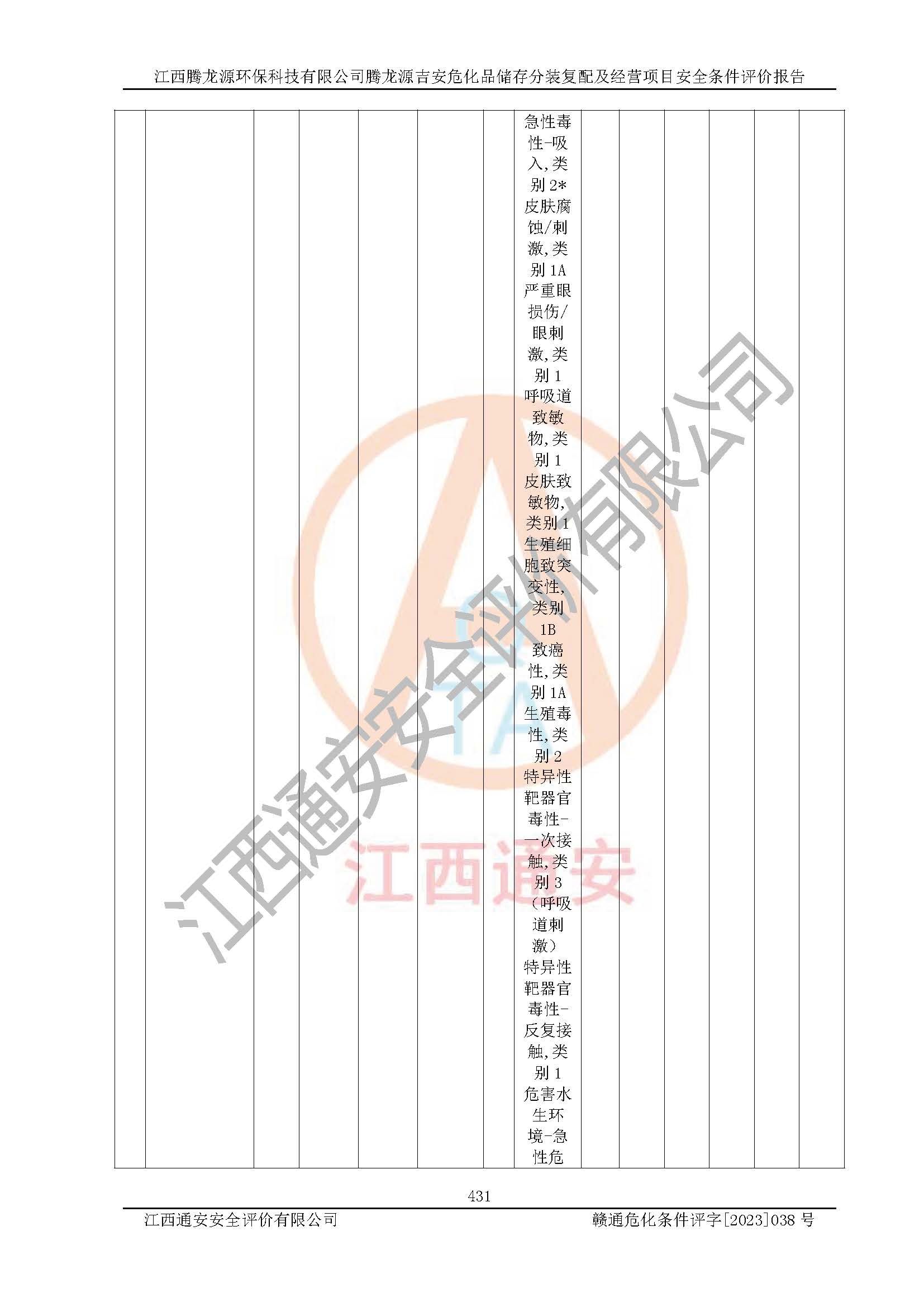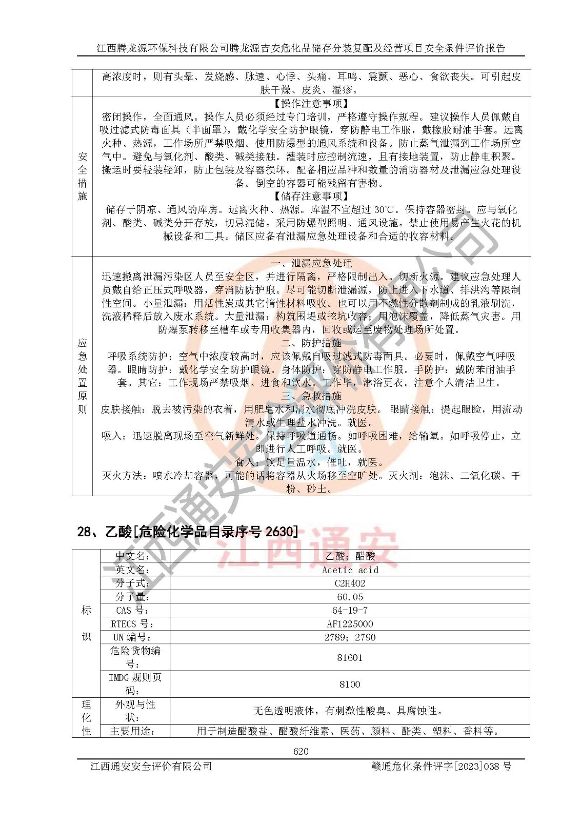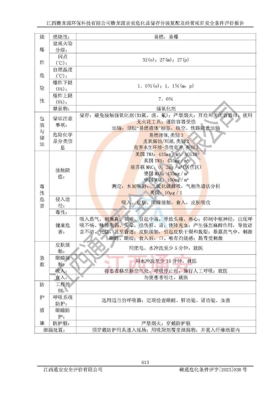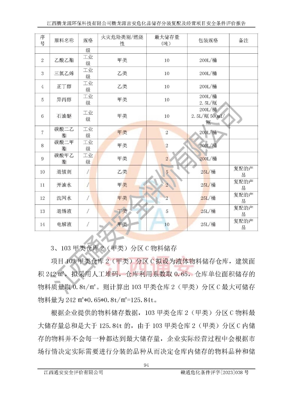 項(xiàng)目簡介 | 江西騰龍?jiān)?*科技有限公司成立于2022年6月20日,并取得吉水縣市場監(jiān)督管理局頒發(fā)的《營業(yè)執(zhí)照》,營業(yè)執(zhí)照統(tǒng)一社會信用代碼:91360822MABQK5GB5P。公司注冊住所:江西省吉安市吉水縣城西工業(yè)園區(qū)二期金龍路。法定**人:吳詩明。注冊資本壹仟萬元整。企業(yè)性質(zhì)為有限責(zé)任公司(自然人投資或控股)。營業(yè)執(zhí)照許可經(jīng)營范圍:一般項(xiàng)目:化工產(chǎn)品銷售(不含許可類化工產(chǎn)品)(除許可業(yè)務(wù)外,可自主依法經(jīng)營法律法規(guī)非禁止或限制的項(xiàng)目)。 江西騰龍?jiān)?*科技有限公司2023年2月24日取得吉水縣發(fā)展和改革委員會頒發(fā)的《江西省企業(yè)投資項(xiàng)目備案通知書》,備案項(xiàng)目名稱為:騰龍?jiān)醇参;穬Υ娣盅b復(fù)配及經(jīng)營項(xiàng)目。項(xiàng)目統(tǒng)一代碼為:2302-360822-04-01-318980。項(xiàng)目總投資20000萬元,項(xiàng)目總占地面積31.34畝。 根據(jù)《危險(xiǎn)化學(xué)品目錄(2015版)》(**安監(jiān)總局等十部門公告[2015]第5號)及應(yīng)急管理部、工業(yè)和信息化部、公安部、生態(tài)環(huán)境部、交通運(yùn)輸部、農(nóng)業(yè)農(nóng)村部、衛(wèi)生健康委、市場監(jiān)管總局、鐵路局、民航局決定調(diào)整《危險(xiǎn)化學(xué)品目錄(2015版)》(應(yīng)急管理部、工業(yè)和信息化部、公安部、生態(tài)環(huán)境部、交通運(yùn)輸部、農(nóng)業(yè)農(nóng)村部、衛(wèi)生健康委、市場監(jiān)管總局、鐵路局、民航局公告2022年第8號)等文件對該項(xiàng)目生產(chǎn)過程中所涉及的化學(xué)品進(jìn)行辨識:項(xiàng)目涉及的硫酸、鹽酸、雙氧水、硝酸、氫氧化鈉(固體和溶液)、次氯酸鈉溶液、氯酸鈉、氯酸鉀、鉻酸酐、高錳酸鈉、高錳酸鉀、硝酸鉀、重鉻酸鉀、重鉻酸鈉、硝酸鈉、亞硝酸鈉、過硫酸鈉、過硫酸銨、過硫酸鉀、漂白粉、氯化亞砜、甲醇、乙醇、二甲苯、甲苯、**、天那水、乙酸、乙酸乙酯、甲醛溶液、三氯乙烯、正丁醇、異丙醇、石油醚、醋酸酐、甲基乙基酮(丁酮)、三氯甲烷、乙醚、氨水(20%)、甲酸、二氯甲烷、**苯、乙酸丁酯、氫氟酸、磷酸、硫化鈉(無水)、氫氧化鉀、氨基磺酸、三氯化鐵、九水硝酸鐵、氯化鋅、硫脲、硼酸、硫酸鎳、氯化鎳、氟化氫銨、氟化氫鉀、氟化氫鈉、偏硅酸鈉、九水偏硅酸鈉、氟硅酸鈉、亞硫酸氫鈉、氟化鈉、氟化鉀、六次甲基四胺、結(jié)晶氯化鋁、碳酸二乙酯、碳酸二甲酯、酸性清洗劑、退鍍劑、開油水、洗網(wǎng)水、污水殺菌劑(復(fù)配的次氯酸鈉溶液)、電解液等屬于危險(xiǎn)化學(xué)品。 江西騰龍?jiān)?*科技有限公司騰龍?jiān)醇参;穬Υ娣盅b復(fù)配及經(jīng)營項(xiàng)目只進(jìn)行物理混合復(fù)配、分裝等作業(yè),不涉及化學(xué)反應(yīng)過程。因此該公司?;穫}儲經(jīng)營活動需要辦理《危險(xiǎn)化學(xué)品經(jīng)營許可證》。 根據(jù)《中華人民共和國監(jiān)控化學(xué)品管理?xiàng)l例》(中華人民共和國***令**90號,經(jīng)中華人民共和國***令第588號修改)及《各類監(jiān)控化學(xué)品名錄》(中華人民共和國工業(yè)和信息化部令第52號;2020年)、《列入第三類監(jiān)控化學(xué)品的新增品種清單》**石油和化學(xué)工業(yè)局令**號等規(guī)定進(jìn)行辨識:項(xiàng)目涉及的氯化亞砜屬于第三類監(jiān)控化學(xué)品。 根據(jù)《易制毒化學(xué)品管理?xiàng)l例》(***令第445號,經(jīng)***令第653號、***第666號、***第703號修改)及附表規(guī)定、中華人民共和國公安部 中華人民共和國商務(wù)部、**衛(wèi)生和計(jì)劃生育委員會、中華人民共和國海關(guān)總署、**安全生產(chǎn)監(jiān)督管理總局、**食品藥品監(jiān)督管理總局《關(guān)于將4-苯胺基-N-苯乙基哌啶、N-苯乙基-4-哌啶酮、N-甲基-1-苯基-1-氯-2-丙胺、溴素、1-苯基-1-**5種物質(zhì)列入易制毒化學(xué)品管理的公告》(國辦函[2017]**20號)、《***辦公廳關(guān)于同意將1-苯基-2-溴-1-**和3-氧-2-苯基丁腈列入易制毒化學(xué)品品種目錄的函》(國辦函[2014]第40號)、《***辦公廳關(guān)于同意將α-苯乙酰乙酸甲酯等6種物質(zhì)列入易制毒化學(xué)品品種目錄的函》(國辦函〔2021〕58號)等進(jìn)行辨識:項(xiàng)目涉及的硫酸、鹽酸、高錳酸鉀、甲苯、**、甲基乙基酮等屬于第三類易制毒化學(xué)品;醋酸酐、三氯甲烷、乙醚等屬于第二類易制毒化學(xué)品。 根據(jù)《危險(xiǎn)化學(xué)品名錄[2015年版]》(**安監(jiān)總局等十部門[2015]第5號)進(jìn)行劇毒化學(xué)品辨識:項(xiàng)目不涉及劇毒化學(xué)品。 根據(jù)《高毒物品目錄(2003年版)》(原衛(wèi)生部衛(wèi)法監(jiān)發(fā)[2003]142號)對項(xiàng)目涉及的化學(xué)品進(jìn)行高毒物品辨識:項(xiàng)目涉及的甲醛溶液、硫酸鎳、氯化鎳、氟化氫銨、氟化氫鉀、氟化氫鈉、氟化鈉、氟化鉀、鉻酸酐、高錳酸鉀、高錳酸鈉、重鉻酸鉀、重鉻酸鈉等屬于高毒物品。 根據(jù)中華人民共和國公安部《易制爆危險(xiǎn)化學(xué)品名錄》(2017年版)中規(guī)定進(jìn)行辨識:項(xiàng)目涉及的雙氧水、硝酸、氯酸鈉、氯酸鉀、高錳酸鉀、高錳酸鈉、硝酸鉀、重鉻酸鉀、重鉻酸鈉、硝酸鈉、六次甲基四胺等屬于易