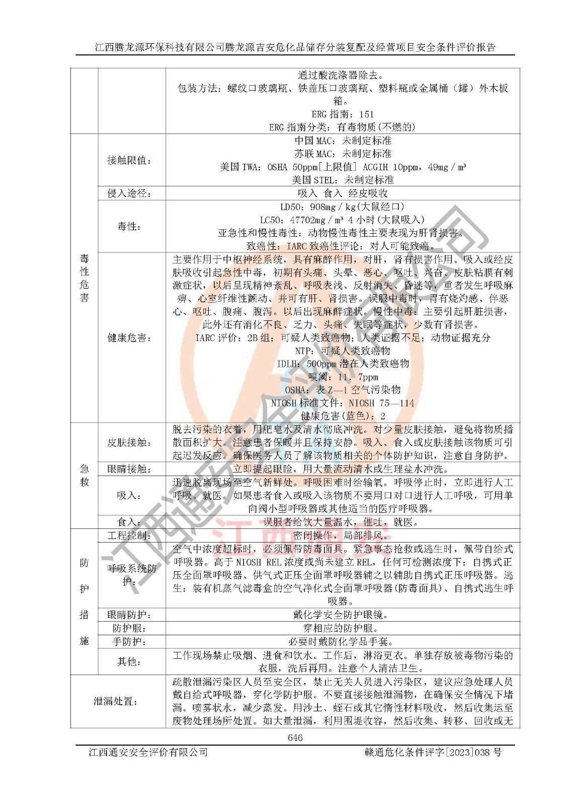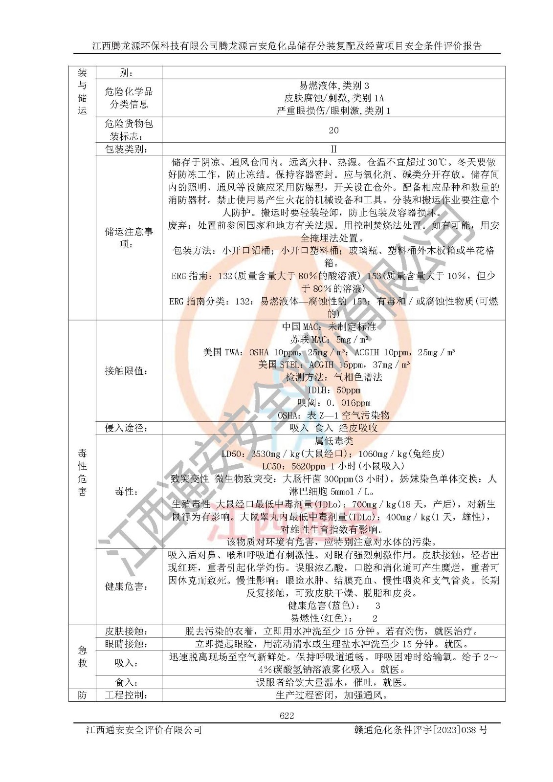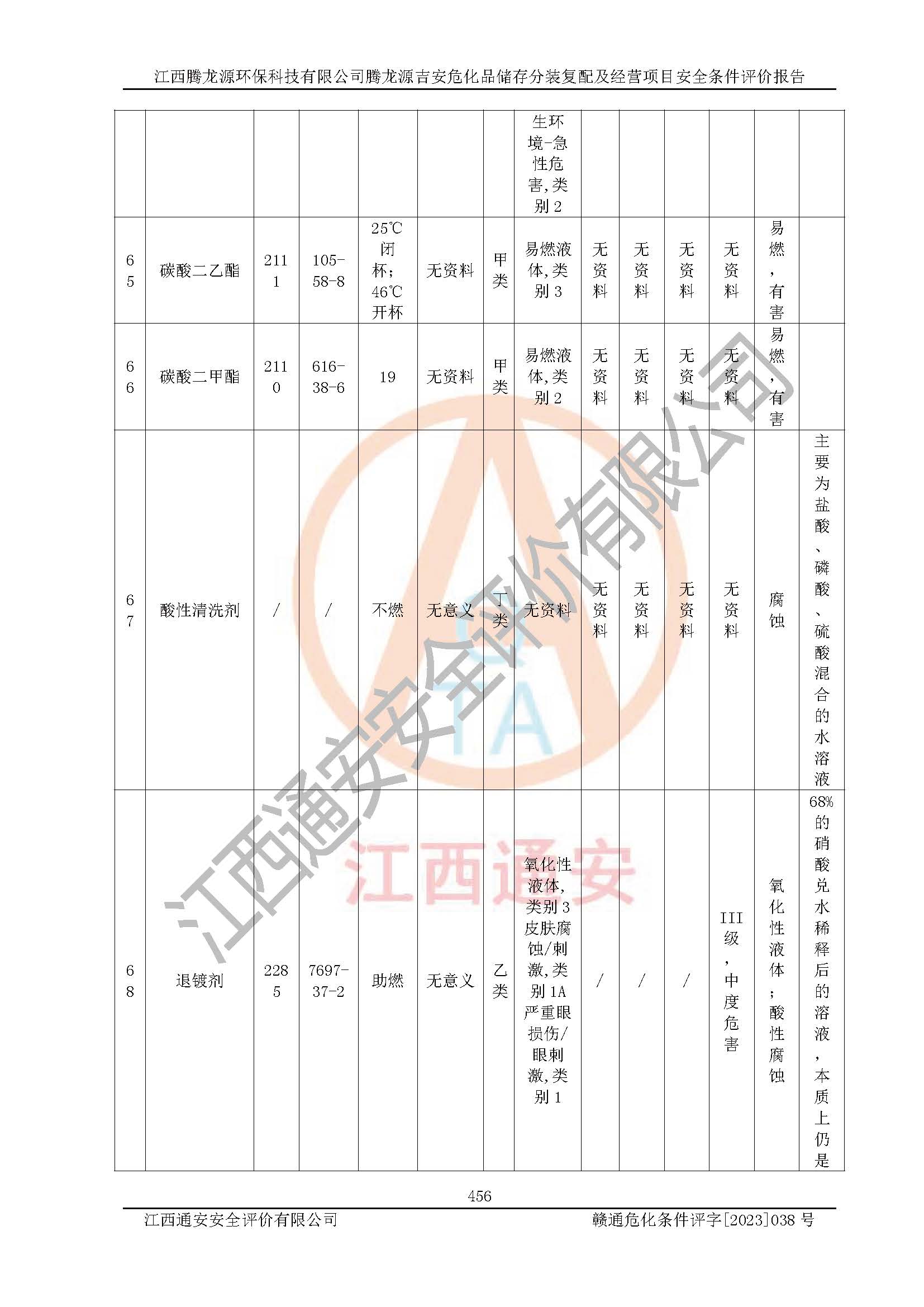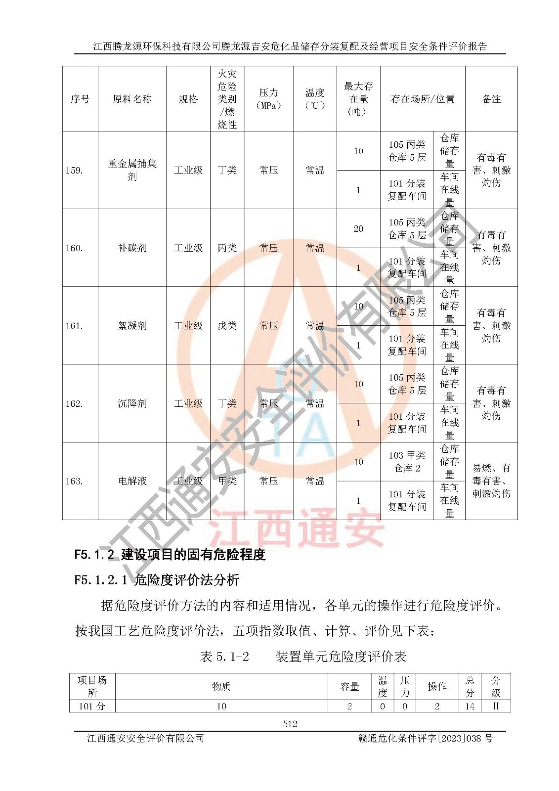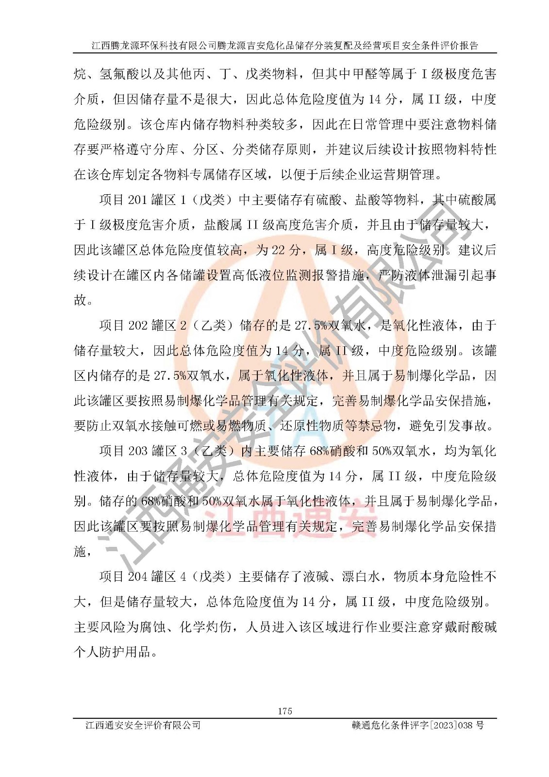 項(xiàng)目簡介 | 江西騰龍?jiān)?*科技有限公司成立于2022年6月20日,并取得吉水縣市場監(jiān)督管理局頒發(fā)的《營業(yè)執(zhí)照》,營業(yè)執(zhí)照統(tǒng)一社會信用代碼:91360822MABQK5GB5P。公司注冊住所:江西省吉安市吉水縣城西工業(yè)園區(qū)二期金龍路。法定**人:吳詩明。注冊資本壹仟萬元整。企業(yè)性質(zhì)為有限責(zé)任公司(自然人投資或控股)。營業(yè)執(zhí)照許可經(jīng)營范圍:一般項(xiàng)目:化工產(chǎn)品銷售(不含許可類化工產(chǎn)品)(除許可業(yè)務(wù)外,可自主依法經(jīng)營法律法規(guī)非禁止或限制的項(xiàng)目)。 江西騰龍?jiān)?*科技有限公司2023年2月24日取得吉水縣發(fā)展和改革委員會頒發(fā)的《江西省企業(yè)投資項(xiàng)目備案通知書》,備案項(xiàng)目名稱為:騰龍?jiān)醇参;穬Υ娣盅b復(fù)配及經(jīng)營項(xiàng)目。項(xiàng)目統(tǒng)一代碼為:2302-360822-04-01-318980。項(xiàng)目總投資20000萬元,項(xiàng)目總占地面積31.34畝。 根據(jù)《危險(xiǎn)化學(xué)品目錄(2015版)》(**安監(jiān)總局等十部門公告[2015]第5號)及應(yīng)急管理部、工業(yè)和信息化部、公安部、生態(tài)環(huán)境部、交通運(yùn)輸部、農(nóng)業(yè)農(nóng)村部、衛(wèi)生健康委、市場監(jiān)管總局、鐵路局、民航局決定調(diào)整《危險(xiǎn)化學(xué)品目錄(2015版)》(應(yīng)急管理部、工業(yè)和信息化部、公安部、生態(tài)環(huán)境部、交通運(yùn)輸部、農(nóng)業(yè)農(nóng)村部、衛(wèi)生健康委、市場監(jiān)管總局、鐵路局、民航局公告2022年第8號)等文件對該項(xiàng)目生產(chǎn)過程中所涉及的化學(xué)品進(jìn)行辨識:項(xiàng)目涉及的硫酸、鹽酸、雙氧水、硝酸、氫氧化鈉(固體和溶液)、次氯酸鈉溶液、氯酸鈉、氯酸鉀、鉻酸酐、高錳酸鈉、高錳酸鉀、硝酸鉀、重鉻酸鉀、重鉻酸鈉、硝酸鈉、亞硝酸鈉、過硫酸鈉、過硫酸銨、過硫酸鉀、漂白粉、氯化亞砜、甲醇、乙醇、二甲苯、甲苯、**、天那水、乙酸、乙酸乙酯、甲醛溶液、三氯乙烯、正丁醇、異丙醇、石油醚、醋酸酐、甲基乙基酮(丁酮)、三氯甲烷、乙醚、氨水(20%)、甲酸、二氯甲烷、**苯、乙酸丁酯、氫氟酸、磷酸、硫化鈉(無水)、氫氧化鉀、氨基磺酸、三氯化鐵、九水硝酸鐵、氯化鋅、硫脲、硼酸、硫酸鎳、氯化鎳、氟化氫銨、氟化氫鉀、氟化氫鈉、偏硅酸鈉、九水偏硅酸鈉、氟硅酸鈉、亞硫酸氫鈉、氟化鈉、氟化鉀、六次甲基四胺、結(jié)晶氯化鋁、碳酸二乙酯、碳酸二甲酯、酸性清洗劑、退鍍劑、開油水、洗網(wǎng)水、污水殺菌劑(復(fù)配的次氯酸鈉溶液)、電解液等屬于危險(xiǎn)化學(xué)品。 江西騰龍?jiān)?*科技有限公司騰龍?jiān)醇参;穬Υ娣盅b復(fù)配及經(jīng)營項(xiàng)目只進(jìn)行物理混合復(fù)配、分裝等作業(yè),不涉及化學(xué)反應(yīng)過程。因此該公司?;穫}儲經(jīng)營活動需要辦理《危險(xiǎn)化學(xué)品經(jīng)營許可證》。 根據(jù)《中華人民共和國監(jiān)控化學(xué)品管理?xiàng)l例》(中華人民共和國***令**90號,經(jīng)中華人民共和國***令第588號修改)及《各類監(jiān)控化學(xué)品名錄》(中華人民共和國工業(yè)和信息化部令第52號;2020年)、《列入第三類監(jiān)控化學(xué)品的新增品種清單》**石油和化學(xué)工業(yè)局令**號等規(guī)定進(jìn)行辨識:項(xiàng)目涉及的氯化亞砜屬于第三類監(jiān)控化學(xué)品。 根據(jù)《易制毒化學(xué)品管理?xiàng)l例》(***令第445號,經(jīng)***令第653號、***第666號、***第703號修改)及附表規(guī)定、中華人民共和國公安部 中華人民共和國商務(wù)部、**衛(wèi)生和計(jì)劃生育委員會、中華人民共和國海關(guān)總署、**安全生產(chǎn)監(jiān)督管理總局、**食品藥品監(jiān)督管理總局《關(guān)于將4-苯胺基-N-苯乙基哌啶、N-苯乙基-4-哌啶酮、N-甲基-1-苯基-1-氯-2-丙胺、溴素、1-苯基-1-**5種物質(zhì)列入易制毒化學(xué)品管理的公告》(國辦函[2017]**20號)、《***辦公廳關(guān)于同意將1-苯基-2-溴-1-**和3-氧-2-苯基丁腈列入易制毒化學(xué)品品種目錄的函》(國辦函[2014]第40號)、《***辦公廳關(guān)于同意將α-苯乙酰乙酸甲酯等6種物質(zhì)列入易制毒化學(xué)品品種目錄的函》(國辦函〔2021〕58號)等進(jìn)行辨識:項(xiàng)目涉及的硫酸、鹽酸、高錳酸鉀、甲苯、**、甲基乙基酮等屬于第三類易制毒化學(xué)品;醋酸酐、三氯甲烷、乙醚等屬于第二類易制毒化學(xué)品。 根據(jù)《危險(xiǎn)化學(xué)品名錄[2015年版]》(**安監(jiān)總局等十部門[2015]第5號)進(jìn)行劇毒化學(xué)品辨識:項(xiàng)目不涉及劇毒化學(xué)品。 根據(jù)《高毒物品目錄(2003年版)》(原衛(wèi)生部衛(wèi)法監(jiān)發(fā)[2003]142號)對項(xiàng)目涉及的化學(xué)品進(jìn)行高毒物品辨識:項(xiàng)目涉及的甲醛溶液、硫酸鎳、氯化鎳、氟化氫銨、氟化氫鉀、氟化氫鈉、氟化鈉、氟化鉀、鉻酸酐、高錳酸鉀、高錳酸鈉、重鉻酸鉀、重鉻酸鈉等屬于高毒物品。 根據(jù)中華人民共和國公安部《易制爆危險(xiǎn)化學(xué)品名錄》(2017年版)中規(guī)定進(jìn)行辨識:項(xiàng)目涉及的雙氧水、硝酸、氯酸鈉、氯酸鉀、高錳酸鉀、高錳酸鈉、硝酸鉀、重鉻酸鉀、重鉻酸鈉、硝酸鈉、六次甲基四胺等屬于易