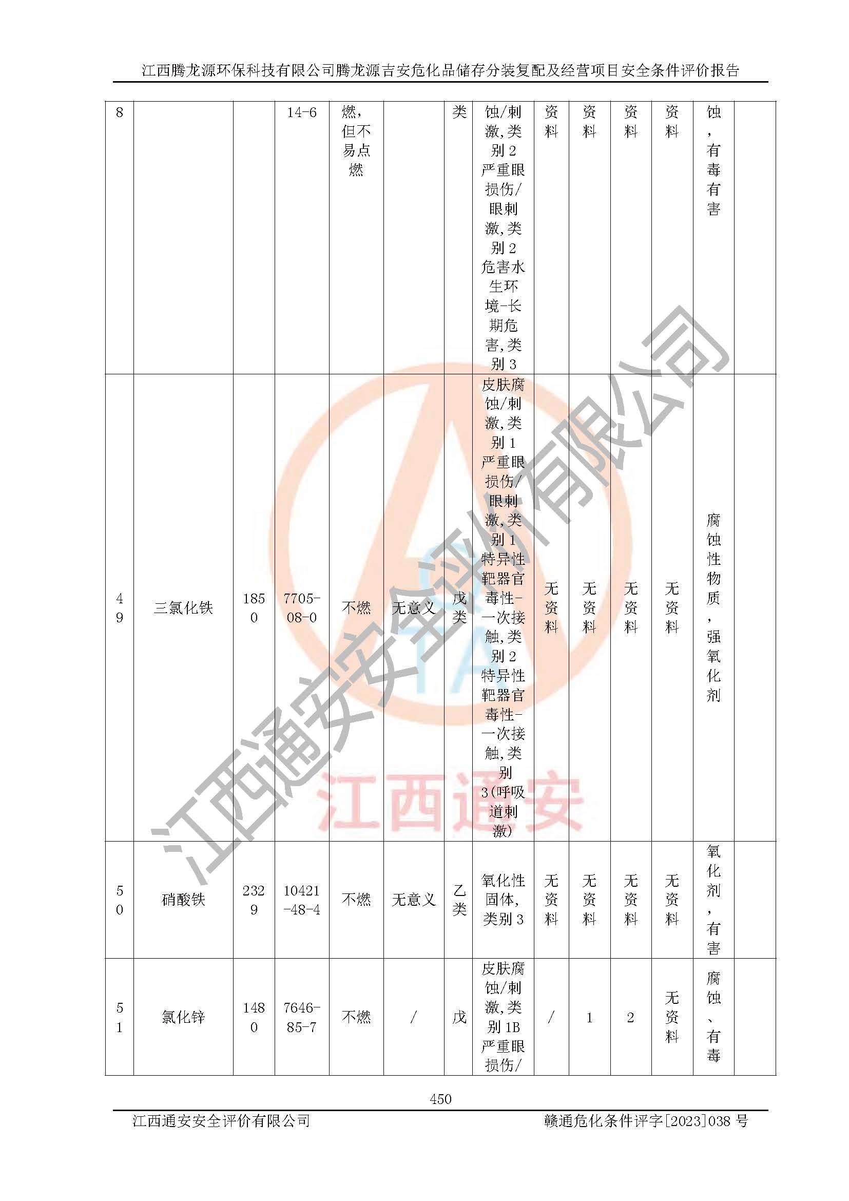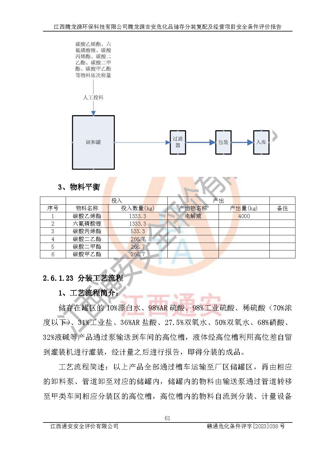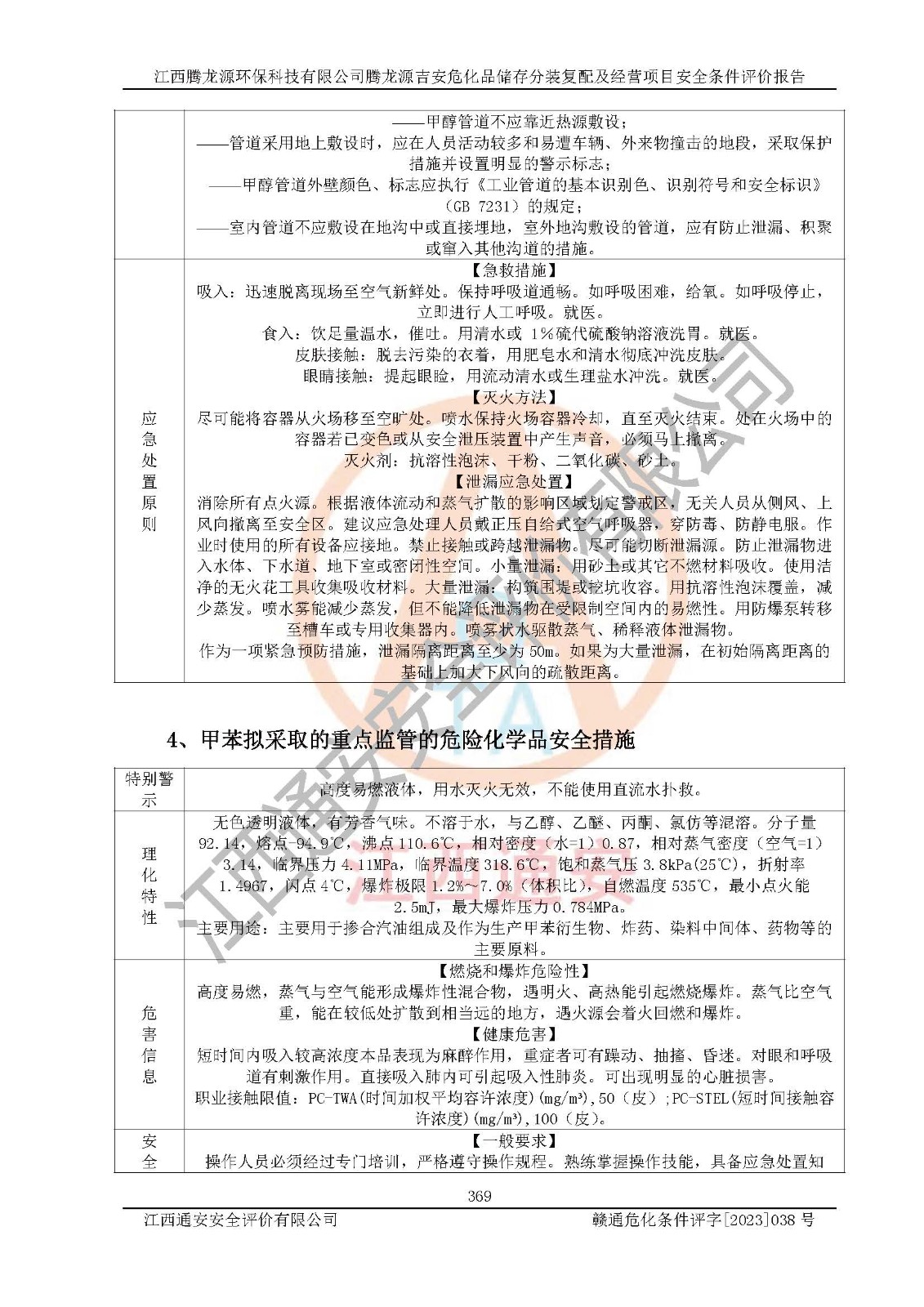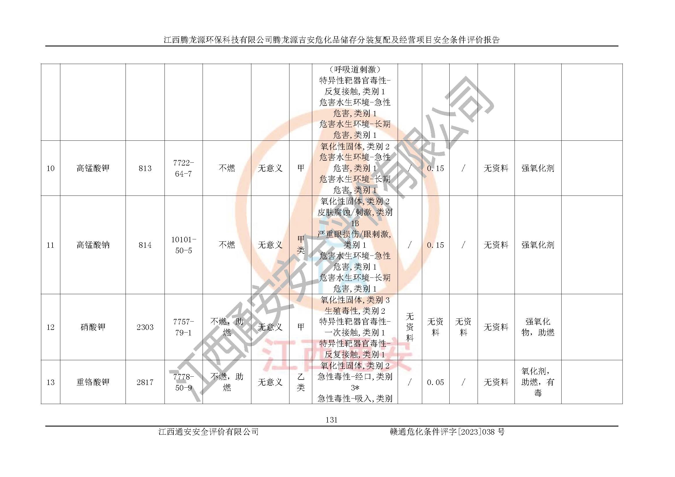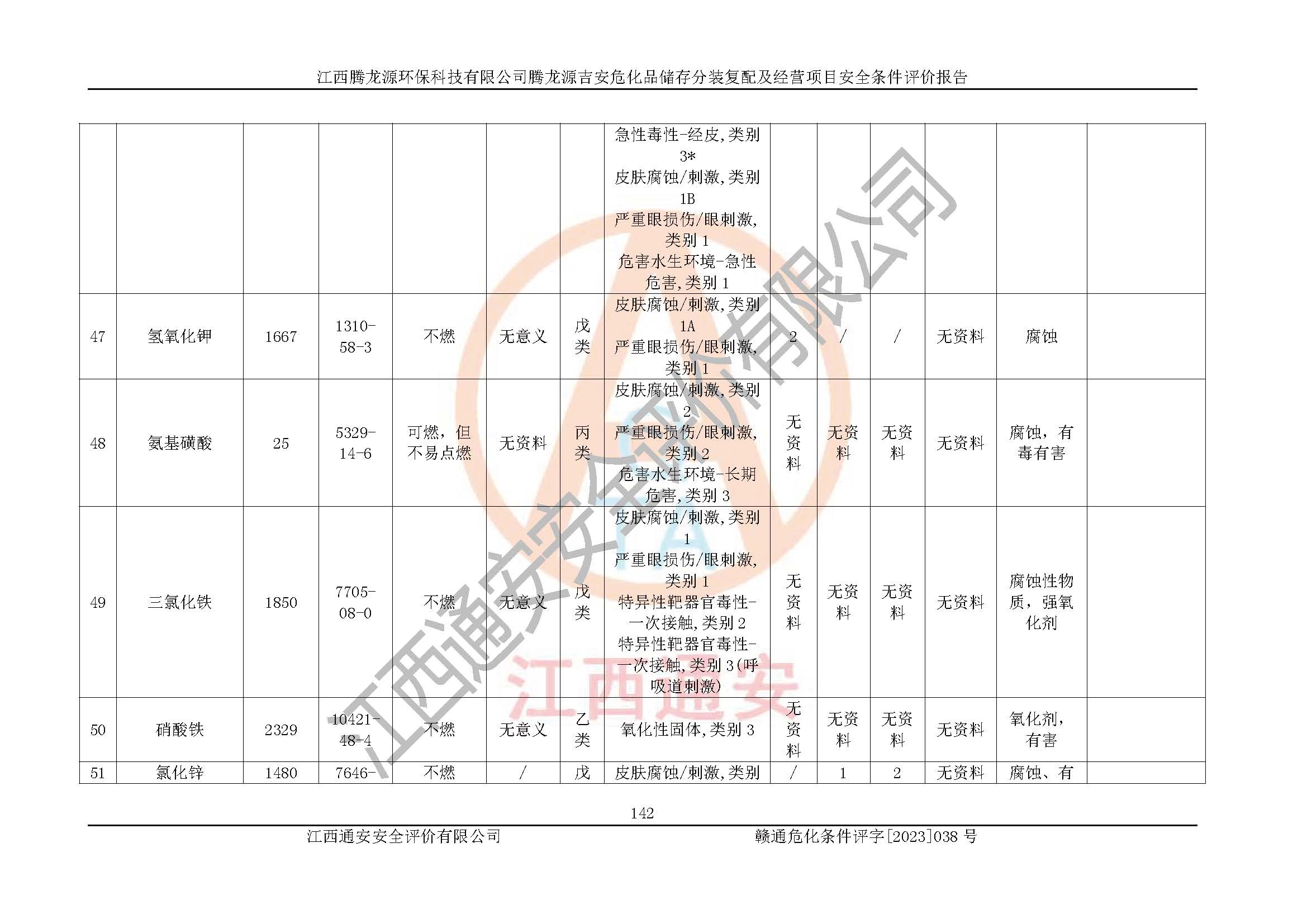 項(xiàng)目簡介 | 江西騰龍?jiān)?*科技有限公司成立于2022年6月20日,并取得吉水縣市場監(jiān)督管理局頒發(fā)的《營業(yè)執(zhí)照》,營業(yè)執(zhí)照統(tǒng)一社會信用代碼:91360822MABQK5GB5P。公司注冊住所:江西省吉安市吉水縣城西工業(yè)園區(qū)二期金龍路。法定**人:吳詩明。注冊資本壹仟萬元整。企業(yè)性質(zhì)為有限責(zé)任公司(自然人投資或控股)。營業(yè)執(zhí)照許可經(jīng)營范圍:一般項(xiàng)目:化工產(chǎn)品銷售(不含許可類化工產(chǎn)品)(除許可業(yè)務(wù)外,可自主依法經(jīng)營法律法規(guī)非禁止或限制的項(xiàng)目)。 江西騰龍?jiān)?*科技有限公司2023年2月24日取得吉水縣發(fā)展和改革委員會頒發(fā)的《江西省企業(yè)投資項(xiàng)目備案通知書》,備案項(xiàng)目名稱為:騰龍?jiān)醇参;穬Υ娣盅b復(fù)配及經(jīng)營項(xiàng)目。項(xiàng)目統(tǒng)一代碼為:2302-360822-04-01-318980。項(xiàng)目總投資20000萬元,項(xiàng)目總占地面積31.34畝。 根據(jù)《危險(xiǎn)化學(xué)品目錄(2015版)》(**安監(jiān)總局等十部門公告[2015]第5號)及應(yīng)急管理部、工業(yè)和信息化部、公安部、生態(tài)環(huán)境部、交通運(yùn)輸部、農(nóng)業(yè)農(nóng)村部、衛(wèi)生健康委、市場監(jiān)管總局、鐵路局、民航局決定調(diào)整《危險(xiǎn)化學(xué)品目錄(2015版)》(應(yīng)急管理部、工業(yè)和信息化部、公安部、生態(tài)環(huán)境部、交通運(yùn)輸部、農(nóng)業(yè)農(nóng)村部、衛(wèi)生健康委、市場監(jiān)管總局、鐵路局、民航局公告2022年第8號)等文件對該項(xiàng)目生產(chǎn)過程中所涉及的化學(xué)品進(jìn)行辨識:項(xiàng)目涉及的硫酸、鹽酸、雙氧水、硝酸、氫氧化鈉(固體和溶液)、次氯酸鈉溶液、氯酸鈉、氯酸鉀、鉻酸酐、高錳酸鈉、高錳酸鉀、硝酸鉀、重鉻酸鉀、重鉻酸鈉、硝酸鈉、亞硝酸鈉、過硫酸鈉、過硫酸銨、過硫酸鉀、漂白粉、氯化亞砜、甲醇、乙醇、二甲苯、甲苯、**、天那水、乙酸、乙酸乙酯、甲醛溶液、三氯乙烯、正丁醇、異丙醇、石油醚、醋酸酐、甲基乙基酮(丁酮)、三氯甲烷、乙醚、氨水(20%)、甲酸、二氯甲烷、**苯、乙酸丁酯、氫氟酸、磷酸、硫化鈉(無水)、氫氧化鉀、氨基磺酸、三氯化鐵、九水硝酸鐵、氯化鋅、硫脲、硼酸、硫酸鎳、氯化鎳、氟化氫銨、氟化氫鉀、氟化氫鈉、偏硅酸鈉、九水偏硅酸鈉、氟硅酸鈉、亞硫酸氫鈉、氟化鈉、氟化鉀、六次甲基四胺、結(jié)晶氯化鋁、碳酸二乙酯、碳酸二甲酯、酸性清洗劑、退鍍劑、開油水、洗網(wǎng)水、污水殺菌劑(復(fù)配的次氯酸鈉溶液)、電解液等屬于危險(xiǎn)化學(xué)品。 江西騰龍?jiān)?*科技有限公司騰龍?jiān)醇参;穬Υ娣盅b復(fù)配及經(jīng)營項(xiàng)目只進(jìn)行物理混合復(fù)配、分裝等作業(yè),不涉及化學(xué)反應(yīng)過程。因此該公司?;穫}儲經(jīng)營活動需要辦理《危險(xiǎn)化學(xué)品經(jīng)營許可證》。 根據(jù)《中華人民共和國監(jiān)控化學(xué)品管理?xiàng)l例》(中華人民共和國***令**90號,經(jīng)中華人民共和國***令第588號修改)及《各類監(jiān)控化學(xué)品名錄》(中華人民共和國工業(yè)和信息化部令第52號;2020年)、《列入第三類監(jiān)控化學(xué)品的新增品種清單》**石油和化學(xué)工業(yè)局令**號等規(guī)定進(jìn)行辨識:項(xiàng)目涉及的氯化亞砜屬于第三類監(jiān)控化學(xué)品。 根據(jù)《易制毒化學(xué)品管理?xiàng)l例》(***令第445號,經(jīng)***令第653號、***第666號、***第703號修改)及附表規(guī)定、中華人民共和國公安部 中華人民共和國商務(wù)部、**衛(wèi)生和計(jì)劃生育委員會、中華人民共和國海關(guān)總署、**安全生產(chǎn)監(jiān)督管理總局、**食品藥品監(jiān)督管理總局《關(guān)于將4-苯胺基-N-苯乙基哌啶、N-苯乙基-4-哌啶酮、N-甲基-1-苯基-1-氯-2-丙胺、溴素、1-苯基-1-**5種物質(zhì)列入易制毒化學(xué)品管理的公告》(國辦函[2017]**20號)、《***辦公廳關(guān)于同意將1-苯基-2-溴-1-**和3-氧-2-苯基丁腈列入易制毒化學(xué)品品種目錄的函》(國辦函[2014]第40號)、《***辦公廳關(guān)于同意將α-苯乙酰乙酸甲酯等6種物質(zhì)列入易制毒化學(xué)品品種目錄的函》(國辦函〔2021〕58號)等進(jìn)行辨識:項(xiàng)目涉及的硫酸、鹽酸、高錳酸鉀、甲苯、**、甲基乙基酮等屬于第三類易制毒化學(xué)品;醋酸酐、三氯甲烷、乙醚等屬于第二類易制毒化學(xué)品。 根據(jù)《危險(xiǎn)化學(xué)品名錄[2015年版]》(**安監(jiān)總局等十部門[2015]第5號)進(jìn)行劇毒化學(xué)品辨識:項(xiàng)目不涉及劇毒化學(xué)品。 根據(jù)《高毒物品目錄(2003年版)》(原衛(wèi)生部衛(wèi)法監(jiān)發(fā)[2003]142號)對項(xiàng)目涉及的化學(xué)品進(jìn)行高毒物品辨識:項(xiàng)目涉及的甲醛溶液、硫酸鎳、氯化鎳、氟化氫銨、氟化氫鉀、氟化氫鈉、氟化鈉、氟化鉀、鉻酸酐、高錳酸鉀、高錳酸鈉、重鉻酸鉀、重鉻酸鈉等屬于高毒物品。 根據(jù)中華人民共和國公安部《易制爆危險(xiǎn)化學(xué)品名錄》(2017年版)中規(guī)定進(jìn)行辨識:項(xiàng)目涉及的雙氧水、硝酸、氯酸鈉、氯酸鉀、高錳酸鉀、高錳酸鈉、硝酸鉀、重鉻酸鉀、重鉻酸鈉、硝酸鈉、六次甲基四胺等屬于易