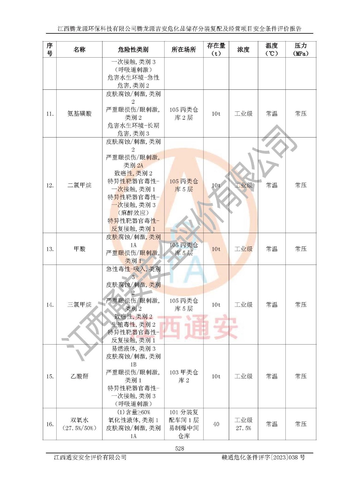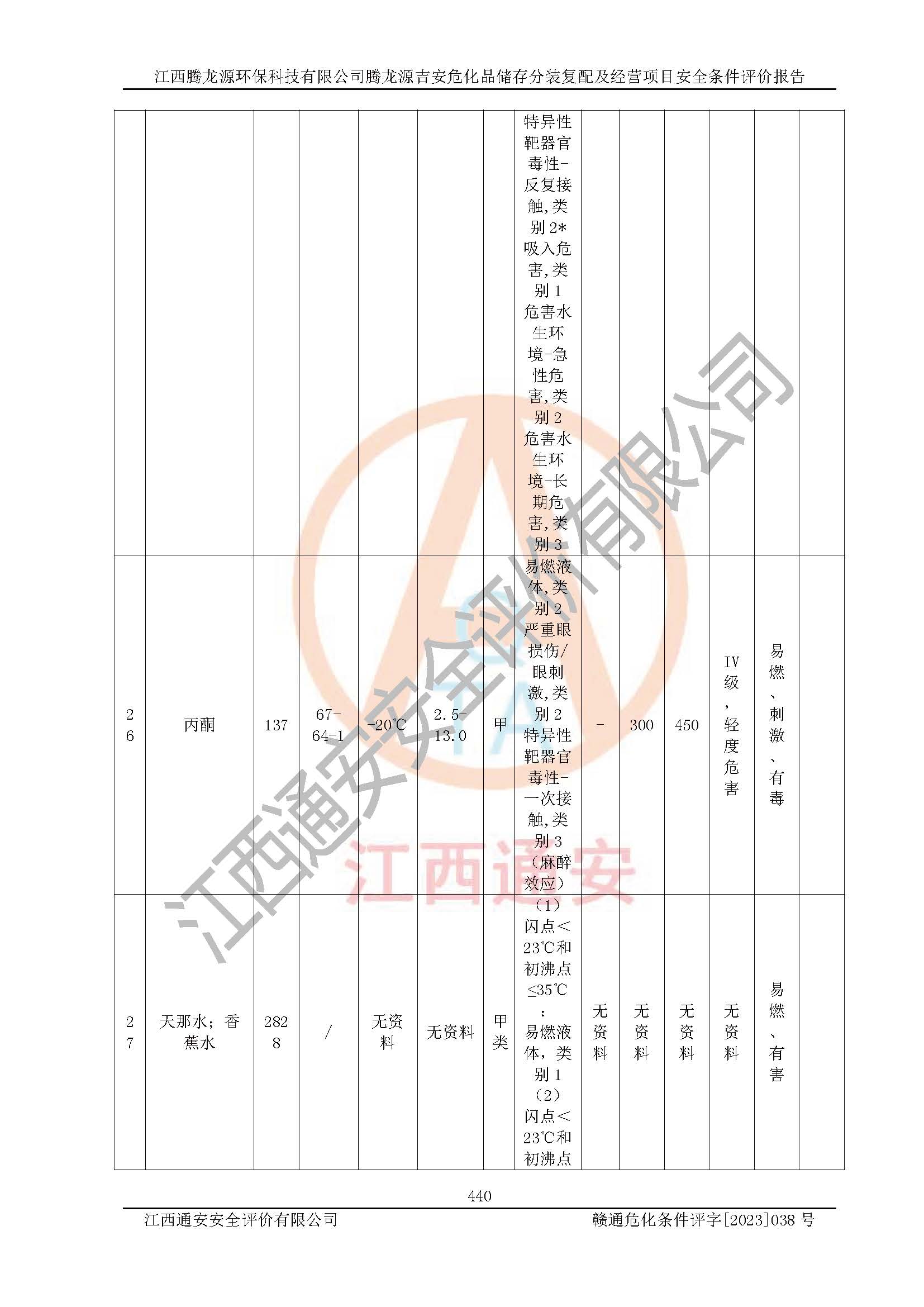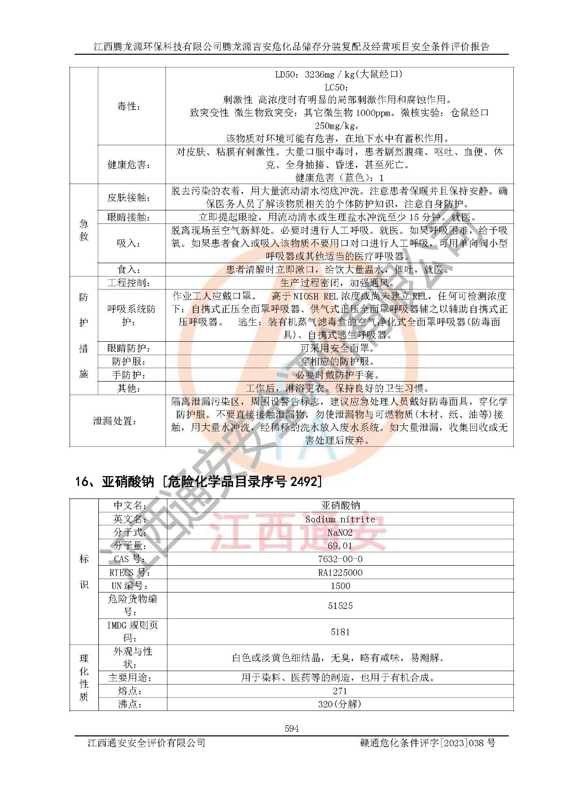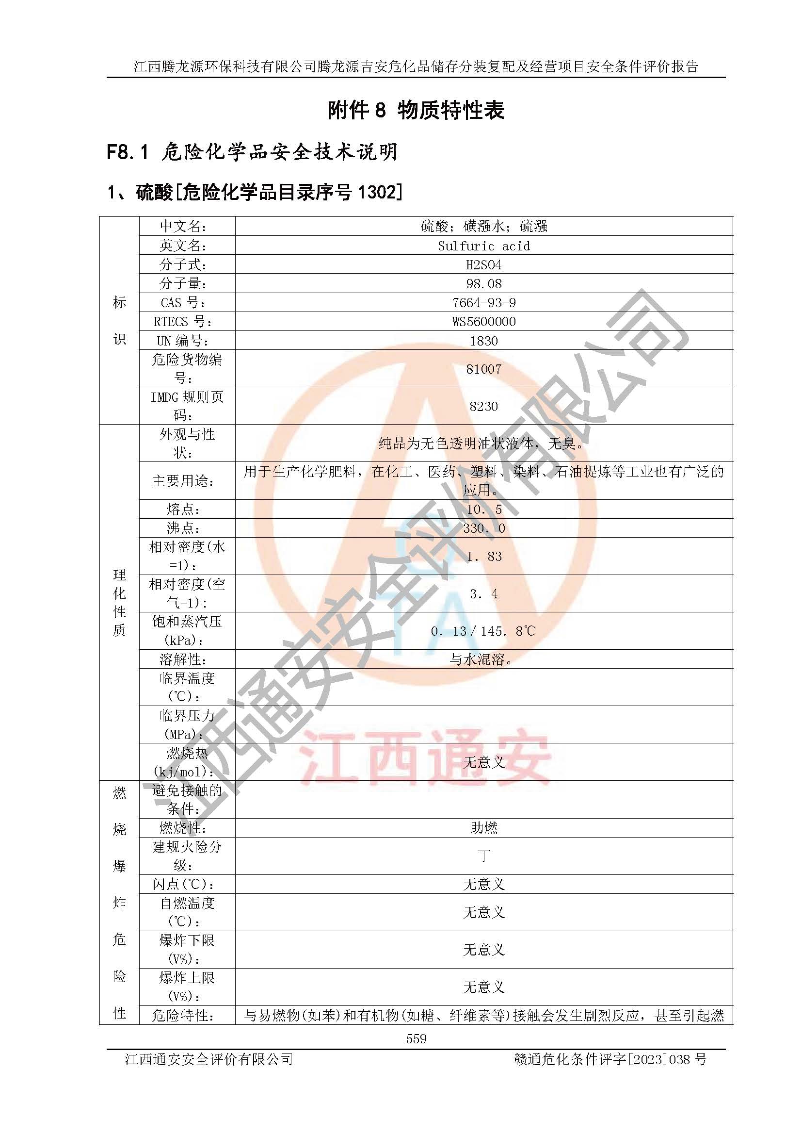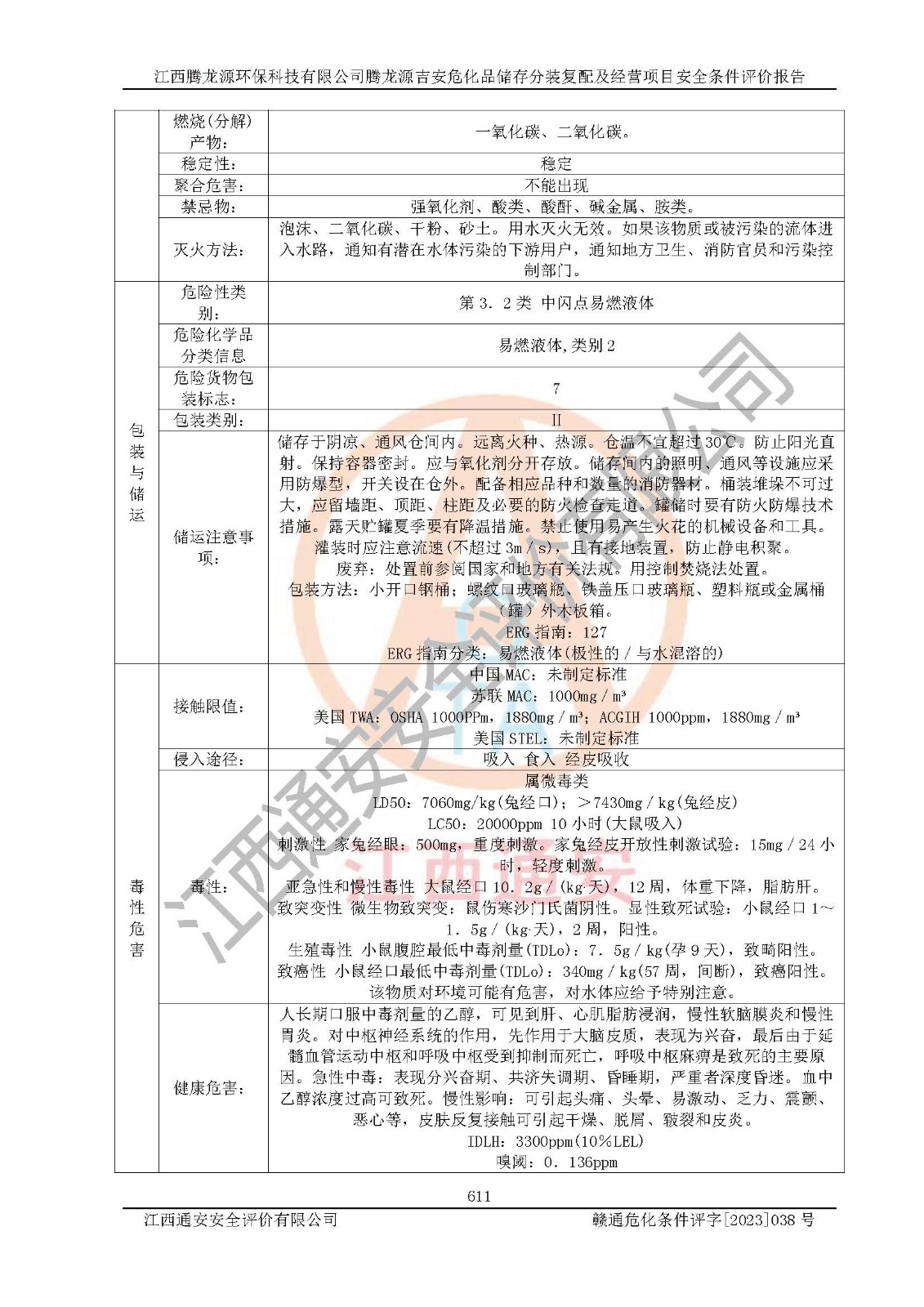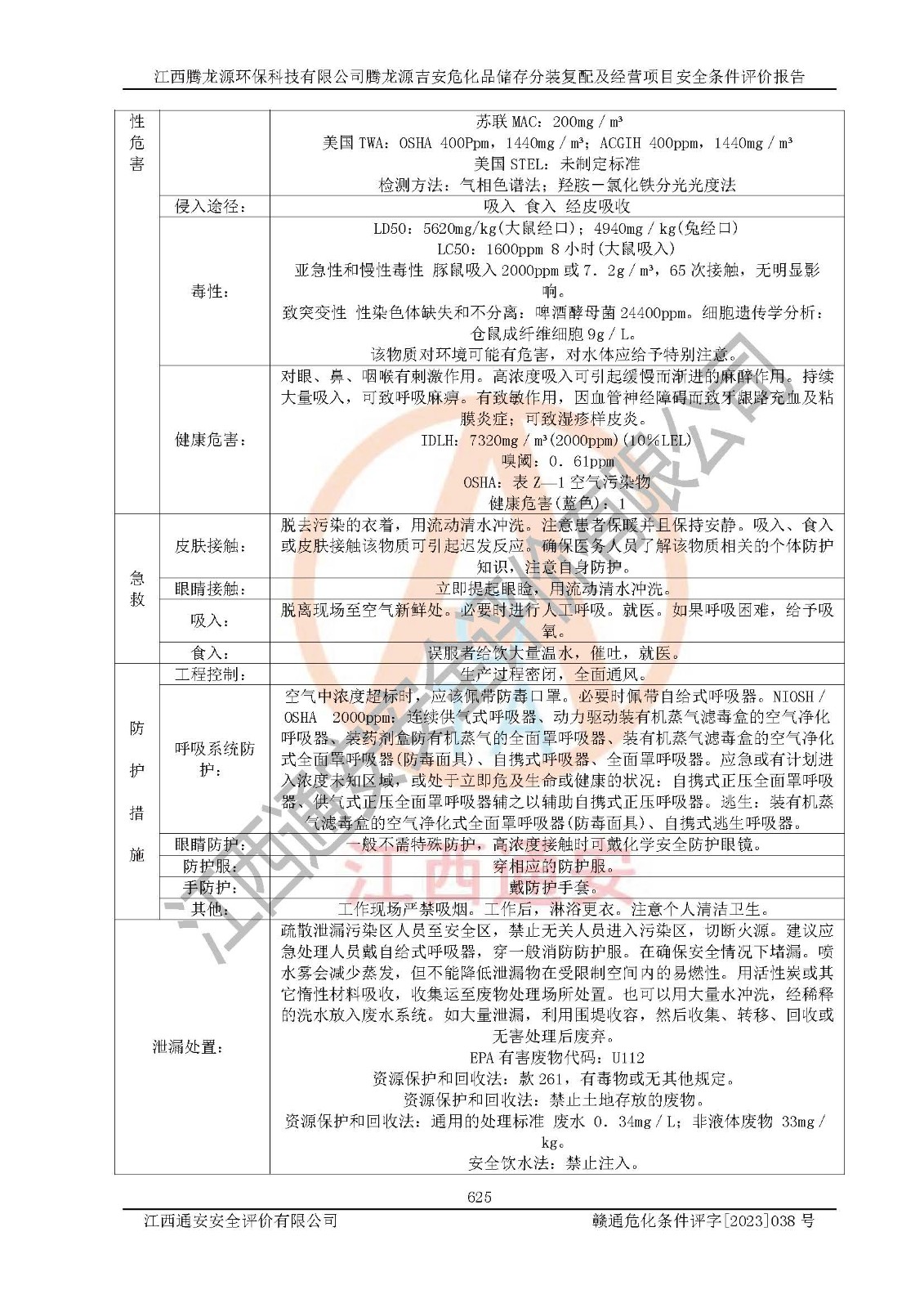 項(xiàng)目簡介 | 江西騰龍?jiān)?*科技有限公司成立于2022年6月20日,并取得吉水縣市場監(jiān)督管理局頒發(fā)的《營業(yè)執(zhí)照》,營業(yè)執(zhí)照統(tǒng)一社會信用代碼:91360822MABQK5GB5P。公司注冊住所:江西省吉安市吉水縣城西工業(yè)園區(qū)二期金龍路。法定**人:吳詩明。注冊資本壹仟萬元整。企業(yè)性質(zhì)為有限責(zé)任公司(自然人投資或控股)。營業(yè)執(zhí)照許可經(jīng)營范圍:一般項(xiàng)目:化工產(chǎn)品銷售(不含許可類化工產(chǎn)品)(除許可業(yè)務(wù)外,可自主依法經(jīng)營法律法規(guī)非禁止或限制的項(xiàng)目)。 江西騰龍?jiān)?*科技有限公司2023年2月24日取得吉水縣發(fā)展和改革委員會頒發(fā)的《江西省企業(yè)投資項(xiàng)目備案通知書》,備案項(xiàng)目名稱為:騰龍?jiān)醇参;穬Υ娣盅b復(fù)配及經(jīng)營項(xiàng)目。項(xiàng)目統(tǒng)一代碼為:2302-360822-04-01-318980。項(xiàng)目總投資20000萬元,項(xiàng)目總占地面積31.34畝。 根據(jù)《危險(xiǎn)化學(xué)品目錄(2015版)》(**安監(jiān)總局等十部門公告[2015]第5號)及應(yīng)急管理部、工業(yè)和信息化部、公安部、生態(tài)環(huán)境部、交通運(yùn)輸部、農(nóng)業(yè)農(nóng)村部、衛(wèi)生健康委、市場監(jiān)管總局、鐵路局、民航局決定調(diào)整《危險(xiǎn)化學(xué)品目錄(2015版)》(應(yīng)急管理部、工業(yè)和信息化部、公安部、生態(tài)環(huán)境部、交通運(yùn)輸部、農(nóng)業(yè)農(nóng)村部、衛(wèi)生健康委、市場監(jiān)管總局、鐵路局、民航局公告2022年第8號)等文件對該項(xiàng)目生產(chǎn)過程中所涉及的化學(xué)品進(jìn)行辨識:項(xiàng)目涉及的硫酸、鹽酸、雙氧水、硝酸、氫氧化鈉(固體和溶液)、次氯酸鈉溶液、氯酸鈉、氯酸鉀、鉻酸酐、高錳酸鈉、高錳酸鉀、硝酸鉀、重鉻酸鉀、重鉻酸鈉、硝酸鈉、亞硝酸鈉、過硫酸鈉、過硫酸銨、過硫酸鉀、漂白粉、氯化亞砜、甲醇、乙醇、二甲苯、甲苯、**、天那水、乙酸、乙酸乙酯、甲醛溶液、三氯乙烯、正丁醇、異丙醇、石油醚、醋酸酐、甲基乙基酮(丁酮)、三氯甲烷、乙醚、氨水(20%)、甲酸、二氯甲烷、**苯、乙酸丁酯、氫氟酸、磷酸、硫化鈉(無水)、氫氧化鉀、氨基磺酸、三氯化鐵、九水硝酸鐵、氯化鋅、硫脲、硼酸、硫酸鎳、氯化鎳、氟化氫銨、氟化氫鉀、氟化氫鈉、偏硅酸鈉、九水偏硅酸鈉、氟硅酸鈉、亞硫酸氫鈉、氟化鈉、氟化鉀、六次甲基四胺、結(jié)晶氯化鋁、碳酸二乙酯、碳酸二甲酯、酸性清洗劑、退鍍劑、開油水、洗網(wǎng)水、污水殺菌劑(復(fù)配的次氯酸鈉溶液)、電解液等屬于危險(xiǎn)化學(xué)品。 江西騰龍?jiān)?*科技有限公司騰龍?jiān)醇参;穬Υ娣盅b復(fù)配及經(jīng)營項(xiàng)目只進(jìn)行物理混合復(fù)配、分裝等作業(yè),不涉及化學(xué)反應(yīng)過程。因此該公司?;穫}儲經(jīng)營活動需要辦理《危險(xiǎn)化學(xué)品經(jīng)營許可證》。 根據(jù)《中華人民共和國監(jiān)控化學(xué)品管理?xiàng)l例》(中華人民共和國***令**90號,經(jīng)中華人民共和國***令第588號修改)及《各類監(jiān)控化學(xué)品名錄》(中華人民共和國工業(yè)和信息化部令第52號;2020年)、《列入第三類監(jiān)控化學(xué)品的新增品種清單》**石油和化學(xué)工業(yè)局令**號等規(guī)定進(jìn)行辨識:項(xiàng)目涉及的氯化亞砜屬于第三類監(jiān)控化學(xué)品。 根據(jù)《易制毒化學(xué)品管理?xiàng)l例》(***令第445號,經(jīng)***令第653號、***第666號、***第703號修改)及附表規(guī)定、中華人民共和國公安部 中華人民共和國商務(wù)部、**衛(wèi)生和計(jì)劃生育委員會、中華人民共和國海關(guān)總署、**安全生產(chǎn)監(jiān)督管理總局、**食品藥品監(jiān)督管理總局《關(guān)于將4-苯胺基-N-苯乙基哌啶、N-苯乙基-4-哌啶酮、N-甲基-1-苯基-1-氯-2-丙胺、溴素、1-苯基-1-**5種物質(zhì)列入易制毒化學(xué)品管理的公告》(國辦函[2017]**20號)、《***辦公廳關(guān)于同意將1-苯基-2-溴-1-**和3-氧-2-苯基丁腈列入易制毒化學(xué)品品種目錄的函》(國辦函[2014]第40號)、《***辦公廳關(guān)于同意將α-苯乙酰乙酸甲酯等6種物質(zhì)列入易制毒化學(xué)品品種目錄的函》(國辦函〔2021〕58號)等進(jìn)行辨識:項(xiàng)目涉及的硫酸、鹽酸、高錳酸鉀、甲苯、**、甲基乙基酮等屬于第三類易制毒化學(xué)品;醋酸酐、三氯甲烷、乙醚等屬于第二類易制毒化學(xué)品。 根據(jù)《危險(xiǎn)化學(xué)品名錄[2015年版]》(**安監(jiān)總局等十部門[2015]第5號)進(jìn)行劇毒化學(xué)品辨識:項(xiàng)目不涉及劇毒化學(xué)品。 根據(jù)《高毒物品目錄(2003年版)》(原衛(wèi)生部衛(wèi)法監(jiān)發(fā)[2003]142號)對項(xiàng)目涉及的化學(xué)品進(jìn)行高毒物品辨識:項(xiàng)目涉及的甲醛溶液、硫酸鎳、氯化鎳、氟化氫銨、氟化氫鉀、氟化氫鈉、氟化鈉、氟化鉀、鉻酸酐、高錳酸鉀、高錳酸鈉、重鉻酸鉀、重鉻酸鈉等屬于高毒物品。 根據(jù)中華人民共和國公安部《易制爆危險(xiǎn)化學(xué)品名錄》(2017年版)中規(guī)定進(jìn)行辨識:項(xiàng)目涉及的雙氧水、硝酸、氯酸鈉、氯酸鉀、高錳酸鉀、高錳酸鈉、硝酸鉀、重鉻酸鉀、重鉻酸鈉、硝酸鈉、六次甲基四胺等屬于易