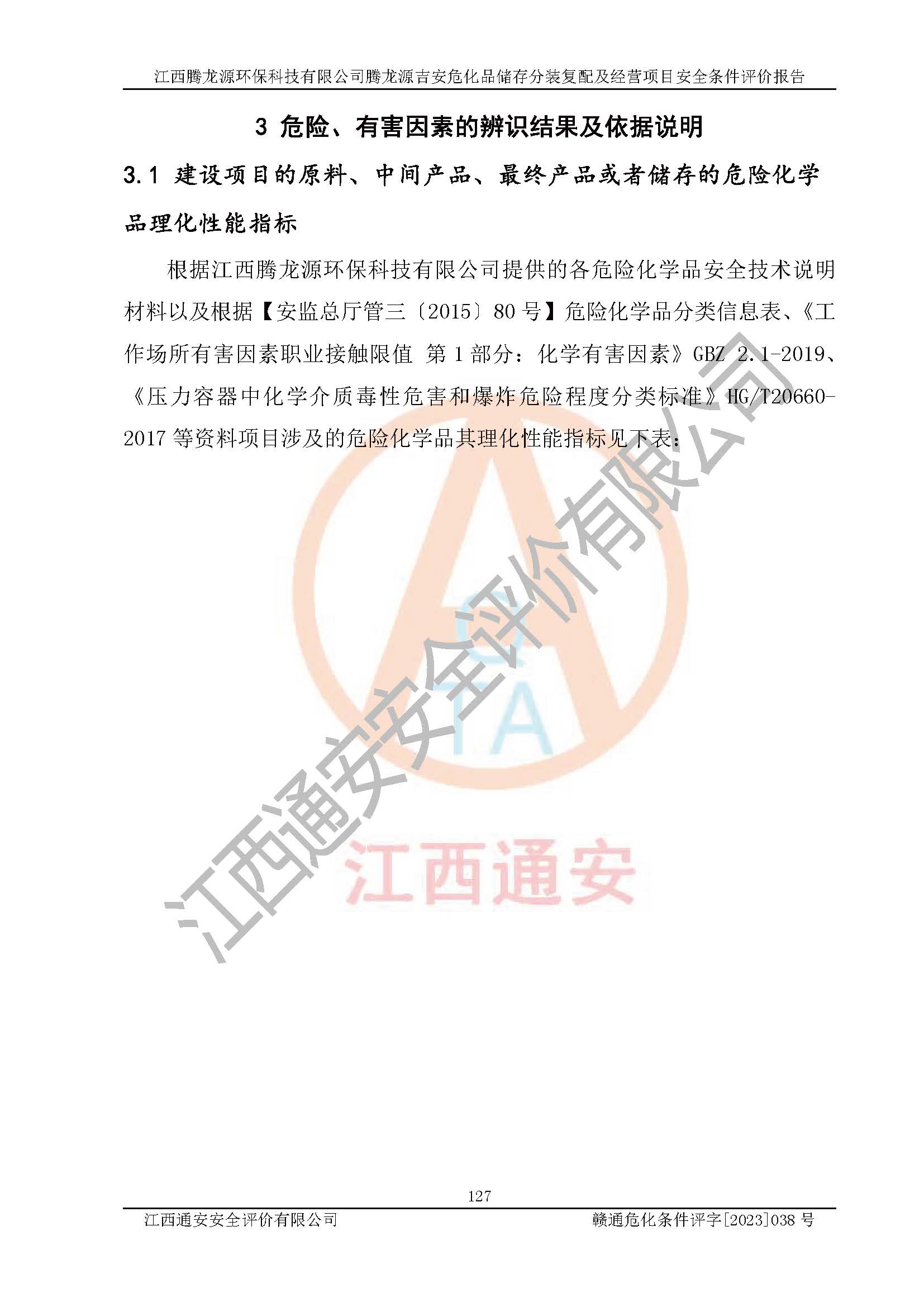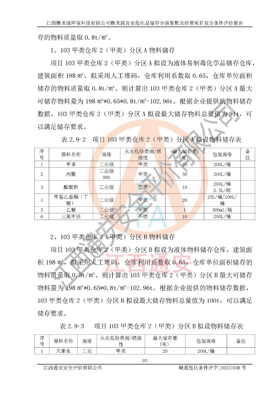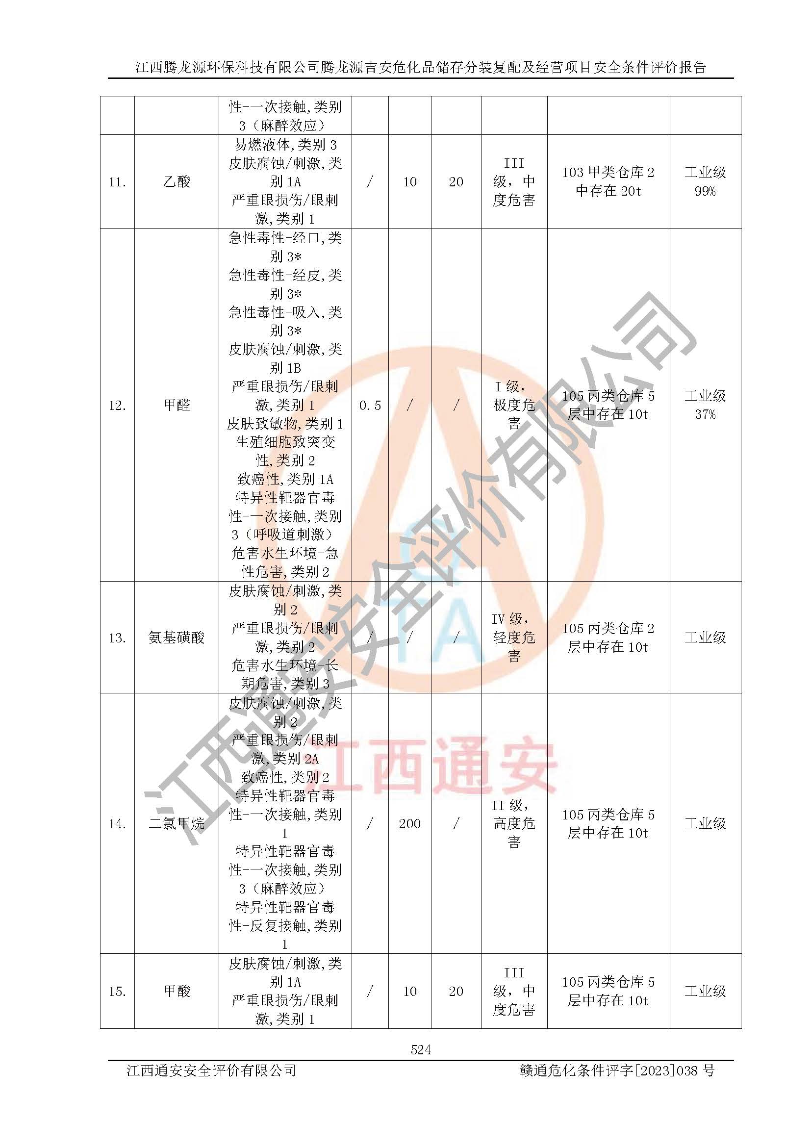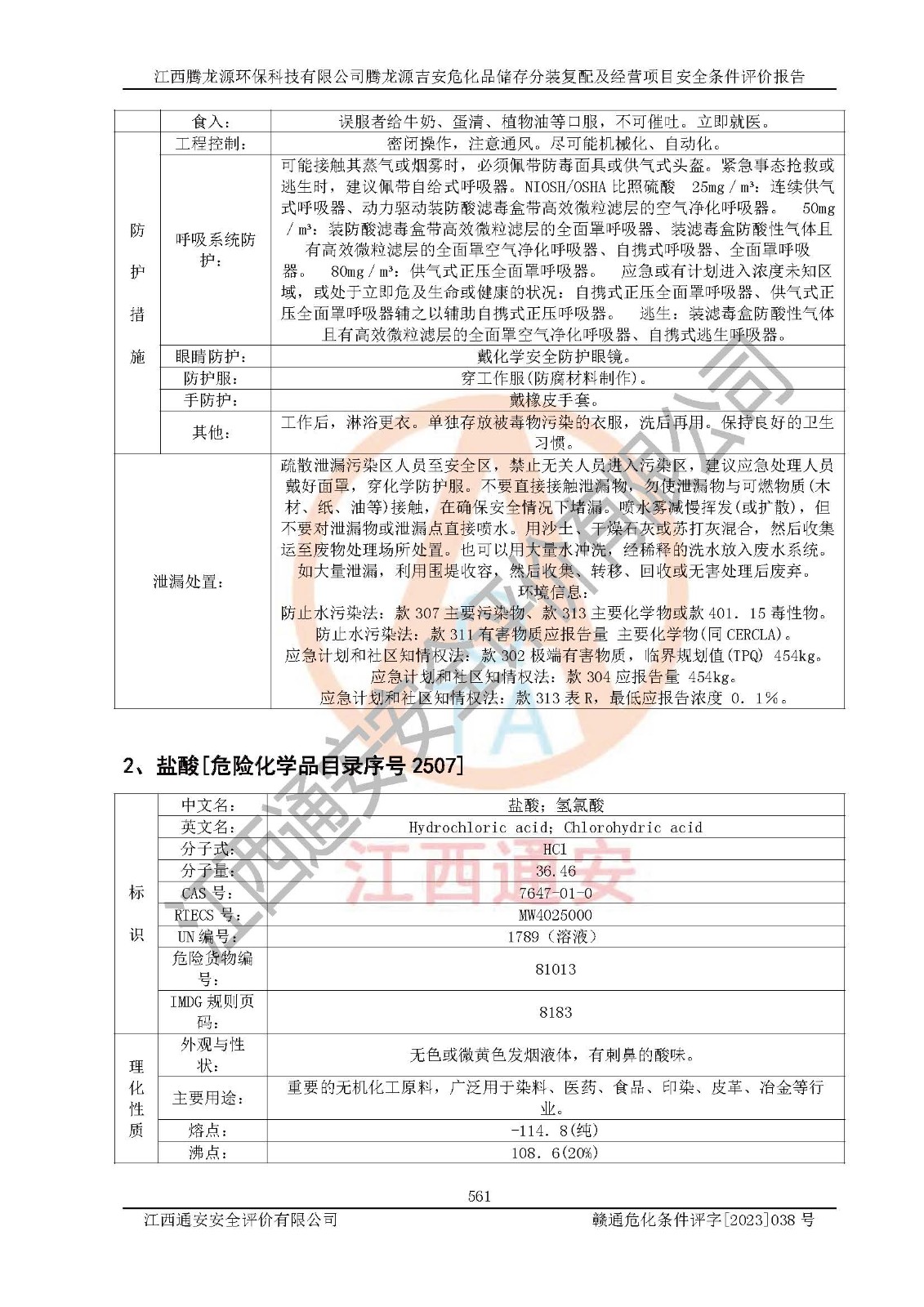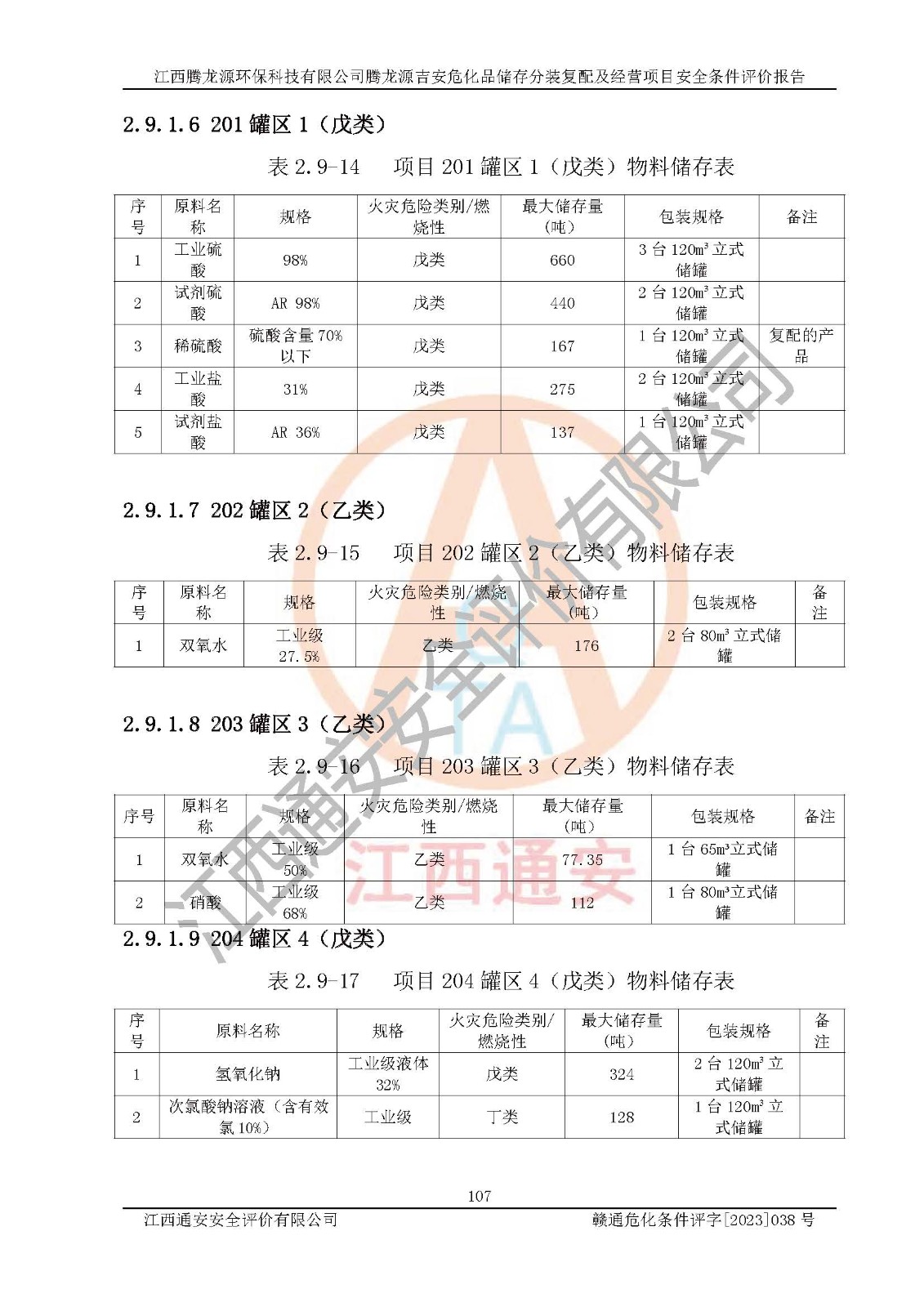 項(xiàng)目簡介 | 江西騰龍?jiān)?*科技有限公司成立于2022年6月20日,并取得吉水縣市場監(jiān)督管理局頒發(fā)的《營業(yè)執(zhí)照》,營業(yè)執(zhí)照統(tǒng)一社會信用代碼:91360822MABQK5GB5P。公司注冊住所:江西省吉安市吉水縣城西工業(yè)園區(qū)二期金龍路。法定**人:吳詩明。注冊資本壹仟萬元整。企業(yè)性質(zhì)為有限責(zé)任公司(自然人投資或控股)。營業(yè)執(zhí)照許可經(jīng)營范圍:一般項(xiàng)目:化工產(chǎn)品銷售(不含許可類化工產(chǎn)品)(除許可業(yè)務(wù)外,可自主依法經(jīng)營法律法規(guī)非禁止或限制的項(xiàng)目)。 江西騰龍?jiān)?*科技有限公司2023年2月24日取得吉水縣發(fā)展和改革委員會頒發(fā)的《江西省企業(yè)投資項(xiàng)目備案通知書》,備案項(xiàng)目名稱為:騰龍?jiān)醇参;穬Υ娣盅b復(fù)配及經(jīng)營項(xiàng)目。項(xiàng)目統(tǒng)一代碼為:2302-360822-04-01-318980。項(xiàng)目總投資20000萬元,項(xiàng)目總占地面積31.34畝。 根據(jù)《危險(xiǎn)化學(xué)品目錄(2015版)》(**安監(jiān)總局等十部門公告[2015]第5號)及應(yīng)急管理部、工業(yè)和信息化部、公安部、生態(tài)環(huán)境部、交通運(yùn)輸部、農(nóng)業(yè)農(nóng)村部、衛(wèi)生健康委、市場監(jiān)管總局、鐵路局、民航局決定調(diào)整《危險(xiǎn)化學(xué)品目錄(2015版)》(應(yīng)急管理部、工業(yè)和信息化部、公安部、生態(tài)環(huán)境部、交通運(yùn)輸部、農(nóng)業(yè)農(nóng)村部、衛(wèi)生健康委、市場監(jiān)管總局、鐵路局、民航局公告2022年第8號)等文件對該項(xiàng)目生產(chǎn)過程中所涉及的化學(xué)品進(jìn)行辨識:項(xiàng)目涉及的硫酸、鹽酸、雙氧水、硝酸、氫氧化鈉(固體和溶液)、次氯酸鈉溶液、氯酸鈉、氯酸鉀、鉻酸酐、高錳酸鈉、高錳酸鉀、硝酸鉀、重鉻酸鉀、重鉻酸鈉、硝酸鈉、亞硝酸鈉、過硫酸鈉、過硫酸銨、過硫酸鉀、漂白粉、氯化亞砜、甲醇、乙醇、二甲苯、甲苯、**、天那水、乙酸、乙酸乙酯、甲醛溶液、三氯乙烯、正丁醇、異丙醇、石油醚、醋酸酐、甲基乙基酮(丁酮)、三氯甲烷、乙醚、氨水(20%)、甲酸、二氯甲烷、**苯、乙酸丁酯、氫氟酸、磷酸、硫化鈉(無水)、氫氧化鉀、氨基磺酸、三氯化鐵、九水硝酸鐵、氯化鋅、硫脲、硼酸、硫酸鎳、氯化鎳、氟化氫銨、氟化氫鉀、氟化氫鈉、偏硅酸鈉、九水偏硅酸鈉、氟硅酸鈉、亞硫酸氫鈉、氟化鈉、氟化鉀、六次甲基四胺、結(jié)晶氯化鋁、碳酸二乙酯、碳酸二甲酯、酸性清洗劑、退鍍劑、開油水、洗網(wǎng)水、污水殺菌劑(復(fù)配的次氯酸鈉溶液)、電解液等屬于危險(xiǎn)化學(xué)品。 江西騰龍?jiān)?*科技有限公司騰龍?jiān)醇参;穬Υ娣盅b復(fù)配及經(jīng)營項(xiàng)目只進(jìn)行物理混合復(fù)配、分裝等作業(yè),不涉及化學(xué)反應(yīng)過程。因此該公司?;穫}儲經(jīng)營活動需要辦理《危險(xiǎn)化學(xué)品經(jīng)營許可證》。 根據(jù)《中華人民共和國監(jiān)控化學(xué)品管理?xiàng)l例》(中華人民共和國***令**90號,經(jīng)中華人民共和國***令第588號修改)及《各類監(jiān)控化學(xué)品名錄》(中華人民共和國工業(yè)和信息化部令第52號;2020年)、《列入第三類監(jiān)控化學(xué)品的新增品種清單》**石油和化學(xué)工業(yè)局令**號等規(guī)定進(jìn)行辨識:項(xiàng)目涉及的氯化亞砜屬于第三類監(jiān)控化學(xué)品。 根據(jù)《易制毒化學(xué)品管理?xiàng)l例》(***令第445號,經(jīng)***令第653號、***第666號、***第703號修改)及附表規(guī)定、中華人民共和國公安部 中華人民共和國商務(wù)部、**衛(wèi)生和計(jì)劃生育委員會、中華人民共和國海關(guān)總署、**安全生產(chǎn)監(jiān)督管理總局、**食品藥品監(jiān)督管理總局《關(guān)于將4-苯胺基-N-苯乙基哌啶、N-苯乙基-4-哌啶酮、N-甲基-1-苯基-1-氯-2-丙胺、溴素、1-苯基-1-**5種物質(zhì)列入易制毒化學(xué)品管理的公告》(國辦函[2017]**20號)、《***辦公廳關(guān)于同意將1-苯基-2-溴-1-**和3-氧-2-苯基丁腈列入易制毒化學(xué)品品種目錄的函》(國辦函[2014]第40號)、《***辦公廳關(guān)于同意將α-苯乙酰乙酸甲酯等6種物質(zhì)列入易制毒化學(xué)品品種目錄的函》(國辦函〔2021〕58號)等進(jìn)行辨識:項(xiàng)目涉及的硫酸、鹽酸、高錳酸鉀、甲苯、**、甲基乙基酮等屬于第三類易制毒化學(xué)品;醋酸酐、三氯甲烷、乙醚等屬于第二類易制毒化學(xué)品。 根據(jù)《危險(xiǎn)化學(xué)品名錄[2015年版]》(**安監(jiān)總局等十部門[2015]第5號)進(jìn)行劇毒化學(xué)品辨識:項(xiàng)目不涉及劇毒化學(xué)品。 根據(jù)《高毒物品目錄(2003年版)》(原衛(wèi)生部衛(wèi)法監(jiān)發(fā)[2003]142號)對項(xiàng)目涉及的化學(xué)品進(jìn)行高毒物品辨識:項(xiàng)目涉及的甲醛溶液、硫酸鎳、氯化鎳、氟化氫銨、氟化氫鉀、氟化氫鈉、氟化鈉、氟化鉀、鉻酸酐、高錳酸鉀、高錳酸鈉、重鉻酸鉀、重鉻酸鈉等屬于高毒物品。 根據(jù)中華人民共和國公安部《易制爆危險(xiǎn)化學(xué)品名錄》(2017年版)中規(guī)定進(jìn)行辨識:項(xiàng)目涉及的雙氧水、硝酸、氯酸鈉、氯酸鉀、高錳酸鉀、高錳酸鈉、硝酸鉀、重鉻酸鉀、重鉻酸鈉、硝酸鈉、六次甲基四胺等屬于易