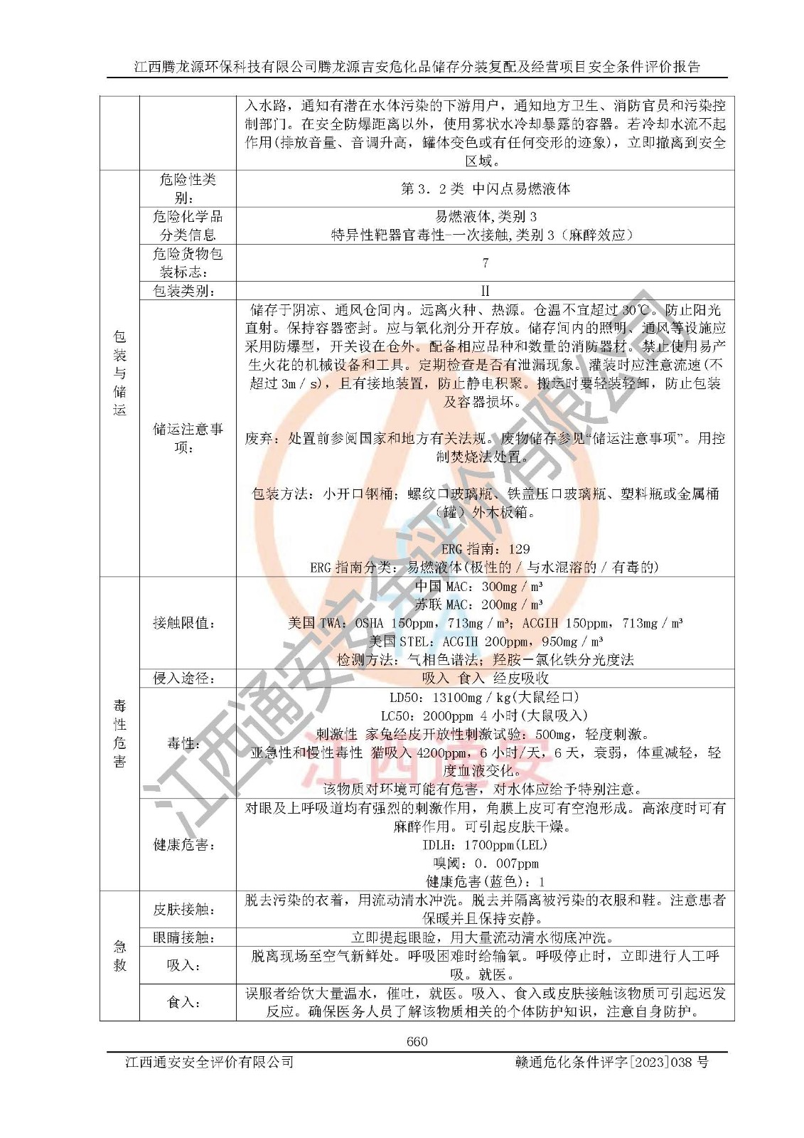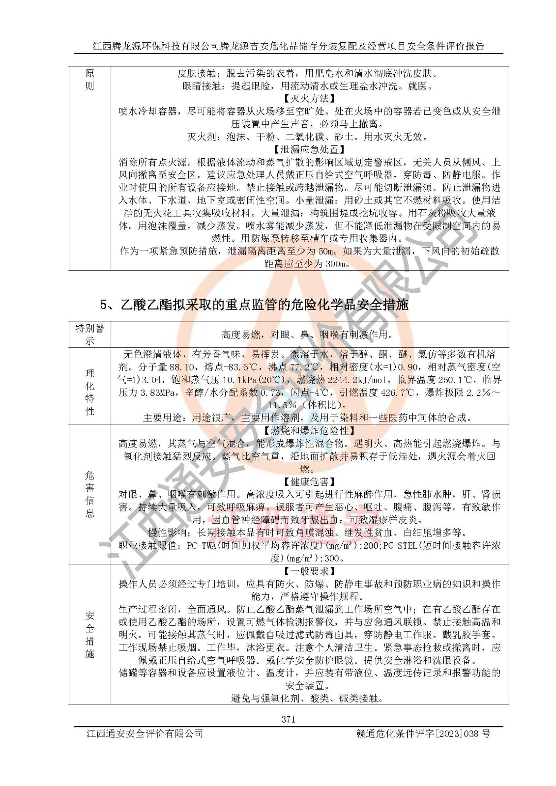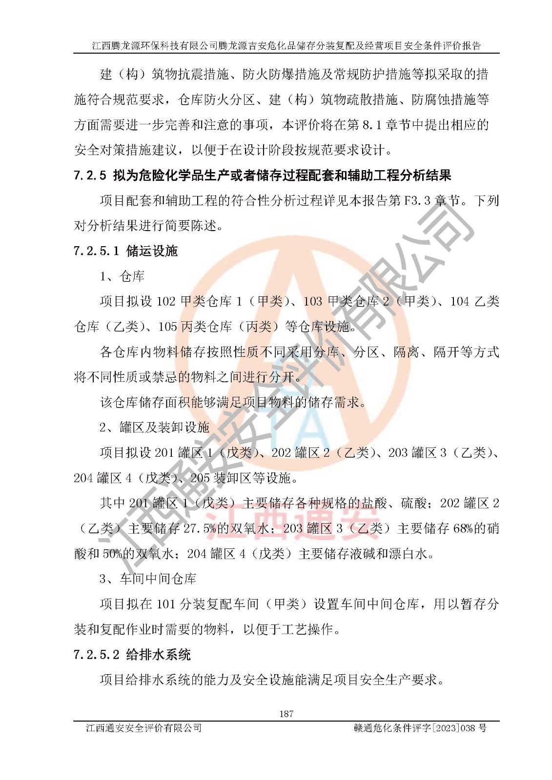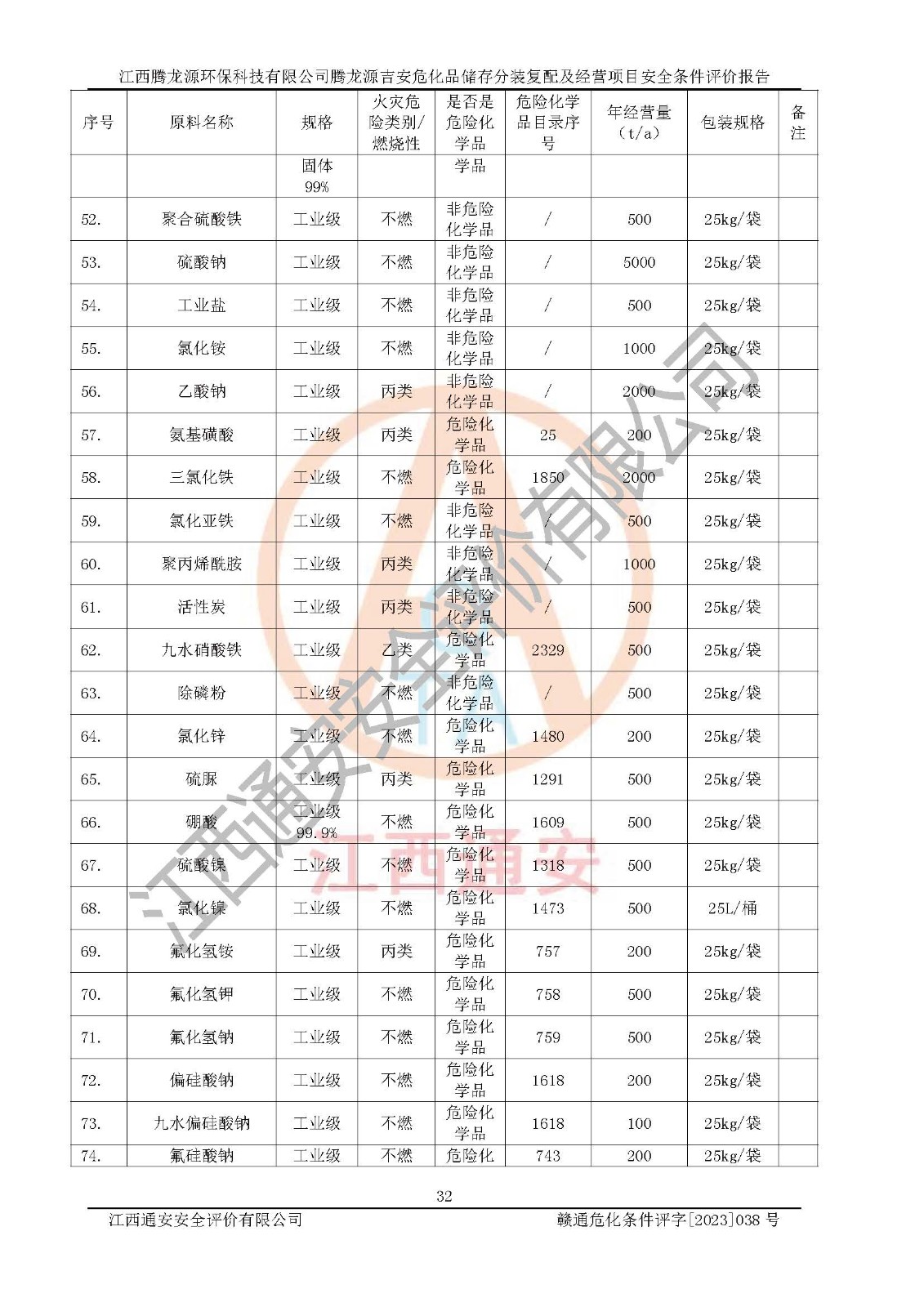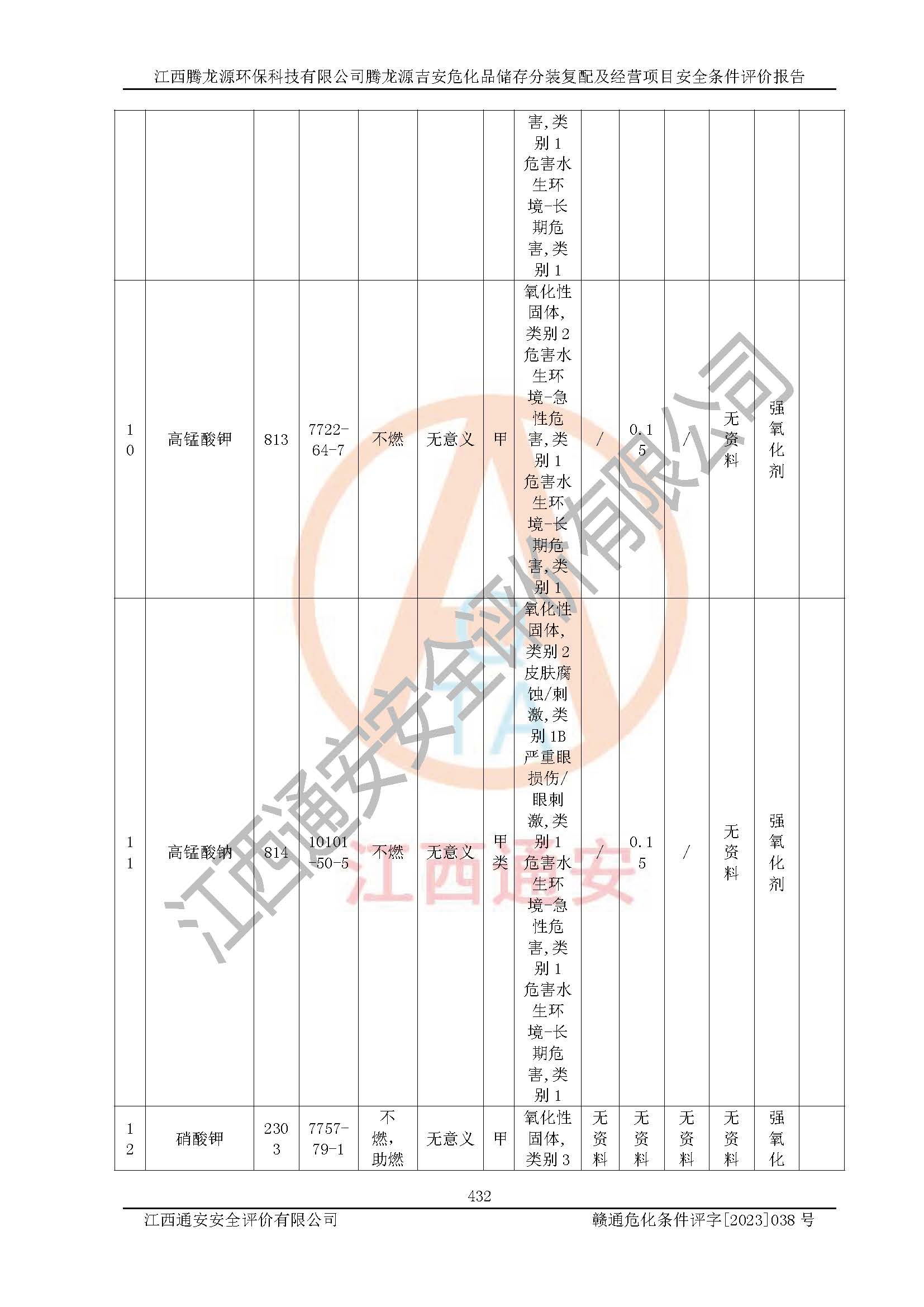 項(xiàng)目簡介 | 江西騰龍?jiān)?*科技有限公司成立于2022年6月20日,并取得吉水縣市場監(jiān)督管理局頒發(fā)的《營業(yè)執(zhí)照》,營業(yè)執(zhí)照統(tǒng)一社會信用代碼:91360822MABQK5GB5P。公司注冊住所:江西省吉安市吉水縣城西工業(yè)園區(qū)二期金龍路。法定**人:吳詩明。注冊資本壹仟萬元整。企業(yè)性質(zhì)為有限責(zé)任公司(自然人投資或控股)。營業(yè)執(zhí)照許可經(jīng)營范圍:一般項(xiàng)目:化工產(chǎn)品銷售(不含許可類化工產(chǎn)品)(除許可業(yè)務(wù)外,可自主依法經(jīng)營法律法規(guī)非禁止或限制的項(xiàng)目)。 江西騰龍?jiān)?*科技有限公司2023年2月24日取得吉水縣發(fā)展和改革委員會頒發(fā)的《江西省企業(yè)投資項(xiàng)目備案通知書》,備案項(xiàng)目名稱為:騰龍?jiān)醇参;穬Υ娣盅b復(fù)配及經(jīng)營項(xiàng)目。項(xiàng)目統(tǒng)一代碼為:2302-360822-04-01-318980。項(xiàng)目總投資20000萬元,項(xiàng)目總占地面積31.34畝。 根據(jù)《危險(xiǎn)化學(xué)品目錄(2015版)》(**安監(jiān)總局等十部門公告[2015]第5號)及應(yīng)急管理部、工業(yè)和信息化部、公安部、生態(tài)環(huán)境部、交通運(yùn)輸部、農(nóng)業(yè)農(nóng)村部、衛(wèi)生健康委、市場監(jiān)管總局、鐵路局、民航局決定調(diào)整《危險(xiǎn)化學(xué)品目錄(2015版)》(應(yīng)急管理部、工業(yè)和信息化部、公安部、生態(tài)環(huán)境部、交通運(yùn)輸部、農(nóng)業(yè)農(nóng)村部、衛(wèi)生健康委、市場監(jiān)管總局、鐵路局、民航局公告2022年第8號)等文件對該項(xiàng)目生產(chǎn)過程中所涉及的化學(xué)品進(jìn)行辨識:項(xiàng)目涉及的硫酸、鹽酸、雙氧水、硝酸、氫氧化鈉(固體和溶液)、次氯酸鈉溶液、氯酸鈉、氯酸鉀、鉻酸酐、高錳酸鈉、高錳酸鉀、硝酸鉀、重鉻酸鉀、重鉻酸鈉、硝酸鈉、亞硝酸鈉、過硫酸鈉、過硫酸銨、過硫酸鉀、漂白粉、氯化亞砜、甲醇、乙醇、二甲苯、甲苯、**、天那水、乙酸、乙酸乙酯、甲醛溶液、三氯乙烯、正丁醇、異丙醇、石油醚、醋酸酐、甲基乙基酮(丁酮)、三氯甲烷、乙醚、氨水(20%)、甲酸、二氯甲烷、**苯、乙酸丁酯、氫氟酸、磷酸、硫化鈉(無水)、氫氧化鉀、氨基磺酸、三氯化鐵、九水硝酸鐵、氯化鋅、硫脲、硼酸、硫酸鎳、氯化鎳、氟化氫銨、氟化氫鉀、氟化氫鈉、偏硅酸鈉、九水偏硅酸鈉、氟硅酸鈉、亞硫酸氫鈉、氟化鈉、氟化鉀、六次甲基四胺、結(jié)晶氯化鋁、碳酸二乙酯、碳酸二甲酯、酸性清洗劑、退鍍劑、開油水、洗網(wǎng)水、污水殺菌劑(復(fù)配的次氯酸鈉溶液)、電解液等屬于危險(xiǎn)化學(xué)品。 江西騰龍?jiān)?*科技有限公司騰龍?jiān)醇参;穬Υ娣盅b復(fù)配及經(jīng)營項(xiàng)目只進(jìn)行物理混合復(fù)配、分裝等作業(yè),不涉及化學(xué)反應(yīng)過程。因此該公司?;穫}儲經(jīng)營活動需要辦理《危險(xiǎn)化學(xué)品經(jīng)營許可證》。 根據(jù)《中華人民共和國監(jiān)控化學(xué)品管理?xiàng)l例》(中華人民共和國***令**90號,經(jīng)中華人民共和國***令第588號修改)及《各類監(jiān)控化學(xué)品名錄》(中華人民共和國工業(yè)和信息化部令第52號;2020年)、《列入第三類監(jiān)控化學(xué)品的新增品種清單》**石油和化學(xué)工業(yè)局令**號等規(guī)定進(jìn)行辨識:項(xiàng)目涉及的氯化亞砜屬于第三類監(jiān)控化學(xué)品。 根據(jù)《易制毒化學(xué)品管理?xiàng)l例》(***令第445號,經(jīng)***令第653號、***第666號、***第703號修改)及附表規(guī)定、中華人民共和國公安部 中華人民共和國商務(wù)部、**衛(wèi)生和計(jì)劃生育委員會、中華人民共和國海關(guān)總署、**安全生產(chǎn)監(jiān)督管理總局、**食品藥品監(jiān)督管理總局《關(guān)于將4-苯胺基-N-苯乙基哌啶、N-苯乙基-4-哌啶酮、N-甲基-1-苯基-1-氯-2-丙胺、溴素、1-苯基-1-**5種物質(zhì)列入易制毒化學(xué)品管理的公告》(國辦函[2017]**20號)、《***辦公廳關(guān)于同意將1-苯基-2-溴-1-**和3-氧-2-苯基丁腈列入易制毒化學(xué)品品種目錄的函》(國辦函[2014]第40號)、《***辦公廳關(guān)于同意將α-苯乙酰乙酸甲酯等6種物質(zhì)列入易制毒化學(xué)品品種目錄的函》(國辦函〔2021〕58號)等進(jìn)行辨識:項(xiàng)目涉及的硫酸、鹽酸、高錳酸鉀、甲苯、**、甲基乙基酮等屬于第三類易制毒化學(xué)品;醋酸酐、三氯甲烷、乙醚等屬于第二類易制毒化學(xué)品。 根據(jù)《危險(xiǎn)化學(xué)品名錄[2015年版]》(**安監(jiān)總局等十部門[2015]第5號)進(jìn)行劇毒化學(xué)品辨識:項(xiàng)目不涉及劇毒化學(xué)品。 根據(jù)《高毒物品目錄(2003年版)》(原衛(wèi)生部衛(wèi)法監(jiān)發(fā)[2003]142號)對項(xiàng)目涉及的化學(xué)品進(jìn)行高毒物品辨識:項(xiàng)目涉及的甲醛溶液、硫酸鎳、氯化鎳、氟化氫銨、氟化氫鉀、氟化氫鈉、氟化鈉、氟化鉀、鉻酸酐、高錳酸鉀、高錳酸鈉、重鉻酸鉀、重鉻酸鈉等屬于高毒物品。 根據(jù)中華人民共和國公安部《易制爆危險(xiǎn)化學(xué)品名錄》(2017年版)中規(guī)定進(jìn)行辨識:項(xiàng)目涉及的雙氧水、硝酸、氯酸鈉、氯酸鉀、高錳酸鉀、高錳酸鈉、硝酸鉀、重鉻酸鉀、重鉻酸鈉、硝酸鈉、六次甲基四胺等屬于易