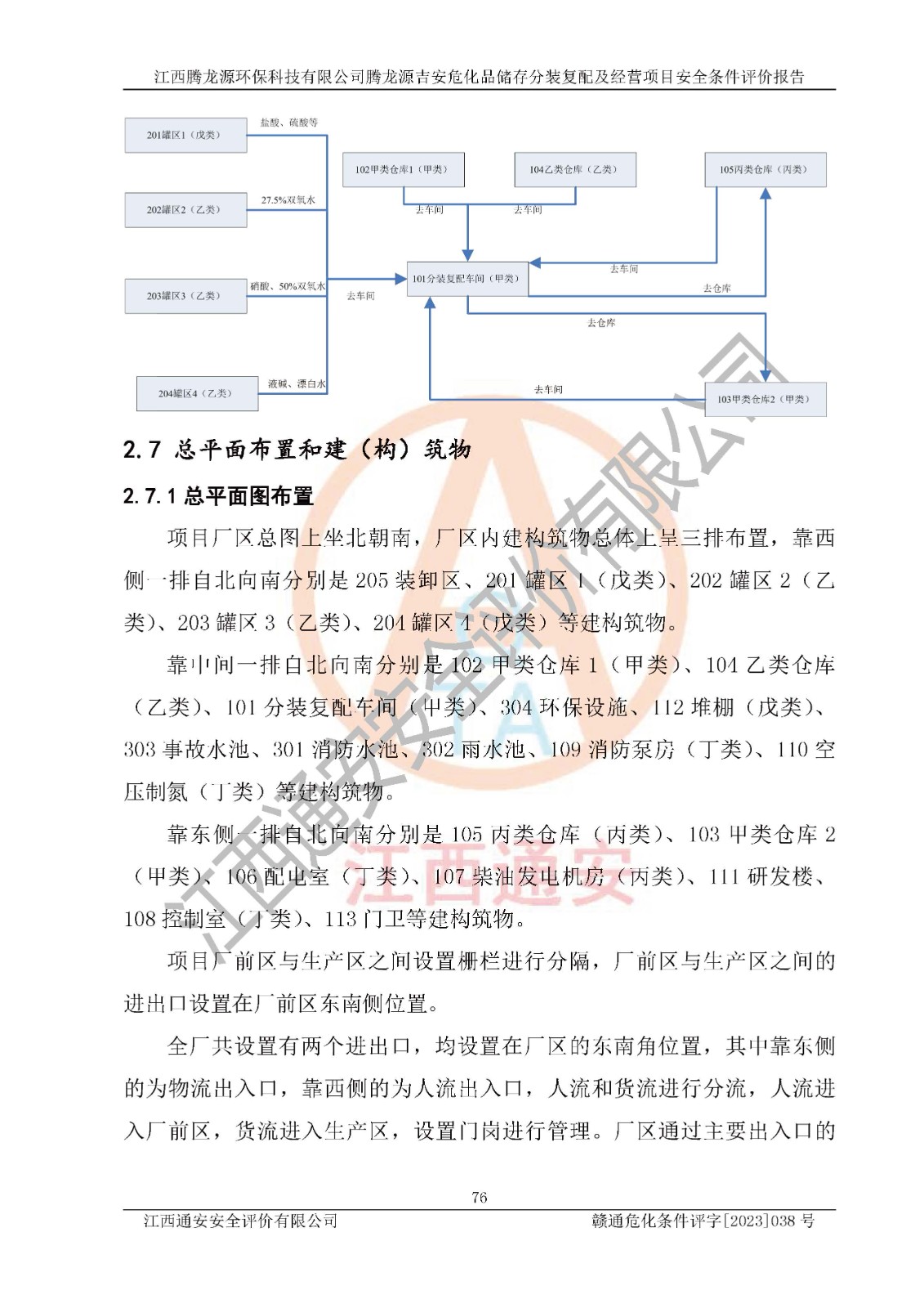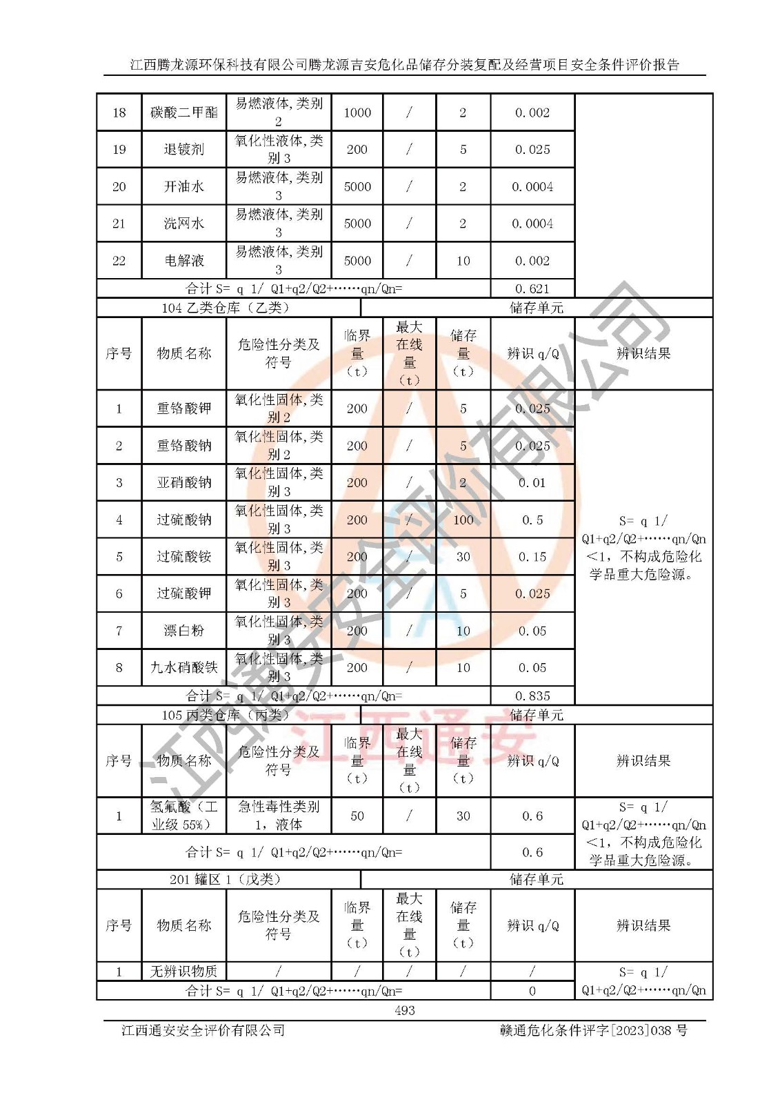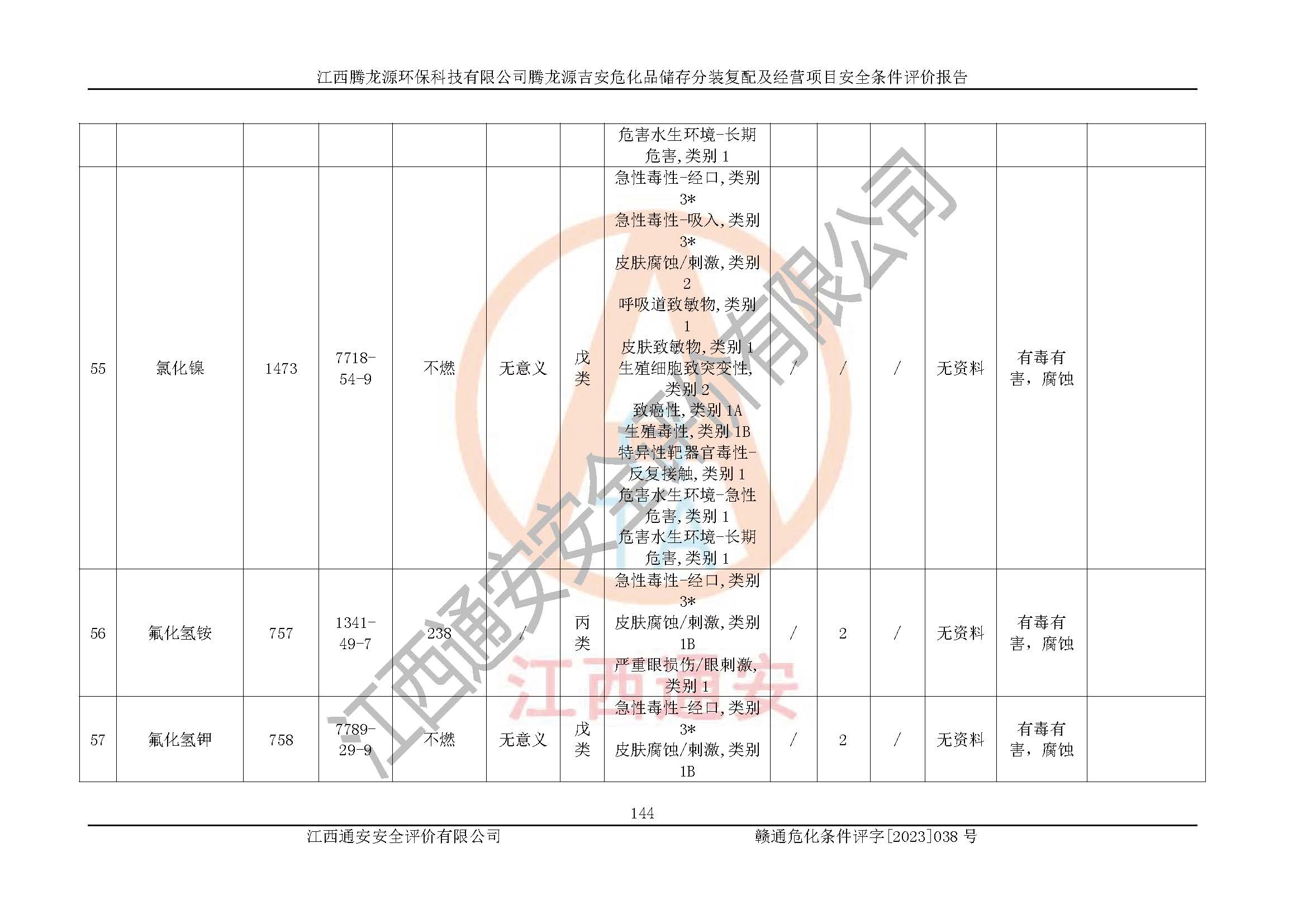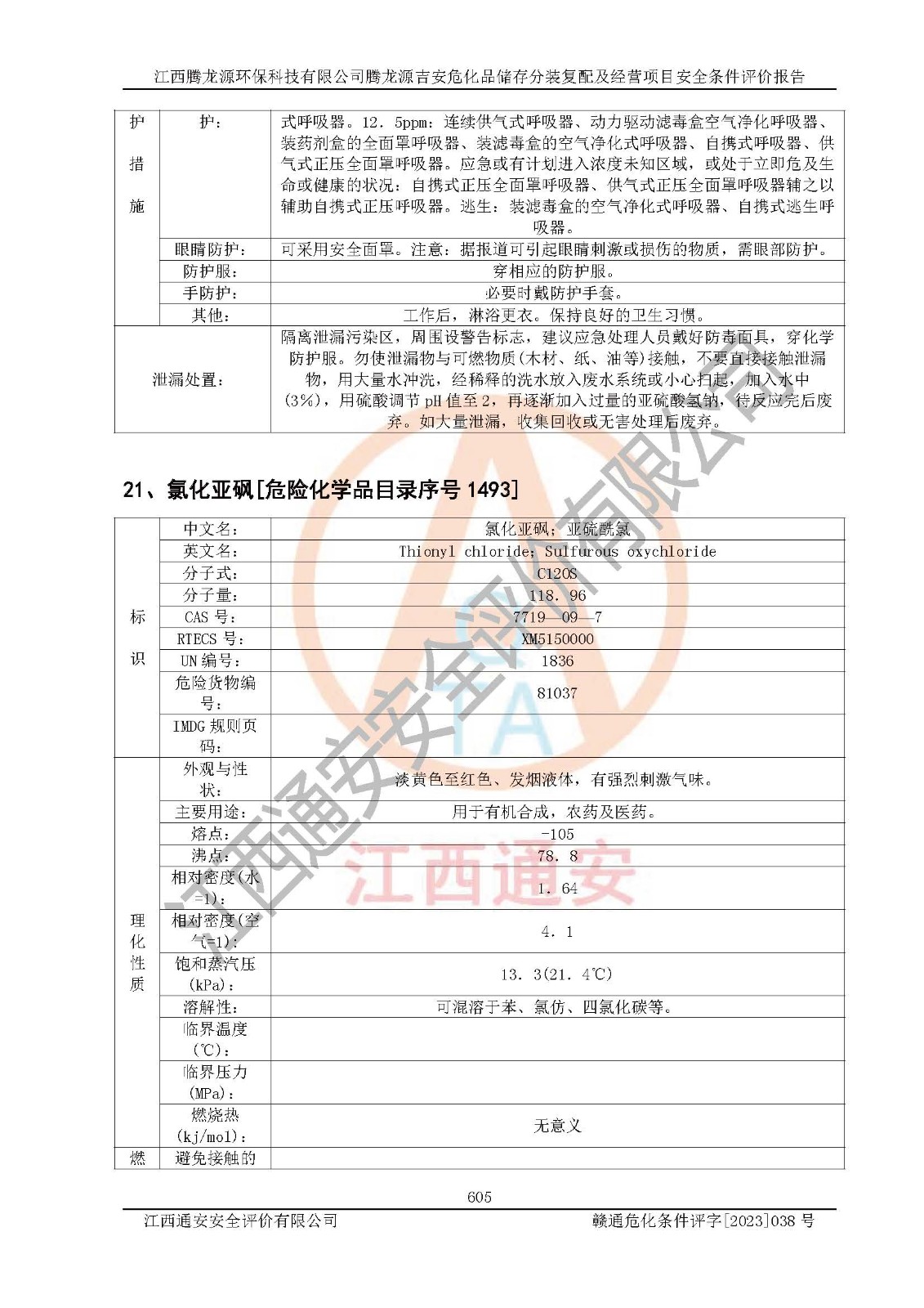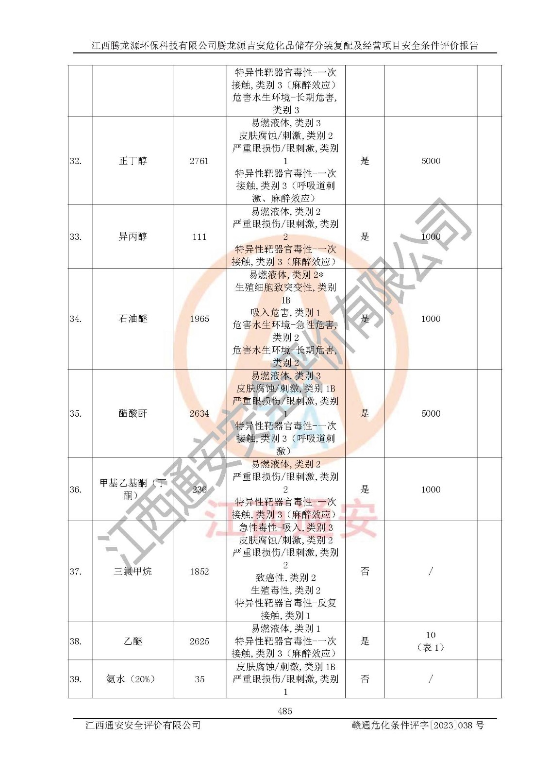 項(xiàng)目簡介 | 江西騰龍?jiān)?*科技有限公司成立于2022年6月20日,并取得吉水縣市場監(jiān)督管理局頒發(fā)的《營業(yè)執(zhí)照》,營業(yè)執(zhí)照統(tǒng)一社會信用代碼:91360822MABQK5GB5P。公司注冊住所:江西省吉安市吉水縣城西工業(yè)園區(qū)二期金龍路。法定**人:吳詩明。注冊資本壹仟萬元整。企業(yè)性質(zhì)為有限責(zé)任公司(自然人投資或控股)。營業(yè)執(zhí)照許可經(jīng)營范圍:一般項(xiàng)目:化工產(chǎn)品銷售(不含許可類化工產(chǎn)品)(除許可業(yè)務(wù)外,可自主依法經(jīng)營法律法規(guī)非禁止或限制的項(xiàng)目)。 江西騰龍?jiān)?*科技有限公司2023年2月24日取得吉水縣發(fā)展和改革委員會頒發(fā)的《江西省企業(yè)投資項(xiàng)目備案通知書》,備案項(xiàng)目名稱為:騰龍?jiān)醇参;穬Υ娣盅b復(fù)配及經(jīng)營項(xiàng)目。項(xiàng)目統(tǒng)一代碼為:2302-360822-04-01-318980。項(xiàng)目總投資20000萬元,項(xiàng)目總占地面積31.34畝。 根據(jù)《危險(xiǎn)化學(xué)品目錄(2015版)》(**安監(jiān)總局等十部門公告[2015]第5號)及應(yīng)急管理部、工業(yè)和信息化部、公安部、生態(tài)環(huán)境部、交通運(yùn)輸部、農(nóng)業(yè)農(nóng)村部、衛(wèi)生健康委、市場監(jiān)管總局、鐵路局、民航局決定調(diào)整《危險(xiǎn)化學(xué)品目錄(2015版)》(應(yīng)急管理部、工業(yè)和信息化部、公安部、生態(tài)環(huán)境部、交通運(yùn)輸部、農(nóng)業(yè)農(nóng)村部、衛(wèi)生健康委、市場監(jiān)管總局、鐵路局、民航局公告2022年第8號)等文件對該項(xiàng)目生產(chǎn)過程中所涉及的化學(xué)品進(jìn)行辨識:項(xiàng)目涉及的硫酸、鹽酸、雙氧水、硝酸、氫氧化鈉(固體和溶液)、次氯酸鈉溶液、氯酸鈉、氯酸鉀、鉻酸酐、高錳酸鈉、高錳酸鉀、硝酸鉀、重鉻酸鉀、重鉻酸鈉、硝酸鈉、亞硝酸鈉、過硫酸鈉、過硫酸銨、過硫酸鉀、漂白粉、氯化亞砜、甲醇、乙醇、二甲苯、甲苯、**、天那水、乙酸、乙酸乙酯、甲醛溶液、三氯乙烯、正丁醇、異丙醇、石油醚、醋酸酐、甲基乙基酮(丁酮)、三氯甲烷、乙醚、氨水(20%)、甲酸、二氯甲烷、**苯、乙酸丁酯、氫氟酸、磷酸、硫化鈉(無水)、氫氧化鉀、氨基磺酸、三氯化鐵、九水硝酸鐵、氯化鋅、硫脲、硼酸、硫酸鎳、氯化鎳、氟化氫銨、氟化氫鉀、氟化氫鈉、偏硅酸鈉、九水偏硅酸鈉、氟硅酸鈉、亞硫酸氫鈉、氟化鈉、氟化鉀、六次甲基四胺、結(jié)晶氯化鋁、碳酸二乙酯、碳酸二甲酯、酸性清洗劑、退鍍劑、開油水、洗網(wǎng)水、污水殺菌劑(復(fù)配的次氯酸鈉溶液)、電解液等屬于危險(xiǎn)化學(xué)品。 江西騰龍?jiān)?*科技有限公司騰龍?jiān)醇参;穬Υ娣盅b復(fù)配及經(jīng)營項(xiàng)目只進(jìn)行物理混合復(fù)配、分裝等作業(yè),不涉及化學(xué)反應(yīng)過程。因此該公司?;穫}儲經(jīng)營活動需要辦理《危險(xiǎn)化學(xué)品經(jīng)營許可證》。 根據(jù)《中華人民共和國監(jiān)控化學(xué)品管理?xiàng)l例》(中華人民共和國***令**90號,經(jīng)中華人民共和國***令第588號修改)及《各類監(jiān)控化學(xué)品名錄》(中華人民共和國工業(yè)和信息化部令第52號;2020年)、《列入第三類監(jiān)控化學(xué)品的新增品種清單》**石油和化學(xué)工業(yè)局令**號等規(guī)定進(jìn)行辨識:項(xiàng)目涉及的氯化亞砜屬于第三類監(jiān)控化學(xué)品。 根據(jù)《易制毒化學(xué)品管理?xiàng)l例》(***令第445號,經(jīng)***令第653號、***第666號、***第703號修改)及附表規(guī)定、中華人民共和國公安部 中華人民共和國商務(wù)部、**衛(wèi)生和計(jì)劃生育委員會、中華人民共和國海關(guān)總署、**安全生產(chǎn)監(jiān)督管理總局、**食品藥品監(jiān)督管理總局《關(guān)于將4-苯胺基-N-苯乙基哌啶、N-苯乙基-4-哌啶酮、N-甲基-1-苯基-1-氯-2-丙胺、溴素、1-苯基-1-**5種物質(zhì)列入易制毒化學(xué)品管理的公告》(國辦函[2017]**20號)、《***辦公廳關(guān)于同意將1-苯基-2-溴-1-**和3-氧-2-苯基丁腈列入易制毒化學(xué)品品種目錄的函》(國辦函[2014]第40號)、《***辦公廳關(guān)于同意將α-苯乙酰乙酸甲酯等6種物質(zhì)列入易制毒化學(xué)品品種目錄的函》(國辦函〔2021〕58號)等進(jìn)行辨識:項(xiàng)目涉及的硫酸、鹽酸、高錳酸鉀、甲苯、**、甲基乙基酮等屬于第三類易制毒化學(xué)品;醋酸酐、三氯甲烷、乙醚等屬于第二類易制毒化學(xué)品。 根據(jù)《危險(xiǎn)化學(xué)品名錄[2015年版]》(**安監(jiān)總局等十部門[2015]第5號)進(jìn)行劇毒化學(xué)品辨識:項(xiàng)目不涉及劇毒化學(xué)品。 根據(jù)《高毒物品目錄(2003年版)》(原衛(wèi)生部衛(wèi)法監(jiān)發(fā)[2003]142號)對項(xiàng)目涉及的化學(xué)品進(jìn)行高毒物品辨識:項(xiàng)目涉及的甲醛溶液、硫酸鎳、氯化鎳、氟化氫銨、氟化氫鉀、氟化氫鈉、氟化鈉、氟化鉀、鉻酸酐、高錳酸鉀、高錳酸鈉、重鉻酸鉀、重鉻酸鈉等屬于高毒物品。 根據(jù)中華人民共和國公安部《易制爆危險(xiǎn)化學(xué)品名錄》(2017年版)中規(guī)定進(jìn)行辨識:項(xiàng)目涉及的雙氧水、硝酸、氯酸鈉、氯酸鉀、高錳酸鉀、高錳酸鈉、硝酸鉀、重鉻酸鉀、重鉻酸鈉、硝酸鈉、六次甲基四胺等屬于易