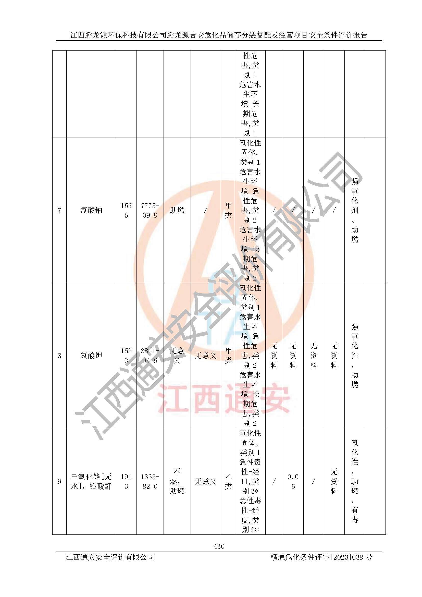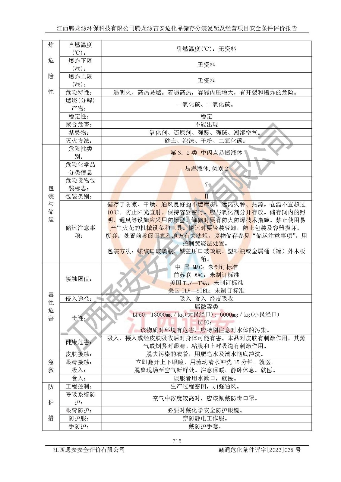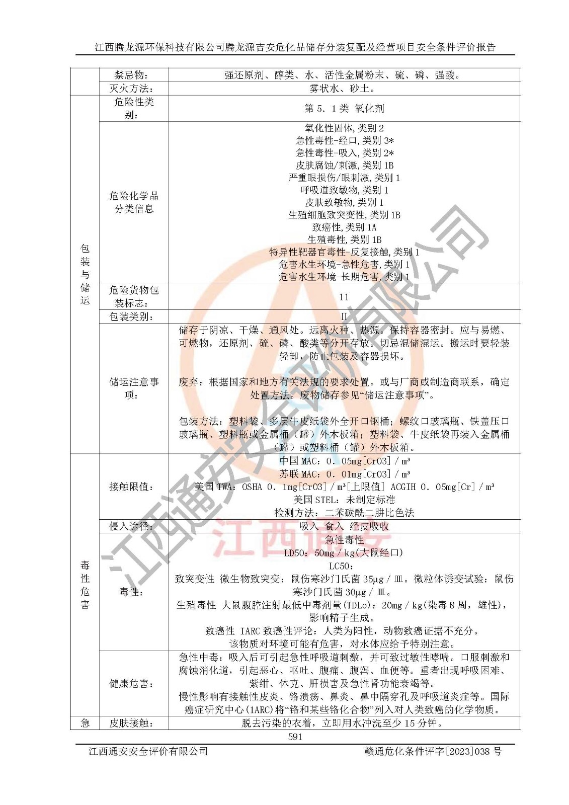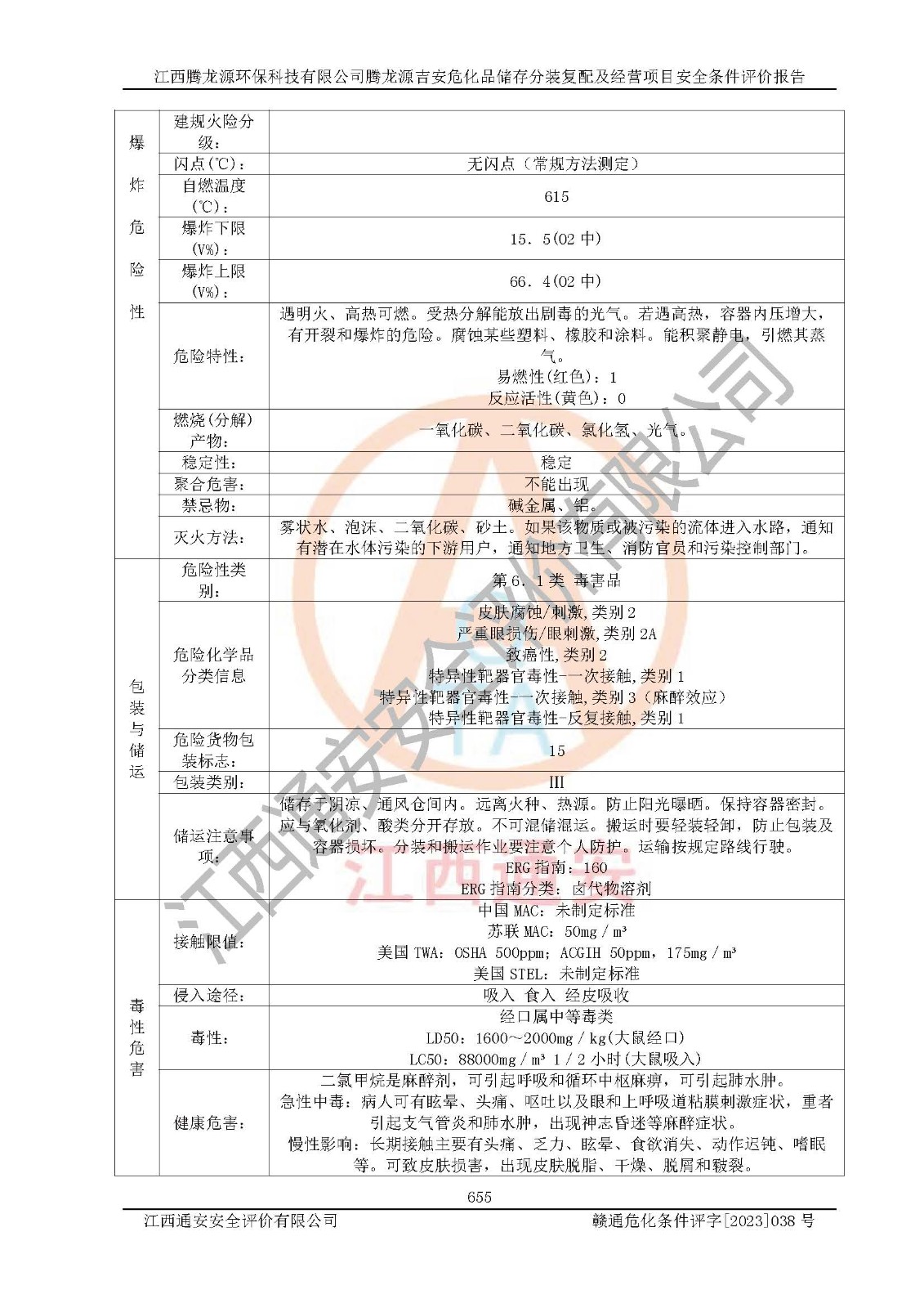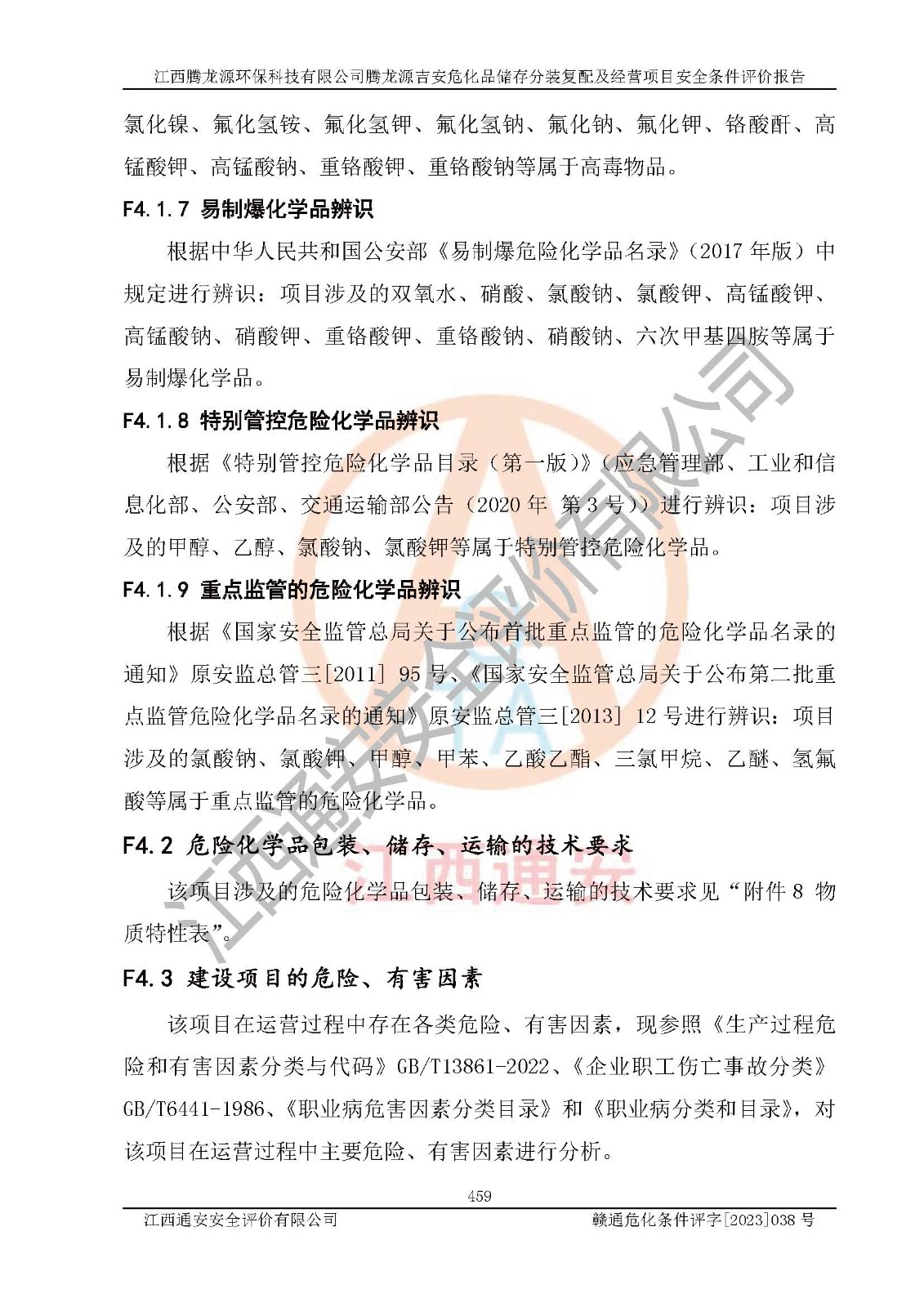 項(xiàng)目簡介 | 江西騰龍?jiān)?*科技有限公司成立于2022年6月20日,并取得吉水縣市場監(jiān)督管理局頒發(fā)的《營業(yè)執(zhí)照》,營業(yè)執(zhí)照統(tǒng)一社會信用代碼:91360822MABQK5GB5P。公司注冊住所:江西省吉安市吉水縣城西工業(yè)園區(qū)二期金龍路。法定**人:吳詩明。注冊資本壹仟萬元整。企業(yè)性質(zhì)為有限責(zé)任公司(自然人投資或控股)。營業(yè)執(zhí)照許可經(jīng)營范圍:一般項(xiàng)目:化工產(chǎn)品銷售(不含許可類化工產(chǎn)品)(除許可業(yè)務(wù)外,可自主依法經(jīng)營法律法規(guī)非禁止或限制的項(xiàng)目)。 江西騰龍?jiān)?*科技有限公司2023年2月24日取得吉水縣發(fā)展和改革委員會頒發(fā)的《江西省企業(yè)投資項(xiàng)目備案通知書》,備案項(xiàng)目名稱為:騰龍?jiān)醇参;穬Υ娣盅b復(fù)配及經(jīng)營項(xiàng)目。項(xiàng)目統(tǒng)一代碼為:2302-360822-04-01-318980。項(xiàng)目總投資20000萬元,項(xiàng)目總占地面積31.34畝。 根據(jù)《危險(xiǎn)化學(xué)品目錄(2015版)》(**安監(jiān)總局等十部門公告[2015]第5號)及應(yīng)急管理部、工業(yè)和信息化部、公安部、生態(tài)環(huán)境部、交通運(yùn)輸部、農(nóng)業(yè)農(nóng)村部、衛(wèi)生健康委、市場監(jiān)管總局、鐵路局、民航局決定調(diào)整《危險(xiǎn)化學(xué)品目錄(2015版)》(應(yīng)急管理部、工業(yè)和信息化部、公安部、生態(tài)環(huán)境部、交通運(yùn)輸部、農(nóng)業(yè)農(nóng)村部、衛(wèi)生健康委、市場監(jiān)管總局、鐵路局、民航局公告2022年第8號)等文件對該項(xiàng)目生產(chǎn)過程中所涉及的化學(xué)品進(jìn)行辨識:項(xiàng)目涉及的硫酸、鹽酸、雙氧水、硝酸、氫氧化鈉(固體和溶液)、次氯酸鈉溶液、氯酸鈉、氯酸鉀、鉻酸酐、高錳酸鈉、高錳酸鉀、硝酸鉀、重鉻酸鉀、重鉻酸鈉、硝酸鈉、亞硝酸鈉、過硫酸鈉、過硫酸銨、過硫酸鉀、漂白粉、氯化亞砜、甲醇、乙醇、二甲苯、甲苯、**、天那水、乙酸、乙酸乙酯、甲醛溶液、三氯乙烯、正丁醇、異丙醇、石油醚、醋酸酐、甲基乙基酮(丁酮)、三氯甲烷、乙醚、氨水(20%)、甲酸、二氯甲烷、**苯、乙酸丁酯、氫氟酸、磷酸、硫化鈉(無水)、氫氧化鉀、氨基磺酸、三氯化鐵、九水硝酸鐵、氯化鋅、硫脲、硼酸、硫酸鎳、氯化鎳、氟化氫銨、氟化氫鉀、氟化氫鈉、偏硅酸鈉、九水偏硅酸鈉、氟硅酸鈉、亞硫酸氫鈉、氟化鈉、氟化鉀、六次甲基四胺、結(jié)晶氯化鋁、碳酸二乙酯、碳酸二甲酯、酸性清洗劑、退鍍劑、開油水、洗網(wǎng)水、污水殺菌劑(復(fù)配的次氯酸鈉溶液)、電解液等屬于危險(xiǎn)化學(xué)品。 江西騰龍?jiān)?*科技有限公司騰龍?jiān)醇参;穬Υ娣盅b復(fù)配及經(jīng)營項(xiàng)目只進(jìn)行物理混合復(fù)配、分裝等作業(yè),不涉及化學(xué)反應(yīng)過程。因此該公司?;穫}儲經(jīng)營活動需要辦理《危險(xiǎn)化學(xué)品經(jīng)營許可證》。 根據(jù)《中華人民共和國監(jiān)控化學(xué)品管理?xiàng)l例》(中華人民共和國***令**90號,經(jīng)中華人民共和國***令第588號修改)及《各類監(jiān)控化學(xué)品名錄》(中華人民共和國工業(yè)和信息化部令第52號;2020年)、《列入第三類監(jiān)控化學(xué)品的新增品種清單》**石油和化學(xué)工業(yè)局令**號等規(guī)定進(jìn)行辨識:項(xiàng)目涉及的氯化亞砜屬于第三類監(jiān)控化學(xué)品。 根據(jù)《易制毒化學(xué)品管理?xiàng)l例》(***令第445號,經(jīng)***令第653號、***第666號、***第703號修改)及附表規(guī)定、中華人民共和國公安部 中華人民共和國商務(wù)部、**衛(wèi)生和計(jì)劃生育委員會、中華人民共和國海關(guān)總署、**安全生產(chǎn)監(jiān)督管理總局、**食品藥品監(jiān)督管理總局《關(guān)于將4-苯胺基-N-苯乙基哌啶、N-苯乙基-4-哌啶酮、N-甲基-1-苯基-1-氯-2-丙胺、溴素、1-苯基-1-**5種物質(zhì)列入易制毒化學(xué)品管理的公告》(國辦函[2017]**20號)、《***辦公廳關(guān)于同意將1-苯基-2-溴-1-**和3-氧-2-苯基丁腈列入易制毒化學(xué)品品種目錄的函》(國辦函[2014]第40號)、《***辦公廳關(guān)于同意將α-苯乙酰乙酸甲酯等6種物質(zhì)列入易制毒化學(xué)品品種目錄的函》(國辦函〔2021〕58號)等進(jìn)行辨識:項(xiàng)目涉及的硫酸、鹽酸、高錳酸鉀、甲苯、**、甲基乙基酮等屬于第三類易制毒化學(xué)品;醋酸酐、三氯甲烷、乙醚等屬于第二類易制毒化學(xué)品。 根據(jù)《危險(xiǎn)化學(xué)品名錄[2015年版]》(**安監(jiān)總局等十部門[2015]第5號)進(jìn)行劇毒化學(xué)品辨識:項(xiàng)目不涉及劇毒化學(xué)品。 根據(jù)《高毒物品目錄(2003年版)》(原衛(wèi)生部衛(wèi)法監(jiān)發(fā)[2003]142號)對項(xiàng)目涉及的化學(xué)品進(jìn)行高毒物品辨識:項(xiàng)目涉及的甲醛溶液、硫酸鎳、氯化鎳、氟化氫銨、氟化氫鉀、氟化氫鈉、氟化鈉、氟化鉀、鉻酸酐、高錳酸鉀、高錳酸鈉、重鉻酸鉀、重鉻酸鈉等屬于高毒物品。 根據(jù)中華人民共和國公安部《易制爆危險(xiǎn)化學(xué)品名錄》(2017年版)中規(guī)定進(jìn)行辨識:項(xiàng)目涉及的雙氧水、硝酸、氯酸鈉、氯酸鉀、高錳酸鉀、高錳酸鈉、硝酸鉀、重鉻酸鉀、重鉻酸鈉、硝酸鈉、六次甲基四胺等屬于易