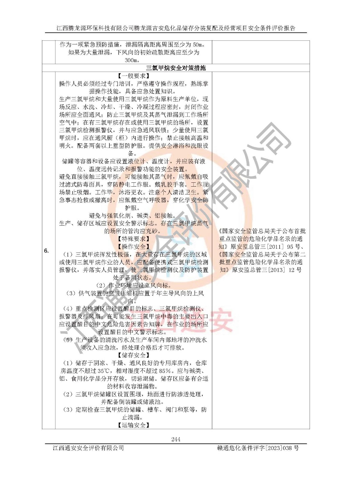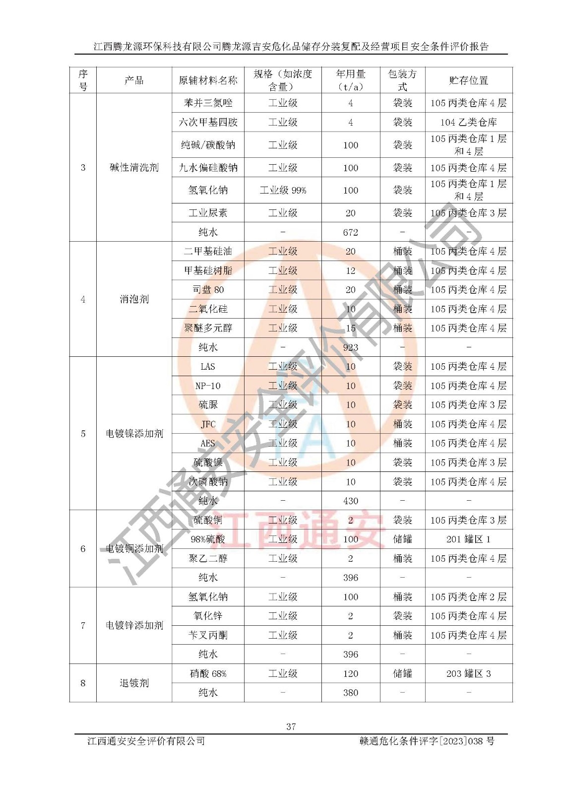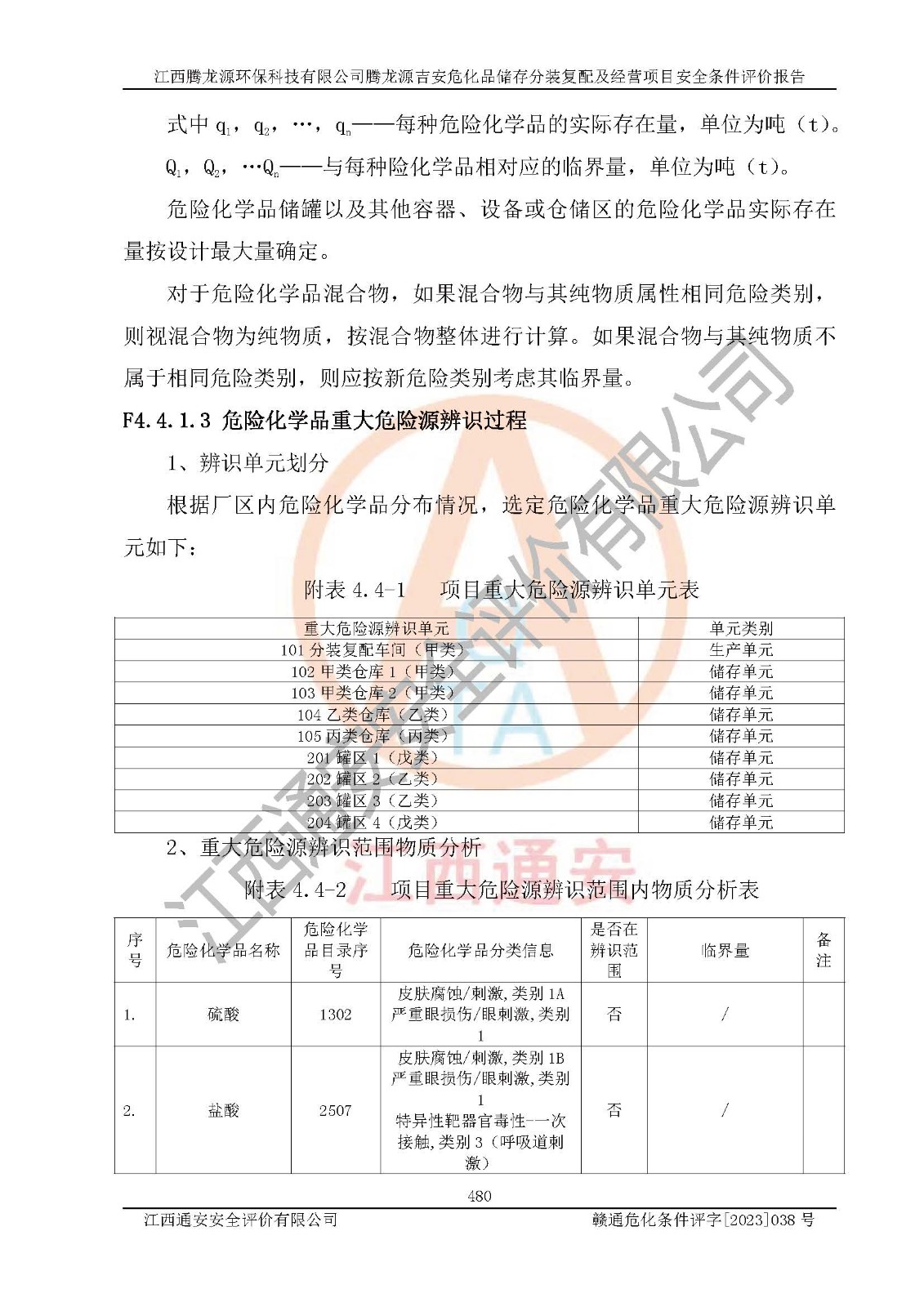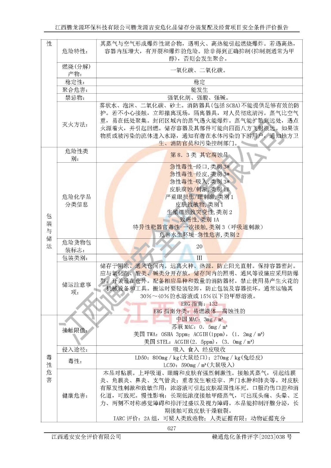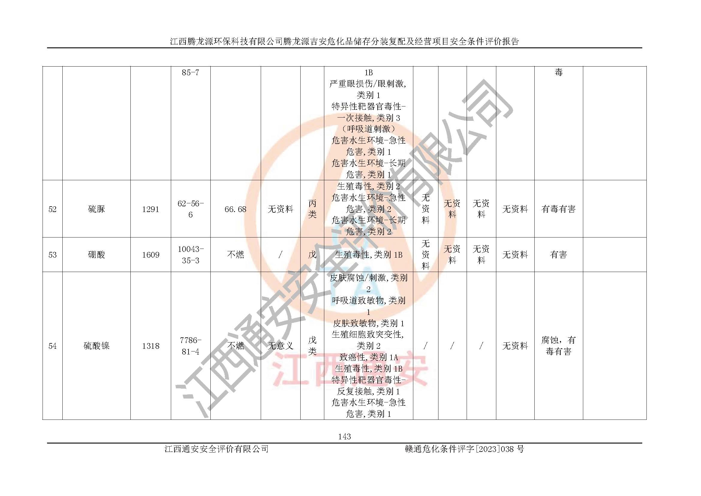 項(xiàng)目簡介 | 江西騰龍?jiān)?*科技有限公司成立于2022年6月20日,并取得吉水縣市場監(jiān)督管理局頒發(fā)的《營業(yè)執(zhí)照》,營業(yè)執(zhí)照統(tǒng)一社會信用代碼:91360822MABQK5GB5P。公司注冊住所:江西省吉安市吉水縣城西工業(yè)園區(qū)二期金龍路。法定**人:吳詩明。注冊資本壹仟萬元整。企業(yè)性質(zhì)為有限責(zé)任公司(自然人投資或控股)。營業(yè)執(zhí)照許可經(jīng)營范圍:一般項(xiàng)目:化工產(chǎn)品銷售(不含許可類化工產(chǎn)品)(除許可業(yè)務(wù)外,可自主依法經(jīng)營法律法規(guī)非禁止或限制的項(xiàng)目)。 江西騰龍?jiān)?*科技有限公司2023年2月24日取得吉水縣發(fā)展和改革委員會頒發(fā)的《江西省企業(yè)投資項(xiàng)目備案通知書》,備案項(xiàng)目名稱為:騰龍?jiān)醇参;穬Υ娣盅b復(fù)配及經(jīng)營項(xiàng)目。項(xiàng)目統(tǒng)一代碼為:2302-360822-04-01-318980。項(xiàng)目總投資20000萬元,項(xiàng)目總占地面積31.34畝。 根據(jù)《危險(xiǎn)化學(xué)品目錄(2015版)》(**安監(jiān)總局等十部門公告[2015]第5號)及應(yīng)急管理部、工業(yè)和信息化部、公安部、生態(tài)環(huán)境部、交通運(yùn)輸部、農(nóng)業(yè)農(nóng)村部、衛(wèi)生健康委、市場監(jiān)管總局、鐵路局、民航局決定調(diào)整《危險(xiǎn)化學(xué)品目錄(2015版)》(應(yīng)急管理部、工業(yè)和信息化部、公安部、生態(tài)環(huán)境部、交通運(yùn)輸部、農(nóng)業(yè)農(nóng)村部、衛(wèi)生健康委、市場監(jiān)管總局、鐵路局、民航局公告2022年第8號)等文件對該項(xiàng)目生產(chǎn)過程中所涉及的化學(xué)品進(jìn)行辨識:項(xiàng)目涉及的硫酸、鹽酸、雙氧水、硝酸、氫氧化鈉(固體和溶液)、次氯酸鈉溶液、氯酸鈉、氯酸鉀、鉻酸酐、高錳酸鈉、高錳酸鉀、硝酸鉀、重鉻酸鉀、重鉻酸鈉、硝酸鈉、亞硝酸鈉、過硫酸鈉、過硫酸銨、過硫酸鉀、漂白粉、氯化亞砜、甲醇、乙醇、二甲苯、甲苯、**、天那水、乙酸、乙酸乙酯、甲醛溶液、三氯乙烯、正丁醇、異丙醇、石油醚、醋酸酐、甲基乙基酮(丁酮)、三氯甲烷、乙醚、氨水(20%)、甲酸、二氯甲烷、**苯、乙酸丁酯、氫氟酸、磷酸、硫化鈉(無水)、氫氧化鉀、氨基磺酸、三氯化鐵、九水硝酸鐵、氯化鋅、硫脲、硼酸、硫酸鎳、氯化鎳、氟化氫銨、氟化氫鉀、氟化氫鈉、偏硅酸鈉、九水偏硅酸鈉、氟硅酸鈉、亞硫酸氫鈉、氟化鈉、氟化鉀、六次甲基四胺、結(jié)晶氯化鋁、碳酸二乙酯、碳酸二甲酯、酸性清洗劑、退鍍劑、開油水、洗網(wǎng)水、污水殺菌劑(復(fù)配的次氯酸鈉溶液)、電解液等屬于危險(xiǎn)化學(xué)品。 江西騰龍?jiān)?*科技有限公司騰龍?jiān)醇参;穬Υ娣盅b復(fù)配及經(jīng)營項(xiàng)目只進(jìn)行物理混合復(fù)配、分裝等作業(yè),不涉及化學(xué)反應(yīng)過程。因此該公司?;穫}儲經(jīng)營活動需要辦理《危險(xiǎn)化學(xué)品經(jīng)營許可證》。 根據(jù)《中華人民共和國監(jiān)控化學(xué)品管理?xiàng)l例》(中華人民共和國***令**90號,經(jīng)中華人民共和國***令第588號修改)及《各類監(jiān)控化學(xué)品名錄》(中華人民共和國工業(yè)和信息化部令第52號;2020年)、《列入第三類監(jiān)控化學(xué)品的新增品種清單》**石油和化學(xué)工業(yè)局令**號等規(guī)定進(jìn)行辨識:項(xiàng)目涉及的氯化亞砜屬于第三類監(jiān)控化學(xué)品。 根據(jù)《易制毒化學(xué)品管理?xiàng)l例》(***令第445號,經(jīng)***令第653號、***第666號、***第703號修改)及附表規(guī)定、中華人民共和國公安部 中華人民共和國商務(wù)部、**衛(wèi)生和計(jì)劃生育委員會、中華人民共和國海關(guān)總署、**安全生產(chǎn)監(jiān)督管理總局、**食品藥品監(jiān)督管理總局《關(guān)于將4-苯胺基-N-苯乙基哌啶、N-苯乙基-4-哌啶酮、N-甲基-1-苯基-1-氯-2-丙胺、溴素、1-苯基-1-**5種物質(zhì)列入易制毒化學(xué)品管理的公告》(國辦函[2017]**20號)、《***辦公廳關(guān)于同意將1-苯基-2-溴-1-**和3-氧-2-苯基丁腈列入易制毒化學(xué)品品種目錄的函》(國辦函[2014]第40號)、《***辦公廳關(guān)于同意將α-苯乙酰乙酸甲酯等6種物質(zhì)列入易制毒化學(xué)品品種目錄的函》(國辦函〔2021〕58號)等進(jìn)行辨識:項(xiàng)目涉及的硫酸、鹽酸、高錳酸鉀、甲苯、**、甲基乙基酮等屬于第三類易制毒化學(xué)品;醋酸酐、三氯甲烷、乙醚等屬于第二類易制毒化學(xué)品。 根據(jù)《危險(xiǎn)化學(xué)品名錄[2015年版]》(**安監(jiān)總局等十部門[2015]第5號)進(jìn)行劇毒化學(xué)品辨識:項(xiàng)目不涉及劇毒化學(xué)品。 根據(jù)《高毒物品目錄(2003年版)》(原衛(wèi)生部衛(wèi)法監(jiān)發(fā)[2003]142號)對項(xiàng)目涉及的化學(xué)品進(jìn)行高毒物品辨識:項(xiàng)目涉及的甲醛溶液、硫酸鎳、氯化鎳、氟化氫銨、氟化氫鉀、氟化氫鈉、氟化鈉、氟化鉀、鉻酸酐、高錳酸鉀、高錳酸鈉、重鉻酸鉀、重鉻酸鈉等屬于高毒物品。 根據(jù)中華人民共和國公安部《易制爆危險(xiǎn)化學(xué)品名錄》(2017年版)中規(guī)定進(jìn)行辨識:項(xiàng)目涉及的雙氧水、硝酸、氯酸鈉、氯酸鉀、高錳酸鉀、高錳酸鈉、硝酸鉀、重鉻酸鉀、重鉻酸鈉、硝酸鈉、六次甲基四胺等屬于易