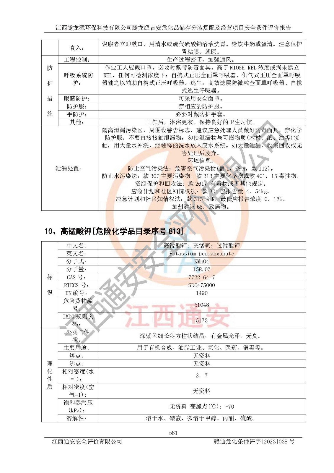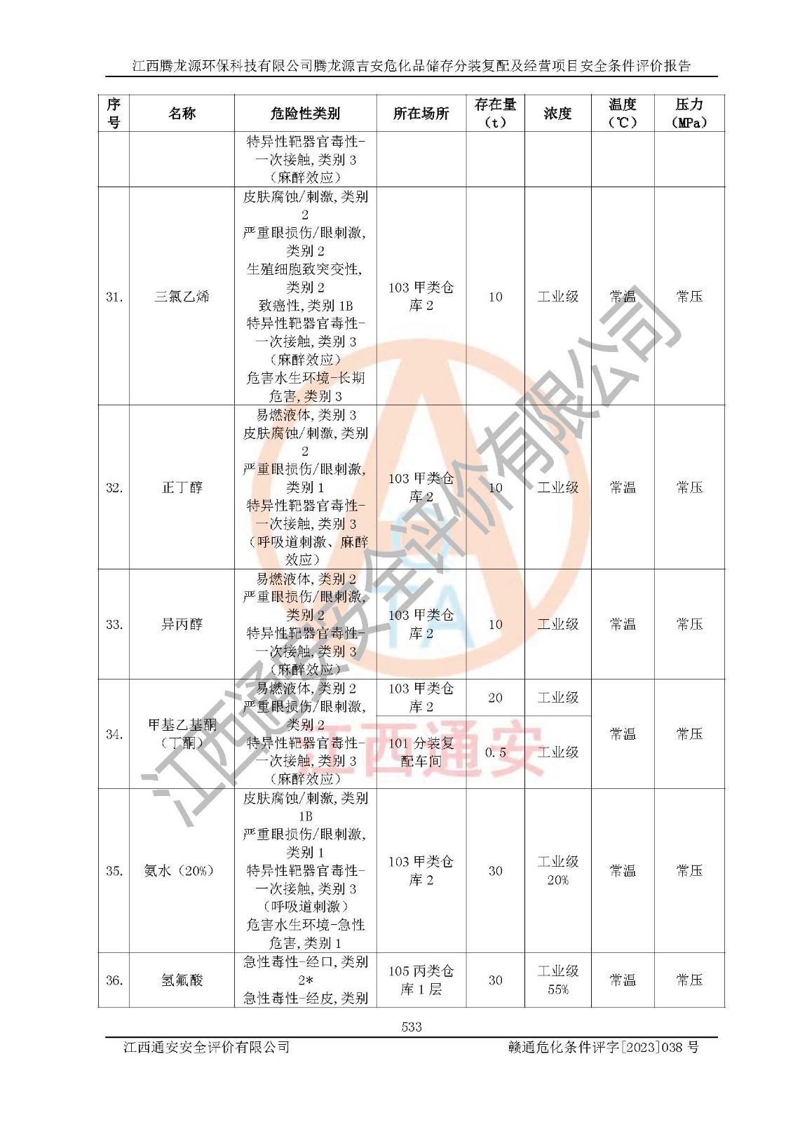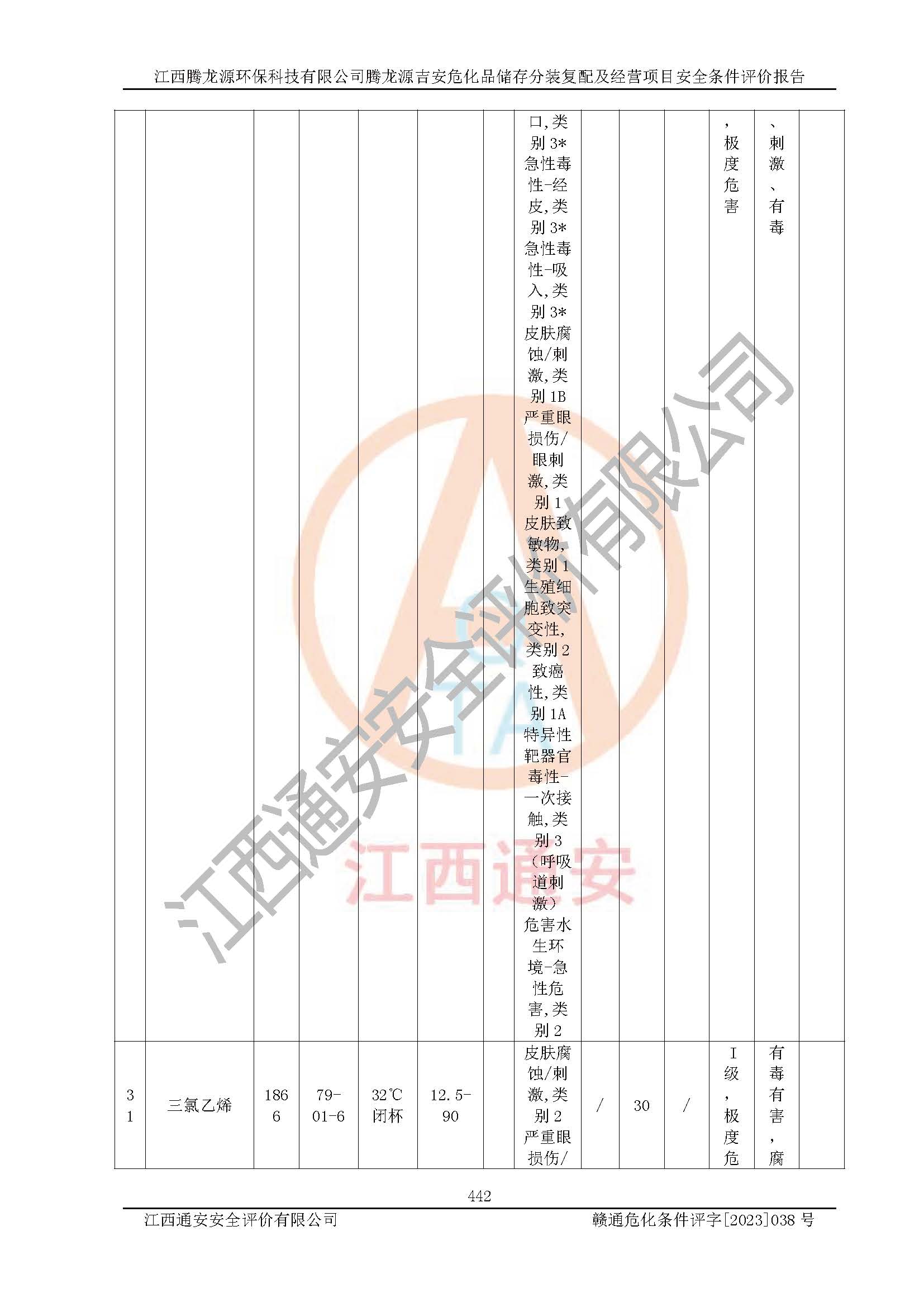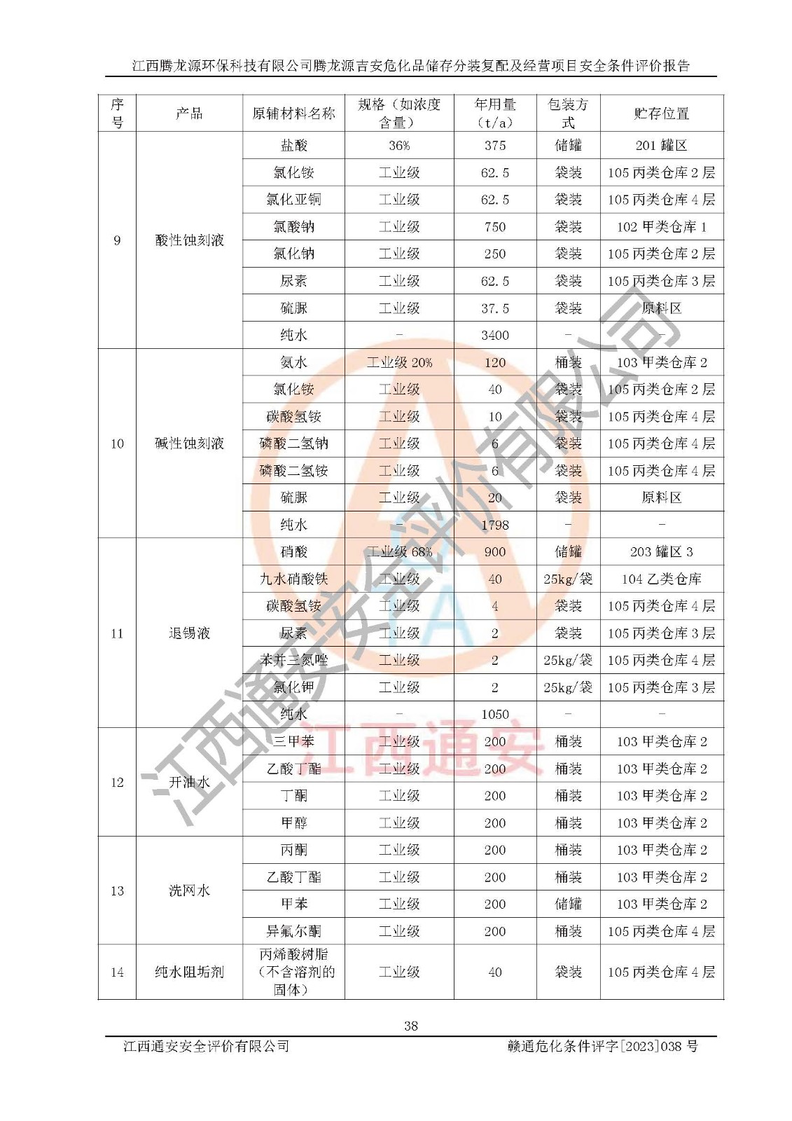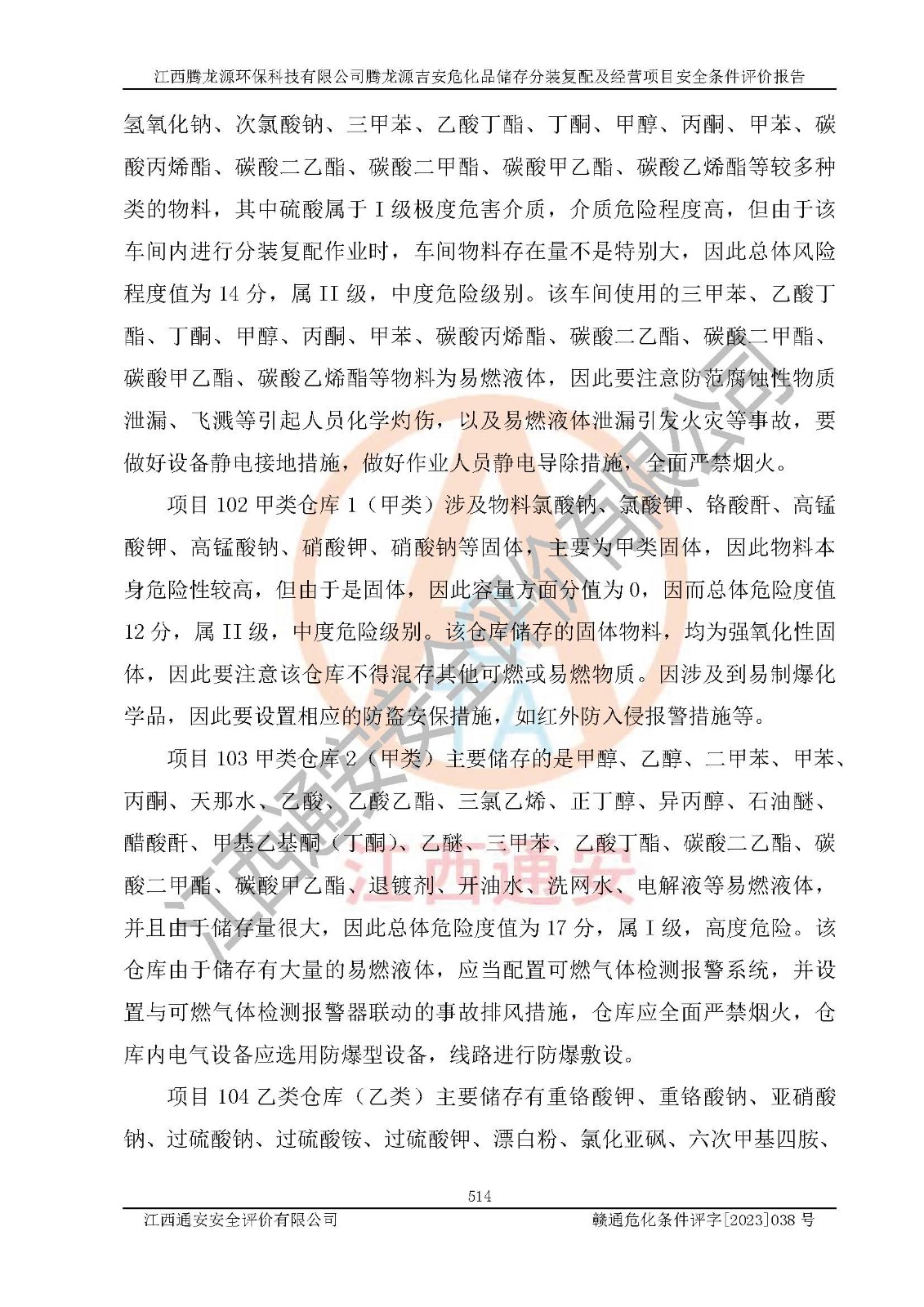項(xiàng)目簡介 | 江西騰龍?jiān)?*科技有限公司成立于2022年6月20日,并取得吉水縣市場監(jiān)督管理局頒發(fā)的《營業(yè)執(zhí)照》,營業(yè)執(zhí)照統(tǒng)一社會信用代碼:91360822MABQK5GB5P。公司注冊住所:江西省吉安市吉水縣城西工業(yè)園區(qū)二期金龍路。法定**人:吳詩明。注冊資本壹仟萬元整。企業(yè)性質(zhì)為有限責(zé)任公司(自然人投資或控股)。營業(yè)執(zhí)照許可經(jīng)營范圍:一般項(xiàng)目:化工產(chǎn)品銷售(不含許可類化工產(chǎn)品)(除許可業(yè)務(wù)外,可自主依法經(jīng)營法律法規(guī)非禁止或限制的項(xiàng)目)。 江西騰龍?jiān)?*科技有限公司2023年2月24日取得吉水縣發(fā)展和改革委員會頒發(fā)的《江西省企業(yè)投資項(xiàng)目備案通知書》,備案項(xiàng)目名稱為:騰龍?jiān)醇参;穬Υ娣盅b復(fù)配及經(jīng)營項(xiàng)目。項(xiàng)目統(tǒng)一代碼為:2302-360822-04-01-318980。項(xiàng)目總投資20000萬元,項(xiàng)目總占地面積31.34畝。 根據(jù)《危險(xiǎn)化學(xué)品目錄(2015版)》(**安監(jiān)總局等十部門公告[2015]第5號)及應(yīng)急管理部、工業(yè)和信息化部、公安部、生態(tài)環(huán)境部、交通運(yùn)輸部、農(nóng)業(yè)農(nóng)村部、衛(wèi)生健康委、市場監(jiān)管總局、鐵路局、民航局決定調(diào)整《危險(xiǎn)化學(xué)品目錄(2015版)》(應(yīng)急管理部、工業(yè)和信息化部、公安部、生態(tài)環(huán)境部、交通運(yùn)輸部、農(nóng)業(yè)農(nóng)村部、衛(wèi)生健康委、市場監(jiān)管總局、鐵路局、民航局公告2022年第8號)等文件對該項(xiàng)目生產(chǎn)過程中所涉及的化學(xué)品進(jìn)行辨識:項(xiàng)目涉及的硫酸、鹽酸、雙氧水、硝酸、氫氧化鈉(固體和溶液)、次氯酸鈉溶液、氯酸鈉、氯酸鉀、鉻酸酐、高錳酸鈉、高錳酸鉀、硝酸鉀、重鉻酸鉀、重鉻酸鈉、硝酸鈉、亞硝酸鈉、過硫酸鈉、過硫酸銨、過硫酸鉀、漂白粉、氯化亞砜、甲醇、乙醇、二甲苯、甲苯、**、天那水、乙酸、乙酸乙酯、甲醛溶液、三氯乙烯、正丁醇、異丙醇、石油醚、醋酸酐、甲基乙基酮(丁酮)、三氯甲烷、乙醚、氨水(20%)、甲酸、二氯甲烷、**苯、乙酸丁酯、氫氟酸、磷酸、硫化鈉(無水)、氫氧化鉀、氨基磺酸、三氯化鐵、九水硝酸鐵、氯化鋅、硫脲、硼酸、硫酸鎳、氯化鎳、氟化氫銨、氟化氫鉀、氟化氫鈉、偏硅酸鈉、九水偏硅酸鈉、氟硅酸鈉、亞硫酸氫鈉、氟化鈉、氟化鉀、六次甲基四胺、結(jié)晶氯化鋁、碳酸二乙酯、碳酸二甲酯、酸性清洗劑、退鍍劑、開油水、洗網(wǎng)水、污水殺菌劑(復(fù)配的次氯酸鈉溶液)、電解液等屬于危險(xiǎn)化學(xué)品。 江西騰龍?jiān)?*科技有限公司騰龍?jiān)醇参;穬Υ娣盅b復(fù)配及經(jīng)營項(xiàng)目只進(jìn)行物理混合復(fù)配、分裝等作業(yè),不涉及化學(xué)反應(yīng)過程。因此該公司?;穫}儲經(jīng)營活動需要辦理《危險(xiǎn)化學(xué)品經(jīng)營許可證》。 根據(jù)《中華人民共和國監(jiān)控化學(xué)品管理?xiàng)l例》(中華人民共和國***令**90號,經(jīng)中華人民共和國***令第588號修改)及《各類監(jiān)控化學(xué)品名錄》(中華人民共和國工業(yè)和信息化部令第52號;2020年)、《列入第三類監(jiān)控化學(xué)品的新增品種清單》**石油和化學(xué)工業(yè)局令**號等規(guī)定進(jìn)行辨識:項(xiàng)目涉及的氯化亞砜屬于第三類監(jiān)控化學(xué)品。 根據(jù)《易制毒化學(xué)品管理?xiàng)l例》(***令第445號,經(jīng)***令第653號、***第666號、***第703號修改)及附表規(guī)定、中華人民共和國公安部 中華人民共和國商務(wù)部、**衛(wèi)生和計(jì)劃生育委員會、中華人民共和國海關(guān)總署、**安全生產(chǎn)監(jiān)督管理總局、**食品藥品監(jiān)督管理總局《關(guān)于將4-苯胺基-N-苯乙基哌啶、N-苯乙基-4-哌啶酮、N-甲基-1-苯基-1-氯-2-丙胺、溴素、1-苯基-1-**5種物質(zhì)列入易制毒化學(xué)品管理的公告》(國辦函[2017]**20號)、《***辦公廳關(guān)于同意將1-苯基-2-溴-1-**和3-氧-2-苯基丁腈列入易制毒化學(xué)品品種目錄的函》(國辦函[2014]第40號)、《***辦公廳關(guān)于同意將α-苯乙酰乙酸甲酯等6種物質(zhì)列入易制毒化學(xué)品品種目錄的函》(國辦函〔2021〕58號)等進(jìn)行辨識:項(xiàng)目涉及的硫酸、鹽酸、高錳酸鉀、甲苯、**、甲基乙基酮等屬于第三類易制毒化學(xué)品;醋酸酐、三氯甲烷、乙醚等屬于第二類易制毒化學(xué)品。 根據(jù)《危險(xiǎn)化學(xué)品名錄[2015年版]》(**安監(jiān)總局等十部門[2015]第5號)進(jìn)行劇毒化學(xué)品辨識:項(xiàng)目不涉及劇毒化學(xué)品。 根據(jù)《高毒物品目錄(2003年版)》(原衛(wèi)生部衛(wèi)法監(jiān)發(fā)[2003]142號)對項(xiàng)目涉及的化學(xué)品進(jìn)行高毒物品辨識:項(xiàng)目涉及的甲醛溶液、硫酸鎳、氯化鎳、氟化氫銨、氟化氫鉀、氟化氫鈉、氟化鈉、氟化鉀、鉻酸酐、高錳酸鉀、高錳酸鈉、重鉻酸鉀、重鉻酸鈉等屬于高毒物品。 根據(jù)中華人民共和國公安部《易制爆危險(xiǎn)化學(xué)品名錄》(2017年版)中規(guī)定進(jìn)行辨識:項(xiàng)目涉及的雙氧水、硝酸、氯酸鈉、氯酸鉀、高錳酸鉀、高錳酸鈉、硝酸鉀、重鉻酸鉀、重鉻酸鈉、硝酸鈉、六次甲基四胺等屬于易