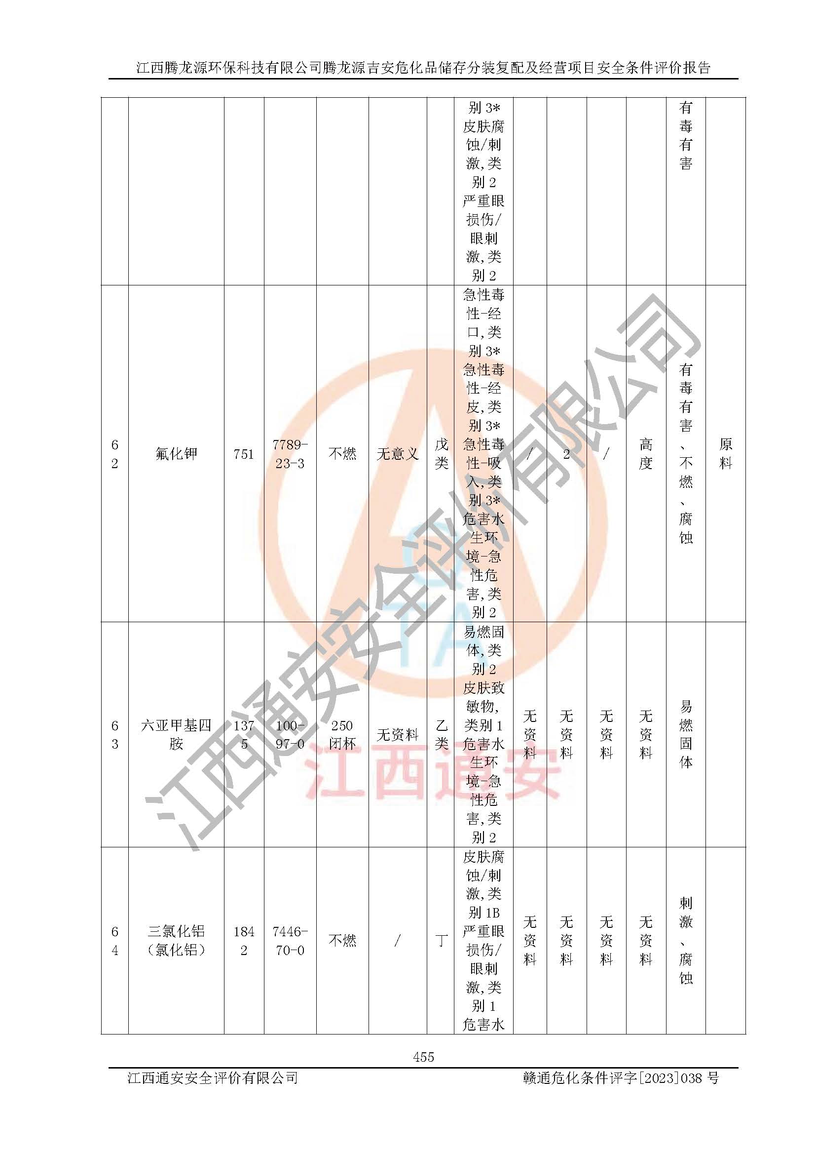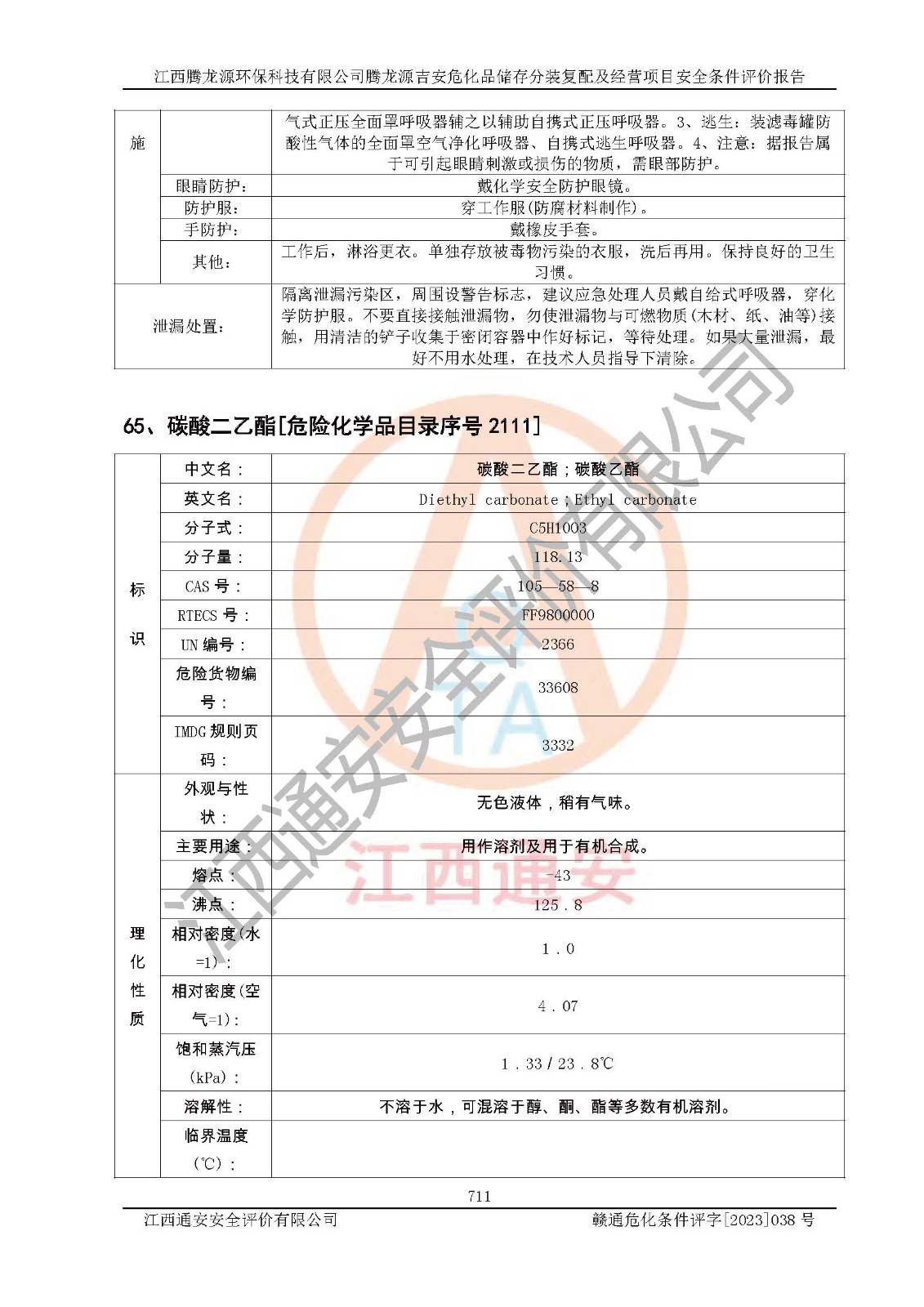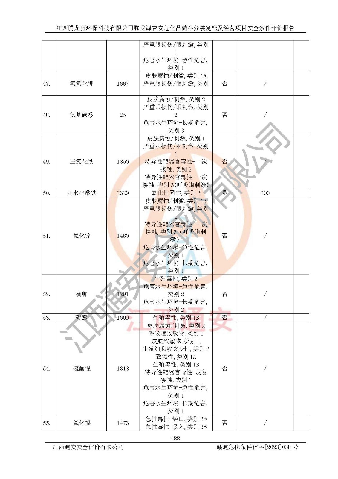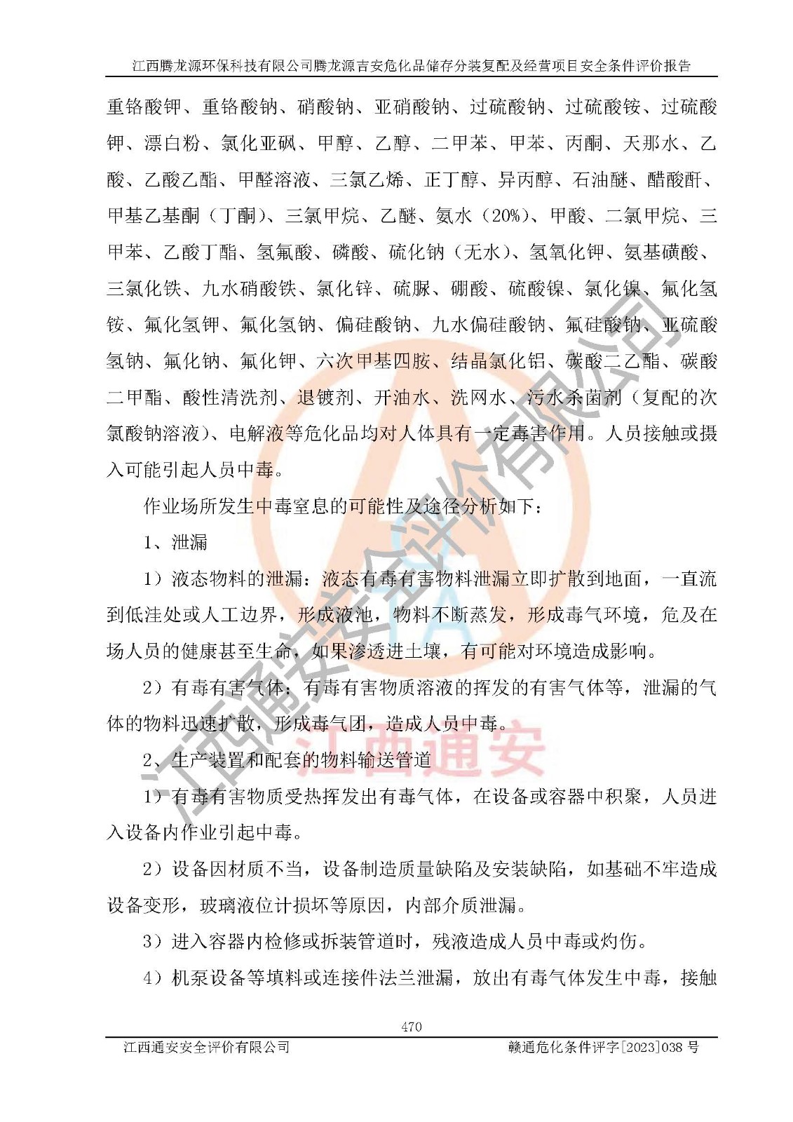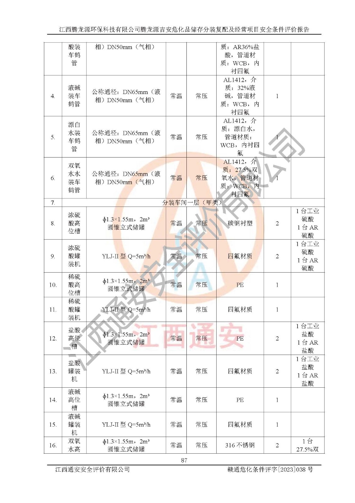 項(xiàng)目簡介 | 江西騰龍?jiān)?*科技有限公司成立于2022年6月20日,并取得吉水縣市場監(jiān)督管理局頒發(fā)的《營業(yè)執(zhí)照》,營業(yè)執(zhí)照統(tǒng)一社會信用代碼:91360822MABQK5GB5P。公司注冊住所:江西省吉安市吉水縣城西工業(yè)園區(qū)二期金龍路。法定**人:吳詩明。注冊資本壹仟萬元整。企業(yè)性質(zhì)為有限責(zé)任公司(自然人投資或控股)。營業(yè)執(zhí)照許可經(jīng)營范圍:一般項(xiàng)目:化工產(chǎn)品銷售(不含許可類化工產(chǎn)品)(除許可業(yè)務(wù)外,可自主依法經(jīng)營法律法規(guī)非禁止或限制的項(xiàng)目)。 江西騰龍?jiān)?*科技有限公司2023年2月24日取得吉水縣發(fā)展和改革委員會頒發(fā)的《江西省企業(yè)投資項(xiàng)目備案通知書》,備案項(xiàng)目名稱為:騰龍?jiān)醇参;穬Υ娣盅b復(fù)配及經(jīng)營項(xiàng)目。項(xiàng)目統(tǒng)一代碼為:2302-360822-04-01-318980。項(xiàng)目總投資20000萬元,項(xiàng)目總占地面積31.34畝。 根據(jù)《危險(xiǎn)化學(xué)品目錄(2015版)》(**安監(jiān)總局等十部門公告[2015]第5號)及應(yīng)急管理部、工業(yè)和信息化部、公安部、生態(tài)環(huán)境部、交通運(yùn)輸部、農(nóng)業(yè)農(nóng)村部、衛(wèi)生健康委、市場監(jiān)管總局、鐵路局、民航局決定調(diào)整《危險(xiǎn)化學(xué)品目錄(2015版)》(應(yīng)急管理部、工業(yè)和信息化部、公安部、生態(tài)環(huán)境部、交通運(yùn)輸部、農(nóng)業(yè)農(nóng)村部、衛(wèi)生健康委、市場監(jiān)管總局、鐵路局、民航局公告2022年第8號)等文件對該項(xiàng)目生產(chǎn)過程中所涉及的化學(xué)品進(jìn)行辨識:項(xiàng)目涉及的硫酸、鹽酸、雙氧水、硝酸、氫氧化鈉(固體和溶液)、次氯酸鈉溶液、氯酸鈉、氯酸鉀、鉻酸酐、高錳酸鈉、高錳酸鉀、硝酸鉀、重鉻酸鉀、重鉻酸鈉、硝酸鈉、亞硝酸鈉、過硫酸鈉、過硫酸銨、過硫酸鉀、漂白粉、氯化亞砜、甲醇、乙醇、二甲苯、甲苯、**、天那水、乙酸、乙酸乙酯、甲醛溶液、三氯乙烯、正丁醇、異丙醇、石油醚、醋酸酐、甲基乙基酮(丁酮)、三氯甲烷、乙醚、氨水(20%)、甲酸、二氯甲烷、**苯、乙酸丁酯、氫氟酸、磷酸、硫化鈉(無水)、氫氧化鉀、氨基磺酸、三氯化鐵、九水硝酸鐵、氯化鋅、硫脲、硼酸、硫酸鎳、氯化鎳、氟化氫銨、氟化氫鉀、氟化氫鈉、偏硅酸鈉、九水偏硅酸鈉、氟硅酸鈉、亞硫酸氫鈉、氟化鈉、氟化鉀、六次甲基四胺、結(jié)晶氯化鋁、碳酸二乙酯、碳酸二甲酯、酸性清洗劑、退鍍劑、開油水、洗網(wǎng)水、污水殺菌劑(復(fù)配的次氯酸鈉溶液)、電解液等屬于危險(xiǎn)化學(xué)品。 江西騰龍?jiān)?*科技有限公司騰龍?jiān)醇参;穬Υ娣盅b復(fù)配及經(jīng)營項(xiàng)目只進(jìn)行物理混合復(fù)配、分裝等作業(yè),不涉及化學(xué)反應(yīng)過程。因此該公司?;穫}儲經(jīng)營活動需要辦理《危險(xiǎn)化學(xué)品經(jīng)營許可證》。 根據(jù)《中華人民共和國監(jiān)控化學(xué)品管理?xiàng)l例》(中華人民共和國***令**90號,經(jīng)中華人民共和國***令第588號修改)及《各類監(jiān)控化學(xué)品名錄》(中華人民共和國工業(yè)和信息化部令第52號;2020年)、《列入第三類監(jiān)控化學(xué)品的新增品種清單》**石油和化學(xué)工業(yè)局令**號等規(guī)定進(jìn)行辨識:項(xiàng)目涉及的氯化亞砜屬于第三類監(jiān)控化學(xué)品。 根據(jù)《易制毒化學(xué)品管理?xiàng)l例》(***令第445號,經(jīng)***令第653號、***第666號、***第703號修改)及附表規(guī)定、中華人民共和國公安部 中華人民共和國商務(wù)部、**衛(wèi)生和計(jì)劃生育委員會、中華人民共和國海關(guān)總署、**安全生產(chǎn)監(jiān)督管理總局、**食品藥品監(jiān)督管理總局《關(guān)于將4-苯胺基-N-苯乙基哌啶、N-苯乙基-4-哌啶酮、N-甲基-1-苯基-1-氯-2-丙胺、溴素、1-苯基-1-**5種物質(zhì)列入易制毒化學(xué)品管理的公告》(國辦函[2017]**20號)、《***辦公廳關(guān)于同意將1-苯基-2-溴-1-**和3-氧-2-苯基丁腈列入易制毒化學(xué)品品種目錄的函》(國辦函[2014]第40號)、《***辦公廳關(guān)于同意將α-苯乙酰乙酸甲酯等6種物質(zhì)列入易制毒化學(xué)品品種目錄的函》(國辦函〔2021〕58號)等進(jìn)行辨識:項(xiàng)目涉及的硫酸、鹽酸、高錳酸鉀、甲苯、**、甲基乙基酮等屬于第三類易制毒化學(xué)品;醋酸酐、三氯甲烷、乙醚等屬于第二類易制毒化學(xué)品。 根據(jù)《危險(xiǎn)化學(xué)品名錄[2015年版]》(**安監(jiān)總局等十部門[2015]第5號)進(jìn)行劇毒化學(xué)品辨識:項(xiàng)目不涉及劇毒化學(xué)品。 根據(jù)《高毒物品目錄(2003年版)》(原衛(wèi)生部衛(wèi)法監(jiān)發(fā)[2003]142號)對項(xiàng)目涉及的化學(xué)品進(jìn)行高毒物品辨識:項(xiàng)目涉及的甲醛溶液、硫酸鎳、氯化鎳、氟化氫銨、氟化氫鉀、氟化氫鈉、氟化鈉、氟化鉀、鉻酸酐、高錳酸鉀、高錳酸鈉、重鉻酸鉀、重鉻酸鈉等屬于高毒物品。 根據(jù)中華人民共和國公安部《易制爆危險(xiǎn)化學(xué)品名錄》(2017年版)中規(guī)定進(jìn)行辨識:項(xiàng)目涉及的雙氧水、硝酸、氯酸鈉、氯酸鉀、高錳酸鉀、高錳酸鈉、硝酸鉀、重鉻酸鉀、重鉻酸鈉、硝酸鈉、六次甲基四胺等屬于易