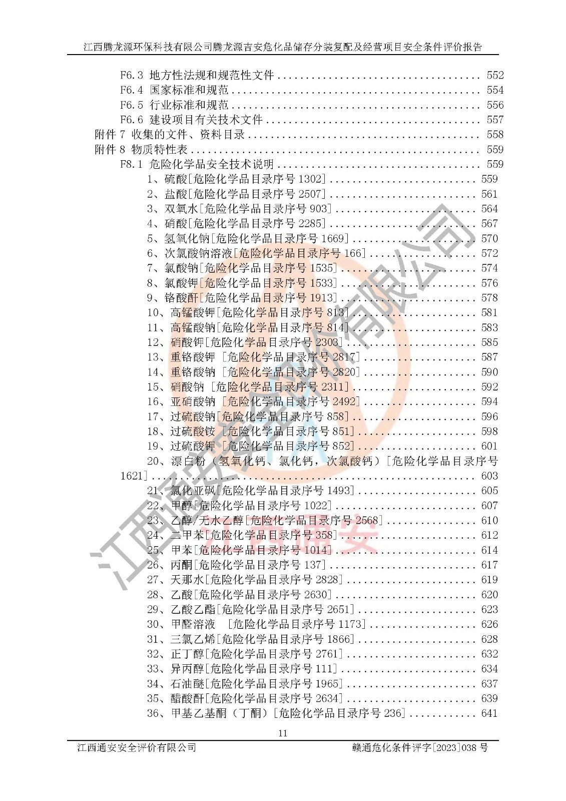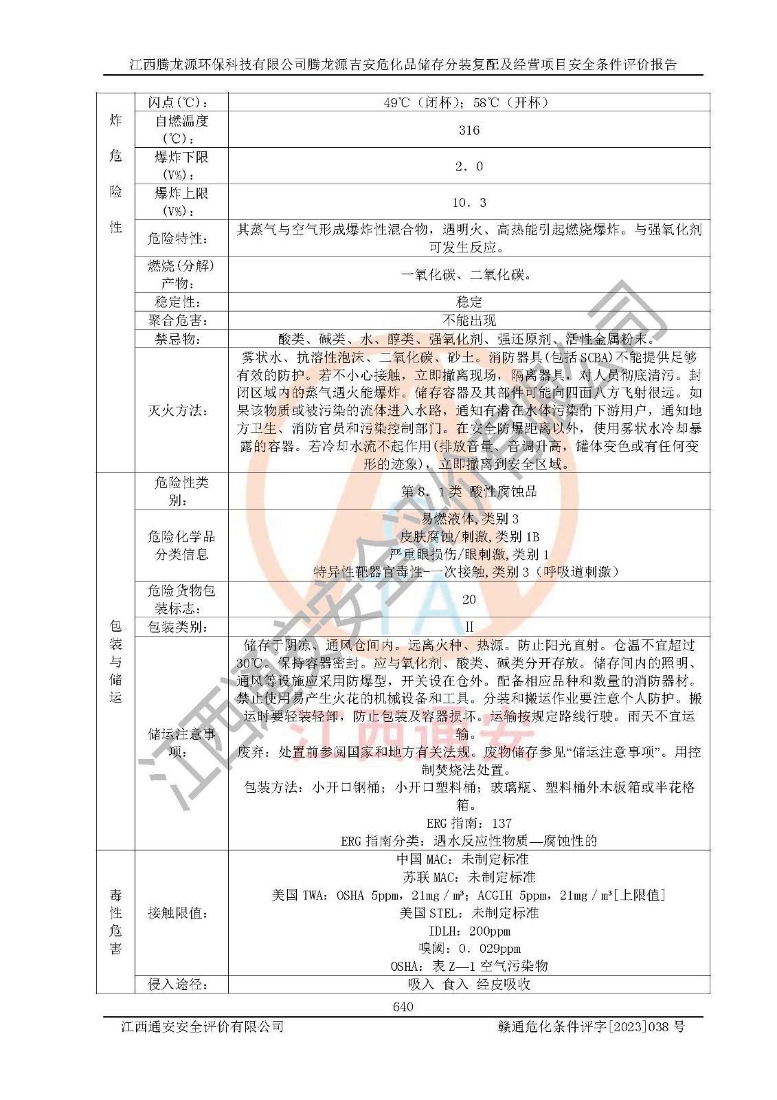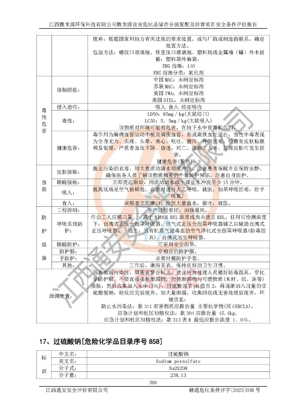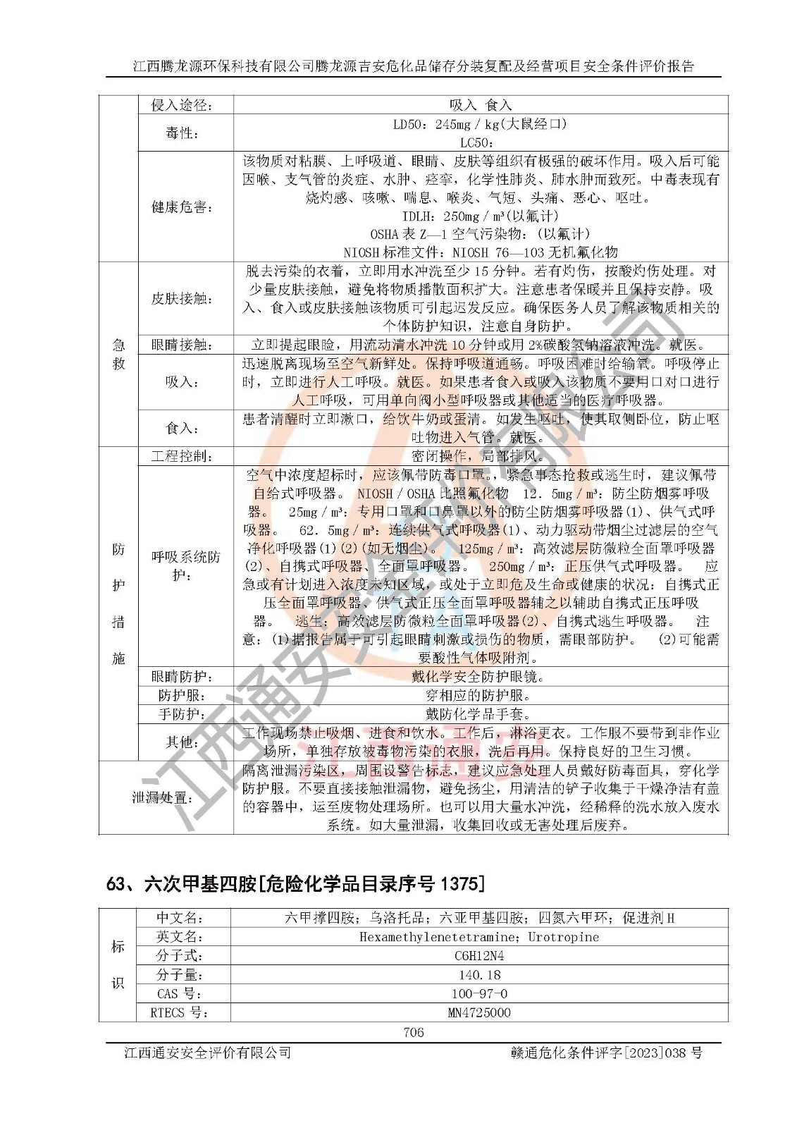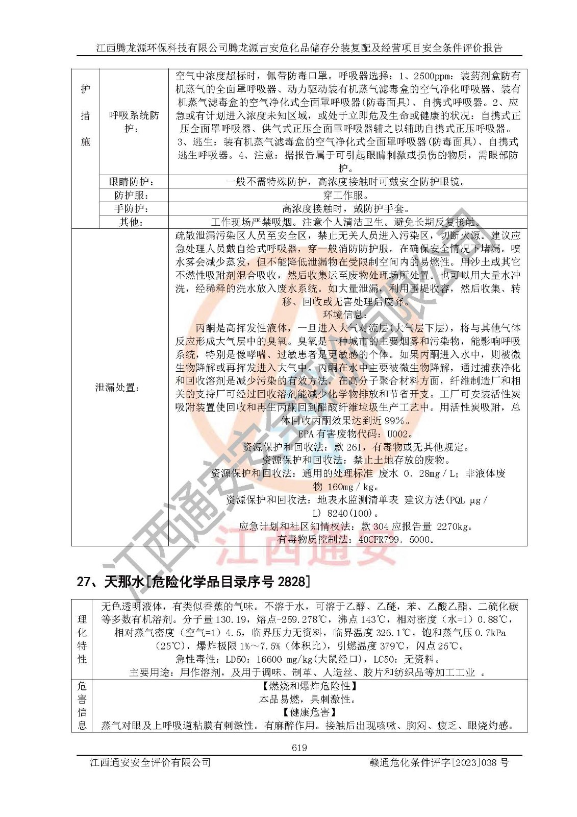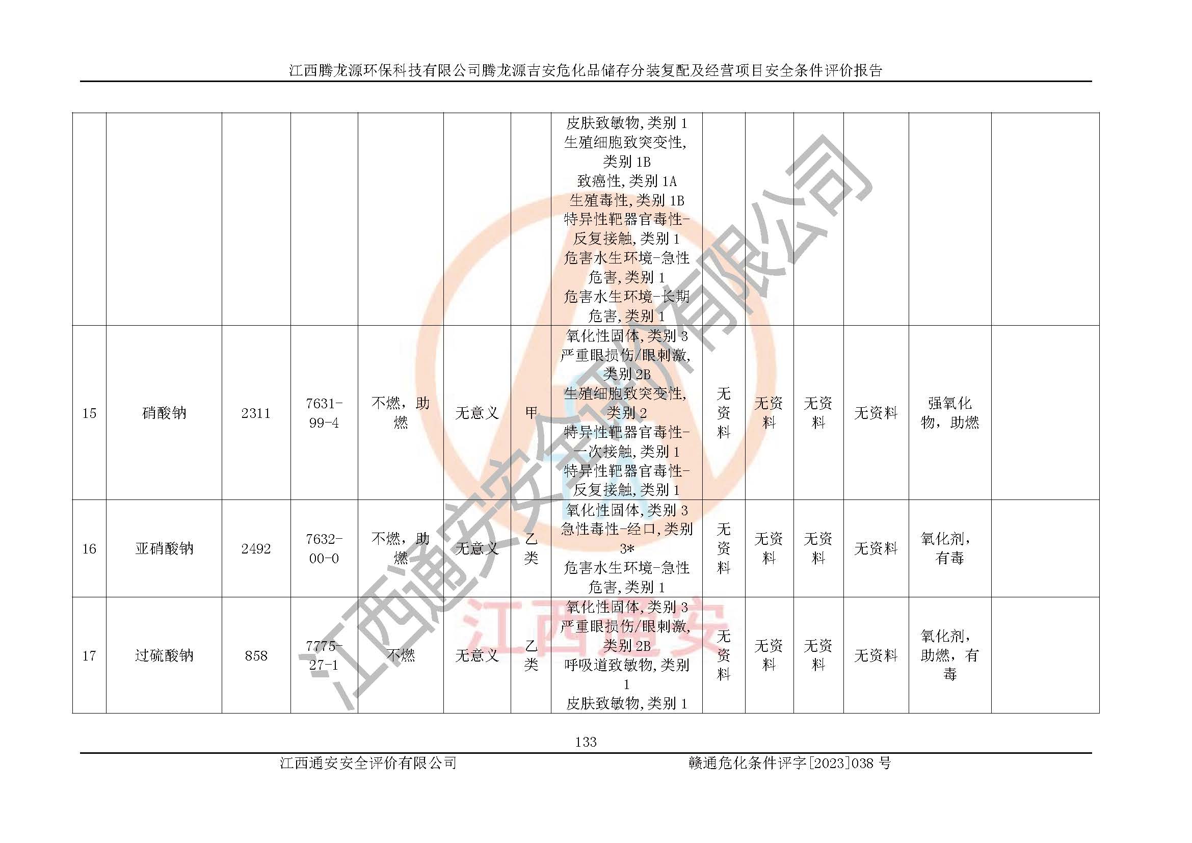 項(xiàng)目簡介 | 江西騰龍?jiān)?*科技有限公司成立于2022年6月20日,并取得吉水縣市場監(jiān)督管理局頒發(fā)的《營業(yè)執(zhí)照》,營業(yè)執(zhí)照統(tǒng)一社會信用代碼:91360822MABQK5GB5P。公司注冊住所:江西省吉安市吉水縣城西工業(yè)園區(qū)二期金龍路。法定**人:吳詩明。注冊資本壹仟萬元整。企業(yè)性質(zhì)為有限責(zé)任公司(自然人投資或控股)。營業(yè)執(zhí)照許可經(jīng)營范圍:一般項(xiàng)目:化工產(chǎn)品銷售(不含許可類化工產(chǎn)品)(除許可業(yè)務(wù)外,可自主依法經(jīng)營法律法規(guī)非禁止或限制的項(xiàng)目)。 江西騰龍?jiān)?*科技有限公司2023年2月24日取得吉水縣發(fā)展和改革委員會頒發(fā)的《江西省企業(yè)投資項(xiàng)目備案通知書》,備案項(xiàng)目名稱為:騰龍?jiān)醇参;穬Υ娣盅b復(fù)配及經(jīng)營項(xiàng)目。項(xiàng)目統(tǒng)一代碼為:2302-360822-04-01-318980。項(xiàng)目總投資20000萬元,項(xiàng)目總占地面積31.34畝。 根據(jù)《危險(xiǎn)化學(xué)品目錄(2015版)》(**安監(jiān)總局等十部門公告[2015]第5號)及應(yīng)急管理部、工業(yè)和信息化部、公安部、生態(tài)環(huán)境部、交通運(yùn)輸部、農(nóng)業(yè)農(nóng)村部、衛(wèi)生健康委、市場監(jiān)管總局、鐵路局、民航局決定調(diào)整《危險(xiǎn)化學(xué)品目錄(2015版)》(應(yīng)急管理部、工業(yè)和信息化部、公安部、生態(tài)環(huán)境部、交通運(yùn)輸部、農(nóng)業(yè)農(nóng)村部、衛(wèi)生健康委、市場監(jiān)管總局、鐵路局、民航局公告2022年第8號)等文件對該項(xiàng)目生產(chǎn)過程中所涉及的化學(xué)品進(jìn)行辨識:項(xiàng)目涉及的硫酸、鹽酸、雙氧水、硝酸、氫氧化鈉(固體和溶液)、次氯酸鈉溶液、氯酸鈉、氯酸鉀、鉻酸酐、高錳酸鈉、高錳酸鉀、硝酸鉀、重鉻酸鉀、重鉻酸鈉、硝酸鈉、亞硝酸鈉、過硫酸鈉、過硫酸銨、過硫酸鉀、漂白粉、氯化亞砜、甲醇、乙醇、二甲苯、甲苯、**、天那水、乙酸、乙酸乙酯、甲醛溶液、三氯乙烯、正丁醇、異丙醇、石油醚、醋酸酐、甲基乙基酮(丁酮)、三氯甲烷、乙醚、氨水(20%)、甲酸、二氯甲烷、**苯、乙酸丁酯、氫氟酸、磷酸、硫化鈉(無水)、氫氧化鉀、氨基磺酸、三氯化鐵、九水硝酸鐵、氯化鋅、硫脲、硼酸、硫酸鎳、氯化鎳、氟化氫銨、氟化氫鉀、氟化氫鈉、偏硅酸鈉、九水偏硅酸鈉、氟硅酸鈉、亞硫酸氫鈉、氟化鈉、氟化鉀、六次甲基四胺、結(jié)晶氯化鋁、碳酸二乙酯、碳酸二甲酯、酸性清洗劑、退鍍劑、開油水、洗網(wǎng)水、污水殺菌劑(復(fù)配的次氯酸鈉溶液)、電解液等屬于危險(xiǎn)化學(xué)品。 江西騰龍?jiān)?*科技有限公司騰龍?jiān)醇参;穬Υ娣盅b復(fù)配及經(jīng)營項(xiàng)目只進(jìn)行物理混合復(fù)配、分裝等作業(yè),不涉及化學(xué)反應(yīng)過程。因此該公司?;穫}儲經(jīng)營活動需要辦理《危險(xiǎn)化學(xué)品經(jīng)營許可證》。 根據(jù)《中華人民共和國監(jiān)控化學(xué)品管理?xiàng)l例》(中華人民共和國***令**90號,經(jīng)中華人民共和國***令第588號修改)及《各類監(jiān)控化學(xué)品名錄》(中華人民共和國工業(yè)和信息化部令第52號;2020年)、《列入第三類監(jiān)控化學(xué)品的新增品種清單》**石油和化學(xué)工業(yè)局令**號等規(guī)定進(jìn)行辨識:項(xiàng)目涉及的氯化亞砜屬于第三類監(jiān)控化學(xué)品。 根據(jù)《易制毒化學(xué)品管理?xiàng)l例》(***令第445號,經(jīng)***令第653號、***第666號、***第703號修改)及附表規(guī)定、中華人民共和國公安部 中華人民共和國商務(wù)部、**衛(wèi)生和計(jì)劃生育委員會、中華人民共和國海關(guān)總署、**安全生產(chǎn)監(jiān)督管理總局、**食品藥品監(jiān)督管理總局《關(guān)于將4-苯胺基-N-苯乙基哌啶、N-苯乙基-4-哌啶酮、N-甲基-1-苯基-1-氯-2-丙胺、溴素、1-苯基-1-**5種物質(zhì)列入易制毒化學(xué)品管理的公告》(國辦函[2017]**20號)、《***辦公廳關(guān)于同意將1-苯基-2-溴-1-**和3-氧-2-苯基丁腈列入易制毒化學(xué)品品種目錄的函》(國辦函[2014]第40號)、《***辦公廳關(guān)于同意將α-苯乙酰乙酸甲酯等6種物質(zhì)列入易制毒化學(xué)品品種目錄的函》(國辦函〔2021〕58號)等進(jìn)行辨識:項(xiàng)目涉及的硫酸、鹽酸、高錳酸鉀、甲苯、**、甲基乙基酮等屬于第三類易制毒化學(xué)品;醋酸酐、三氯甲烷、乙醚等屬于第二類易制毒化學(xué)品。 根據(jù)《危險(xiǎn)化學(xué)品名錄[2015年版]》(**安監(jiān)總局等十部門[2015]第5號)進(jìn)行劇毒化學(xué)品辨識:項(xiàng)目不涉及劇毒化學(xué)品。 根據(jù)《高毒物品目錄(2003年版)》(原衛(wèi)生部衛(wèi)法監(jiān)發(fā)[2003]142號)對項(xiàng)目涉及的化學(xué)品進(jìn)行高毒物品辨識:項(xiàng)目涉及的甲醛溶液、硫酸鎳、氯化鎳、氟化氫銨、氟化氫鉀、氟化氫鈉、氟化鈉、氟化鉀、鉻酸酐、高錳酸鉀、高錳酸鈉、重鉻酸鉀、重鉻酸鈉等屬于高毒物品。 根據(jù)中華人民共和國公安部《易制爆危險(xiǎn)化學(xué)品名錄》(2017年版)中規(guī)定進(jìn)行辨識:項(xiàng)目涉及的雙氧水、硝酸、氯酸鈉、氯酸鉀、高錳酸鉀、高錳酸鈉、硝酸鉀、重鉻酸鉀、重鉻酸鈉、硝酸鈉、六次甲基四胺等屬于易