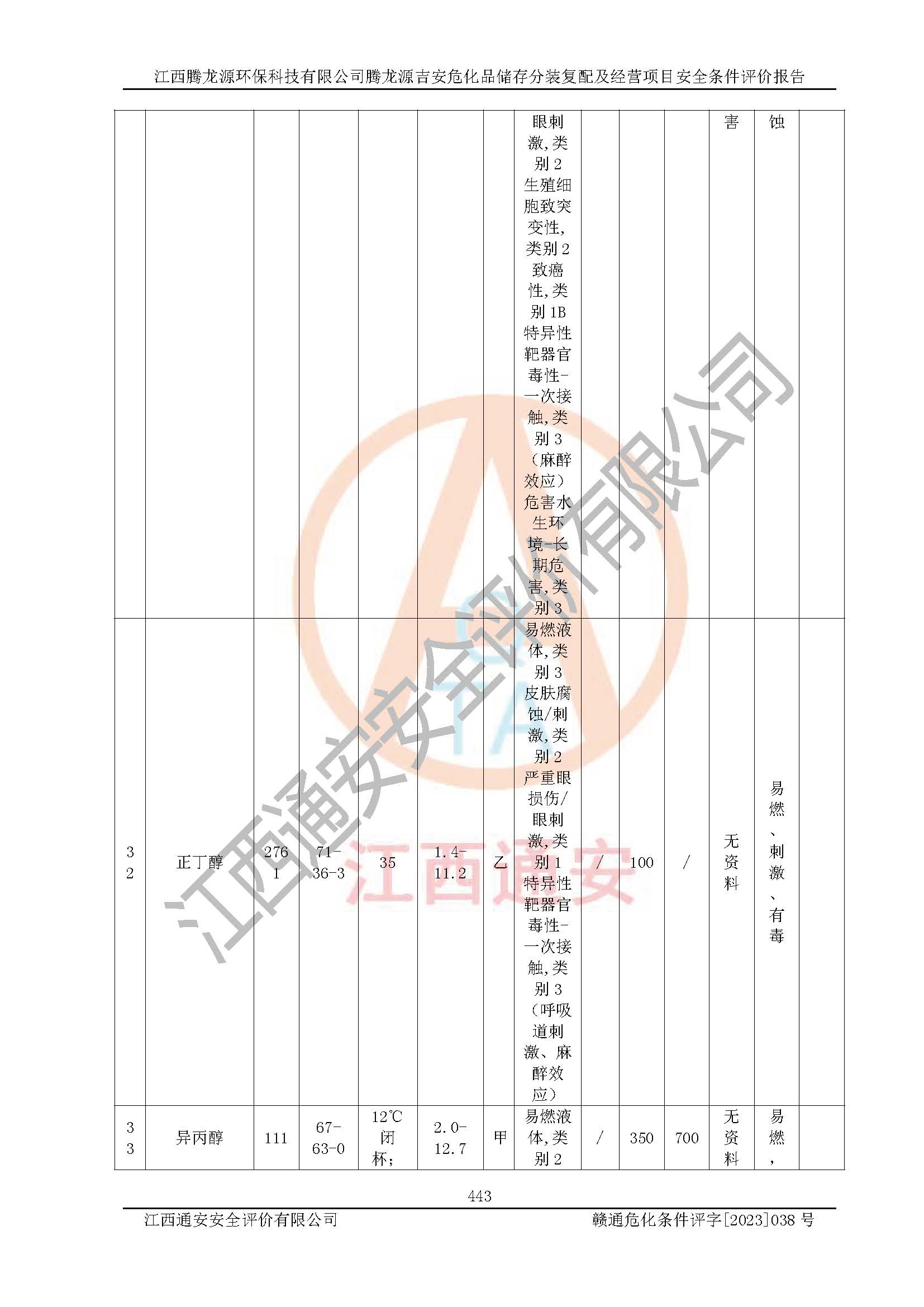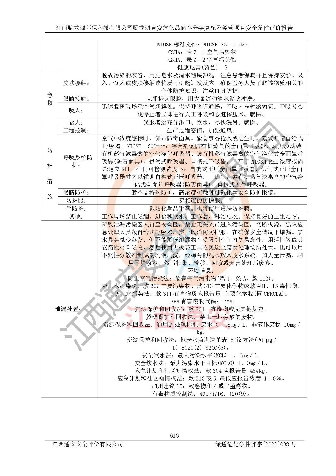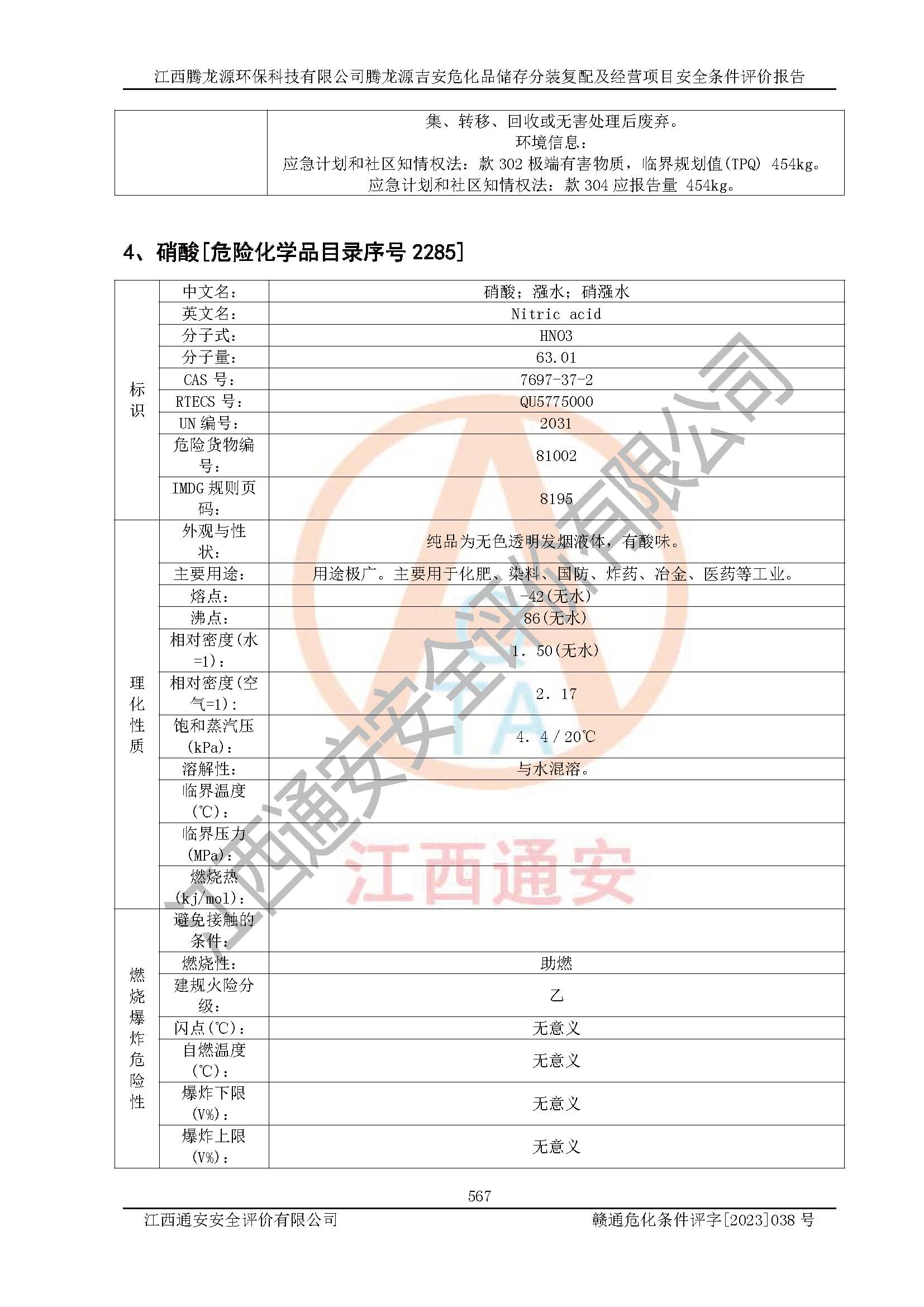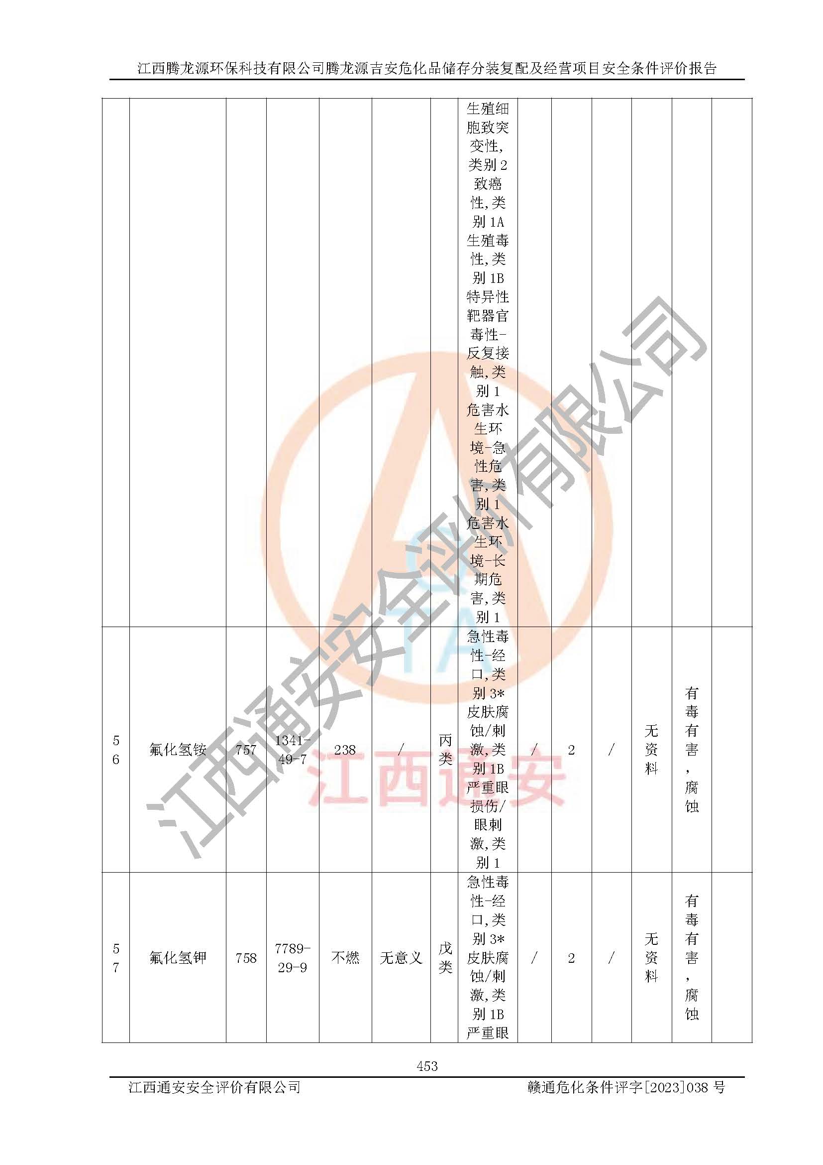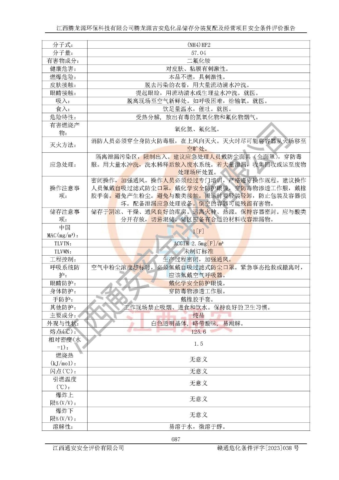 項(xiàng)目簡介 | 江西騰龍?jiān)?*科技有限公司成立于2022年6月20日,并取得吉水縣市場監(jiān)督管理局頒發(fā)的《營業(yè)執(zhí)照》,營業(yè)執(zhí)照統(tǒng)一社會信用代碼:91360822MABQK5GB5P。公司注冊住所:江西省吉安市吉水縣城西工業(yè)園區(qū)二期金龍路。法定**人:吳詩明。注冊資本壹仟萬元整。企業(yè)性質(zhì)為有限責(zé)任公司(自然人投資或控股)。營業(yè)執(zhí)照許可經(jīng)營范圍:一般項(xiàng)目:化工產(chǎn)品銷售(不含許可類化工產(chǎn)品)(除許可業(yè)務(wù)外,可自主依法經(jīng)營法律法規(guī)非禁止或限制的項(xiàng)目)。 江西騰龍?jiān)?*科技有限公司2023年2月24日取得吉水縣發(fā)展和改革委員會頒發(fā)的《江西省企業(yè)投資項(xiàng)目備案通知書》,備案項(xiàng)目名稱為:騰龍?jiān)醇参;穬Υ娣盅b復(fù)配及經(jīng)營項(xiàng)目。項(xiàng)目統(tǒng)一代碼為:2302-360822-04-01-318980。項(xiàng)目總投資20000萬元,項(xiàng)目總占地面積31.34畝。 根據(jù)《危險(xiǎn)化學(xué)品目錄(2015版)》(**安監(jiān)總局等十部門公告[2015]第5號)及應(yīng)急管理部、工業(yè)和信息化部、公安部、生態(tài)環(huán)境部、交通運(yùn)輸部、農(nóng)業(yè)農(nóng)村部、衛(wèi)生健康委、市場監(jiān)管總局、鐵路局、民航局決定調(diào)整《危險(xiǎn)化學(xué)品目錄(2015版)》(應(yīng)急管理部、工業(yè)和信息化部、公安部、生態(tài)環(huán)境部、交通運(yùn)輸部、農(nóng)業(yè)農(nóng)村部、衛(wèi)生健康委、市場監(jiān)管總局、鐵路局、民航局公告2022年第8號)等文件對該項(xiàng)目生產(chǎn)過程中所涉及的化學(xué)品進(jìn)行辨識:項(xiàng)目涉及的硫酸、鹽酸、雙氧水、硝酸、氫氧化鈉(固體和溶液)、次氯酸鈉溶液、氯酸鈉、氯酸鉀、鉻酸酐、高錳酸鈉、高錳酸鉀、硝酸鉀、重鉻酸鉀、重鉻酸鈉、硝酸鈉、亞硝酸鈉、過硫酸鈉、過硫酸銨、過硫酸鉀、漂白粉、氯化亞砜、甲醇、乙醇、二甲苯、甲苯、**、天那水、乙酸、乙酸乙酯、甲醛溶液、三氯乙烯、正丁醇、異丙醇、石油醚、醋酸酐、甲基乙基酮(丁酮)、三氯甲烷、乙醚、氨水(20%)、甲酸、二氯甲烷、**苯、乙酸丁酯、氫氟酸、磷酸、硫化鈉(無水)、氫氧化鉀、氨基磺酸、三氯化鐵、九水硝酸鐵、氯化鋅、硫脲、硼酸、硫酸鎳、氯化鎳、氟化氫銨、氟化氫鉀、氟化氫鈉、偏硅酸鈉、九水偏硅酸鈉、氟硅酸鈉、亞硫酸氫鈉、氟化鈉、氟化鉀、六次甲基四胺、結(jié)晶氯化鋁、碳酸二乙酯、碳酸二甲酯、酸性清洗劑、退鍍劑、開油水、洗網(wǎng)水、污水殺菌劑(復(fù)配的次氯酸鈉溶液)、電解液等屬于危險(xiǎn)化學(xué)品。 江西騰龍?jiān)?*科技有限公司騰龍?jiān)醇参;穬Υ娣盅b復(fù)配及經(jīng)營項(xiàng)目只進(jìn)行物理混合復(fù)配、分裝等作業(yè),不涉及化學(xué)反應(yīng)過程。因此該公司?;穫}儲經(jīng)營活動需要辦理《危險(xiǎn)化學(xué)品經(jīng)營許可證》。 根據(jù)《中華人民共和國監(jiān)控化學(xué)品管理?xiàng)l例》(中華人民共和國***令**90號,經(jīng)中華人民共和國***令第588號修改)及《各類監(jiān)控化學(xué)品名錄》(中華人民共和國工業(yè)和信息化部令第52號;2020年)、《列入第三類監(jiān)控化學(xué)品的新增品種清單》**石油和化學(xué)工業(yè)局令**號等規(guī)定進(jìn)行辨識:項(xiàng)目涉及的氯化亞砜屬于第三類監(jiān)控化學(xué)品。 根據(jù)《易制毒化學(xué)品管理?xiàng)l例》(***令第445號,經(jīng)***令第653號、***第666號、***第703號修改)及附表規(guī)定、中華人民共和國公安部 中華人民共和國商務(wù)部、**衛(wèi)生和計(jì)劃生育委員會、中華人民共和國海關(guān)總署、**安全生產(chǎn)監(jiān)督管理總局、**食品藥品監(jiān)督管理總局《關(guān)于將4-苯胺基-N-苯乙基哌啶、N-苯乙基-4-哌啶酮、N-甲基-1-苯基-1-氯-2-丙胺、溴素、1-苯基-1-**5種物質(zhì)列入易制毒化學(xué)品管理的公告》(國辦函[2017]**20號)、《***辦公廳關(guān)于同意將1-苯基-2-溴-1-**和3-氧-2-苯基丁腈列入易制毒化學(xué)品品種目錄的函》(國辦函[2014]第40號)、《***辦公廳關(guān)于同意將α-苯乙酰乙酸甲酯等6種物質(zhì)列入易制毒化學(xué)品品種目錄的函》(國辦函〔2021〕58號)等進(jìn)行辨識:項(xiàng)目涉及的硫酸、鹽酸、高錳酸鉀、甲苯、**、甲基乙基酮等屬于第三類易制毒化學(xué)品;醋酸酐、三氯甲烷、乙醚等屬于第二類易制毒化學(xué)品。 根據(jù)《危險(xiǎn)化學(xué)品名錄[2015年版]》(**安監(jiān)總局等十部門[2015]第5號)進(jìn)行劇毒化學(xué)品辨識:項(xiàng)目不涉及劇毒化學(xué)品。 根據(jù)《高毒物品目錄(2003年版)》(原衛(wèi)生部衛(wèi)法監(jiān)發(fā)[2003]142號)對項(xiàng)目涉及的化學(xué)品進(jìn)行高毒物品辨識:項(xiàng)目涉及的甲醛溶液、硫酸鎳、氯化鎳、氟化氫銨、氟化氫鉀、氟化氫鈉、氟化鈉、氟化鉀、鉻酸酐、高錳酸鉀、高錳酸鈉、重鉻酸鉀、重鉻酸鈉等屬于高毒物品。 根據(jù)中華人民共和國公安部《易制爆危險(xiǎn)化學(xué)品名錄》(2017年版)中規(guī)定進(jìn)行辨識:項(xiàng)目涉及的雙氧水、硝酸、氯酸鈉、氯酸鉀、高錳酸鉀、高錳酸鈉、硝酸鉀、重鉻酸鉀、重鉻酸鈉、硝酸鈉、六次甲基四胺等屬于易