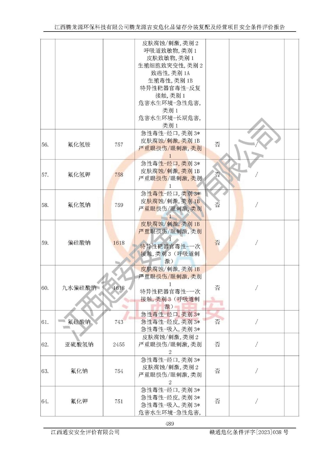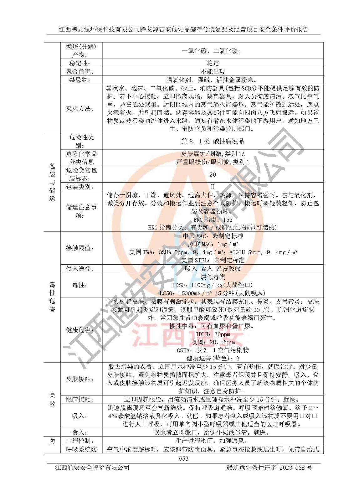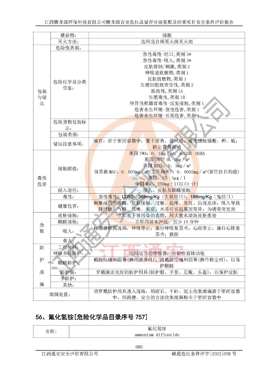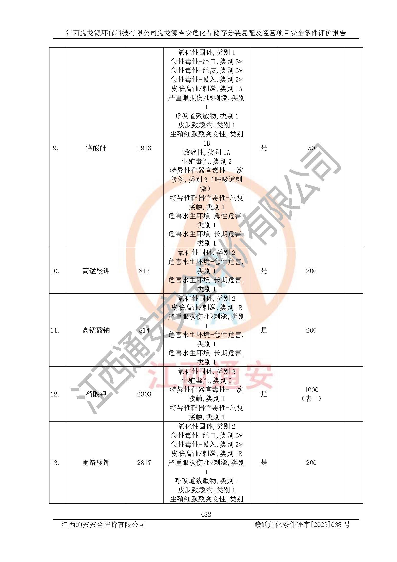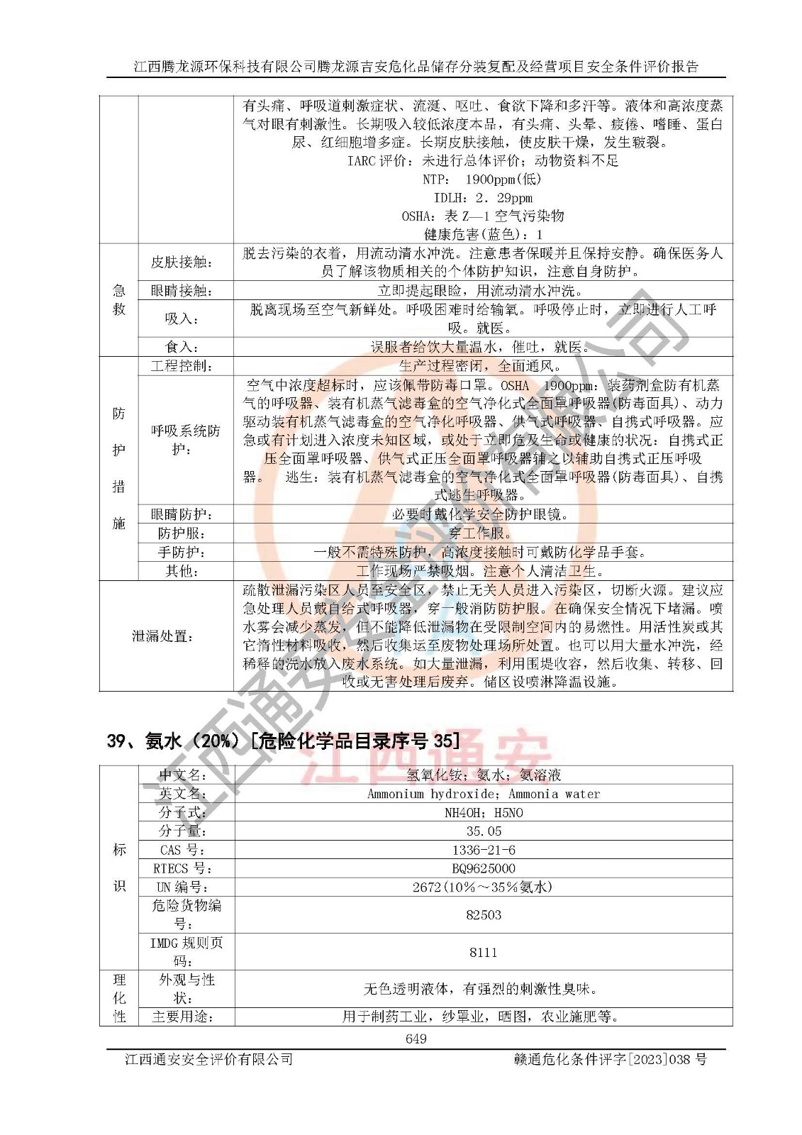 項(xiàng)目簡介 | 江西騰龍?jiān)?*科技有限公司成立于2022年6月20日,并取得吉水縣市場監(jiān)督管理局頒發(fā)的《營業(yè)執(zhí)照》,營業(yè)執(zhí)照統(tǒng)一社會信用代碼:91360822MABQK5GB5P。公司注冊住所:江西省吉安市吉水縣城西工業(yè)園區(qū)二期金龍路。法定**人:吳詩明。注冊資本壹仟萬元整。企業(yè)性質(zhì)為有限責(zé)任公司(自然人投資或控股)。營業(yè)執(zhí)照許可經(jīng)營范圍:一般項(xiàng)目:化工產(chǎn)品銷售(不含許可類化工產(chǎn)品)(除許可業(yè)務(wù)外,可自主依法經(jīng)營法律法規(guī)非禁止或限制的項(xiàng)目)。 江西騰龍?jiān)?*科技有限公司2023年2月24日取得吉水縣發(fā)展和改革委員會頒發(fā)的《江西省企業(yè)投資項(xiàng)目備案通知書》,備案項(xiàng)目名稱為:騰龍?jiān)醇参;穬Υ娣盅b復(fù)配及經(jīng)營項(xiàng)目。項(xiàng)目統(tǒng)一代碼為:2302-360822-04-01-318980。項(xiàng)目總投資20000萬元,項(xiàng)目總占地面積31.34畝。 根據(jù)《危險(xiǎn)化學(xué)品目錄(2015版)》(**安監(jiān)總局等十部門公告[2015]第5號)及應(yīng)急管理部、工業(yè)和信息化部、公安部、生態(tài)環(huán)境部、交通運(yùn)輸部、農(nóng)業(yè)農(nóng)村部、衛(wèi)生健康委、市場監(jiān)管總局、鐵路局、民航局決定調(diào)整《危險(xiǎn)化學(xué)品目錄(2015版)》(應(yīng)急管理部、工業(yè)和信息化部、公安部、生態(tài)環(huán)境部、交通運(yùn)輸部、農(nóng)業(yè)農(nóng)村部、衛(wèi)生健康委、市場監(jiān)管總局、鐵路局、民航局公告2022年第8號)等文件對該項(xiàng)目生產(chǎn)過程中所涉及的化學(xué)品進(jìn)行辨識:項(xiàng)目涉及的硫酸、鹽酸、雙氧水、硝酸、氫氧化鈉(固體和溶液)、次氯酸鈉溶液、氯酸鈉、氯酸鉀、鉻酸酐、高錳酸鈉、高錳酸鉀、硝酸鉀、重鉻酸鉀、重鉻酸鈉、硝酸鈉、亞硝酸鈉、過硫酸鈉、過硫酸銨、過硫酸鉀、漂白粉、氯化亞砜、甲醇、乙醇、二甲苯、甲苯、**、天那水、乙酸、乙酸乙酯、甲醛溶液、三氯乙烯、正丁醇、異丙醇、石油醚、醋酸酐、甲基乙基酮(丁酮)、三氯甲烷、乙醚、氨水(20%)、甲酸、二氯甲烷、**苯、乙酸丁酯、氫氟酸、磷酸、硫化鈉(無水)、氫氧化鉀、氨基磺酸、三氯化鐵、九水硝酸鐵、氯化鋅、硫脲、硼酸、硫酸鎳、氯化鎳、氟化氫銨、氟化氫鉀、氟化氫鈉、偏硅酸鈉、九水偏硅酸鈉、氟硅酸鈉、亞硫酸氫鈉、氟化鈉、氟化鉀、六次甲基四胺、結(jié)晶氯化鋁、碳酸二乙酯、碳酸二甲酯、酸性清洗劑、退鍍劑、開油水、洗網(wǎng)水、污水殺菌劑(復(fù)配的次氯酸鈉溶液)、電解液等屬于危險(xiǎn)化學(xué)品。 江西騰龍?jiān)?*科技有限公司騰龍?jiān)醇参;穬Υ娣盅b復(fù)配及經(jīng)營項(xiàng)目只進(jìn)行物理混合復(fù)配、分裝等作業(yè),不涉及化學(xué)反應(yīng)過程。因此該公司?;穫}儲經(jīng)營活動需要辦理《危險(xiǎn)化學(xué)品經(jīng)營許可證》。 根據(jù)《中華人民共和國監(jiān)控化學(xué)品管理?xiàng)l例》(中華人民共和國***令**90號,經(jīng)中華人民共和國***令第588號修改)及《各類監(jiān)控化學(xué)品名錄》(中華人民共和國工業(yè)和信息化部令第52號;2020年)、《列入第三類監(jiān)控化學(xué)品的新增品種清單》**石油和化學(xué)工業(yè)局令**號等規(guī)定進(jìn)行辨識:項(xiàng)目涉及的氯化亞砜屬于第三類監(jiān)控化學(xué)品。 根據(jù)《易制毒化學(xué)品管理?xiàng)l例》(***令第445號,經(jīng)***令第653號、***第666號、***第703號修改)及附表規(guī)定、中華人民共和國公安部 中華人民共和國商務(wù)部、**衛(wèi)生和計(jì)劃生育委員會、中華人民共和國海關(guān)總署、**安全生產(chǎn)監(jiān)督管理總局、**食品藥品監(jiān)督管理總局《關(guān)于將4-苯胺基-N-苯乙基哌啶、N-苯乙基-4-哌啶酮、N-甲基-1-苯基-1-氯-2-丙胺、溴素、1-苯基-1-**5種物質(zhì)列入易制毒化學(xué)品管理的公告》(國辦函[2017]**20號)、《***辦公廳關(guān)于同意將1-苯基-2-溴-1-**和3-氧-2-苯基丁腈列入易制毒化學(xué)品品種目錄的函》(國辦函[2014]第40號)、《***辦公廳關(guān)于同意將α-苯乙酰乙酸甲酯等6種物質(zhì)列入易制毒化學(xué)品品種目錄的函》(國辦函〔2021〕58號)等進(jìn)行辨識:項(xiàng)目涉及的硫酸、鹽酸、高錳酸鉀、甲苯、**、甲基乙基酮等屬于第三類易制毒化學(xué)品;醋酸酐、三氯甲烷、乙醚等屬于第二類易制毒化學(xué)品。 根據(jù)《危險(xiǎn)化學(xué)品名錄[2015年版]》(**安監(jiān)總局等十部門[2015]第5號)進(jìn)行劇毒化學(xué)品辨識:項(xiàng)目不涉及劇毒化學(xué)品。 根據(jù)《高毒物品目錄(2003年版)》(原衛(wèi)生部衛(wèi)法監(jiān)發(fā)[2003]142號)對項(xiàng)目涉及的化學(xué)品進(jìn)行高毒物品辨識:項(xiàng)目涉及的甲醛溶液、硫酸鎳、氯化鎳、氟化氫銨、氟化氫鉀、氟化氫鈉、氟化鈉、氟化鉀、鉻酸酐、高錳酸鉀、高錳酸鈉、重鉻酸鉀、重鉻酸鈉等屬于高毒物品。 根據(jù)中華人民共和國公安部《易制爆危險(xiǎn)化學(xué)品名錄》(2017年版)中規(guī)定進(jìn)行辨識:項(xiàng)目涉及的雙氧水、硝酸、氯酸鈉、氯酸鉀、高錳酸鉀、高錳酸鈉、硝酸鉀、重鉻酸鉀、重鉻酸鈉、硝酸鈉、六次甲基四胺等屬于易