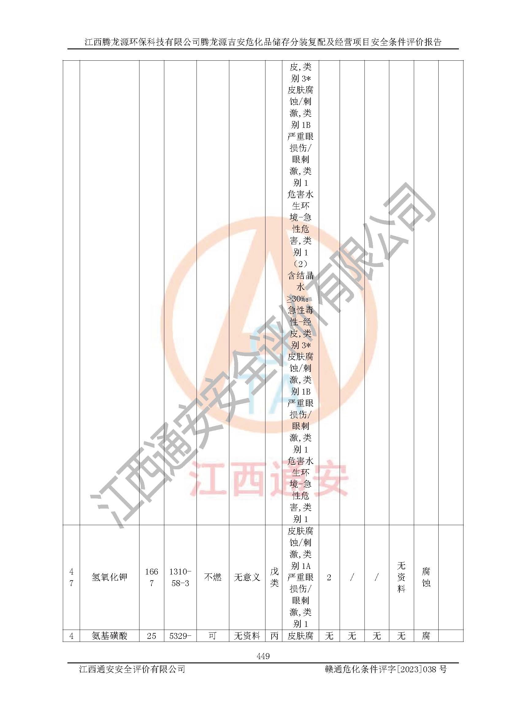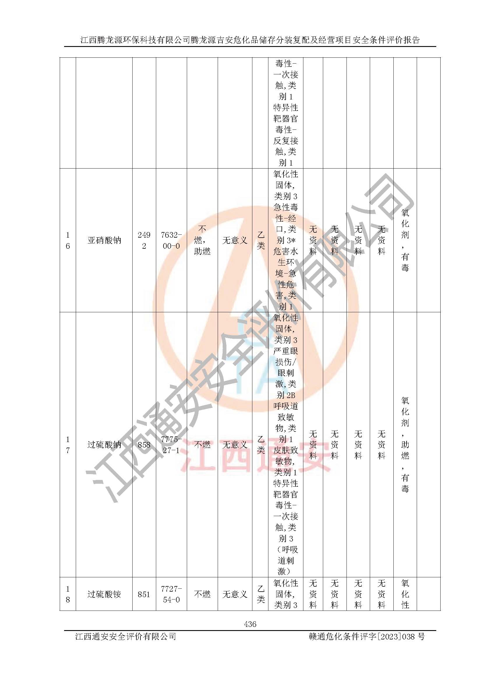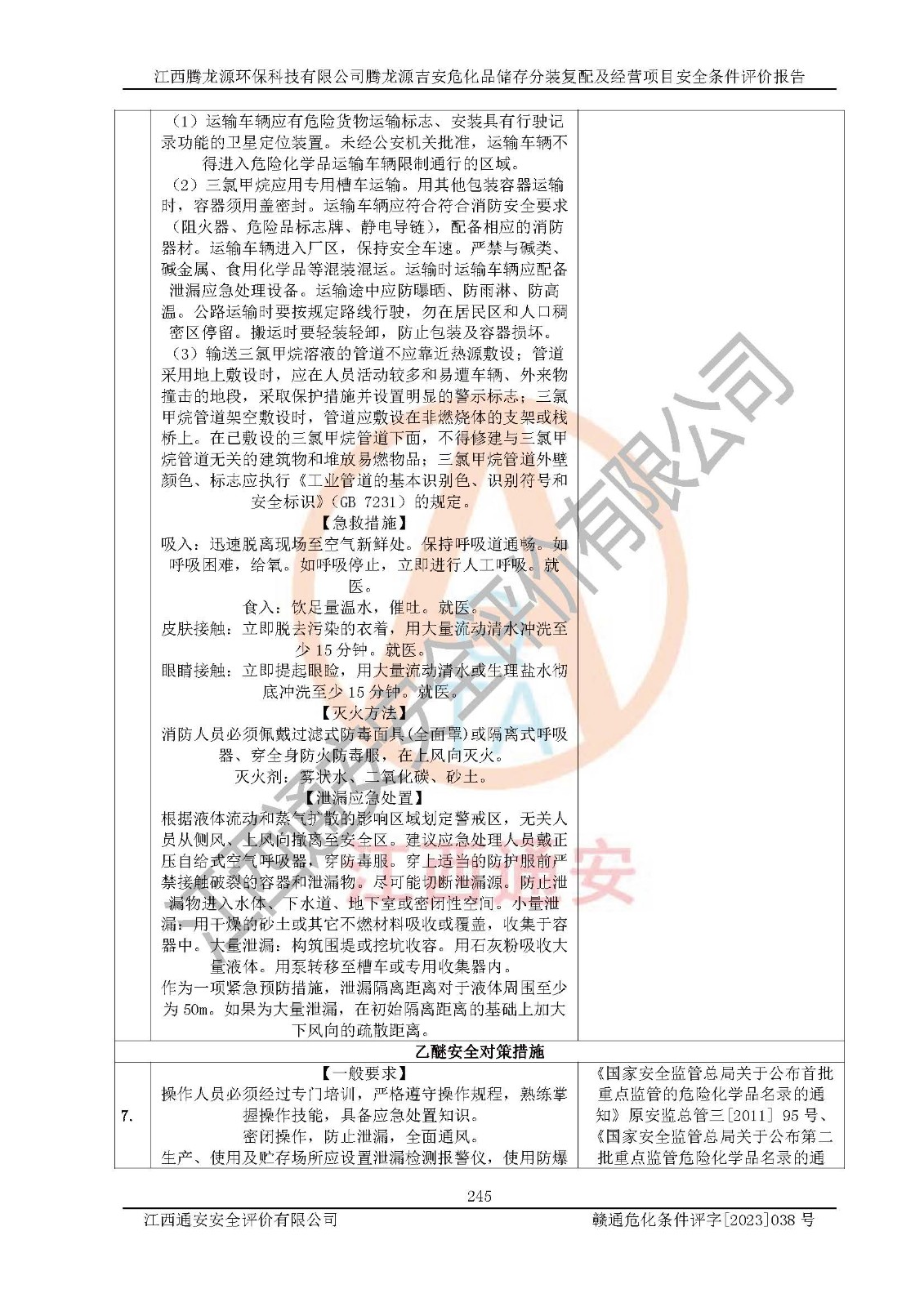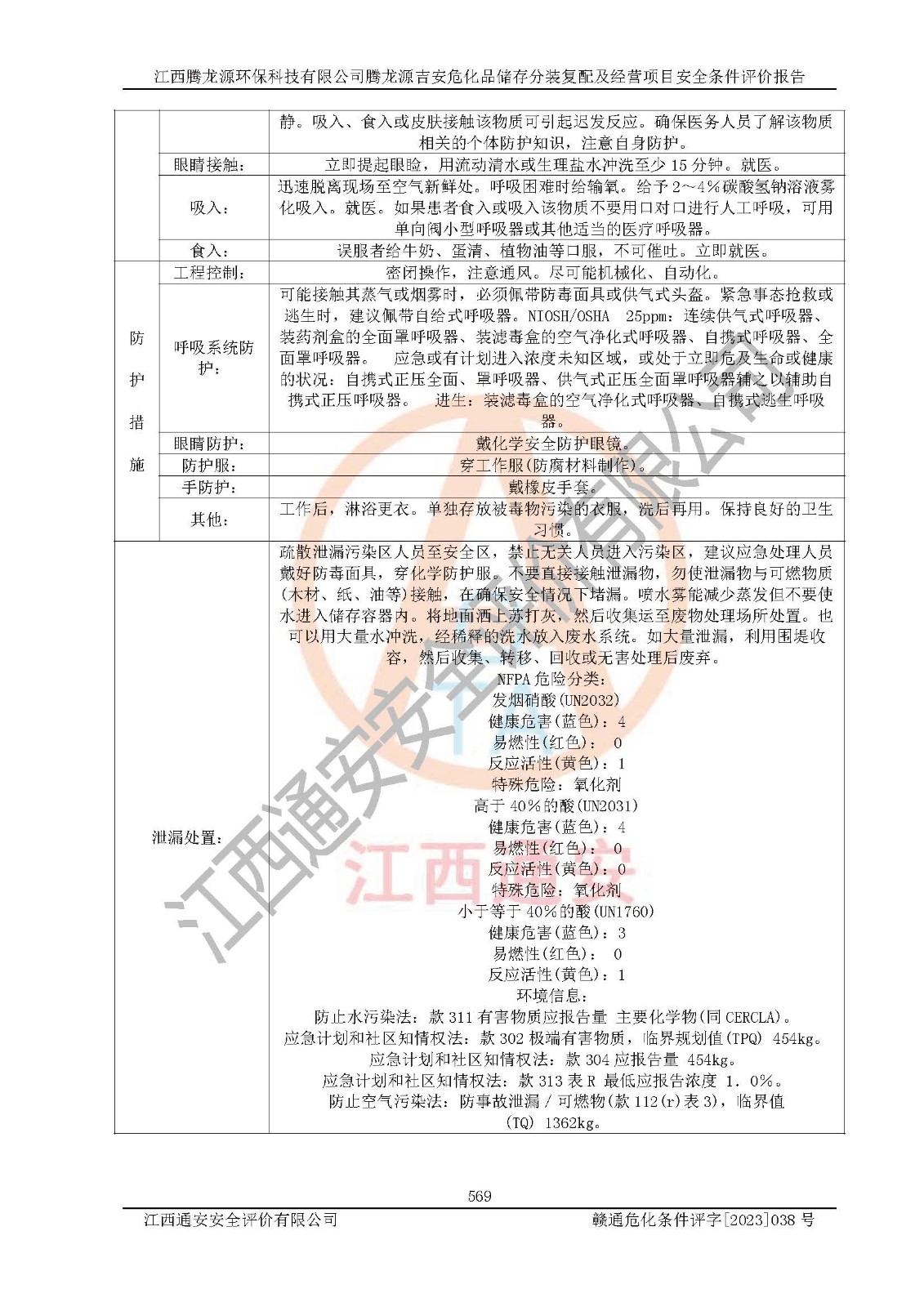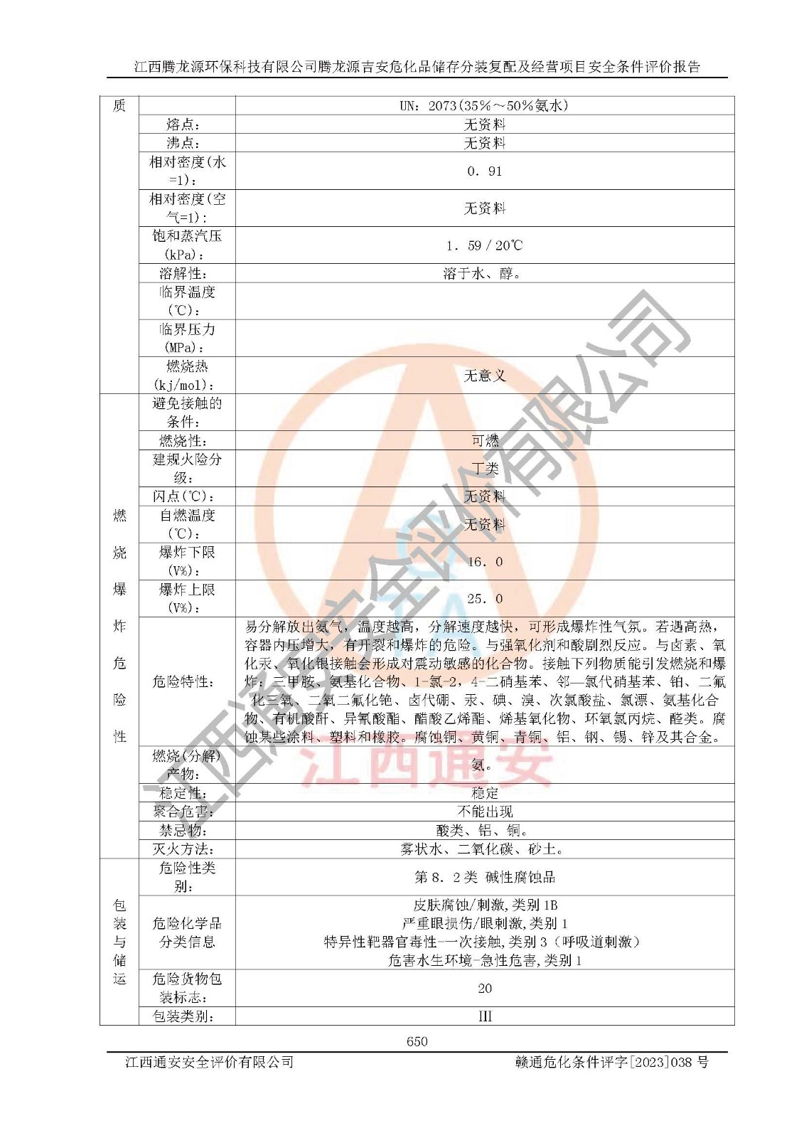 項(xiàng)目簡介 | 江西騰龍?jiān)?*科技有限公司成立于2022年6月20日,并取得吉水縣市場監(jiān)督管理局頒發(fā)的《營業(yè)執(zhí)照》,營業(yè)執(zhí)照統(tǒng)一社會信用代碼:91360822MABQK5GB5P。公司注冊住所:江西省吉安市吉水縣城西工業(yè)園區(qū)二期金龍路。法定**人:吳詩明。注冊資本壹仟萬元整。企業(yè)性質(zhì)為有限責(zé)任公司(自然人投資或控股)。營業(yè)執(zhí)照許可經(jīng)營范圍:一般項(xiàng)目:化工產(chǎn)品銷售(不含許可類化工產(chǎn)品)(除許可業(yè)務(wù)外,可自主依法經(jīng)營法律法規(guī)非禁止或限制的項(xiàng)目)。 江西騰龍?jiān)?*科技有限公司2023年2月24日取得吉水縣發(fā)展和改革委員會頒發(fā)的《江西省企業(yè)投資項(xiàng)目備案通知書》,備案項(xiàng)目名稱為:騰龍?jiān)醇参;穬Υ娣盅b復(fù)配及經(jīng)營項(xiàng)目。項(xiàng)目統(tǒng)一代碼為:2302-360822-04-01-318980。項(xiàng)目總投資20000萬元,項(xiàng)目總占地面積31.34畝。 根據(jù)《危險(xiǎn)化學(xué)品目錄(2015版)》(**安監(jiān)總局等十部門公告[2015]第5號)及應(yīng)急管理部、工業(yè)和信息化部、公安部、生態(tài)環(huán)境部、交通運(yùn)輸部、農(nóng)業(yè)農(nóng)村部、衛(wèi)生健康委、市場監(jiān)管總局、鐵路局、民航局決定調(diào)整《危險(xiǎn)化學(xué)品目錄(2015版)》(應(yīng)急管理部、工業(yè)和信息化部、公安部、生態(tài)環(huán)境部、交通運(yùn)輸部、農(nóng)業(yè)農(nóng)村部、衛(wèi)生健康委、市場監(jiān)管總局、鐵路局、民航局公告2022年第8號)等文件對該項(xiàng)目生產(chǎn)過程中所涉及的化學(xué)品進(jìn)行辨識:項(xiàng)目涉及的硫酸、鹽酸、雙氧水、硝酸、氫氧化鈉(固體和溶液)、次氯酸鈉溶液、氯酸鈉、氯酸鉀、鉻酸酐、高錳酸鈉、高錳酸鉀、硝酸鉀、重鉻酸鉀、重鉻酸鈉、硝酸鈉、亞硝酸鈉、過硫酸鈉、過硫酸銨、過硫酸鉀、漂白粉、氯化亞砜、甲醇、乙醇、二甲苯、甲苯、**、天那水、乙酸、乙酸乙酯、甲醛溶液、三氯乙烯、正丁醇、異丙醇、石油醚、醋酸酐、甲基乙基酮(丁酮)、三氯甲烷、乙醚、氨水(20%)、甲酸、二氯甲烷、**苯、乙酸丁酯、氫氟酸、磷酸、硫化鈉(無水)、氫氧化鉀、氨基磺酸、三氯化鐵、九水硝酸鐵、氯化鋅、硫脲、硼酸、硫酸鎳、氯化鎳、氟化氫銨、氟化氫鉀、氟化氫鈉、偏硅酸鈉、九水偏硅酸鈉、氟硅酸鈉、亞硫酸氫鈉、氟化鈉、氟化鉀、六次甲基四胺、結(jié)晶氯化鋁、碳酸二乙酯、碳酸二甲酯、酸性清洗劑、退鍍劑、開油水、洗網(wǎng)水、污水殺菌劑(復(fù)配的次氯酸鈉溶液)、電解液等屬于危險(xiǎn)化學(xué)品。 江西騰龍?jiān)?*科技有限公司騰龍?jiān)醇参;穬Υ娣盅b復(fù)配及經(jīng)營項(xiàng)目只進(jìn)行物理混合復(fù)配、分裝等作業(yè),不涉及化學(xué)反應(yīng)過程。因此該公司?;穫}儲經(jīng)營活動需要辦理《危險(xiǎn)化學(xué)品經(jīng)營許可證》。 根據(jù)《中華人民共和國監(jiān)控化學(xué)品管理?xiàng)l例》(中華人民共和國***令**90號,經(jīng)中華人民共和國***令第588號修改)及《各類監(jiān)控化學(xué)品名錄》(中華人民共和國工業(yè)和信息化部令第52號;2020年)、《列入第三類監(jiān)控化學(xué)品的新增品種清單》**石油和化學(xué)工業(yè)局令**號等規(guī)定進(jìn)行辨識:項(xiàng)目涉及的氯化亞砜屬于第三類監(jiān)控化學(xué)品。 根據(jù)《易制毒化學(xué)品管理?xiàng)l例》(***令第445號,經(jīng)***令第653號、***第666號、***第703號修改)及附表規(guī)定、中華人民共和國公安部 中華人民共和國商務(wù)部、**衛(wèi)生和計(jì)劃生育委員會、中華人民共和國海關(guān)總署、**安全生產(chǎn)監(jiān)督管理總局、**食品藥品監(jiān)督管理總局《關(guān)于將4-苯胺基-N-苯乙基哌啶、N-苯乙基-4-哌啶酮、N-甲基-1-苯基-1-氯-2-丙胺、溴素、1-苯基-1-**5種物質(zhì)列入易制毒化學(xué)品管理的公告》(國辦函[2017]**20號)、《***辦公廳關(guān)于同意將1-苯基-2-溴-1-**和3-氧-2-苯基丁腈列入易制毒化學(xué)品品種目錄的函》(國辦函[2014]第40號)、《***辦公廳關(guān)于同意將α-苯乙酰乙酸甲酯等6種物質(zhì)列入易制毒化學(xué)品品種目錄的函》(國辦函〔2021〕58號)等進(jìn)行辨識:項(xiàng)目涉及的硫酸、鹽酸、高錳酸鉀、甲苯、**、甲基乙基酮等屬于第三類易制毒化學(xué)品;醋酸酐、三氯甲烷、乙醚等屬于第二類易制毒化學(xué)品。 根據(jù)《危險(xiǎn)化學(xué)品名錄[2015年版]》(**安監(jiān)總局等十部門[2015]第5號)進(jìn)行劇毒化學(xué)品辨識:項(xiàng)目不涉及劇毒化學(xué)品。 根據(jù)《高毒物品目錄(2003年版)》(原衛(wèi)生部衛(wèi)法監(jiān)發(fā)[2003]142號)對項(xiàng)目涉及的化學(xué)品進(jìn)行高毒物品辨識:項(xiàng)目涉及的甲醛溶液、硫酸鎳、氯化鎳、氟化氫銨、氟化氫鉀、氟化氫鈉、氟化鈉、氟化鉀、鉻酸酐、高錳酸鉀、高錳酸鈉、重鉻酸鉀、重鉻酸鈉等屬于高毒物品。 根據(jù)中華人民共和國公安部《易制爆危險(xiǎn)化學(xué)品名錄》(2017年版)中規(guī)定進(jìn)行辨識:項(xiàng)目涉及的雙氧水、硝酸、氯酸鈉、氯酸鉀、高錳酸鉀、高錳酸鈉、硝酸鉀、重鉻酸鉀、重鉻酸鈉、硝酸鈉、六次甲基四胺等屬于易