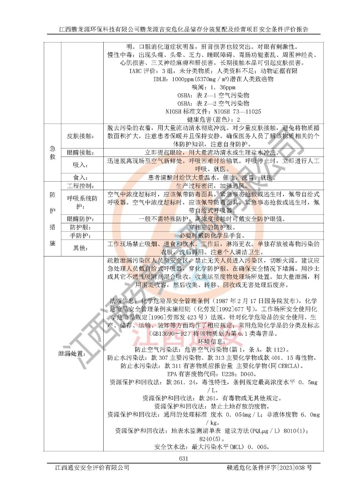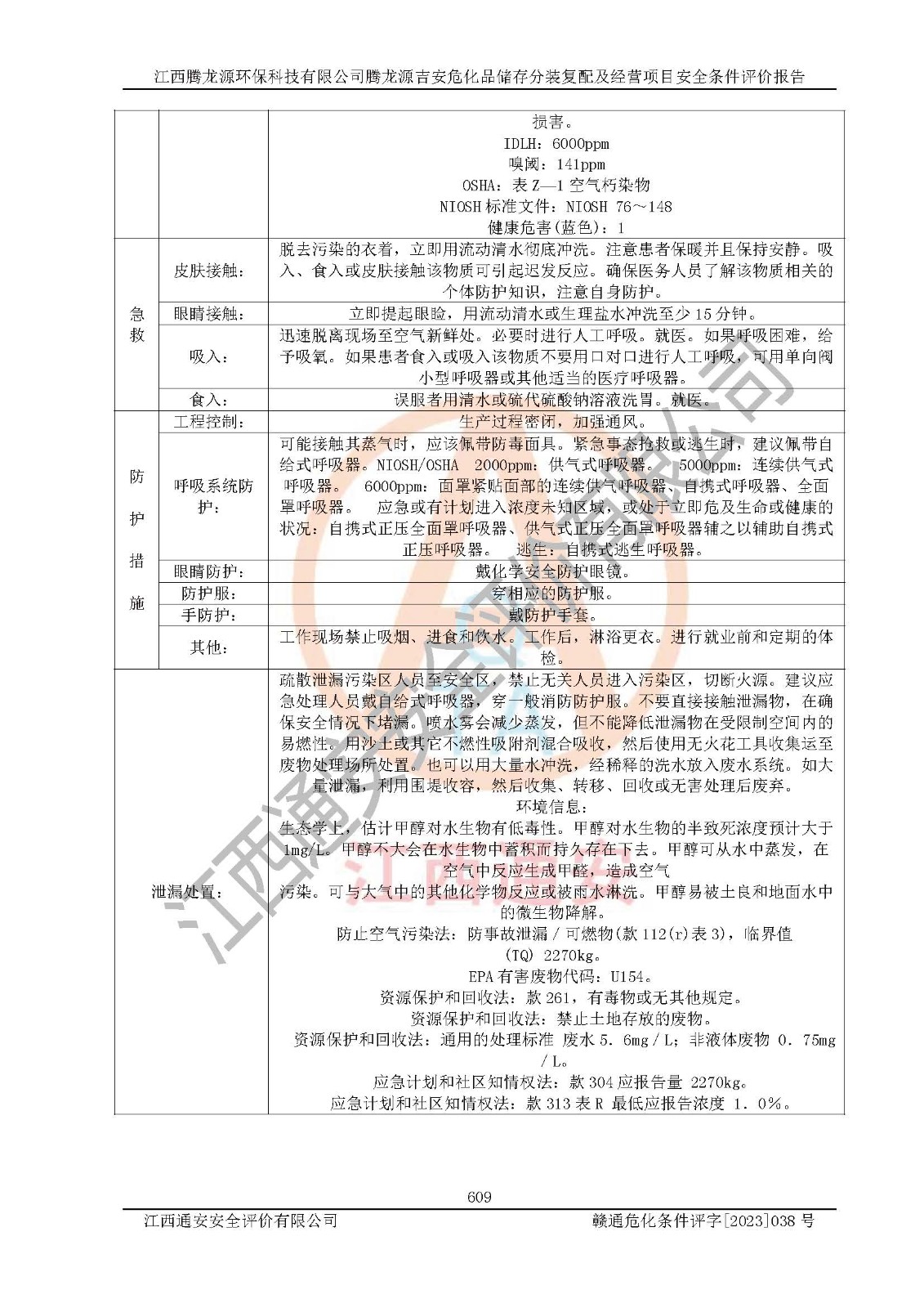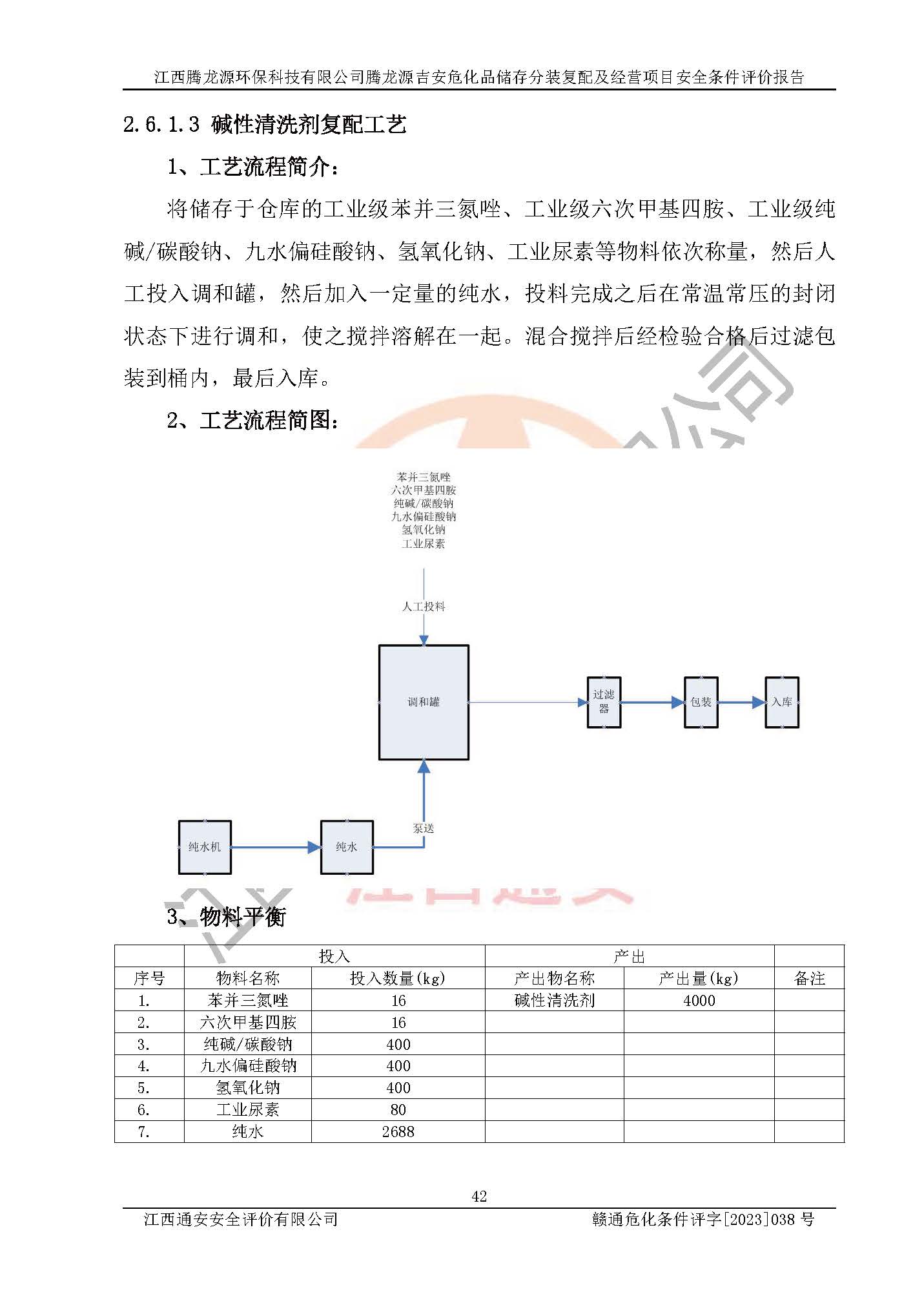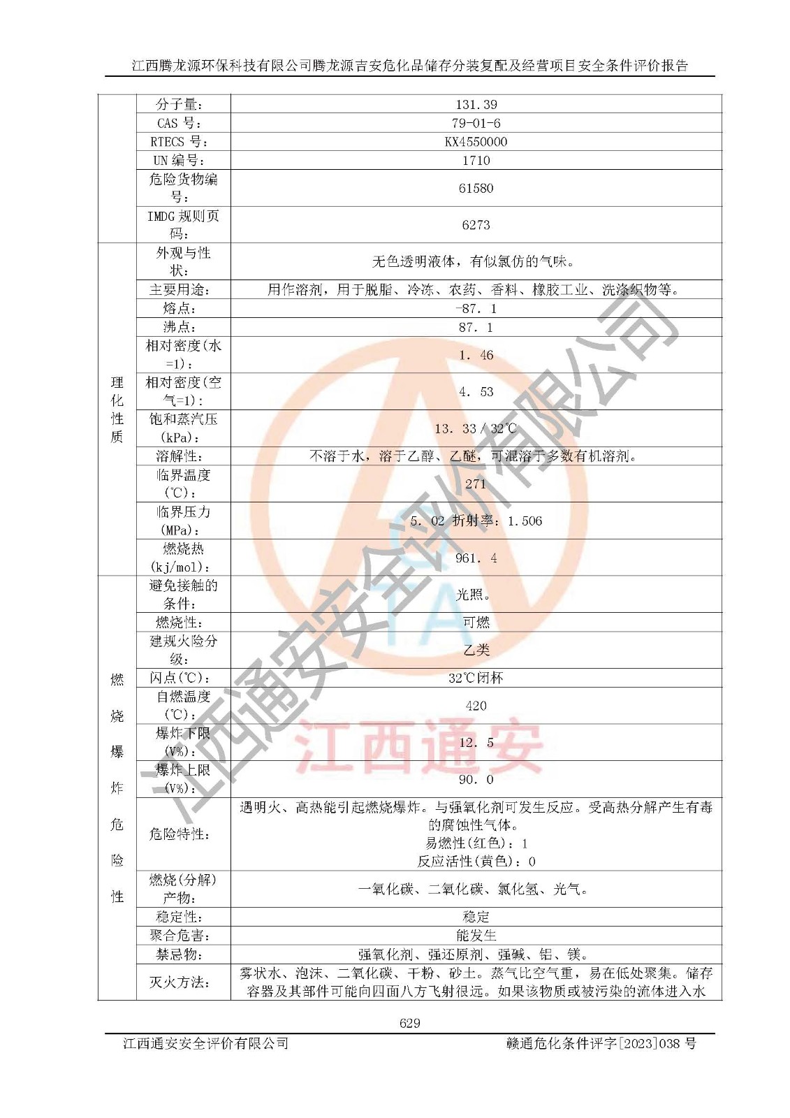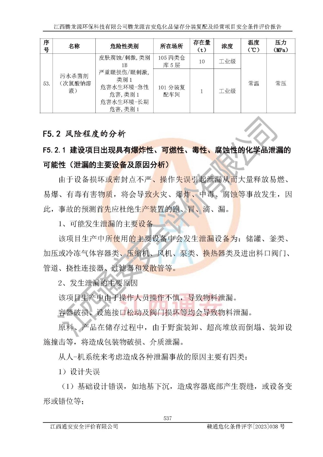 項(xiàng)目簡介 | 江西騰龍?jiān)?*科技有限公司成立于2022年6月20日,并取得吉水縣市場監(jiān)督管理局頒發(fā)的《營業(yè)執(zhí)照》,營業(yè)執(zhí)照統(tǒng)一社會信用代碼:91360822MABQK5GB5P。公司注冊住所:江西省吉安市吉水縣城西工業(yè)園區(qū)二期金龍路。法定**人:吳詩明。注冊資本壹仟萬元整。企業(yè)性質(zhì)為有限責(zé)任公司(自然人投資或控股)。營業(yè)執(zhí)照許可經(jīng)營范圍:一般項(xiàng)目:化工產(chǎn)品銷售(不含許可類化工產(chǎn)品)(除許可業(yè)務(wù)外,可自主依法經(jīng)營法律法規(guī)非禁止或限制的項(xiàng)目)。 江西騰龍?jiān)?*科技有限公司2023年2月24日取得吉水縣發(fā)展和改革委員會頒發(fā)的《江西省企業(yè)投資項(xiàng)目備案通知書》,備案項(xiàng)目名稱為:騰龍?jiān)醇参;穬Υ娣盅b復(fù)配及經(jīng)營項(xiàng)目。項(xiàng)目統(tǒng)一代碼為:2302-360822-04-01-318980。項(xiàng)目總投資20000萬元,項(xiàng)目總占地面積31.34畝。 根據(jù)《危險(xiǎn)化學(xué)品目錄(2015版)》(**安監(jiān)總局等十部門公告[2015]第5號)及應(yīng)急管理部、工業(yè)和信息化部、公安部、生態(tài)環(huán)境部、交通運(yùn)輸部、農(nóng)業(yè)農(nóng)村部、衛(wèi)生健康委、市場監(jiān)管總局、鐵路局、民航局決定調(diào)整《危險(xiǎn)化學(xué)品目錄(2015版)》(應(yīng)急管理部、工業(yè)和信息化部、公安部、生態(tài)環(huán)境部、交通運(yùn)輸部、農(nóng)業(yè)農(nóng)村部、衛(wèi)生健康委、市場監(jiān)管總局、鐵路局、民航局公告2022年第8號)等文件對該項(xiàng)目生產(chǎn)過程中所涉及的化學(xué)品進(jìn)行辨識:項(xiàng)目涉及的硫酸、鹽酸、雙氧水、硝酸、氫氧化鈉(固體和溶液)、次氯酸鈉溶液、氯酸鈉、氯酸鉀、鉻酸酐、高錳酸鈉、高錳酸鉀、硝酸鉀、重鉻酸鉀、重鉻酸鈉、硝酸鈉、亞硝酸鈉、過硫酸鈉、過硫酸銨、過硫酸鉀、漂白粉、氯化亞砜、甲醇、乙醇、二甲苯、甲苯、**、天那水、乙酸、乙酸乙酯、甲醛溶液、三氯乙烯、正丁醇、異丙醇、石油醚、醋酸酐、甲基乙基酮(丁酮)、三氯甲烷、乙醚、氨水(20%)、甲酸、二氯甲烷、**苯、乙酸丁酯、氫氟酸、磷酸、硫化鈉(無水)、氫氧化鉀、氨基磺酸、三氯化鐵、九水硝酸鐵、氯化鋅、硫脲、硼酸、硫酸鎳、氯化鎳、氟化氫銨、氟化氫鉀、氟化氫鈉、偏硅酸鈉、九水偏硅酸鈉、氟硅酸鈉、亞硫酸氫鈉、氟化鈉、氟化鉀、六次甲基四胺、結(jié)晶氯化鋁、碳酸二乙酯、碳酸二甲酯、酸性清洗劑、退鍍劑、開油水、洗網(wǎng)水、污水殺菌劑(復(fù)配的次氯酸鈉溶液)、電解液等屬于危險(xiǎn)化學(xué)品。 江西騰龍?jiān)?*科技有限公司騰龍?jiān)醇参;穬Υ娣盅b復(fù)配及經(jīng)營項(xiàng)目只進(jìn)行物理混合復(fù)配、分裝等作業(yè),不涉及化學(xué)反應(yīng)過程。因此該公司?;穫}儲經(jīng)營活動需要辦理《危險(xiǎn)化學(xué)品經(jīng)營許可證》。 根據(jù)《中華人民共和國監(jiān)控化學(xué)品管理?xiàng)l例》(中華人民共和國***令**90號,經(jīng)中華人民共和國***令第588號修改)及《各類監(jiān)控化學(xué)品名錄》(中華人民共和國工業(yè)和信息化部令第52號;2020年)、《列入第三類監(jiān)控化學(xué)品的新增品種清單》**石油和化學(xué)工業(yè)局令**號等規(guī)定進(jìn)行辨識:項(xiàng)目涉及的氯化亞砜屬于第三類監(jiān)控化學(xué)品。 根據(jù)《易制毒化學(xué)品管理?xiàng)l例》(***令第445號,經(jīng)***令第653號、***第666號、***第703號修改)及附表規(guī)定、中華人民共和國公安部 中華人民共和國商務(wù)部、**衛(wèi)生和計(jì)劃生育委員會、中華人民共和國海關(guān)總署、**安全生產(chǎn)監(jiān)督管理總局、**食品藥品監(jiān)督管理總局《關(guān)于將4-苯胺基-N-苯乙基哌啶、N-苯乙基-4-哌啶酮、N-甲基-1-苯基-1-氯-2-丙胺、溴素、1-苯基-1-**5種物質(zhì)列入易制毒化學(xué)品管理的公告》(國辦函[2017]**20號)、《***辦公廳關(guān)于同意將1-苯基-2-溴-1-**和3-氧-2-苯基丁腈列入易制毒化學(xué)品品種目錄的函》(國辦函[2014]第40號)、《***辦公廳關(guān)于同意將α-苯乙酰乙酸甲酯等6種物質(zhì)列入易制毒化學(xué)品品種目錄的函》(國辦函〔2021〕58號)等進(jìn)行辨識:項(xiàng)目涉及的硫酸、鹽酸、高錳酸鉀、甲苯、**、甲基乙基酮等屬于第三類易制毒化學(xué)品;醋酸酐、三氯甲烷、乙醚等屬于第二類易制毒化學(xué)品。 根據(jù)《危險(xiǎn)化學(xué)品名錄[2015年版]》(**安監(jiān)總局等十部門[2015]第5號)進(jìn)行劇毒化學(xué)品辨識:項(xiàng)目不涉及劇毒化學(xué)品。 根據(jù)《高毒物品目錄(2003年版)》(原衛(wèi)生部衛(wèi)法監(jiān)發(fā)[2003]142號)對項(xiàng)目涉及的化學(xué)品進(jìn)行高毒物品辨識:項(xiàng)目涉及的甲醛溶液、硫酸鎳、氯化鎳、氟化氫銨、氟化氫鉀、氟化氫鈉、氟化鈉、氟化鉀、鉻酸酐、高錳酸鉀、高錳酸鈉、重鉻酸鉀、重鉻酸鈉等屬于高毒物品。 根據(jù)中華人民共和國公安部《易制爆危險(xiǎn)化學(xué)品名錄》(2017年版)中規(guī)定進(jìn)行辨識:項(xiàng)目涉及的雙氧水、硝酸、氯酸鈉、氯酸鉀、高錳酸鉀、高錳酸鈉、硝酸鉀、重鉻酸鉀、重鉻酸鈉、硝酸鈉、六次甲基四胺等屬于易
