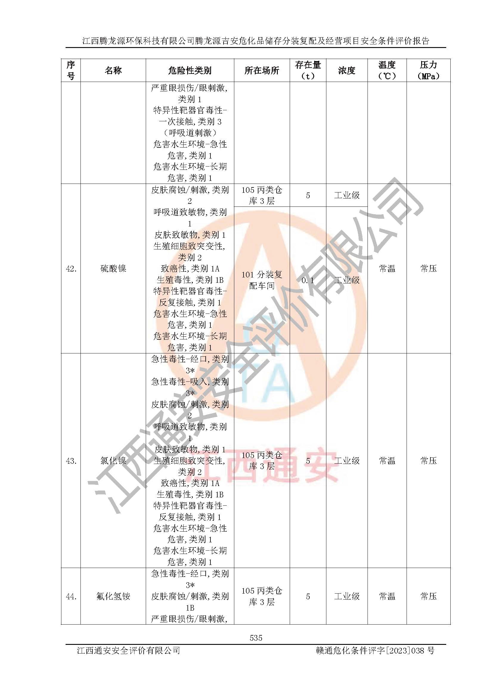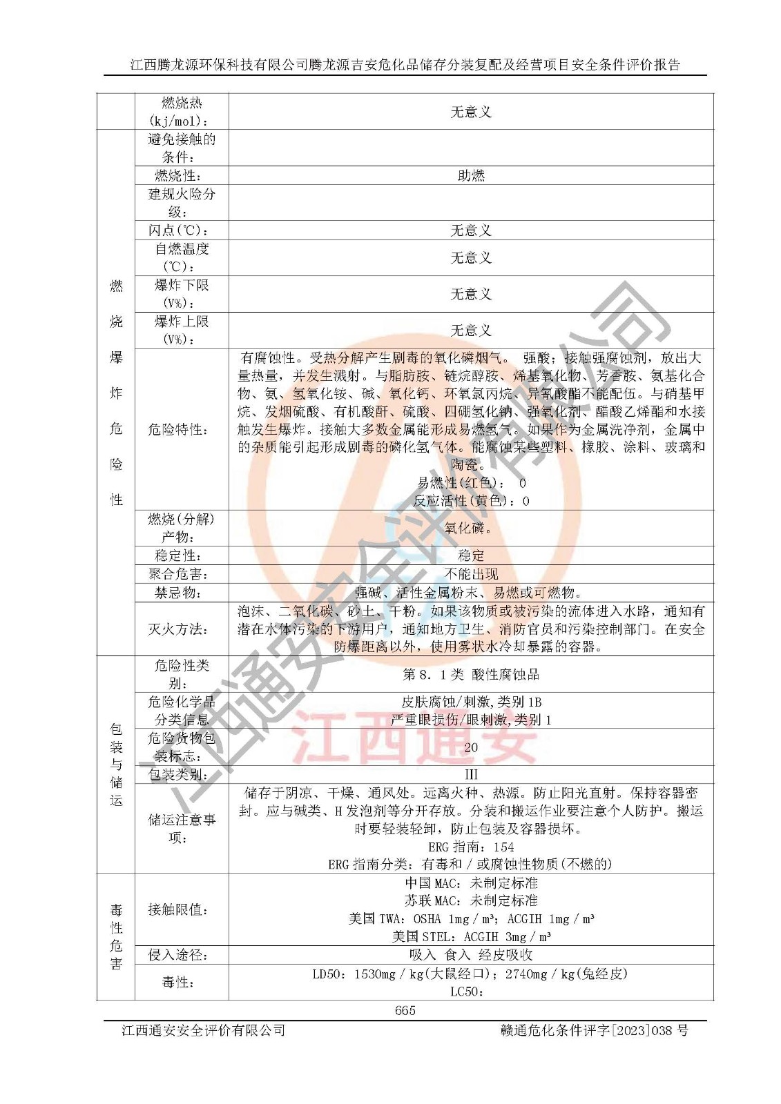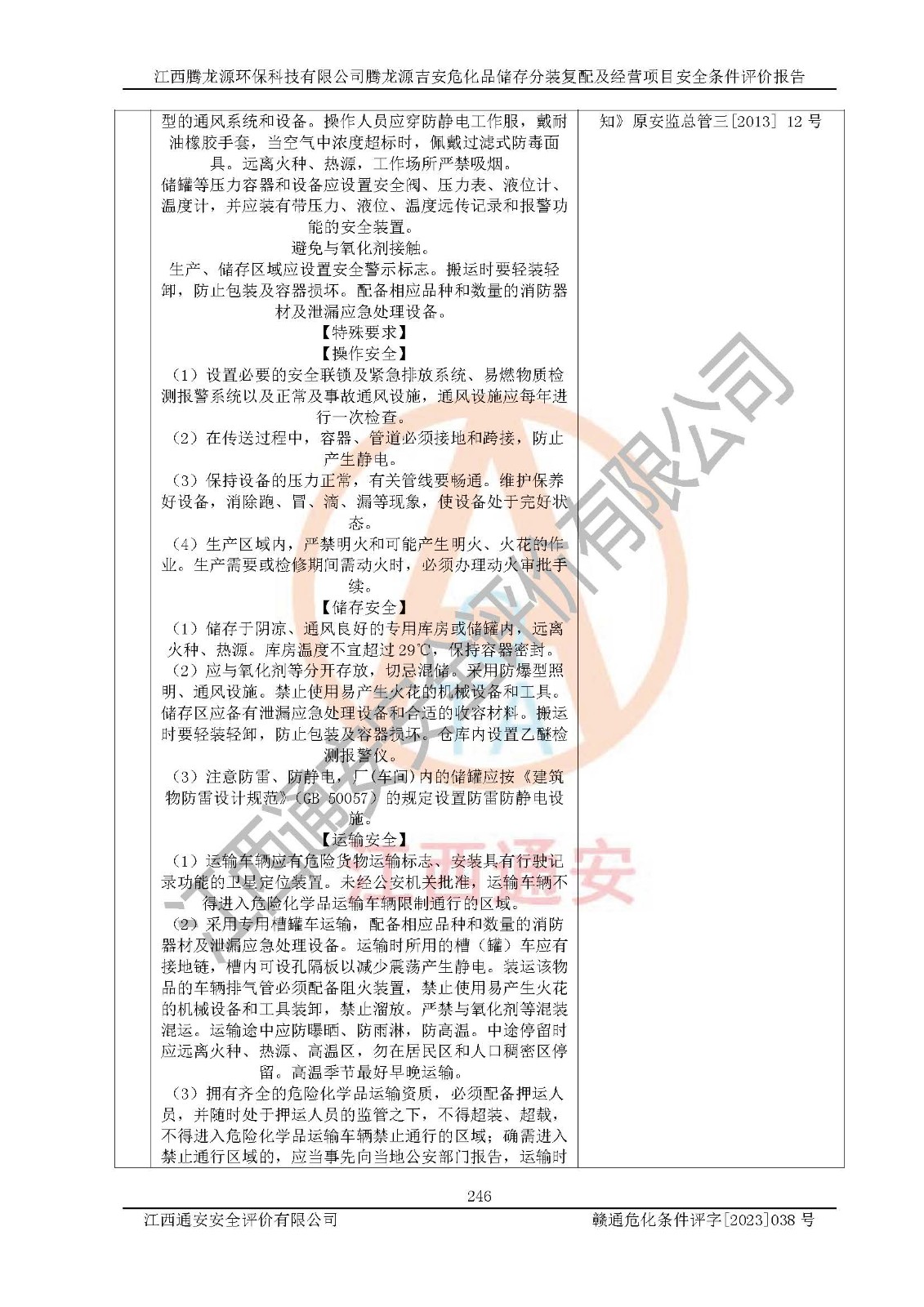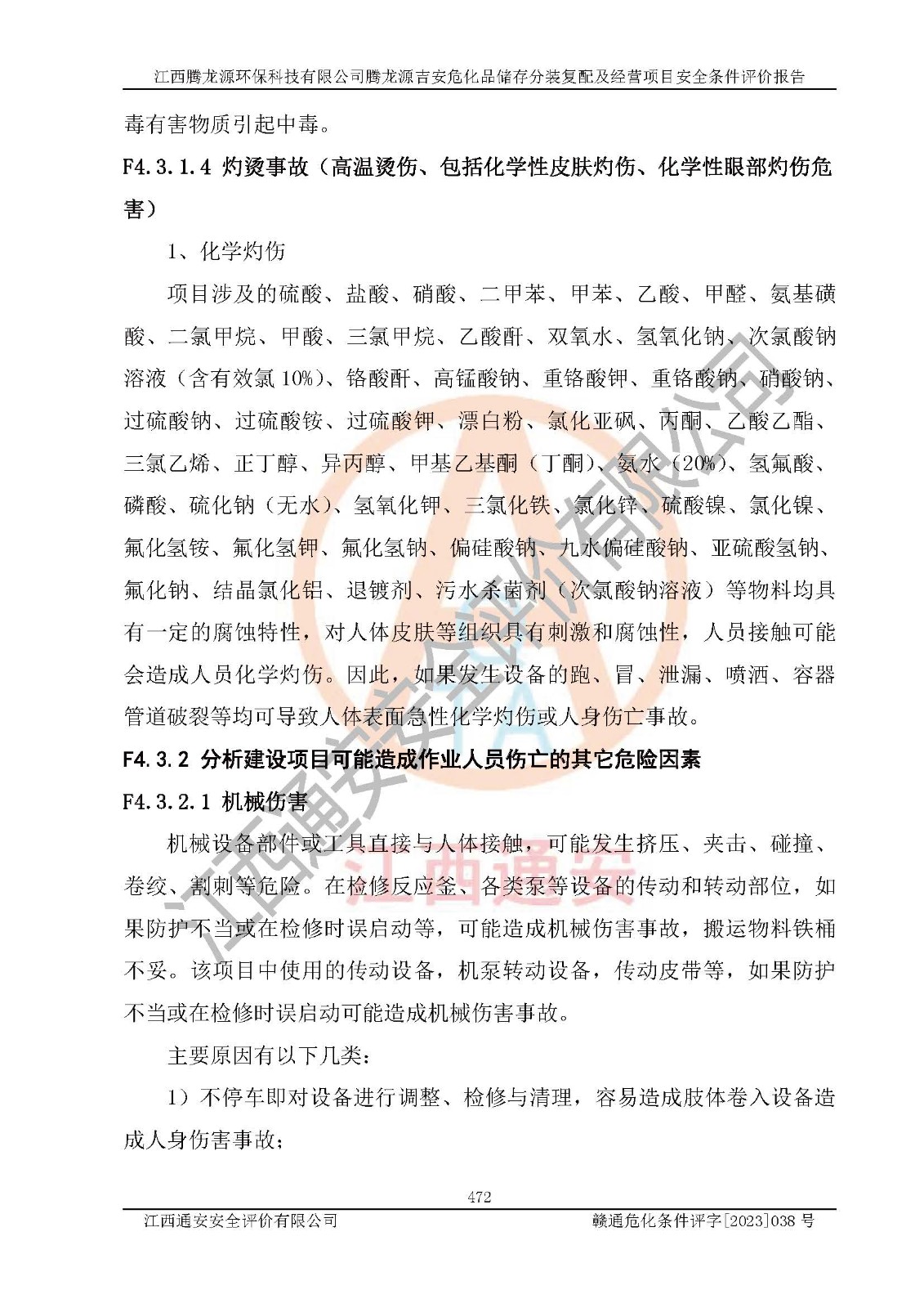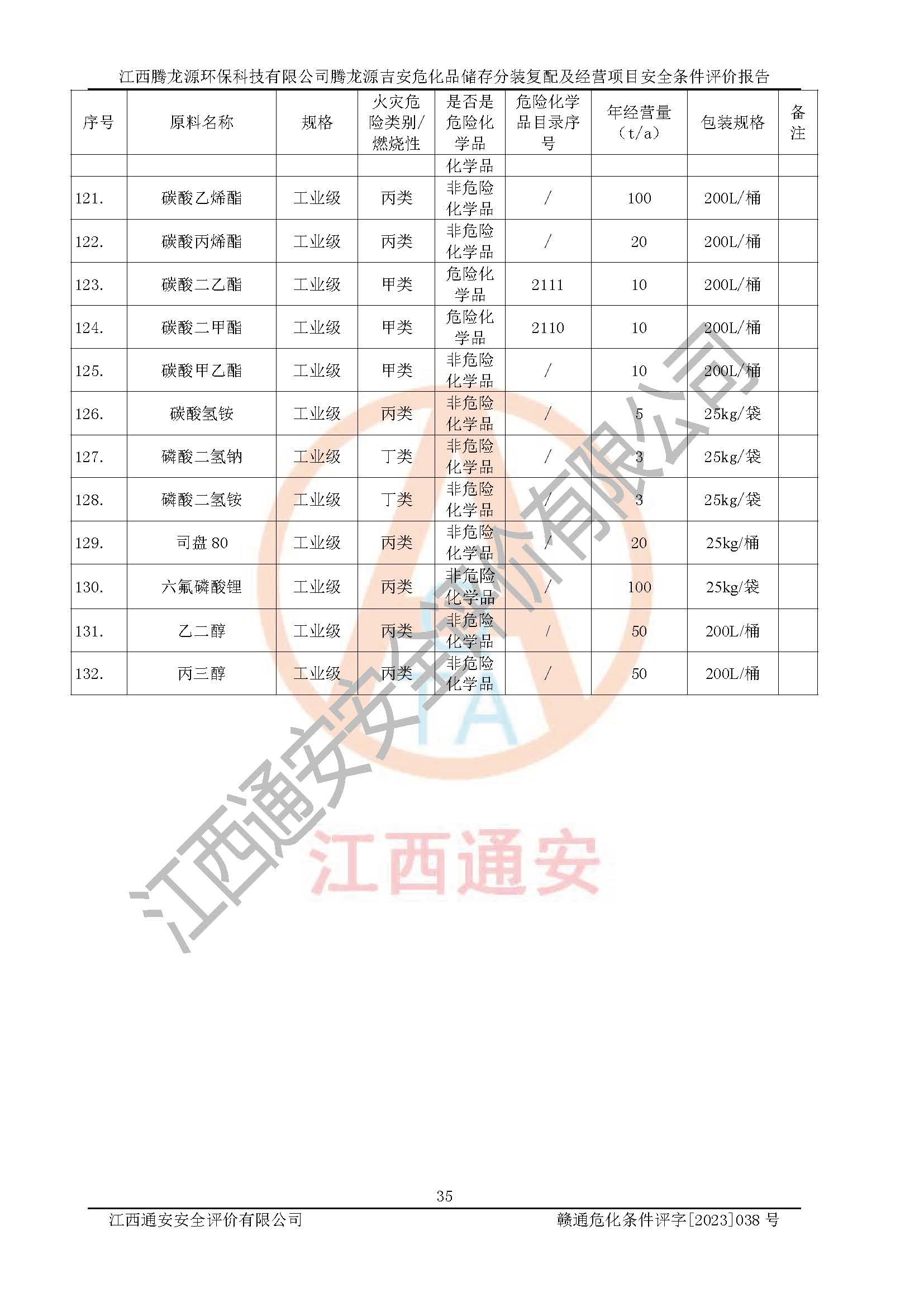 項(xiàng)目簡介 | 江西騰龍?jiān)?*科技有限公司成立于2022年6月20日,并取得吉水縣市場監(jiān)督管理局頒發(fā)的《營業(yè)執(zhí)照》,營業(yè)執(zhí)照統(tǒng)一社會信用代碼:91360822MABQK5GB5P。公司注冊住所:江西省吉安市吉水縣城西工業(yè)園區(qū)二期金龍路。法定**人:吳詩明。注冊資本壹仟萬元整。企業(yè)性質(zhì)為有限責(zé)任公司(自然人投資或控股)。營業(yè)執(zhí)照許可經(jīng)營范圍:一般項(xiàng)目:化工產(chǎn)品銷售(不含許可類化工產(chǎn)品)(除許可業(yè)務(wù)外,可自主依法經(jīng)營法律法規(guī)非禁止或限制的項(xiàng)目)。 江西騰龍?jiān)?*科技有限公司2023年2月24日取得吉水縣發(fā)展和改革委員會頒發(fā)的《江西省企業(yè)投資項(xiàng)目備案通知書》,備案項(xiàng)目名稱為:騰龍?jiān)醇参;穬Υ娣盅b復(fù)配及經(jīng)營項(xiàng)目。項(xiàng)目統(tǒng)一代碼為:2302-360822-04-01-318980。項(xiàng)目總投資20000萬元,項(xiàng)目總占地面積31.34畝。 根據(jù)《危險(xiǎn)化學(xué)品目錄(2015版)》(**安監(jiān)總局等十部門公告[2015]第5號)及應(yīng)急管理部、工業(yè)和信息化部、公安部、生態(tài)環(huán)境部、交通運(yùn)輸部、農(nóng)業(yè)農(nóng)村部、衛(wèi)生健康委、市場監(jiān)管總局、鐵路局、民航局決定調(diào)整《危險(xiǎn)化學(xué)品目錄(2015版)》(應(yīng)急管理部、工業(yè)和信息化部、公安部、生態(tài)環(huán)境部、交通運(yùn)輸部、農(nóng)業(yè)農(nóng)村部、衛(wèi)生健康委、市場監(jiān)管總局、鐵路局、民航局公告2022年第8號)等文件對該項(xiàng)目生產(chǎn)過程中所涉及的化學(xué)品進(jìn)行辨識:項(xiàng)目涉及的硫酸、鹽酸、雙氧水、硝酸、氫氧化鈉(固體和溶液)、次氯酸鈉溶液、氯酸鈉、氯酸鉀、鉻酸酐、高錳酸鈉、高錳酸鉀、硝酸鉀、重鉻酸鉀、重鉻酸鈉、硝酸鈉、亞硝酸鈉、過硫酸鈉、過硫酸銨、過硫酸鉀、漂白粉、氯化亞砜、甲醇、乙醇、二甲苯、甲苯、**、天那水、乙酸、乙酸乙酯、甲醛溶液、三氯乙烯、正丁醇、異丙醇、石油醚、醋酸酐、甲基乙基酮(丁酮)、三氯甲烷、乙醚、氨水(20%)、甲酸、二氯甲烷、**苯、乙酸丁酯、氫氟酸、磷酸、硫化鈉(無水)、氫氧化鉀、氨基磺酸、三氯化鐵、九水硝酸鐵、氯化鋅、硫脲、硼酸、硫酸鎳、氯化鎳、氟化氫銨、氟化氫鉀、氟化氫鈉、偏硅酸鈉、九水偏硅酸鈉、氟硅酸鈉、亞硫酸氫鈉、氟化鈉、氟化鉀、六次甲基四胺、結(jié)晶氯化鋁、碳酸二乙酯、碳酸二甲酯、酸性清洗劑、退鍍劑、開油水、洗網(wǎng)水、污水殺菌劑(復(fù)配的次氯酸鈉溶液)、電解液等屬于危險(xiǎn)化學(xué)品。 江西騰龍?jiān)?*科技有限公司騰龍?jiān)醇参;穬Υ娣盅b復(fù)配及經(jīng)營項(xiàng)目只進(jìn)行物理混合復(fù)配、分裝等作業(yè),不涉及化學(xué)反應(yīng)過程。因此該公司?;穫}儲經(jīng)營活動需要辦理《危險(xiǎn)化學(xué)品經(jīng)營許可證》。 根據(jù)《中華人民共和國監(jiān)控化學(xué)品管理?xiàng)l例》(中華人民共和國***令**90號,經(jīng)中華人民共和國***令第588號修改)及《各類監(jiān)控化學(xué)品名錄》(中華人民共和國工業(yè)和信息化部令第52號;2020年)、《列入第三類監(jiān)控化學(xué)品的新增品種清單》**石油和化學(xué)工業(yè)局令**號等規(guī)定進(jìn)行辨識:項(xiàng)目涉及的氯化亞砜屬于第三類監(jiān)控化學(xué)品。 根據(jù)《易制毒化學(xué)品管理?xiàng)l例》(***令第445號,經(jīng)***令第653號、***第666號、***第703號修改)及附表規(guī)定、中華人民共和國公安部 中華人民共和國商務(wù)部、**衛(wèi)生和計(jì)劃生育委員會、中華人民共和國海關(guān)總署、**安全生產(chǎn)監(jiān)督管理總局、**食品藥品監(jiān)督管理總局《關(guān)于將4-苯胺基-N-苯乙基哌啶、N-苯乙基-4-哌啶酮、N-甲基-1-苯基-1-氯-2-丙胺、溴素、1-苯基-1-**5種物質(zhì)列入易制毒化學(xué)品管理的公告》(國辦函[2017]**20號)、《***辦公廳關(guān)于同意將1-苯基-2-溴-1-**和3-氧-2-苯基丁腈列入易制毒化學(xué)品品種目錄的函》(國辦函[2014]第40號)、《***辦公廳關(guān)于同意將α-苯乙酰乙酸甲酯等6種物質(zhì)列入易制毒化學(xué)品品種目錄的函》(國辦函〔2021〕58號)等進(jìn)行辨識:項(xiàng)目涉及的硫酸、鹽酸、高錳酸鉀、甲苯、**、甲基乙基酮等屬于第三類易制毒化學(xué)品;醋酸酐、三氯甲烷、乙醚等屬于第二類易制毒化學(xué)品。 根據(jù)《危險(xiǎn)化學(xué)品名錄[2015年版]》(**安監(jiān)總局等十部門[2015]第5號)進(jìn)行劇毒化學(xué)品辨識:項(xiàng)目不涉及劇毒化學(xué)品。 根據(jù)《高毒物品目錄(2003年版)》(原衛(wèi)生部衛(wèi)法監(jiān)發(fā)[2003]142號)對項(xiàng)目涉及的化學(xué)品進(jìn)行高毒物品辨識:項(xiàng)目涉及的甲醛溶液、硫酸鎳、氯化鎳、氟化氫銨、氟化氫鉀、氟化氫鈉、氟化鈉、氟化鉀、鉻酸酐、高錳酸鉀、高錳酸鈉、重鉻酸鉀、重鉻酸鈉等屬于高毒物品。 根據(jù)中華人民共和國公安部《易制爆危險(xiǎn)化學(xué)品名錄》(2017年版)中規(guī)定進(jìn)行辨識:項(xiàng)目涉及的雙氧水、硝酸、氯酸鈉、氯酸鉀、高錳酸鉀、高錳酸鈉、硝酸鉀、重鉻酸鉀、重鉻酸鈉、硝酸鈉、六次甲基四胺等屬于易