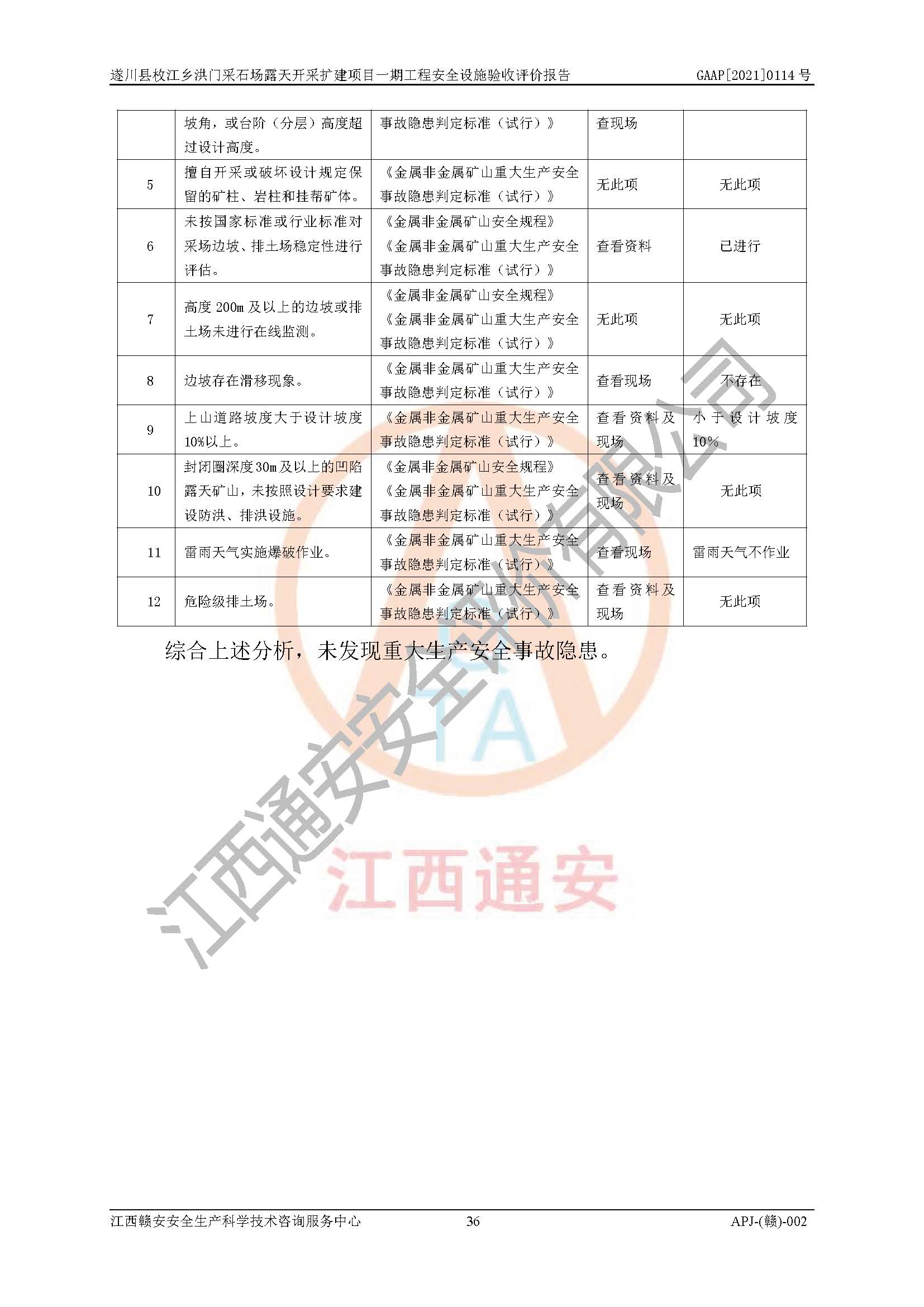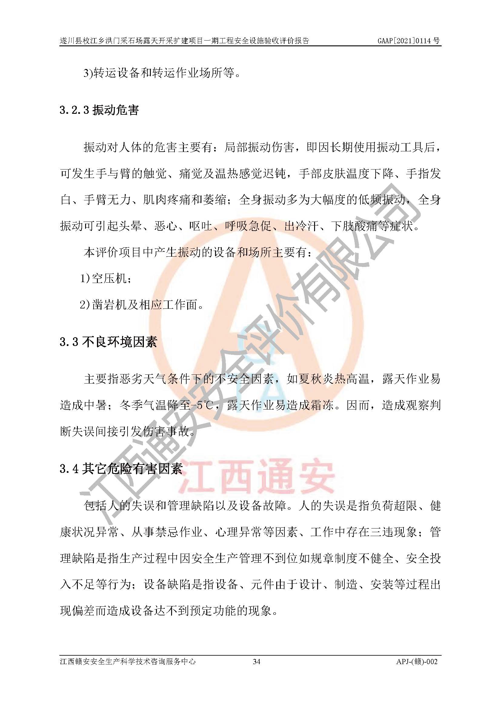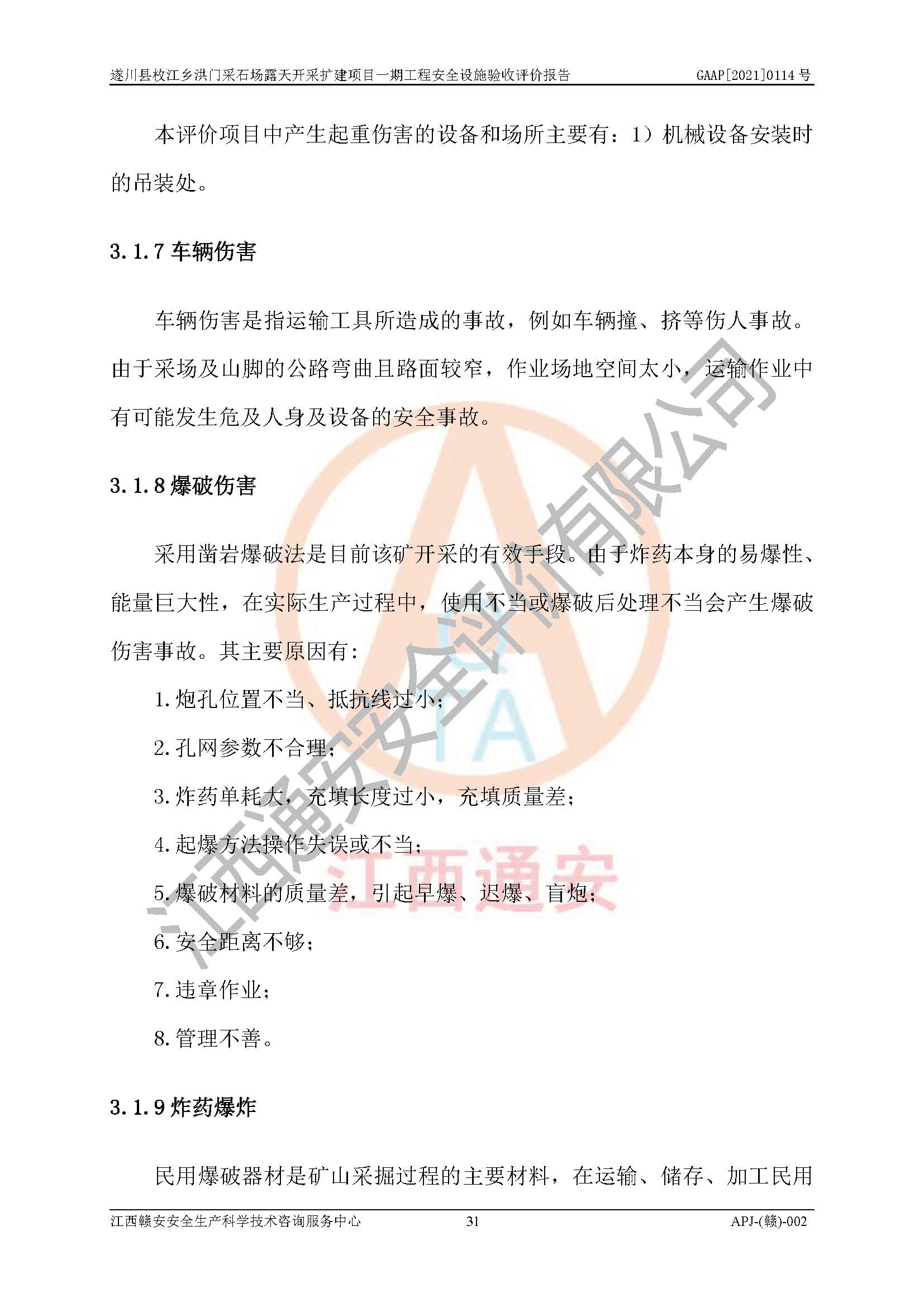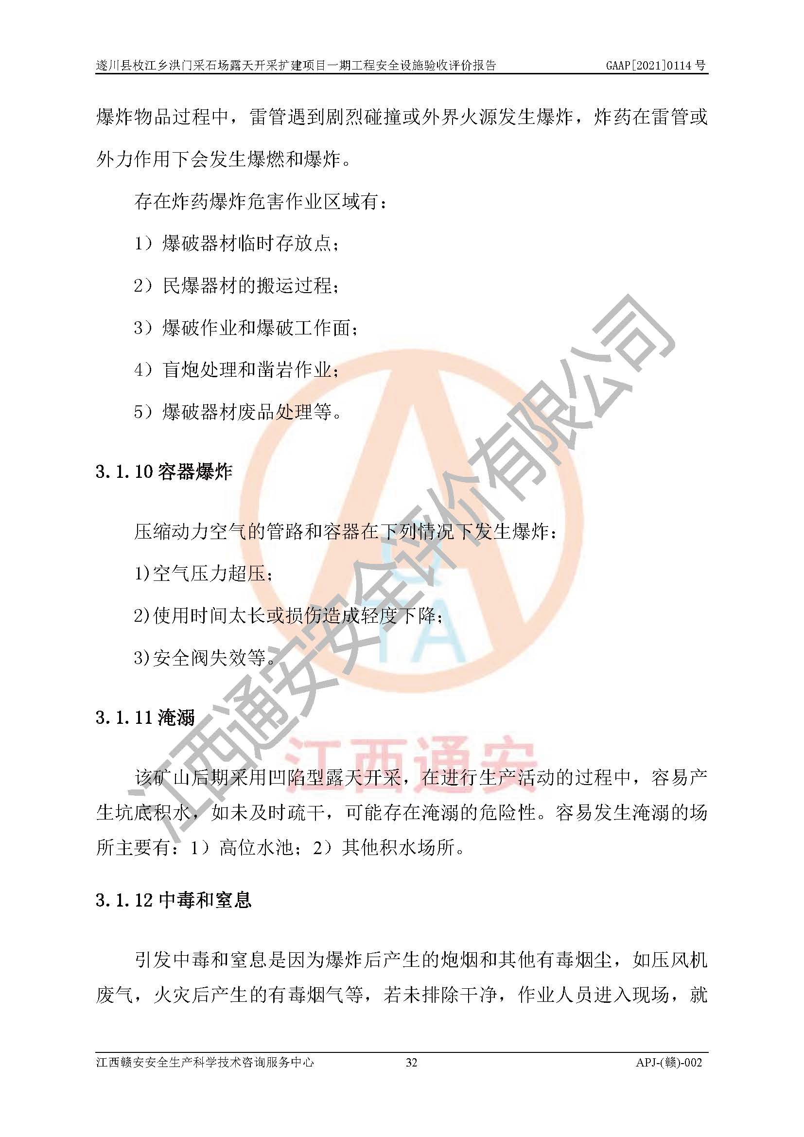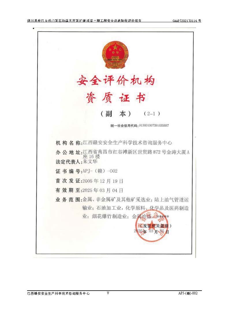1、該評(píng)價(jià)項(xiàng)目中存在的主要危險(xiǎn)因素:火藥爆炸、爆破傷害、容器爆炸、觸電與雷電、坍塌、機(jī)械傷害、**傷害、火災(zāi)、高處墜落、物體打擊、滑坡、泥石流、淹溺、中毒和窒息等危險(xiǎn)有害因素。 2、該評(píng)價(jià)項(xiàng)目中存在的有害因素包括:粉塵、噪聲與振動(dòng)、不良作業(yè)環(huán)境,如高溫、雷擊對(duì)礦山人員的傷害和其他不利的環(huán)境因素等。 3、該評(píng)價(jià)項(xiàng)目為非金屬露天采石場(chǎng),無瓦斯和自燃發(fā)火危險(xiǎn),礦區(qū)范圍內(nèi)及周邊無較大水系,礦區(qū)水文地質(zhì)條件簡(jiǎn)單。該評(píng)價(jià)項(xiàng)目只是對(duì)建筑用砂巖礦進(jìn)行露天開采,不使用有毒有害危險(xiǎn)化學(xué)品藥劑,該評(píng)價(jià)項(xiàng)目涉及的危險(xiǎn)物品主要為民用爆破器材,根據(jù)業(yè)主介紹,爆破器材采用配送制。該評(píng)價(jià)項(xiàng)目使用的壓力容器為空壓機(jī)儲(chǔ)氣罐,其工作介質(zhì)為空氣,屬**性、非易燃介質(zhì)。綜合上述分析,本評(píng)價(jià)項(xiàng)目不存在重大危險(xiǎn)源。 上述主要危險(xiǎn)、有害因素在采取本報(bào)告第六章中提出的安全對(duì)策措施后,能得到**控制。該項(xiàng)目從安全生產(chǎn)角度符合**有關(guān)安全生產(chǎn)法律、法規(guī)、規(guī)章和技術(shù)標(biāo)準(zhǔn)的要求。 |