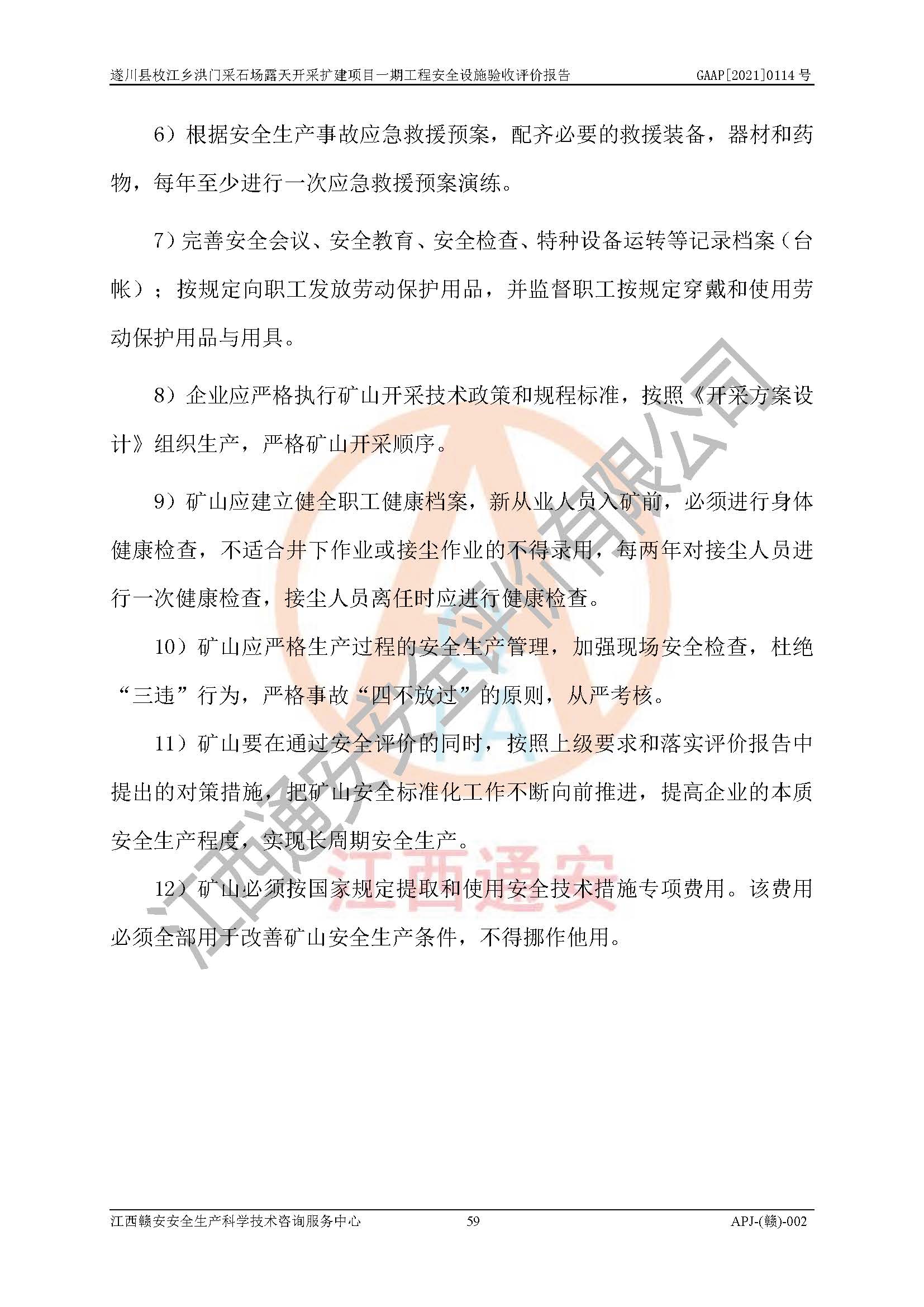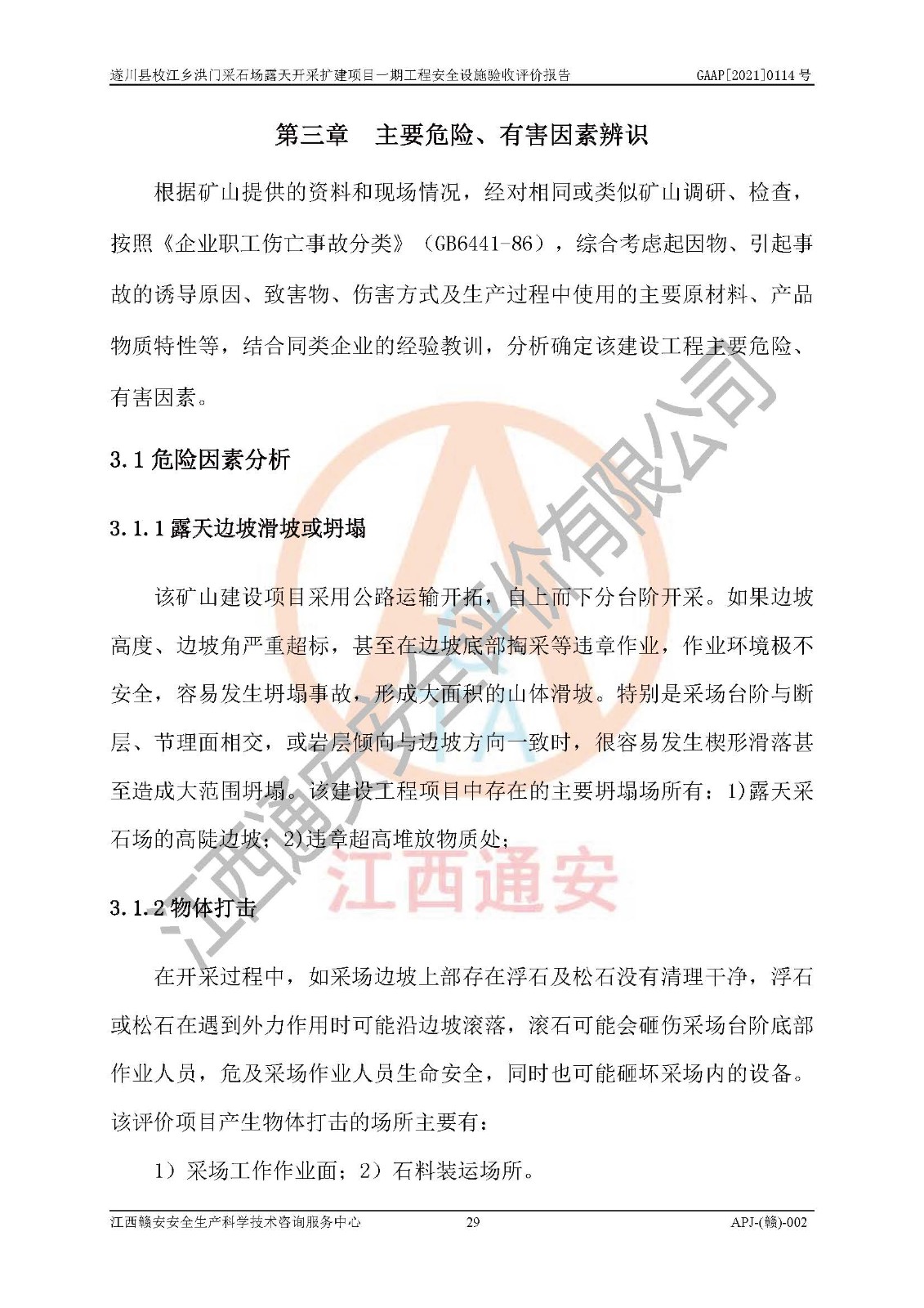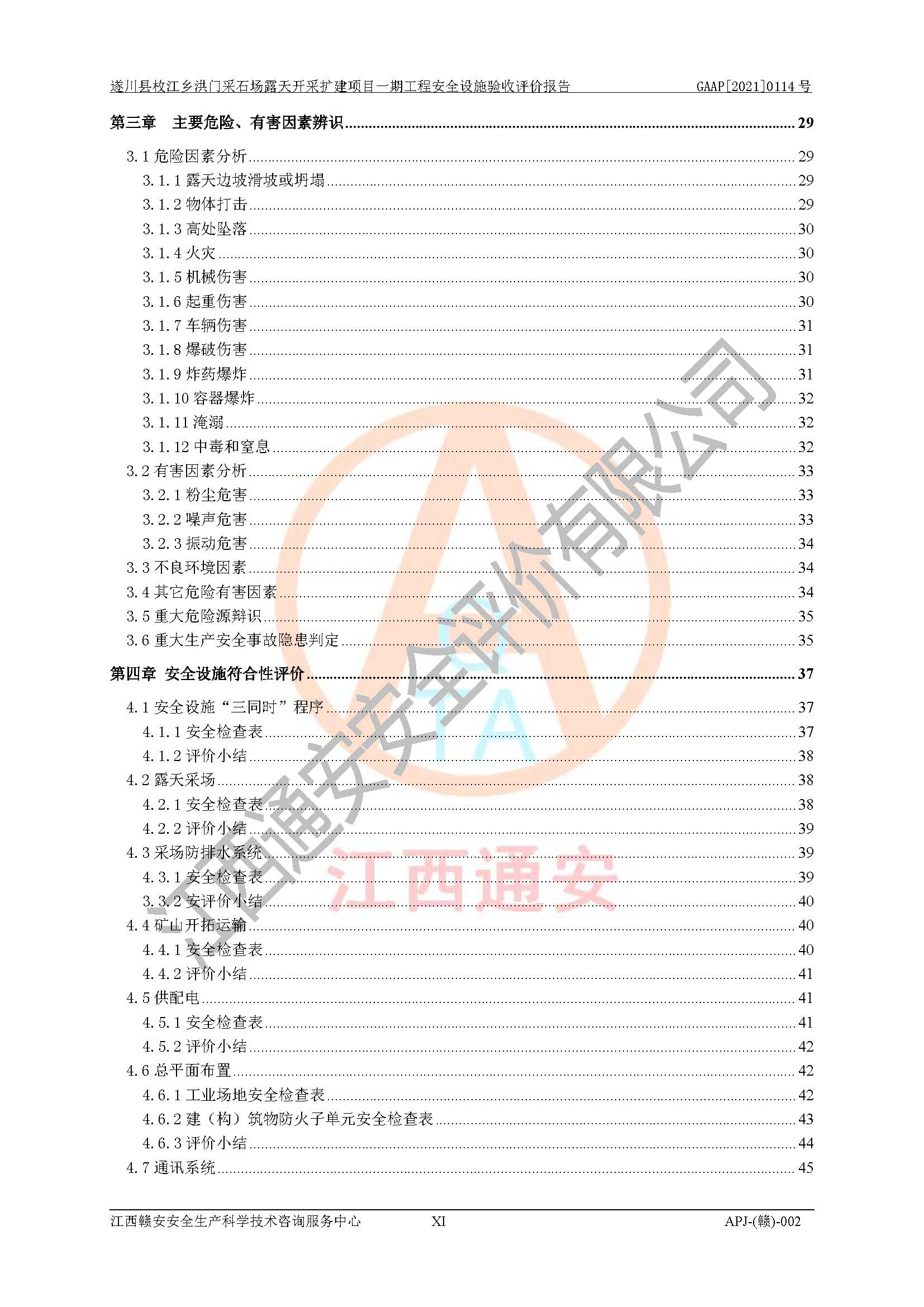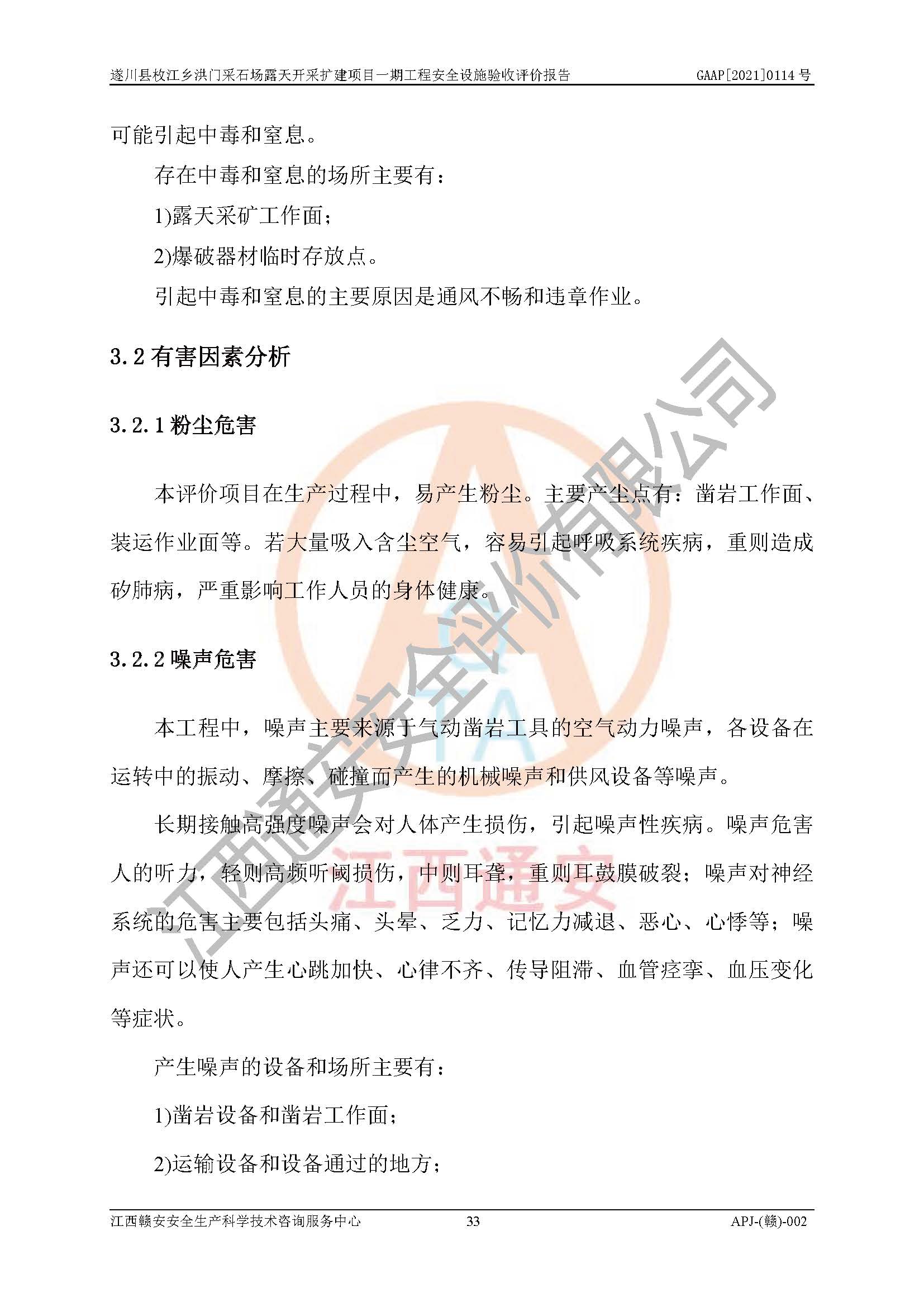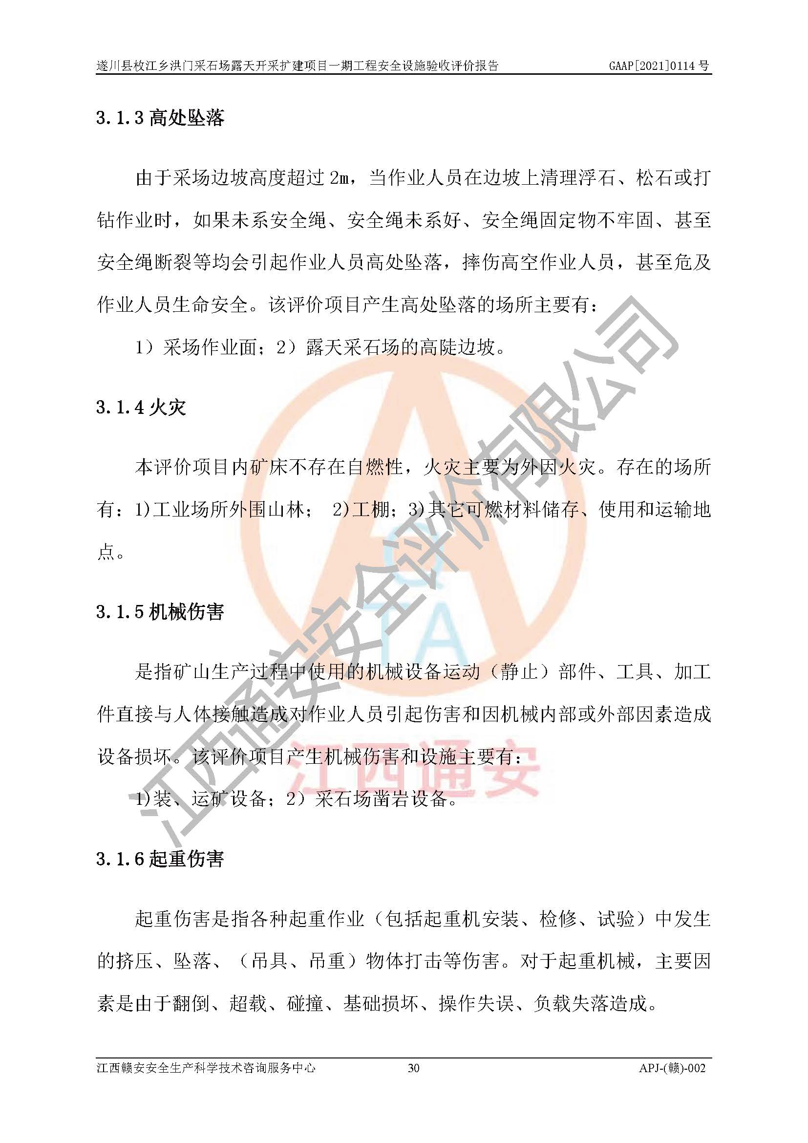 1、該評(píng)價(jià)項(xiàng)目中存在的主要危險(xiǎn)因素:火藥爆炸、爆破傷害、容器爆炸、觸電與雷電、坍塌、機(jī)械傷害、**傷害、火災(zāi)、高處墜落、物體打擊、滑坡、泥石流、淹溺、中毒和窒息等危險(xiǎn)有害因素。 2、該評(píng)價(jià)項(xiàng)目中存在的有害因素包括:粉塵、噪聲與振動(dòng)、不良作業(yè)環(huán)境,如高溫、雷擊對(duì)礦山人員的傷害和其他不利的環(huán)境因素等。 3、該評(píng)價(jià)項(xiàng)目為非金屬露天采石場(chǎng),無瓦斯和自燃發(fā)火危險(xiǎn),礦區(qū)范圍內(nèi)及周邊無較大水系,礦區(qū)水文地質(zhì)條件簡(jiǎn)單。該評(píng)價(jià)項(xiàng)目只是對(duì)建筑用砂巖礦進(jìn)行露天開采,不使用有毒有害危險(xiǎn)化學(xué)品藥劑,該評(píng)價(jià)項(xiàng)目涉及的危險(xiǎn)物品主要為民用爆破器材,根據(jù)業(yè)主介紹,爆破器材采用配送制。該評(píng)價(jià)項(xiàng)目使用的壓力容器為空壓機(jī)儲(chǔ)氣罐,其工作介質(zhì)為空氣,屬**性、非易燃介質(zhì)。綜合上述分析,本評(píng)價(jià)項(xiàng)目不存在重大危險(xiǎn)源。 上述主要危險(xiǎn)、有害因素在采取本報(bào)告第六章中提出的安全對(duì)策措施后,能得到**控制。該項(xiàng)目從安全生產(chǎn)角度符合**有關(guān)安全生產(chǎn)法律、法規(guī)、規(guī)章和技術(shù)標(biāo)準(zhǔn)的要求。 |