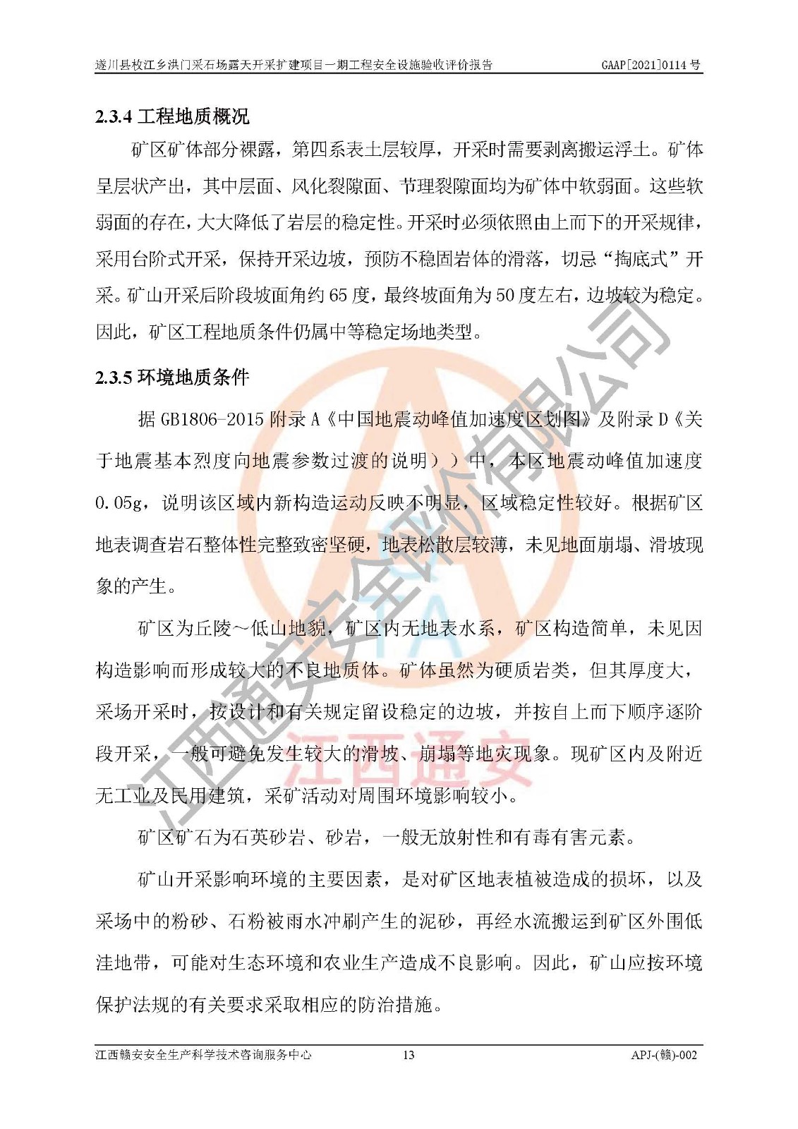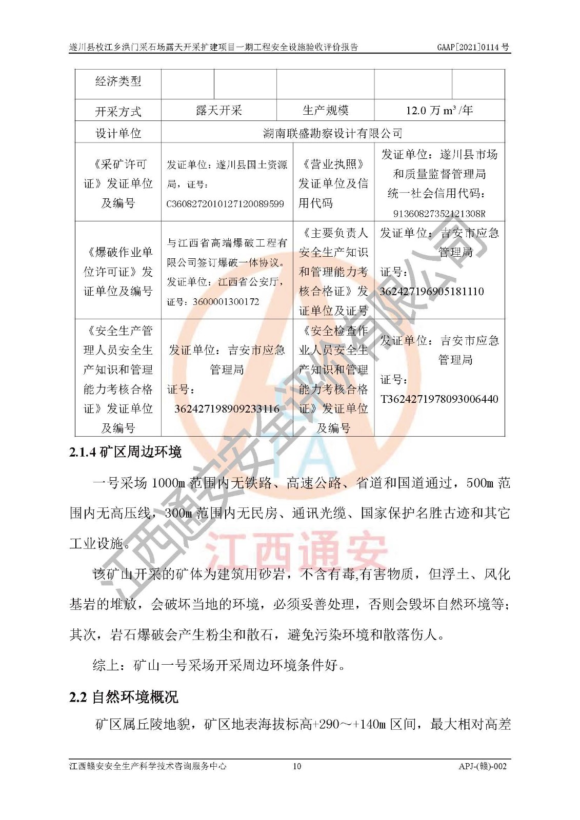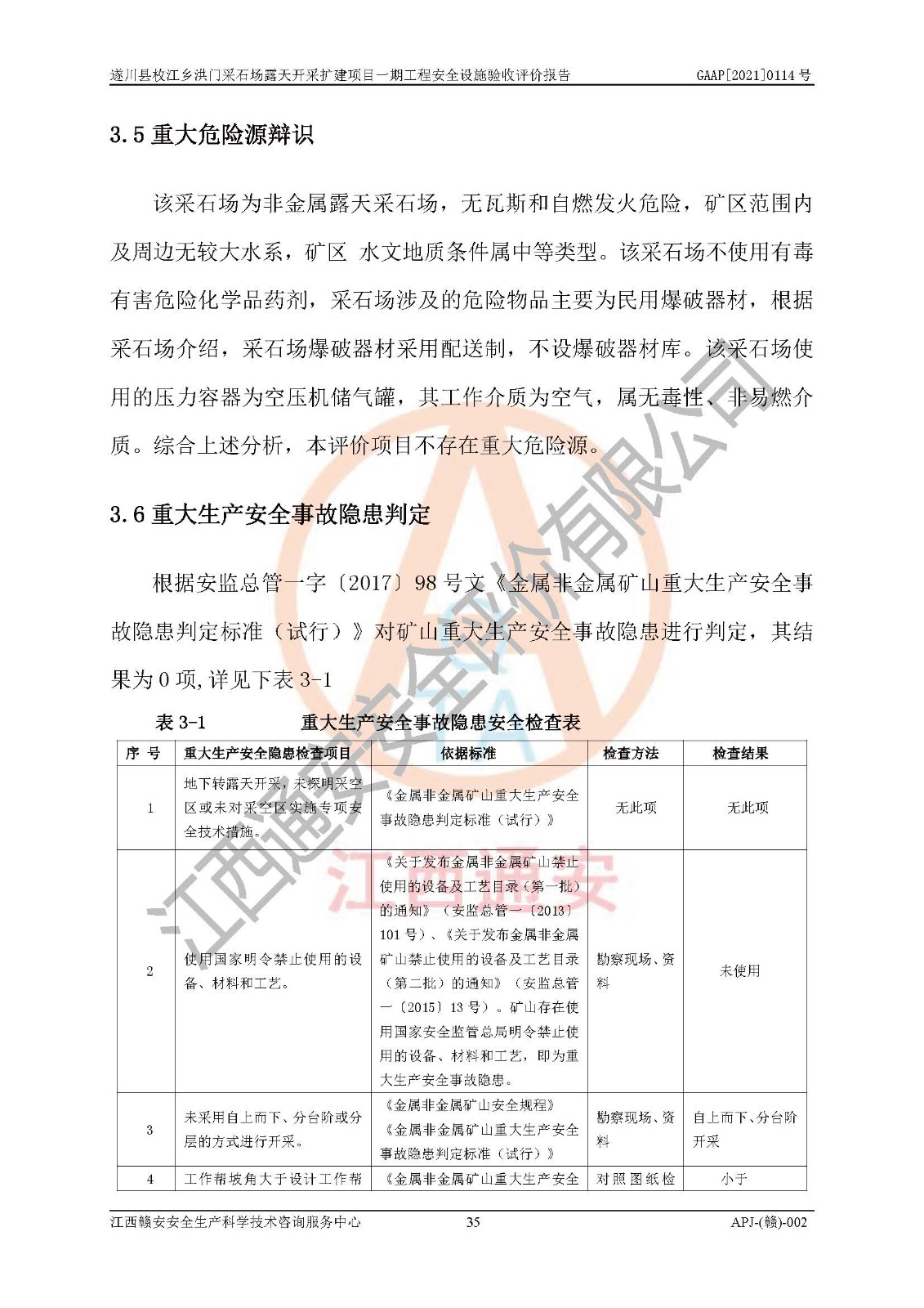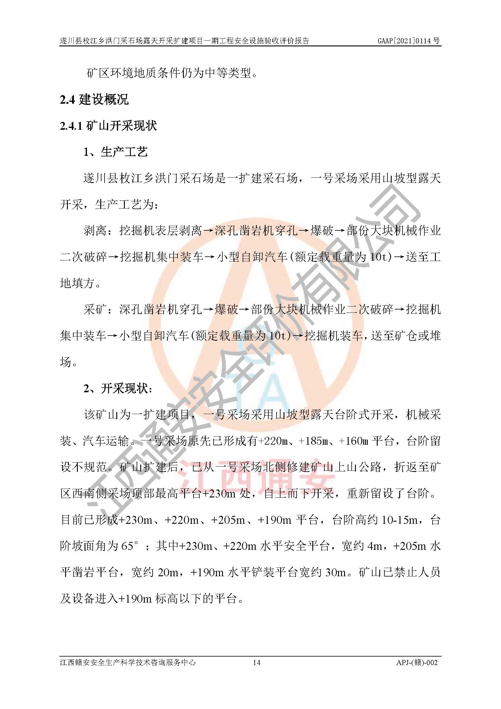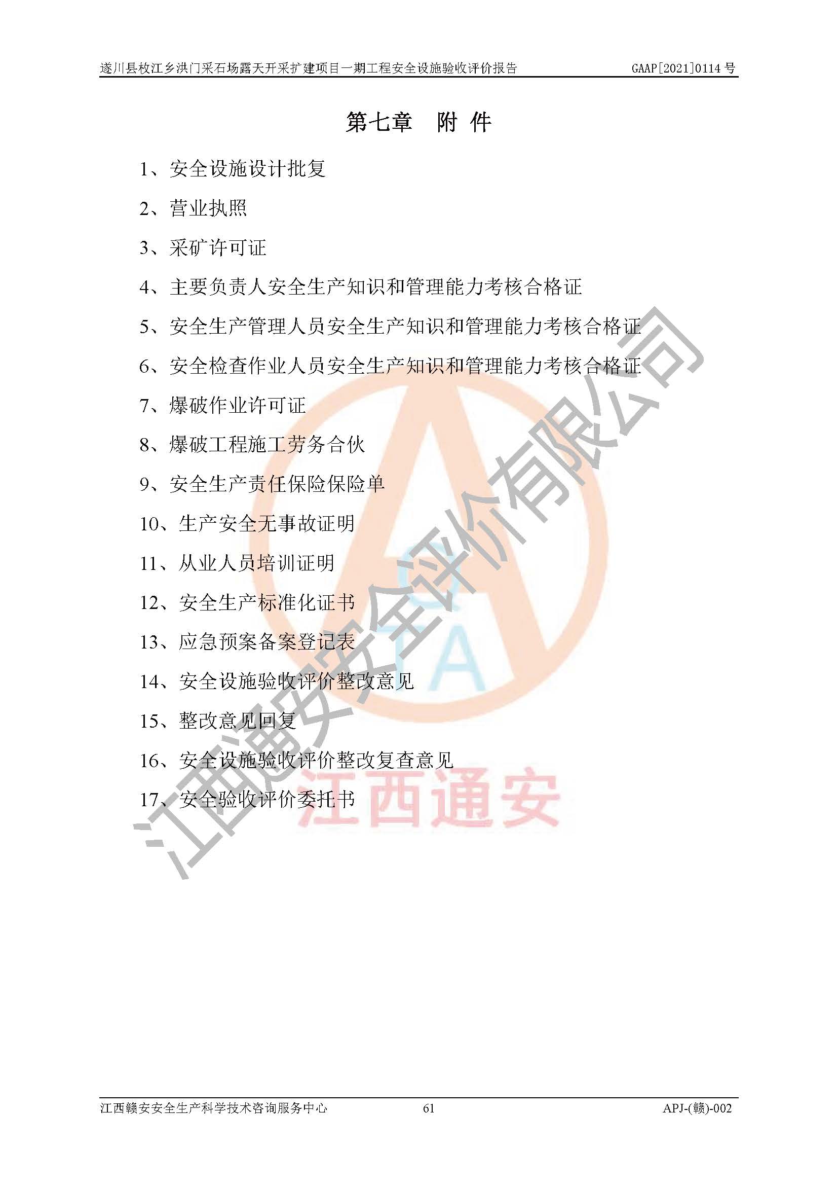 1、該評(píng)價(jià)項(xiàng)目中存在的主要危險(xiǎn)因素:火藥爆炸、爆破傷害、容器爆炸、觸電與雷電、坍塌、機(jī)械傷害、**傷害、火災(zāi)、高處墜落、物體打擊、滑坡、泥石流、淹溺、中毒和窒息等危險(xiǎn)有害因素。 2、該評(píng)價(jià)項(xiàng)目中存在的有害因素包括:粉塵、噪聲與振動(dòng)、不良作業(yè)環(huán)境,如高溫、雷擊對(duì)礦山人員的傷害和其他不利的環(huán)境因素等。 3、該評(píng)價(jià)項(xiàng)目為非金屬露天采石場(chǎng),無瓦斯和自燃發(fā)火危險(xiǎn),礦區(qū)范圍內(nèi)及周邊無較大水系,礦區(qū)水文地質(zhì)條件簡(jiǎn)單。該評(píng)價(jià)項(xiàng)目只是對(duì)建筑用砂巖礦進(jìn)行露天開采,不使用有毒有害危險(xiǎn)化學(xué)品藥劑,該評(píng)價(jià)項(xiàng)目涉及的危險(xiǎn)物品主要為民用爆破器材,根據(jù)業(yè)主介紹,爆破器材采用配送制。該評(píng)價(jià)項(xiàng)目使用的壓力容器為空壓機(jī)儲(chǔ)氣罐,其工作介質(zhì)為空氣,屬**性、非易燃介質(zhì)。綜合上述分析,本評(píng)價(jià)項(xiàng)目不存在重大危險(xiǎn)源。 上述主要危險(xiǎn)、有害因素在采取本報(bào)告第六章中提出的安全對(duì)策措施后,能得到**控制。該項(xiàng)目從安全生產(chǎn)角度符合**有關(guān)安全生產(chǎn)法律、法規(guī)、規(guī)章和技術(shù)標(biāo)準(zhǔn)的要求。 |