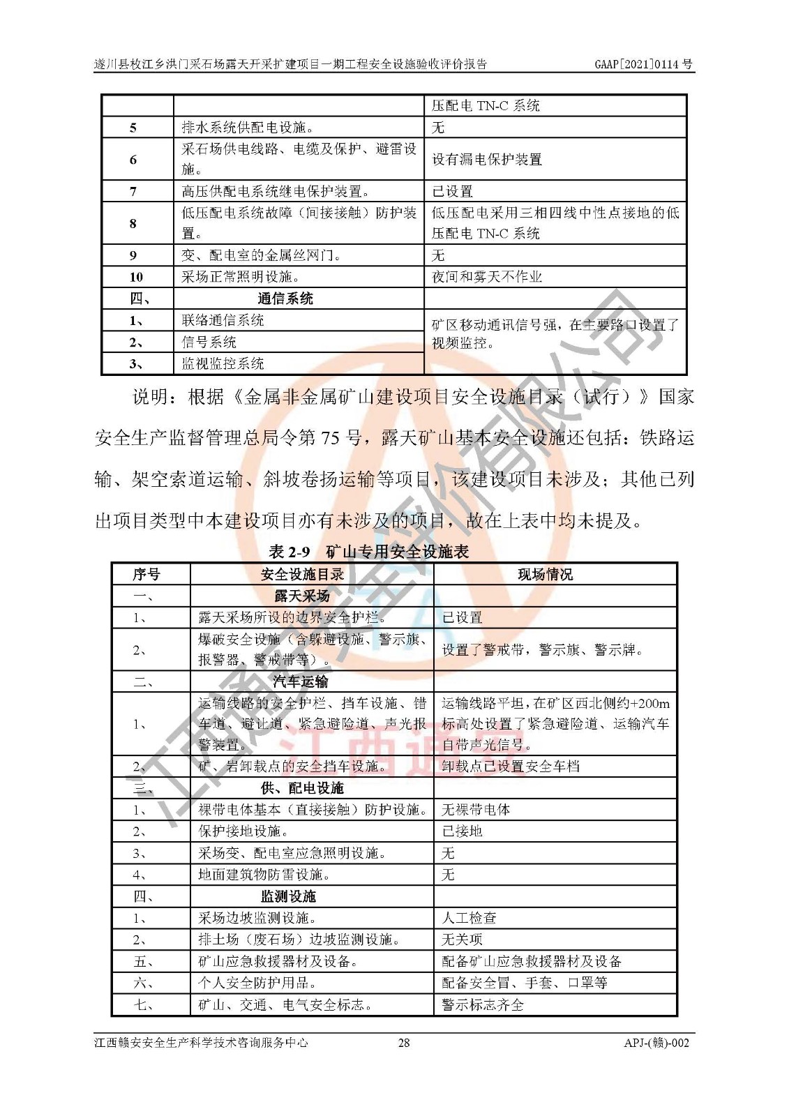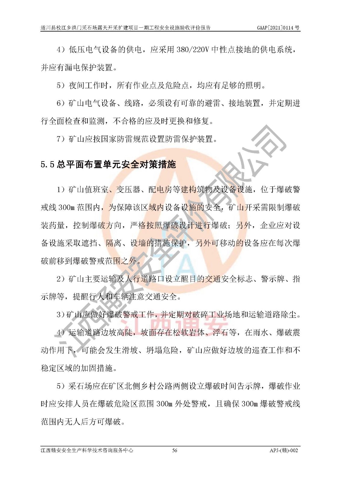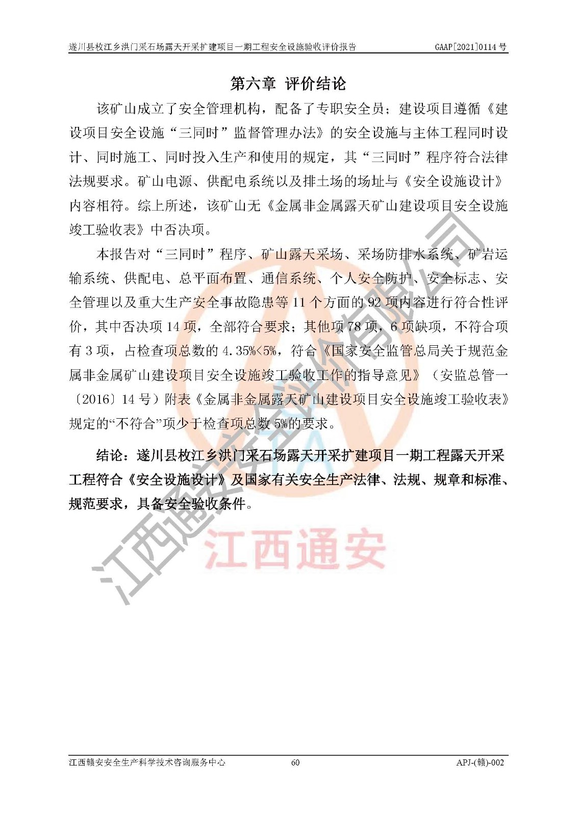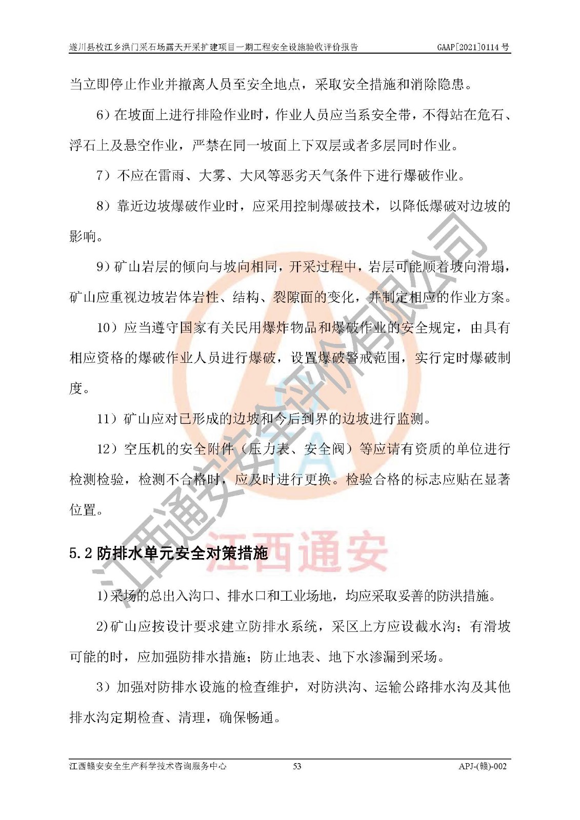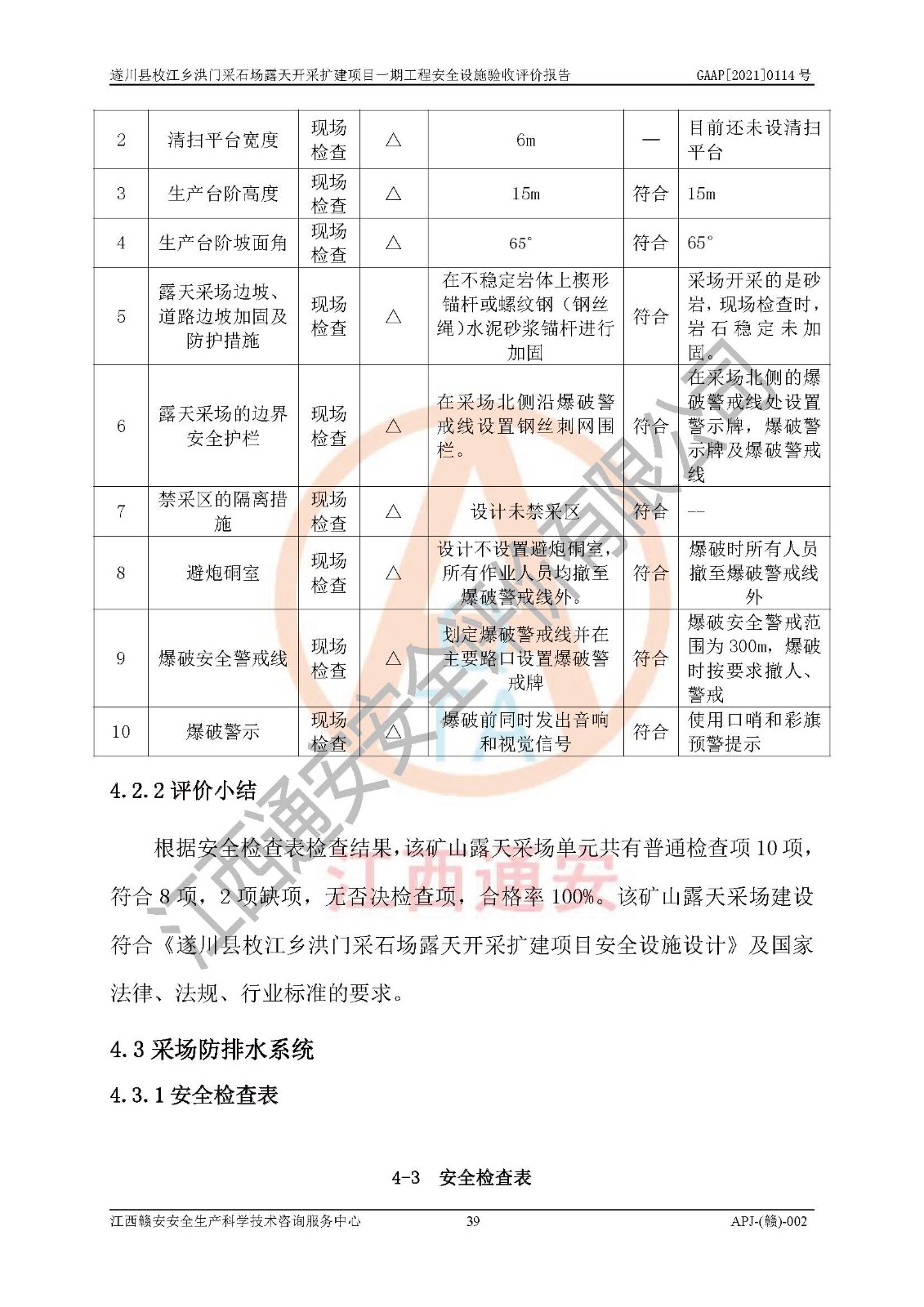 1、該評(píng)價(jià)項(xiàng)目中存在的主要危險(xiǎn)因素:火藥爆炸、爆破傷害、容器爆炸、觸電與雷電、坍塌、機(jī)械傷害、**傷害、火災(zāi)、高處墜落、物體打擊、滑坡、泥石流、淹溺、中毒和窒息等危險(xiǎn)有害因素。 2、該評(píng)價(jià)項(xiàng)目中存在的有害因素包括:粉塵、噪聲與振動(dòng)、不良作業(yè)環(huán)境,如高溫、雷擊對(duì)礦山人員的傷害和其他不利的環(huán)境因素等。 3、該評(píng)價(jià)項(xiàng)目為非金屬露天采石場(chǎng),無瓦斯和自燃發(fā)火危險(xiǎn),礦區(qū)范圍內(nèi)及周邊無較大水系,礦區(qū)水文地質(zhì)條件簡(jiǎn)單。該評(píng)價(jià)項(xiàng)目只是對(duì)建筑用砂巖礦進(jìn)行露天開采,不使用有毒有害危險(xiǎn)化學(xué)品藥劑,該評(píng)價(jià)項(xiàng)目涉及的危險(xiǎn)物品主要為民用爆破器材,根據(jù)業(yè)主介紹,爆破器材采用配送制。該評(píng)價(jià)項(xiàng)目使用的壓力容器為空壓機(jī)儲(chǔ)氣罐,其工作介質(zhì)為空氣,屬**性、非易燃介質(zhì)。綜合上述分析,本評(píng)價(jià)項(xiàng)目不存在重大危險(xiǎn)源。 上述主要危險(xiǎn)、有害因素在采取本報(bào)告第六章中提出的安全對(duì)策措施后,能得到**控制。該項(xiàng)目從安全生產(chǎn)角度符合**有關(guān)安全生產(chǎn)法律、法規(guī)、規(guī)章和技術(shù)標(biāo)準(zhǔn)的要求。 |