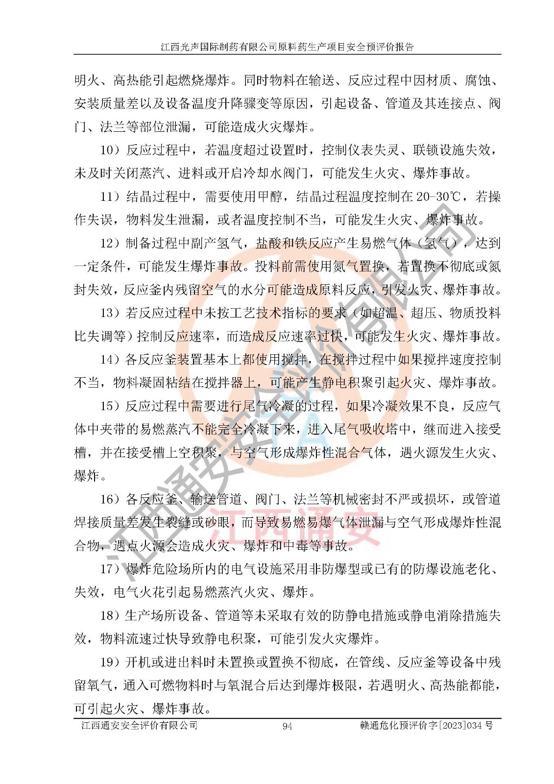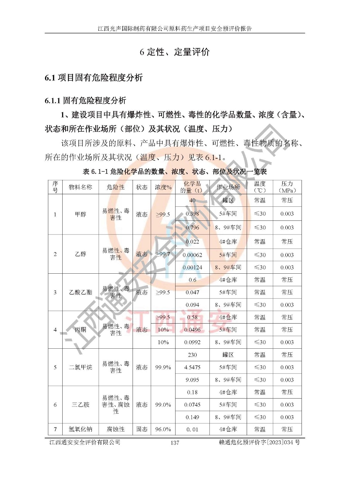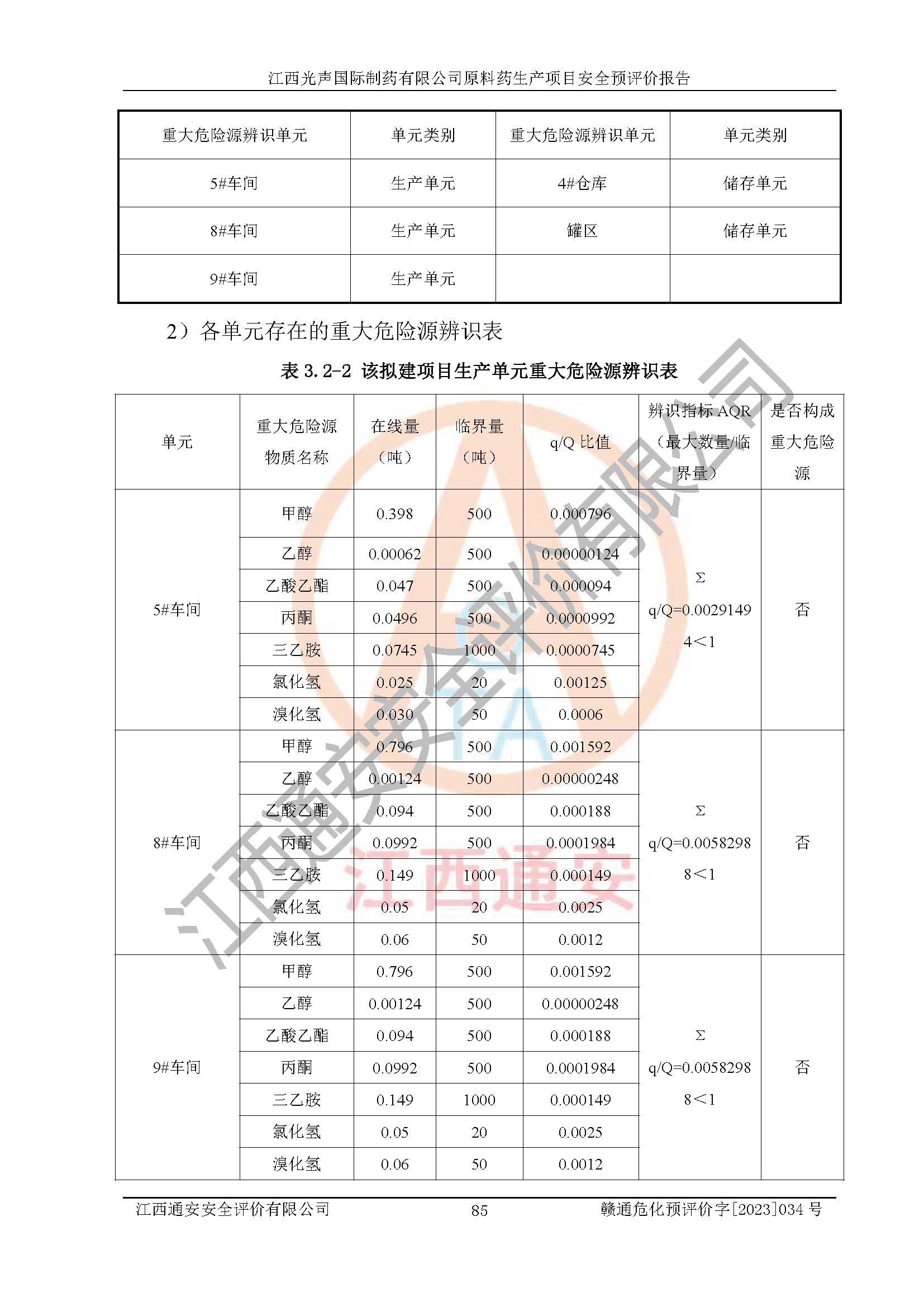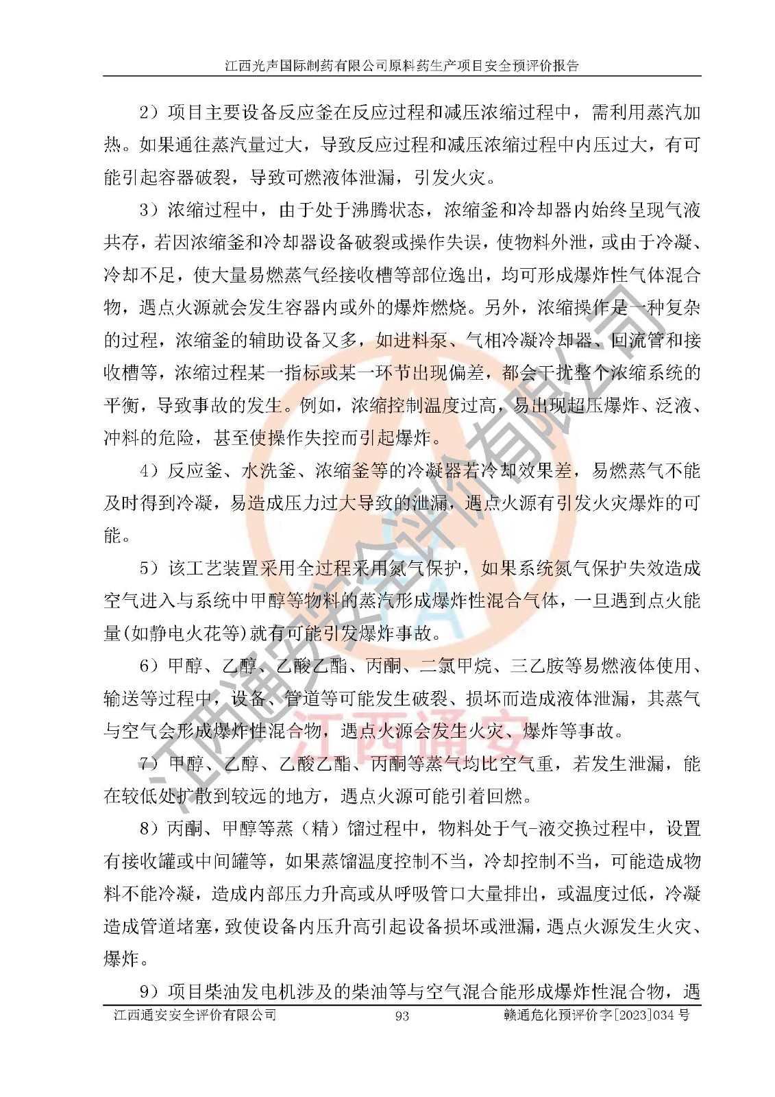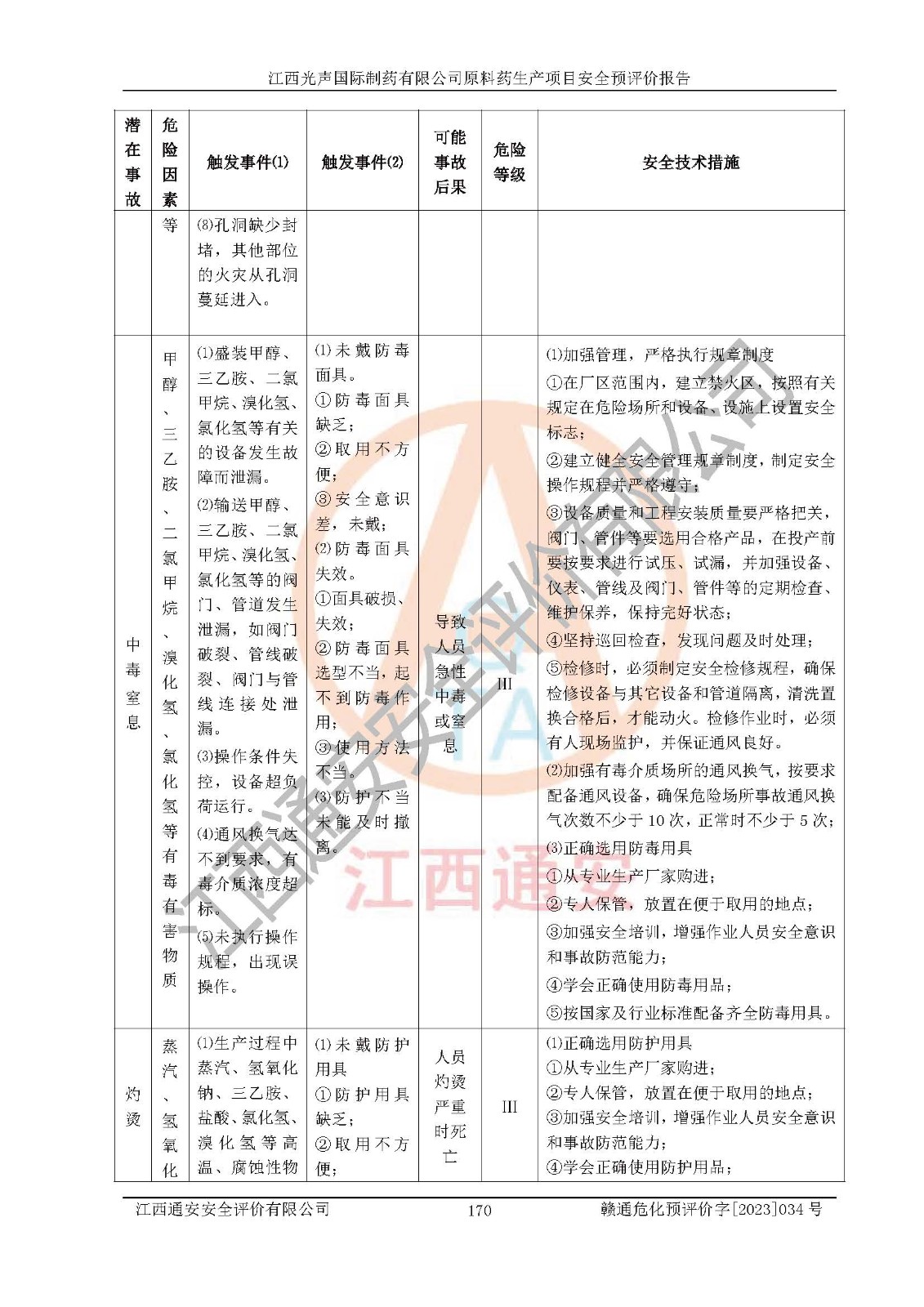 通過對江西光聲**制藥有限公司原料藥生產(chǎn)項目的危險、有害因素分析及定性、定量分析,結果為: 1、該建設項目中所涉及到的危險物質包括甲醇、乙醇、乙酸乙酯、**、三乙胺等易燃液體,在裝置運行和物料儲運過程中存在著易燃液體泄漏引發(fā)的火災爆炸危險;溴化氫屬于有毒氣體,二氯甲烷屬于毒害品,人員意外接觸后存在中毒窒息危險。另外,使用的鹽酸、溴化氫、氫氧化鈉、三乙胺等原料具有腐蝕性,人體意外接觸后易引發(fā)化學灼傷;同時該項目使用的反應釜、離心機、輸料泵等設備如操作不慎還會帶來機械傷害。因此,該項目在建成后的運行過程中存在火災與爆炸、中毒與窒息、觸電、機械傷害、高處墜落、物體打擊、**傷害、起重傷害、灼燙、淹溺、其他傷害等危險因素和化學因素、物理因素等有害因素。 2、重點防范的重大危險、有害因素:通過對該項目存在的危險、有害因素進行分析辨識,在生產(chǎn)過程中重點防范的重大危險、有害因素主要為火災與爆炸、中毒與窒息。 3、預先危險性分析法評價結果:該裝置運行過程中火災、爆炸的危險性等級為Ⅳ級,電氣火災、觸電、中毒窒息、灼燙的危險性為Ⅲ級,機械傷害、高處墜落、**傷害、起重傷害、淹溺、噪聲危害的危險性等級為Ⅱ級。因此,火災、爆炸是該裝置需重點防范的危險有害因素。而引發(fā)火災、爆炸的主要因素是甲醇、乙醇、乙酸乙酯以及三乙胺等可燃物質的泄漏及各類點火源的存在。企業(yè)在今后生產(chǎn)過程中,應將可燃物質的泄漏以及消除點火源做為重點加以控制。 4、危險度評價法的分析結果:該項目5#車間、8#車間、9#車間、罐區(qū)單元的危險等級分別為II級,屬中度危險;4#倉庫單元危險等級分別為Ⅲ級,屬低度危險。 5、重大危險源辨識結果:依據(jù)《危險化學品重大危險源辨識》(GB18218-2018),該擬建項目不構成危險化學品重大危險源。 6、根據(jù)**安全監(jiān)管總局辦公廳《關于公布首批重點監(jiān)管的危險化工工藝目錄的通知》(安監(jiān)總管三[2009]116號)和《**安全監(jiān)管總局關于公布第二批重點監(jiān)管危險化工工藝目錄和調(diào)整首批重點監(jiān)管危險化工工藝中部分典型工藝的通知》安監(jiān)總管三[2013]3號的規(guī)定,該擬建項目不涉及危險化工工藝。 7、特殊危險化學品辨識:該擬建項目涉及的甲醇、乙酸乙酯屬于重點監(jiān)管的危險化學品;擬建項目涉及的**、鹽酸屬于易制毒化學品,涉及的甲醇、乙醇屬于特別管控危險化學品,不涉及監(jiān)控化學品,不涉及易制爆化學品。 綜上所述:江西光聲**制藥有限公司原料藥生產(chǎn)項目符合**、省有關安全生產(chǎn)的法律法規(guī)、規(guī)章、標準、規(guī)范的要求,在以后的初步設計、施工圖設計和建設施工、安裝調(diào)試及生產(chǎn)運行中,如能嚴格執(zhí)行**有關安全生產(chǎn)法律、法規(guī)和有關標準、規(guī)范,認真采納本報告書中安全對策措施及建議,真正做到安全設施與主體工程同時設計、同時施工、同時投入生產(chǎn)和使用的“三同時”,工程的危險、有害因素可得到**控制,風險在可接受范圍內(nèi),具有**的本質安全水平;本建設項目從安全方面分析可行。 |