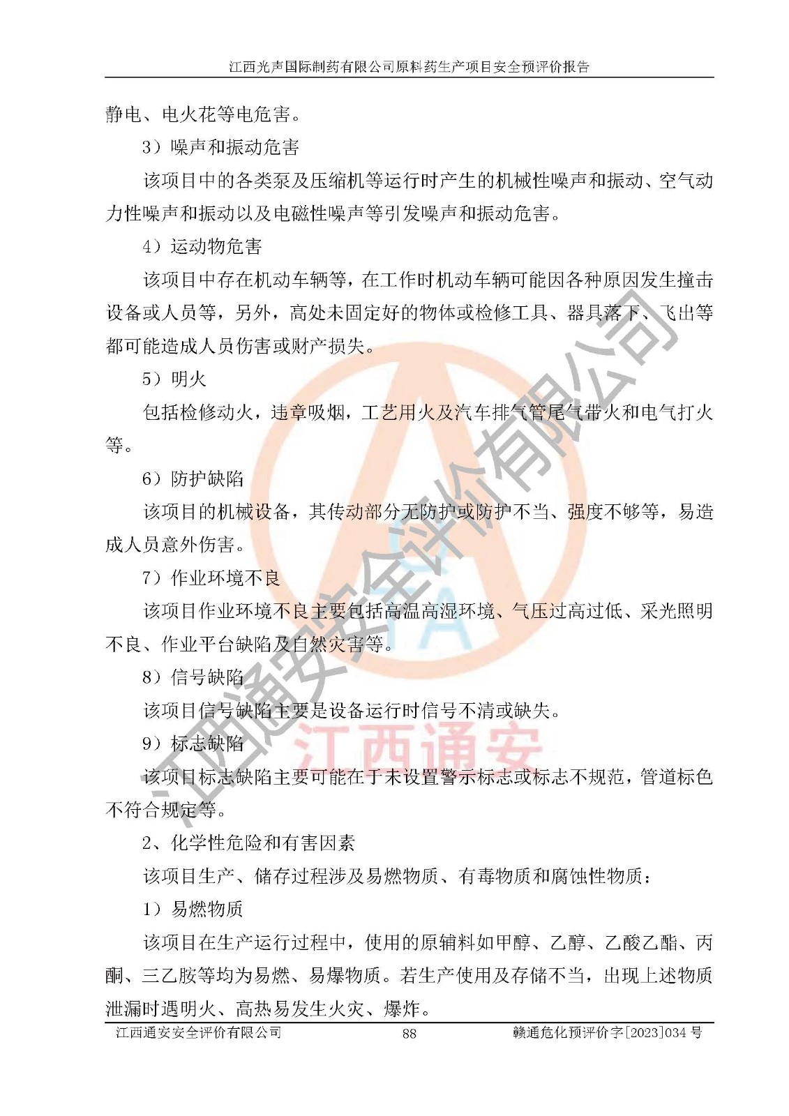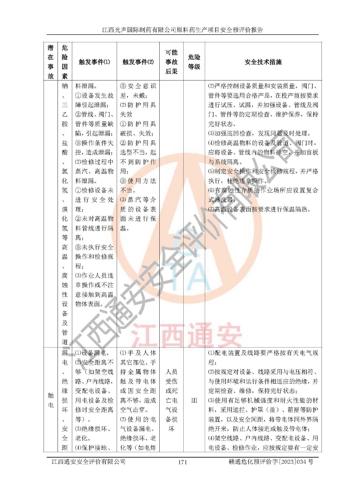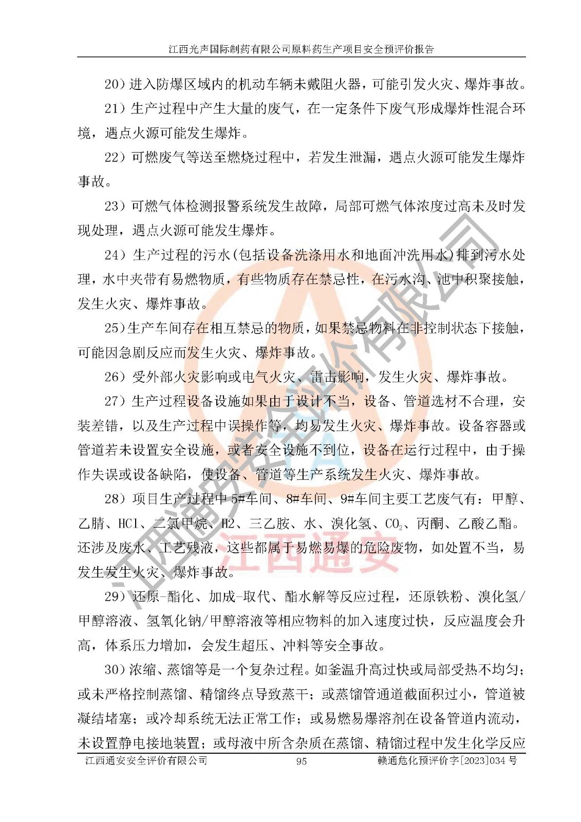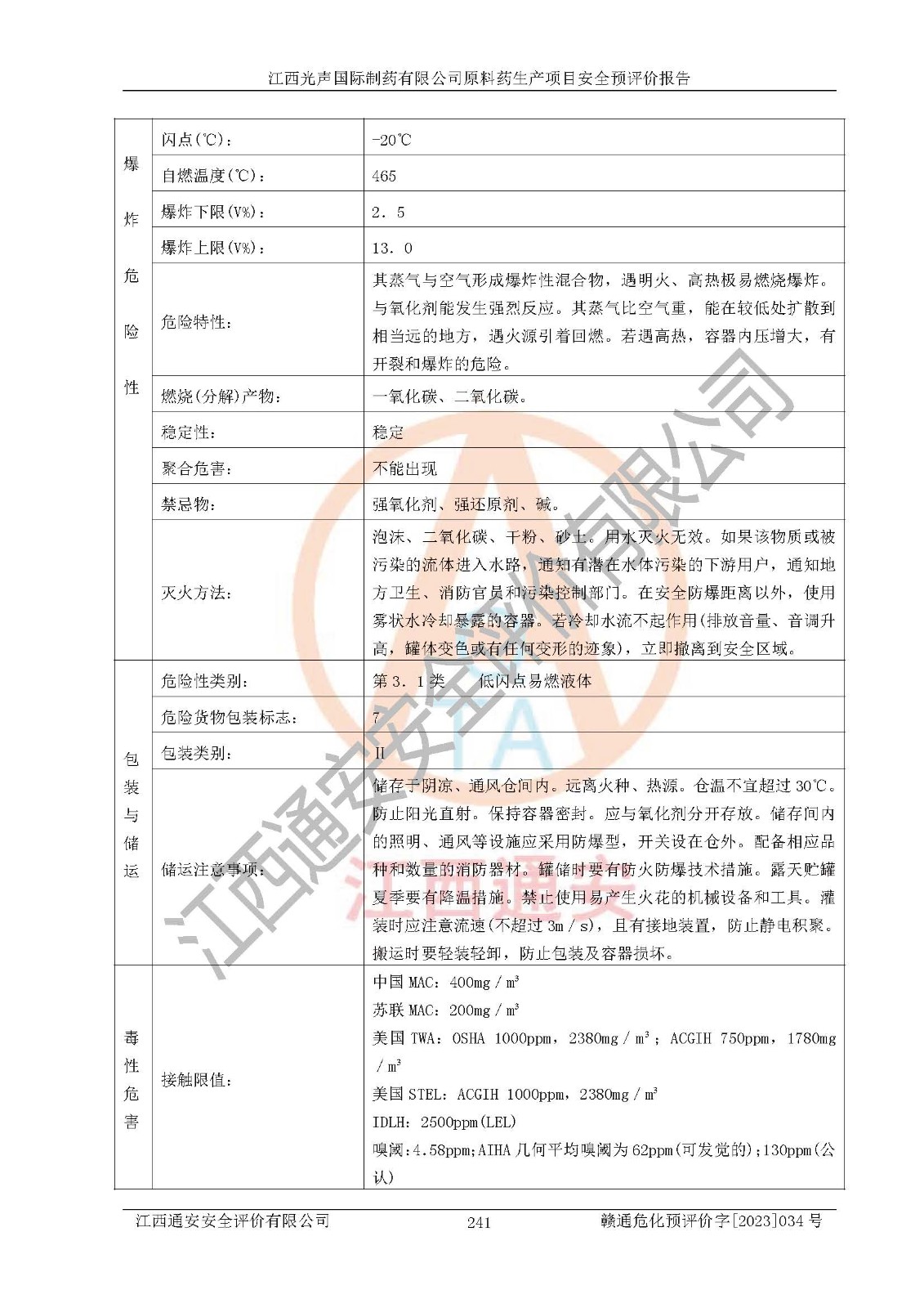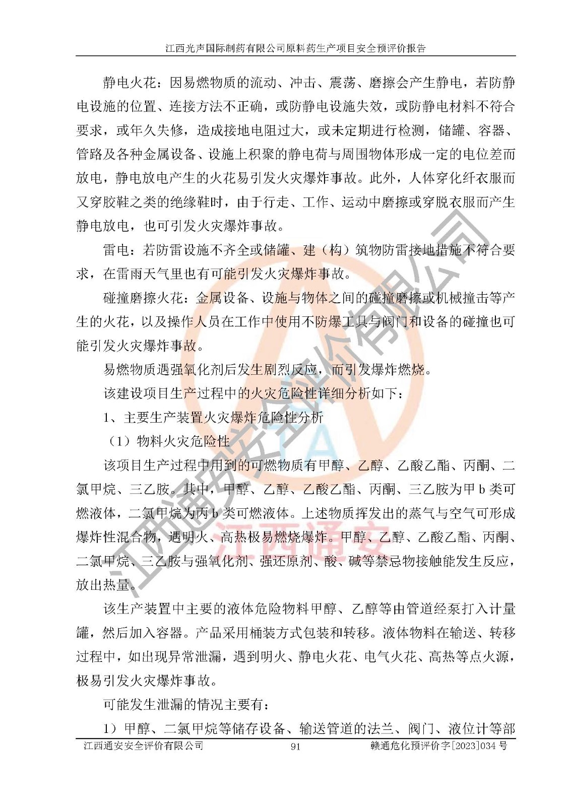 通過對江西光聲**制藥有限公司原料藥生產(chǎn)項目的危險、有害因素分析及定性、定量分析,結果為: 1、該建設項目中所涉及到的危險物質包括甲醇、乙醇、乙酸乙酯、**、三乙胺等易燃液體,在裝置運行和物料儲運過程中存在著易燃液體泄漏引發(fā)的火災爆炸危險;溴化氫屬于有毒氣體,二氯甲烷屬于毒害品,人員意外接觸后存在中毒窒息危險。另外,使用的鹽酸、溴化氫、氫氧化鈉、三乙胺等原料具有腐蝕性,人體意外接觸后易引發(fā)化學灼傷;同時該項目使用的反應釜、離心機、輸料泵等設備如操作不慎還會帶來機械傷害。因此,該項目在建成后的運行過程中存在火災與爆炸、中毒與窒息、觸電、機械傷害、高處墜落、物體打擊、**傷害、起重傷害、灼燙、淹溺、其他傷害等危險因素和化學因素、物理因素等有害因素。 2、重點防范的重大危險、有害因素:通過對該項目存在的危險、有害因素進行分析辨識,在生產(chǎn)過程中重點防范的重大危險、有害因素主要為火災與爆炸、中毒與窒息。 3、預先危險性分析法評價結果:該裝置運行過程中火災、爆炸的危險性等級為Ⅳ級,電氣火災、觸電、中毒窒息、灼燙的危險性為Ⅲ級,機械傷害、高處墜落、**傷害、起重傷害、淹溺、噪聲危害的危險性等級為Ⅱ級。因此,火災、爆炸是該裝置需重點防范的危險有害因素。而引發(fā)火災、爆炸的主要因素是甲醇、乙醇、乙酸乙酯以及三乙胺等可燃物質的泄漏及各類點火源的存在。企業(yè)在今后生產(chǎn)過程中,應將可燃物質的泄漏以及消除點火源做為重點加以控制。 4、危險度評價法的分析結果:該項目5#車間、8#車間、9#車間、罐區(qū)單元的危險等級分別為II級,屬中度危險;4#倉庫單元危險等級分別為Ⅲ級,屬低度危險。 5、重大危險源辨識結果:依據(jù)《危險化學品重大危險源辨識》(GB18218-2018),該擬建項目不構成危險化學品重大危險源。 6、根據(jù)**安全監(jiān)管總局辦公廳《關于公布首批重點監(jiān)管的危險化工工藝目錄的通知》(安監(jiān)總管三[2009]116號)和《**安全監(jiān)管總局關于公布第二批重點監(jiān)管危險化工工藝目錄和調(diào)整首批重點監(jiān)管危險化工工藝中部分典型工藝的通知》安監(jiān)總管三[2013]3號的規(guī)定,該擬建項目不涉及危險化工工藝。 7、特殊危險化學品辨識:該擬建項目涉及的甲醇、乙酸乙酯屬于重點監(jiān)管的危險化學品;擬建項目涉及的**、鹽酸屬于易制毒化學品,涉及的甲醇、乙醇屬于特別管控危險化學品,不涉及監(jiān)控化學品,不涉及易制爆化學品。 綜上所述:江西光聲**制藥有限公司原料藥生產(chǎn)項目符合**、省有關安全生產(chǎn)的法律法規(guī)、規(guī)章、標準、規(guī)范的要求,在以后的初步設計、施工圖設計和建設施工、安裝調(diào)試及生產(chǎn)運行中,如能嚴格執(zhí)行**有關安全生產(chǎn)法律、法規(guī)和有關標準、規(guī)范,認真采納本報告書中安全對策措施及建議,真正做到安全設施與主體工程同時設計、同時施工、同時投入生產(chǎn)和使用的“三同時”,工程的危險、有害因素可得到**控制,風險在可接受范圍內(nèi),具有**的本質安全水平;本建設項目從安全方面分析可行。 |