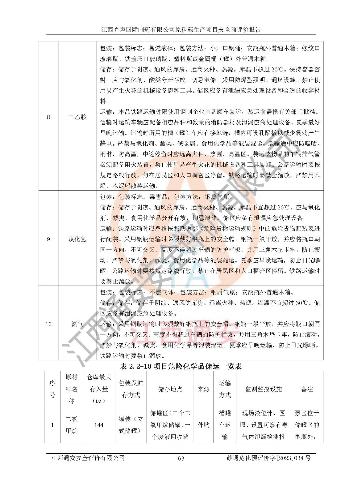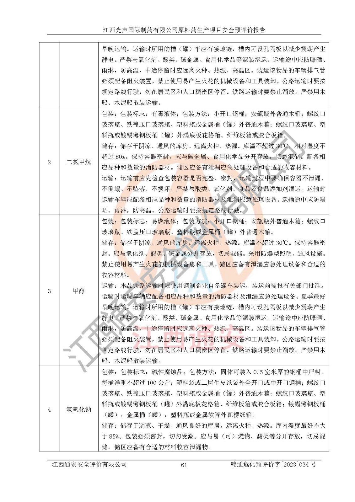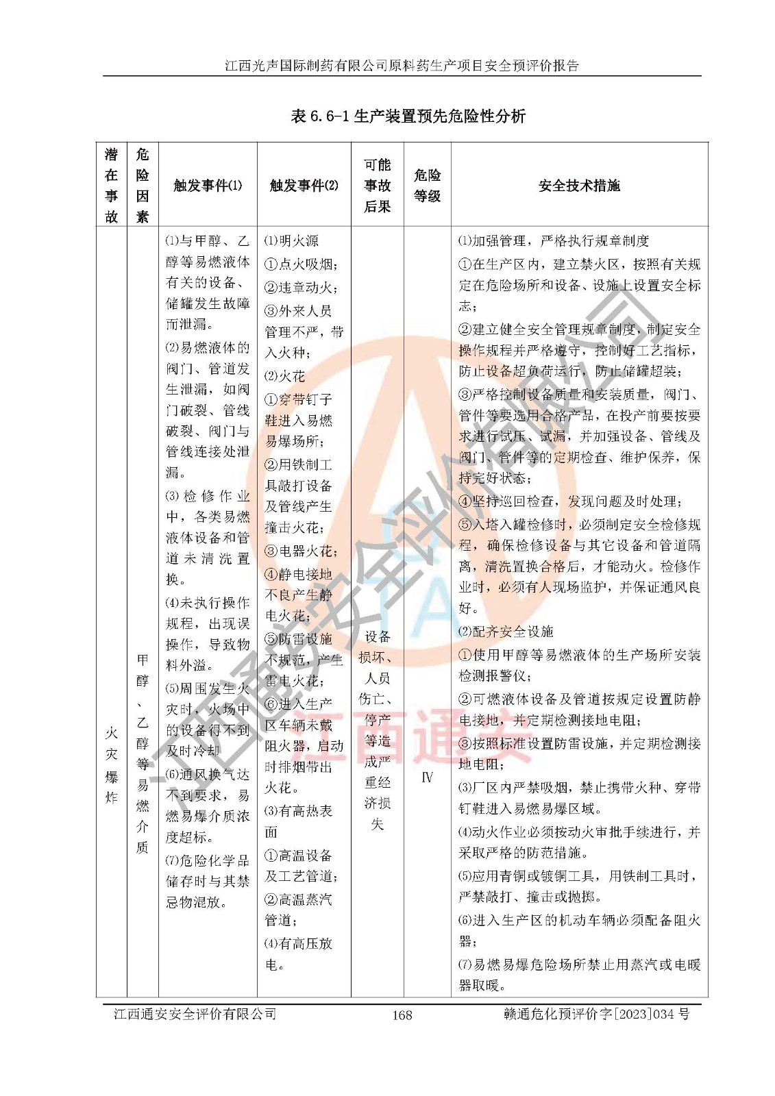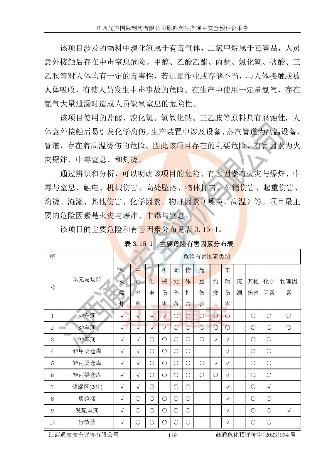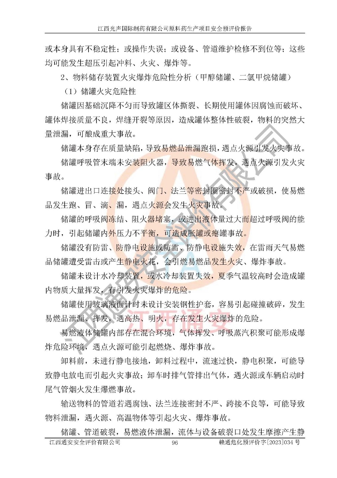 通過對江西光聲**制藥有限公司原料藥生產(chǎn)項目的危險、有害因素分析及定性、定量分析,結果為: 1、該建設項目中所涉及到的危險物質包括甲醇、乙醇、乙酸乙酯、**、三乙胺等易燃液體,在裝置運行和物料儲運過程中存在著易燃液體泄漏引發(fā)的火災爆炸危險;溴化氫屬于有毒氣體,二氯甲烷屬于毒害品,人員意外接觸后存在中毒窒息危險。另外,使用的鹽酸、溴化氫、氫氧化鈉、三乙胺等原料具有腐蝕性,人體意外接觸后易引發(fā)化學灼傷;同時該項目使用的反應釜、離心機、輸料泵等設備如操作不慎還會帶來機械傷害。因此,該項目在建成后的運行過程中存在火災與爆炸、中毒與窒息、觸電、機械傷害、高處墜落、物體打擊、**傷害、起重傷害、灼燙、淹溺、其他傷害等危險因素和化學因素、物理因素等有害因素。 2、重點防范的重大危險、有害因素:通過對該項目存在的危險、有害因素進行分析辨識,在生產(chǎn)過程中重點防范的重大危險、有害因素主要為火災與爆炸、中毒與窒息。 3、預先危險性分析法評價結果:該裝置運行過程中火災、爆炸的危險性等級為Ⅳ級,電氣火災、觸電、中毒窒息、灼燙的危險性為Ⅲ級,機械傷害、高處墜落、**傷害、起重傷害、淹溺、噪聲危害的危險性等級為Ⅱ級。因此,火災、爆炸是該裝置需重點防范的危險有害因素。而引發(fā)火災、爆炸的主要因素是甲醇、乙醇、乙酸乙酯以及三乙胺等可燃物質的泄漏及各類點火源的存在。企業(yè)在今后生產(chǎn)過程中,應將可燃物質的泄漏以及消除點火源做為重點加以控制。 4、危險度評價法的分析結果:該項目5#車間、8#車間、9#車間、罐區(qū)單元的危險等級分別為II級,屬中度危險;4#倉庫單元危險等級分別為Ⅲ級,屬低度危險。 5、重大危險源辨識結果:依據(jù)《危險化學品重大危險源辨識》(GB18218-2018),該擬建項目不構成危險化學品重大危險源。 6、根據(jù)**安全監(jiān)管總局辦公廳《關于公布首批重點監(jiān)管的危險化工工藝目錄的通知》(安監(jiān)總管三[2009]116號)和《**安全監(jiān)管總局關于公布第二批重點監(jiān)管危險化工工藝目錄和調(diào)整首批重點監(jiān)管危險化工工藝中部分典型工藝的通知》安監(jiān)總管三[2013]3號的規(guī)定,該擬建項目不涉及危險化工工藝。 7、特殊危險化學品辨識:該擬建項目涉及的甲醇、乙酸乙酯屬于重點監(jiān)管的危險化學品;擬建項目涉及的**、鹽酸屬于易制毒化學品,涉及的甲醇、乙醇屬于特別管控危險化學品,不涉及監(jiān)控化學品,不涉及易制爆化學品。 綜上所述:江西光聲**制藥有限公司原料藥生產(chǎn)項目符合**、省有關安全生產(chǎn)的法律法規(guī)、規(guī)章、標準、規(guī)范的要求,在以后的初步設計、施工圖設計和建設施工、安裝調(diào)試及生產(chǎn)運行中,如能嚴格執(zhí)行**有關安全生產(chǎn)法律、法規(guī)和有關標準、規(guī)范,認真采納本報告書中安全對策措施及建議,真正做到安全設施與主體工程同時設計、同時施工、同時投入生產(chǎn)和使用的“三同時”,工程的危險、有害因素可得到**控制,風險在可接受范圍內(nèi),具有**的本質安全水平;本建設項目從安全方面分析可行。 |