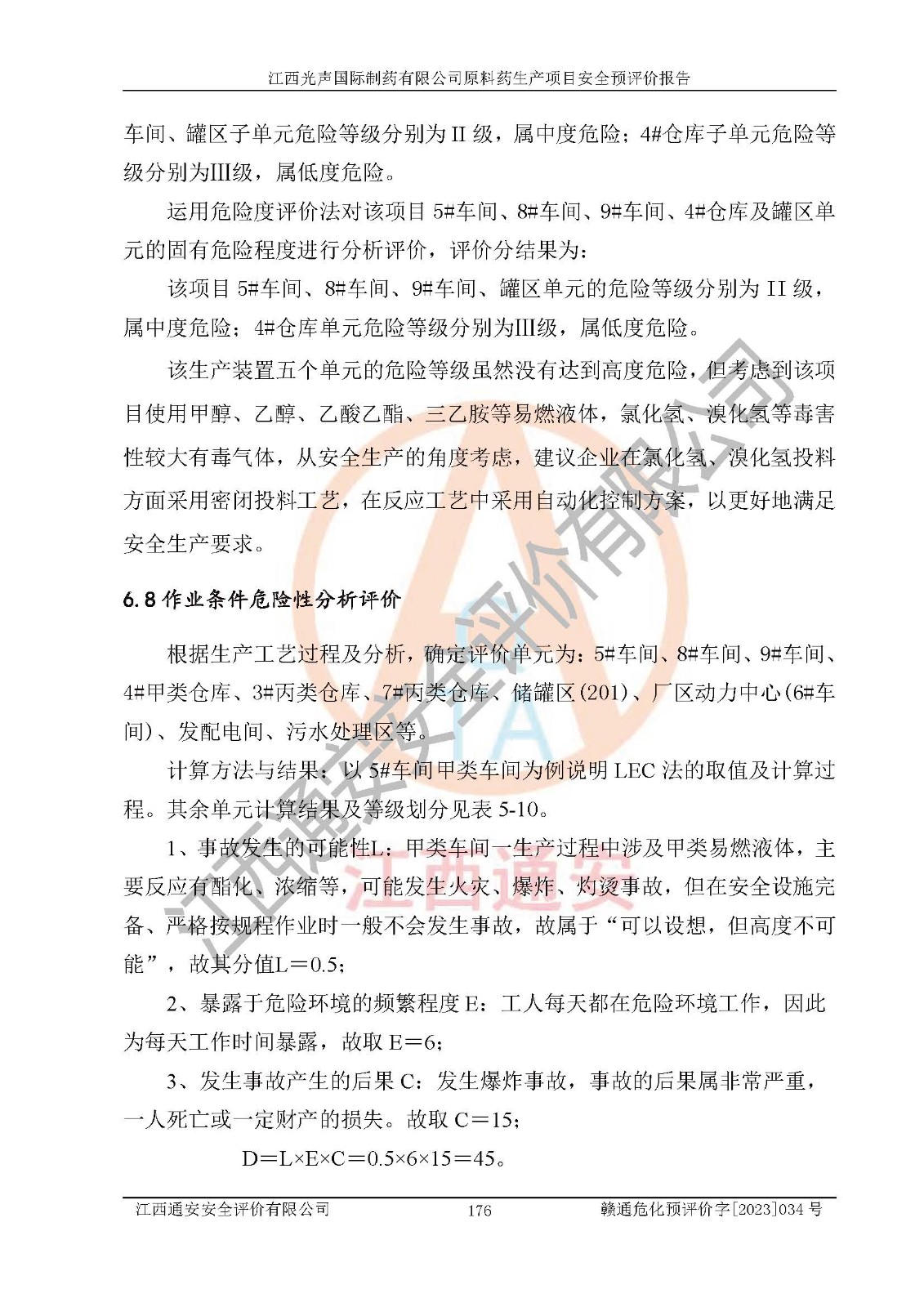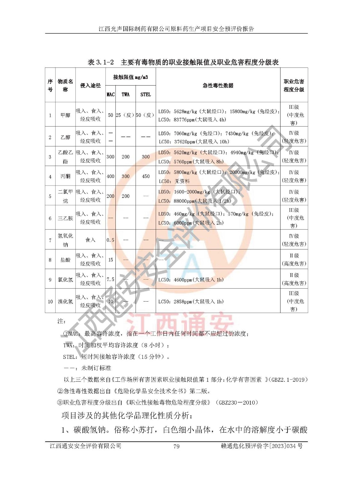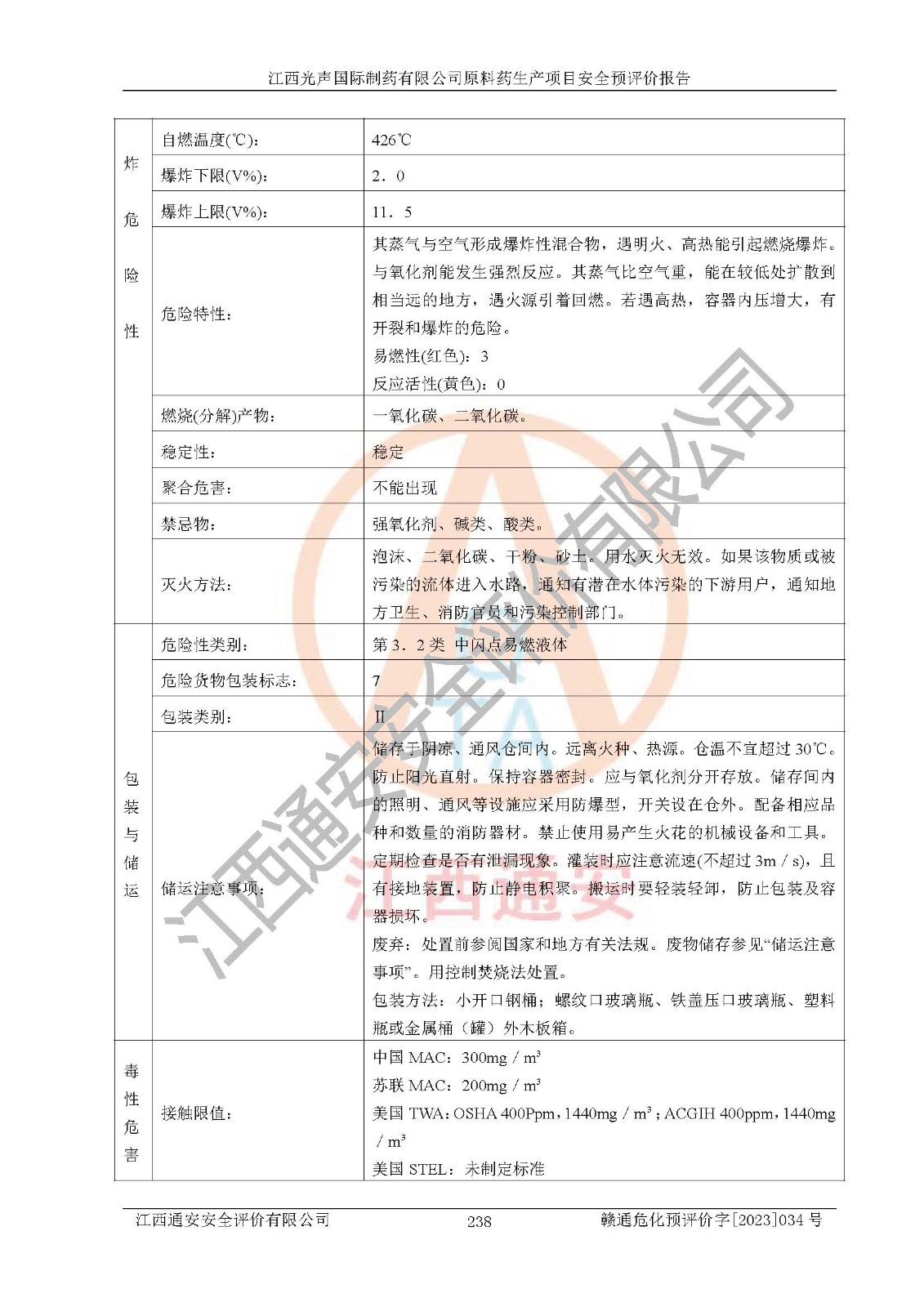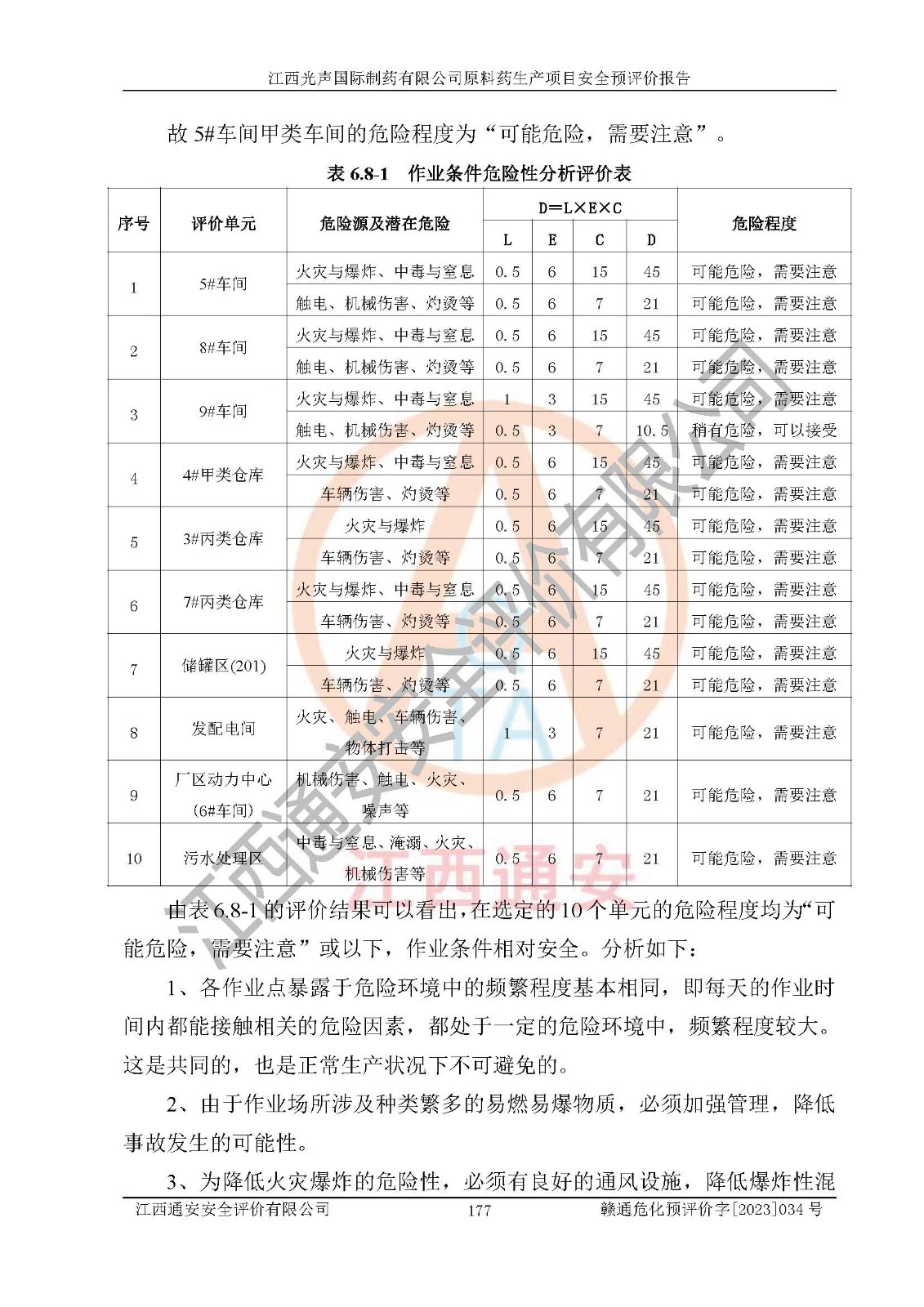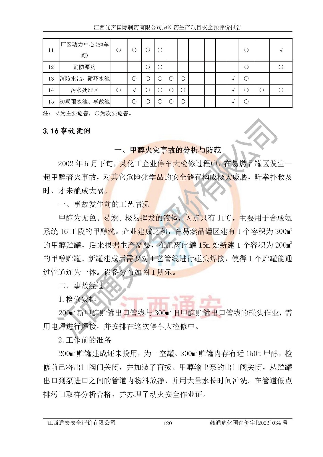 通過對江西光聲**制藥有限公司原料藥生產(chǎn)項目的危險、有害因素分析及定性、定量分析,結果為: 1、該建設項目中所涉及到的危險物質包括甲醇、乙醇、乙酸乙酯、**、三乙胺等易燃液體,在裝置運行和物料儲運過程中存在著易燃液體泄漏引發(fā)的火災爆炸危險;溴化氫屬于有毒氣體,二氯甲烷屬于毒害品,人員意外接觸后存在中毒窒息危險。另外,使用的鹽酸、溴化氫、氫氧化鈉、三乙胺等原料具有腐蝕性,人體意外接觸后易引發(fā)化學灼傷;同時該項目使用的反應釜、離心機、輸料泵等設備如操作不慎還會帶來機械傷害。因此,該項目在建成后的運行過程中存在火災與爆炸、中毒與窒息、觸電、機械傷害、高處墜落、物體打擊、**傷害、起重傷害、灼燙、淹溺、其他傷害等危險因素和化學因素、物理因素等有害因素。 2、重點防范的重大危險、有害因素:通過對該項目存在的危險、有害因素進行分析辨識,在生產(chǎn)過程中重點防范的重大危險、有害因素主要為火災與爆炸、中毒與窒息。 3、預先危險性分析法評價結果:該裝置運行過程中火災、爆炸的危險性等級為Ⅳ級,電氣火災、觸電、中毒窒息、灼燙的危險性為Ⅲ級,機械傷害、高處墜落、**傷害、起重傷害、淹溺、噪聲危害的危險性等級為Ⅱ級。因此,火災、爆炸是該裝置需重點防范的危險有害因素。而引發(fā)火災、爆炸的主要因素是甲醇、乙醇、乙酸乙酯以及三乙胺等可燃物質的泄漏及各類點火源的存在。企業(yè)在今后生產(chǎn)過程中,應將可燃物質的泄漏以及消除點火源做為重點加以控制。 4、危險度評價法的分析結果:該項目5#車間、8#車間、9#車間、罐區(qū)單元的危險等級分別為II級,屬中度危險;4#倉庫單元危險等級分別為Ⅲ級,屬低度危險。 5、重大危險源辨識結果:依據(jù)《危險化學品重大危險源辨識》(GB18218-2018),該擬建項目不構成危險化學品重大危險源。 6、根據(jù)**安全監(jiān)管總局辦公廳《關于公布首批重點監(jiān)管的危險化工工藝目錄的通知》(安監(jiān)總管三[2009]116號)和《**安全監(jiān)管總局關于公布第二批重點監(jiān)管危險化工工藝目錄和調(diào)整首批重點監(jiān)管危險化工工藝中部分典型工藝的通知》安監(jiān)總管三[2013]3號的規(guī)定,該擬建項目不涉及危險化工工藝。 7、特殊危險化學品辨識:該擬建項目涉及的甲醇、乙酸乙酯屬于重點監(jiān)管的危險化學品;擬建項目涉及的**、鹽酸屬于易制毒化學品,涉及的甲醇、乙醇屬于特別管控危險化學品,不涉及監(jiān)控化學品,不涉及易制爆化學品。 綜上所述:江西光聲**制藥有限公司原料藥生產(chǎn)項目符合**、省有關安全生產(chǎn)的法律法規(guī)、規(guī)章、標準、規(guī)范的要求,在以后的初步設計、施工圖設計和建設施工、安裝調(diào)試及生產(chǎn)運行中,如能嚴格執(zhí)行**有關安全生產(chǎn)法律、法規(guī)和有關標準、規(guī)范,認真采納本報告書中安全對策措施及建議,真正做到安全設施與主體工程同時設計、同時施工、同時投入生產(chǎn)和使用的“三同時”,工程的危險、有害因素可得到**控制,風險在可接受范圍內(nèi),具有**的本質安全水平;本建設項目從安全方面分析可行。 |