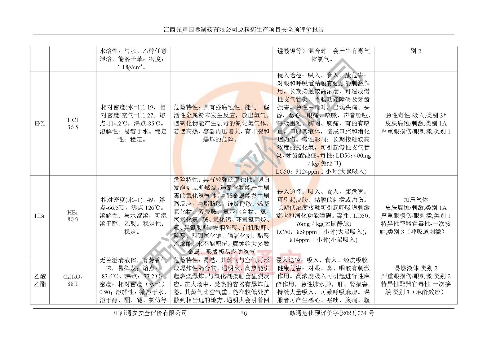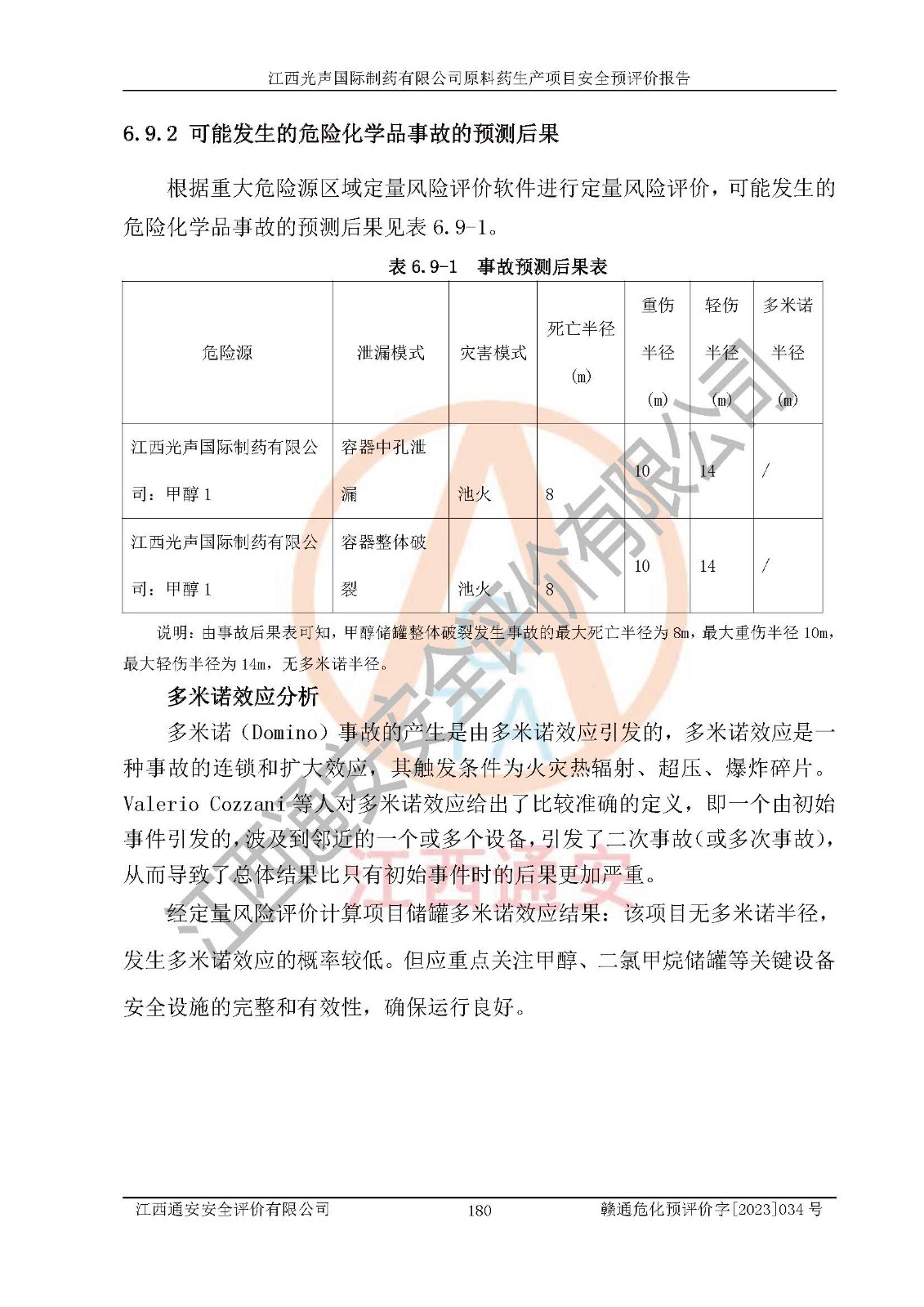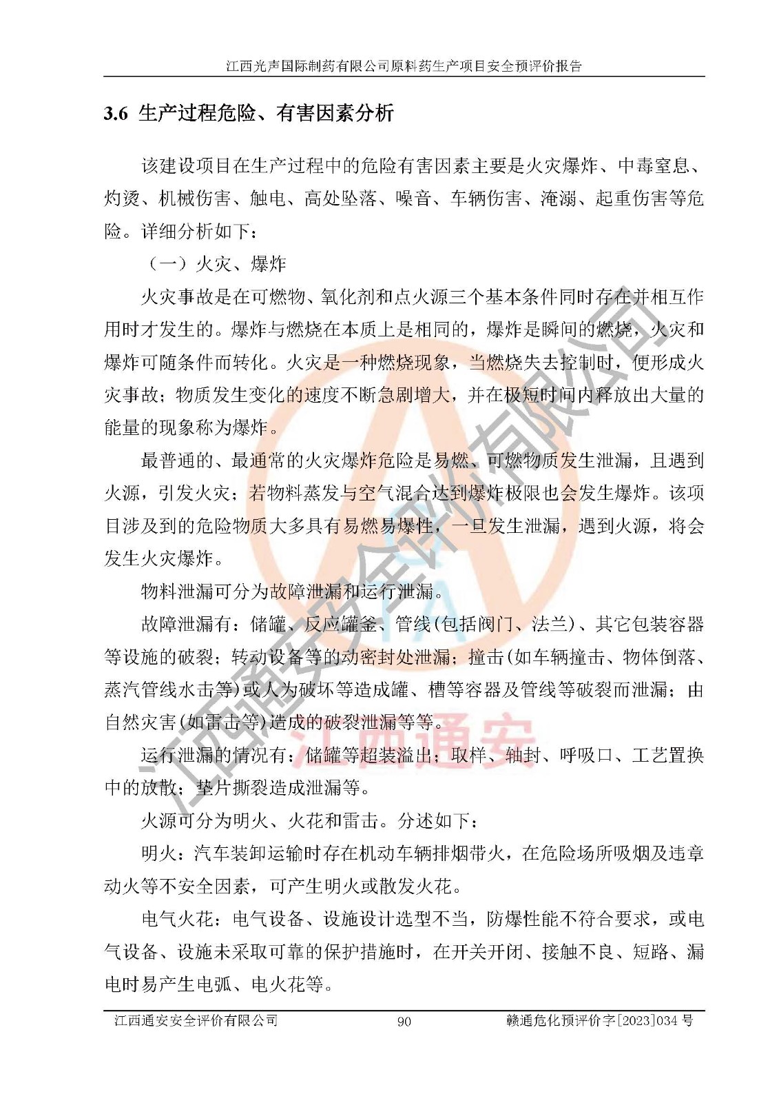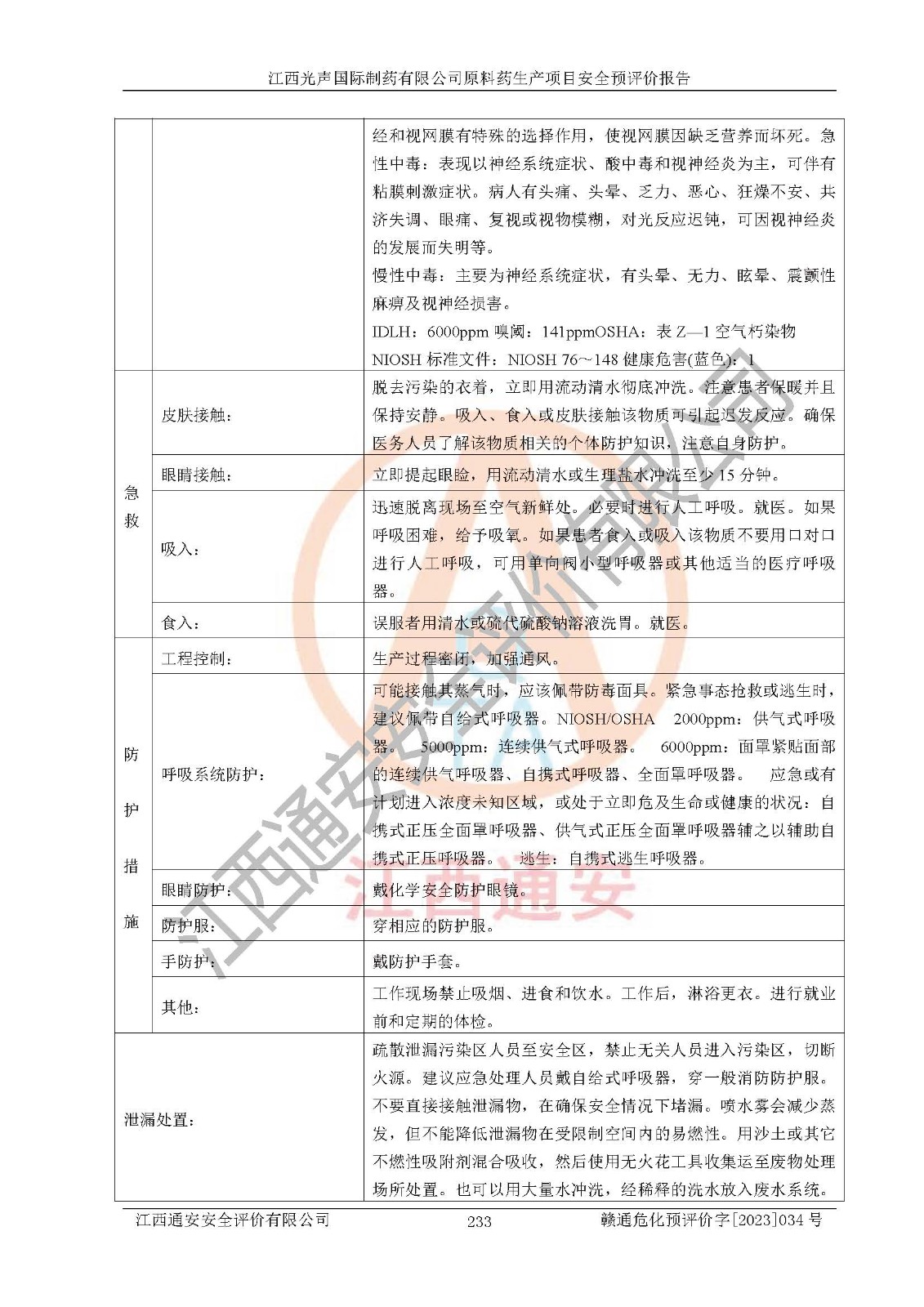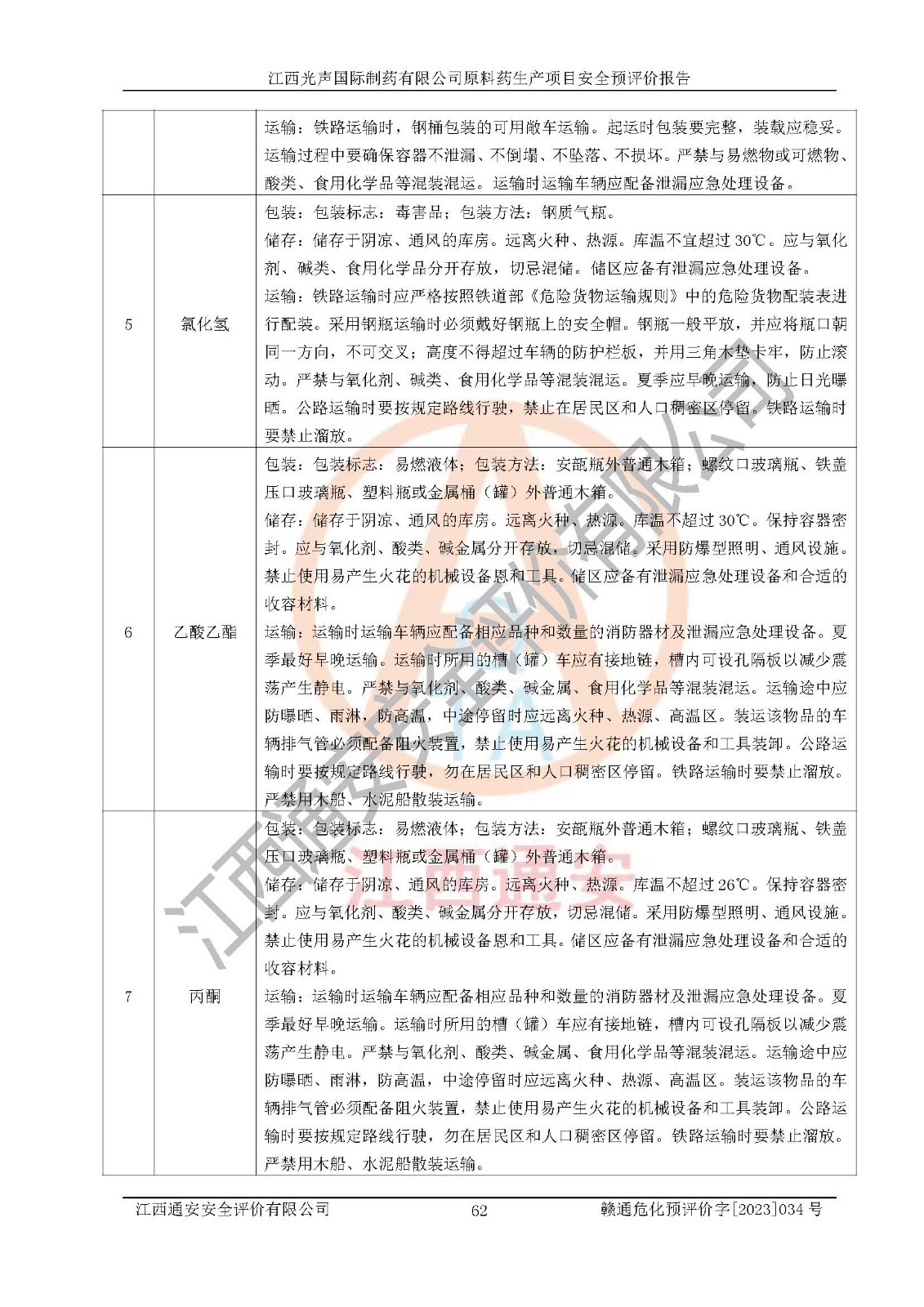 通過對江西光聲**制藥有限公司原料藥生產(chǎn)項目的危險、有害因素分析及定性、定量分析,結果為: 1、該建設項目中所涉及到的危險物質包括甲醇、乙醇、乙酸乙酯、**、三乙胺等易燃液體,在裝置運行和物料儲運過程中存在著易燃液體泄漏引發(fā)的火災爆炸危險;溴化氫屬于有毒氣體,二氯甲烷屬于毒害品,人員意外接觸后存在中毒窒息危險。另外,使用的鹽酸、溴化氫、氫氧化鈉、三乙胺等原料具有腐蝕性,人體意外接觸后易引發(fā)化學灼傷;同時該項目使用的反應釜、離心機、輸料泵等設備如操作不慎還會帶來機械傷害。因此,該項目在建成后的運行過程中存在火災與爆炸、中毒與窒息、觸電、機械傷害、高處墜落、物體打擊、**傷害、起重傷害、灼燙、淹溺、其他傷害等危險因素和化學因素、物理因素等有害因素。 2、重點防范的重大危險、有害因素:通過對該項目存在的危險、有害因素進行分析辨識,在生產(chǎn)過程中重點防范的重大危險、有害因素主要為火災與爆炸、中毒與窒息。 3、預先危險性分析法評價結果:該裝置運行過程中火災、爆炸的危險性等級為Ⅳ級,電氣火災、觸電、中毒窒息、灼燙的危險性為Ⅲ級,機械傷害、高處墜落、**傷害、起重傷害、淹溺、噪聲危害的危險性等級為Ⅱ級。因此,火災、爆炸是該裝置需重點防范的危險有害因素。而引發(fā)火災、爆炸的主要因素是甲醇、乙醇、乙酸乙酯以及三乙胺等可燃物質的泄漏及各類點火源的存在。企業(yè)在今后生產(chǎn)過程中,應將可燃物質的泄漏以及消除點火源做為重點加以控制。 4、危險度評價法的分析結果:該項目5#車間、8#車間、9#車間、罐區(qū)單元的危險等級分別為II級,屬中度危險;4#倉庫單元危險等級分別為Ⅲ級,屬低度危險。 5、重大危險源辨識結果:依據(jù)《危險化學品重大危險源辨識》(GB18218-2018),該擬建項目不構成危險化學品重大危險源。 6、根據(jù)**安全監(jiān)管總局辦公廳《關于公布首批重點監(jiān)管的危險化工工藝目錄的通知》(安監(jiān)總管三[2009]116號)和《**安全監(jiān)管總局關于公布第二批重點監(jiān)管危險化工工藝目錄和調(diào)整首批重點監(jiān)管危險化工工藝中部分典型工藝的通知》安監(jiān)總管三[2013]3號的規(guī)定,該擬建項目不涉及危險化工工藝。 7、特殊危險化學品辨識:該擬建項目涉及的甲醇、乙酸乙酯屬于重點監(jiān)管的危險化學品;擬建項目涉及的**、鹽酸屬于易制毒化學品,涉及的甲醇、乙醇屬于特別管控危險化學品,不涉及監(jiān)控化學品,不涉及易制爆化學品。 綜上所述:江西光聲**制藥有限公司原料藥生產(chǎn)項目符合**、省有關安全生產(chǎn)的法律法規(guī)、規(guī)章、標準、規(guī)范的要求,在以后的初步設計、施工圖設計和建設施工、安裝調(diào)試及生產(chǎn)運行中,如能嚴格執(zhí)行**有關安全生產(chǎn)法律、法規(guī)和有關標準、規(guī)范,認真采納本報告書中安全對策措施及建議,真正做到安全設施與主體工程同時設計、同時施工、同時投入生產(chǎn)和使用的“三同時”,工程的危險、有害因素可得到**控制,風險在可接受范圍內(nèi),具有**的本質安全水平;本建設項目從安全方面分析可行。 |