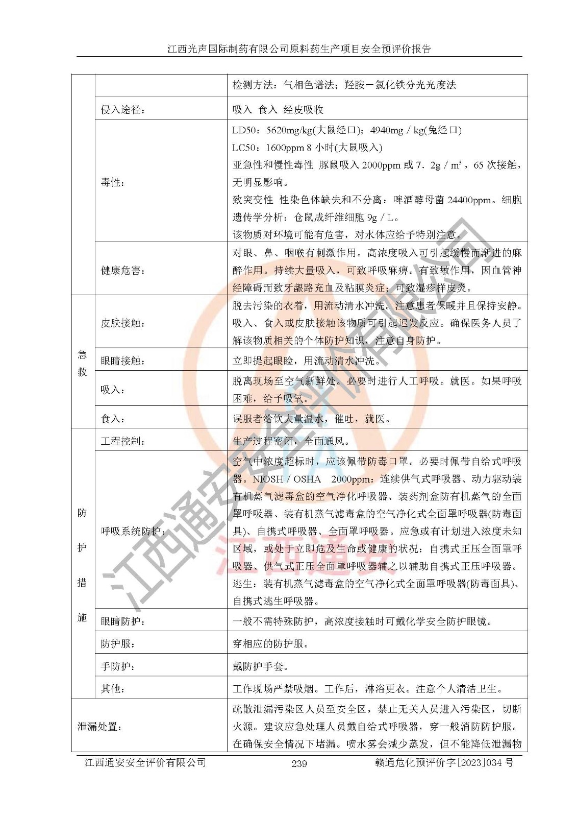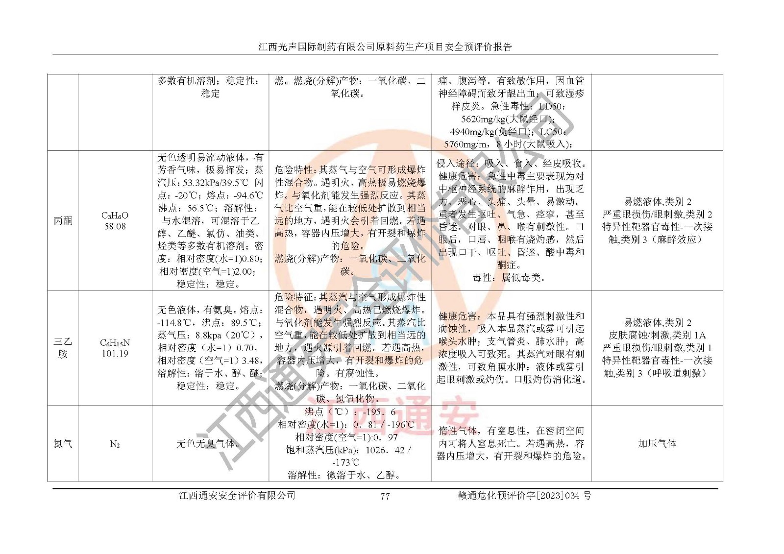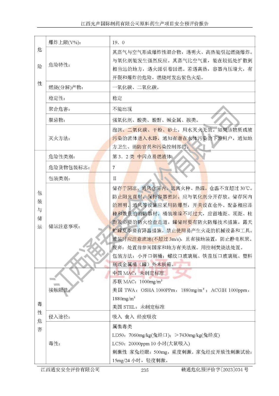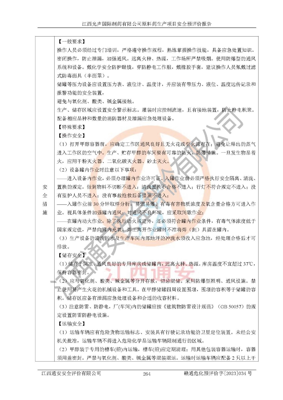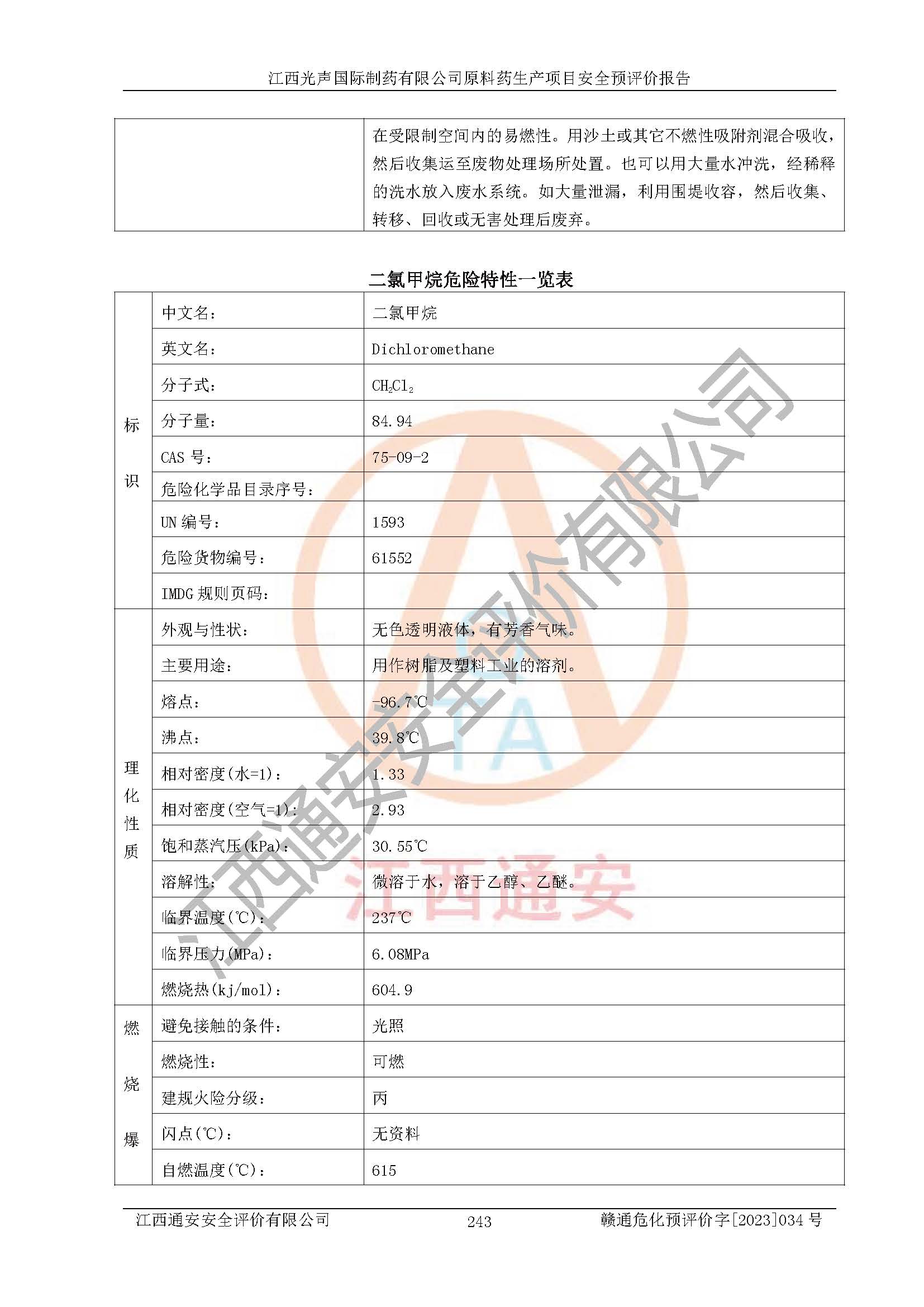 通過對江西光聲**制藥有限公司原料藥生產(chǎn)項目的危險、有害因素分析及定性、定量分析,結果為: 1、該建設項目中所涉及到的危險物質包括甲醇、乙醇、乙酸乙酯、**、三乙胺等易燃液體,在裝置運行和物料儲運過程中存在著易燃液體泄漏引發(fā)的火災爆炸危險;溴化氫屬于有毒氣體,二氯甲烷屬于毒害品,人員意外接觸后存在中毒窒息危險。另外,使用的鹽酸、溴化氫、氫氧化鈉、三乙胺等原料具有腐蝕性,人體意外接觸后易引發(fā)化學灼傷;同時該項目使用的反應釜、離心機、輸料泵等設備如操作不慎還會帶來機械傷害。因此,該項目在建成后的運行過程中存在火災與爆炸、中毒與窒息、觸電、機械傷害、高處墜落、物體打擊、**傷害、起重傷害、灼燙、淹溺、其他傷害等危險因素和化學因素、物理因素等有害因素。 2、重點防范的重大危險、有害因素:通過對該項目存在的危險、有害因素進行分析辨識,在生產(chǎn)過程中重點防范的重大危險、有害因素主要為火災與爆炸、中毒與窒息。 3、預先危險性分析法評價結果:該裝置運行過程中火災、爆炸的危險性等級為Ⅳ級,電氣火災、觸電、中毒窒息、灼燙的危險性為Ⅲ級,機械傷害、高處墜落、**傷害、起重傷害、淹溺、噪聲危害的危險性等級為Ⅱ級。因此,火災、爆炸是該裝置需重點防范的危險有害因素。而引發(fā)火災、爆炸的主要因素是甲醇、乙醇、乙酸乙酯以及三乙胺等可燃物質的泄漏及各類點火源的存在。企業(yè)在今后生產(chǎn)過程中,應將可燃物質的泄漏以及消除點火源做為重點加以控制。 4、危險度評價法的分析結果:該項目5#車間、8#車間、9#車間、罐區(qū)單元的危險等級分別為II級,屬中度危險;4#倉庫單元危險等級分別為Ⅲ級,屬低度危險。 5、重大危險源辨識結果:依據(jù)《危險化學品重大危險源辨識》(GB18218-2018),該擬建項目不構成危險化學品重大危險源。 6、根據(jù)**安全監(jiān)管總局辦公廳《關于公布首批重點監(jiān)管的危險化工工藝目錄的通知》(安監(jiān)總管三[2009]116號)和《**安全監(jiān)管總局關于公布第二批重點監(jiān)管危險化工工藝目錄和調(diào)整首批重點監(jiān)管危險化工工藝中部分典型工藝的通知》安監(jiān)總管三[2013]3號的規(guī)定,該擬建項目不涉及危險化工工藝。 7、特殊危險化學品辨識:該擬建項目涉及的甲醇、乙酸乙酯屬于重點監(jiān)管的危險化學品;擬建項目涉及的**、鹽酸屬于易制毒化學品,涉及的甲醇、乙醇屬于特別管控危險化學品,不涉及監(jiān)控化學品,不涉及易制爆化學品。 綜上所述:江西光聲**制藥有限公司原料藥生產(chǎn)項目符合**、省有關安全生產(chǎn)的法律法規(guī)、規(guī)章、標準、規(guī)范的要求,在以后的初步設計、施工圖設計和建設施工、安裝調(diào)試及生產(chǎn)運行中,如能嚴格執(zhí)行**有關安全生產(chǎn)法律、法規(guī)和有關標準、規(guī)范,認真采納本報告書中安全對策措施及建議,真正做到安全設施與主體工程同時設計、同時施工、同時投入生產(chǎn)和使用的“三同時”,工程的危險、有害因素可得到**控制,風險在可接受范圍內(nèi),具有**的本質安全水平;本建設項目從安全方面分析可行。 |