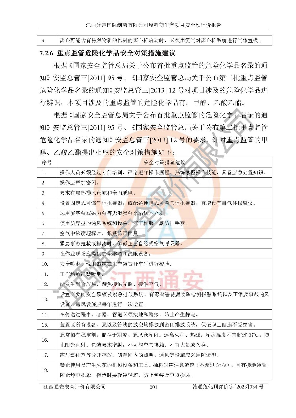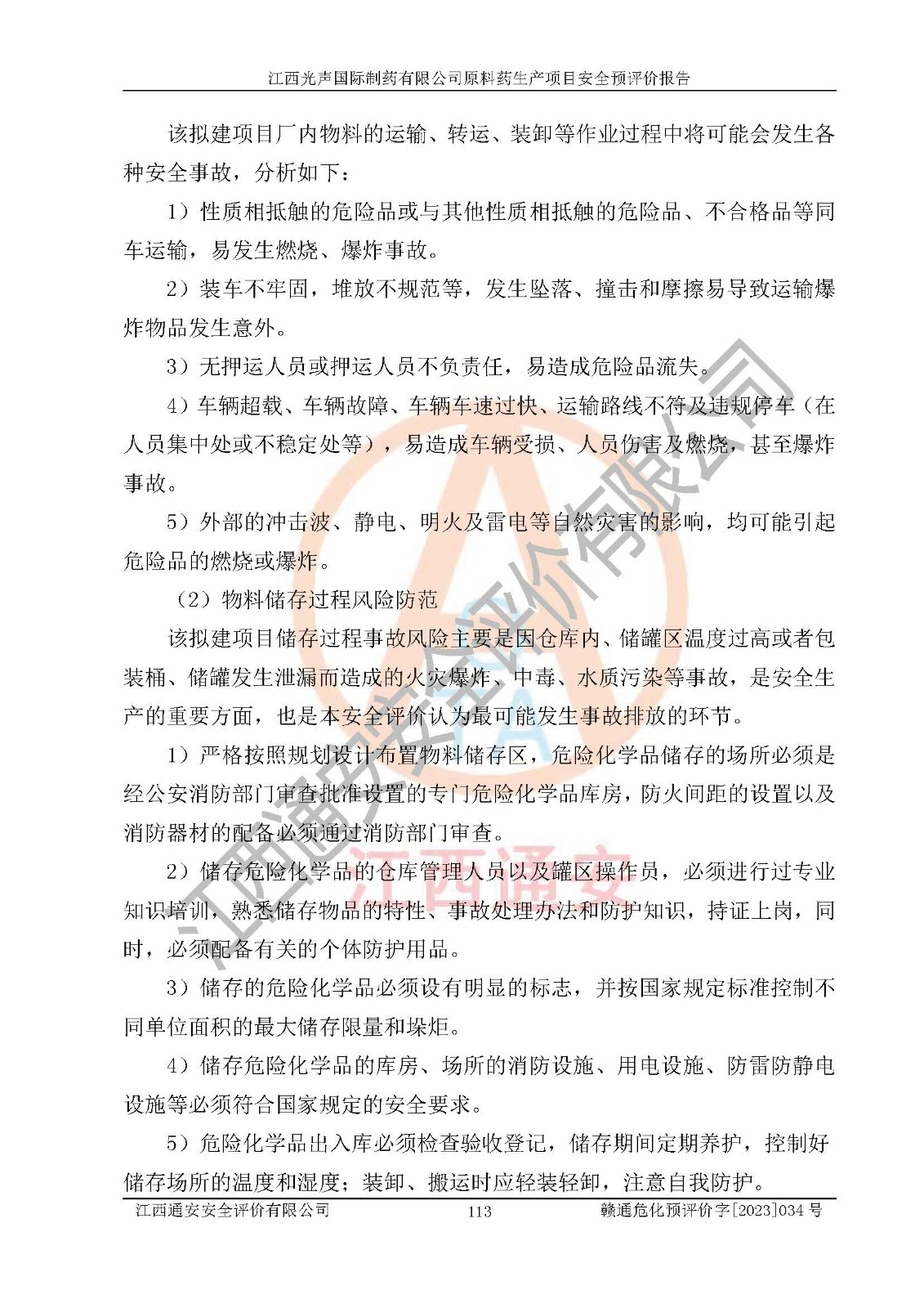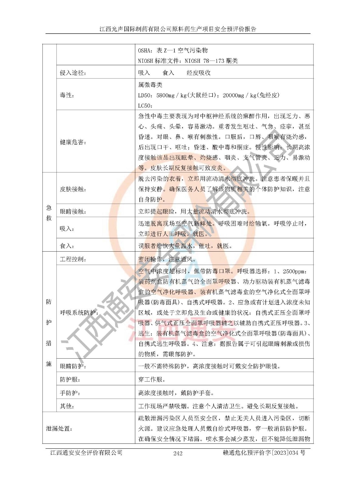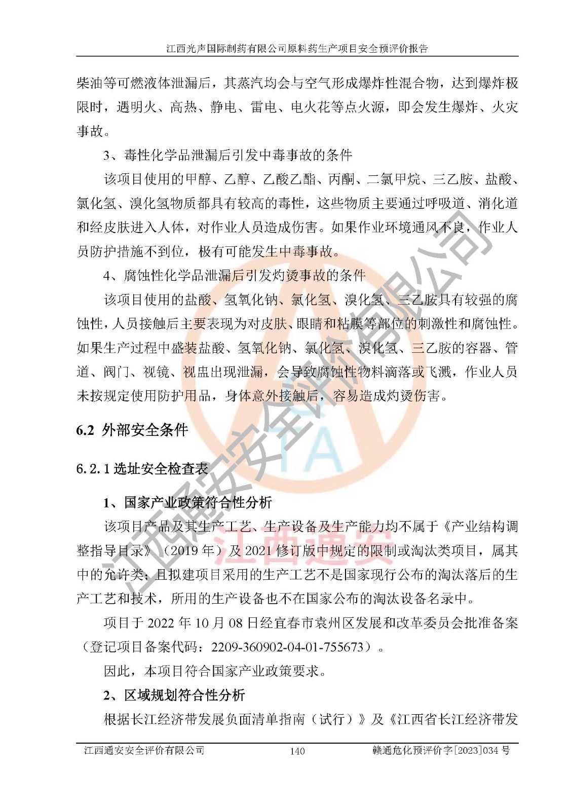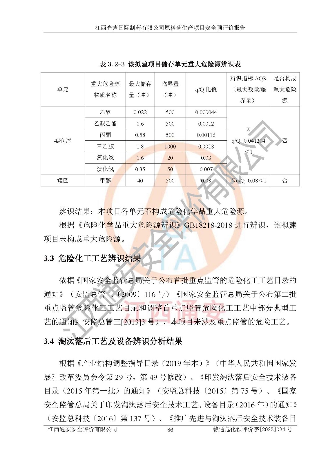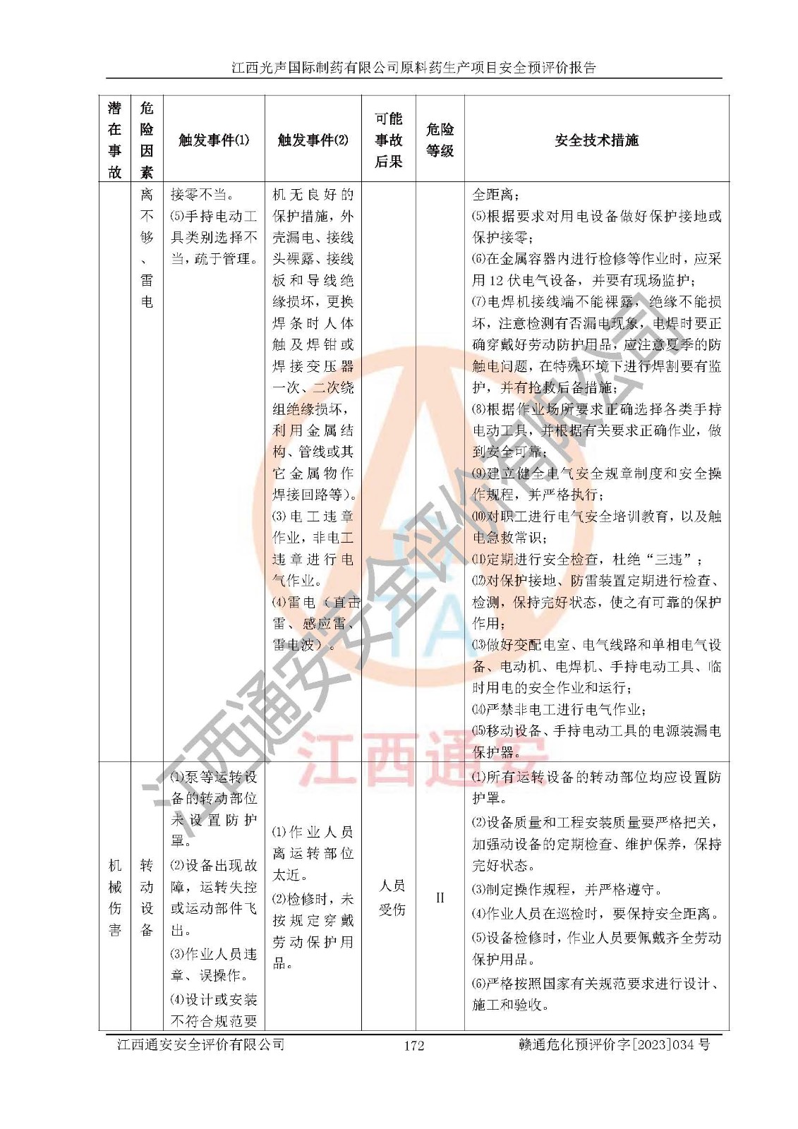 通過對江西光聲**制藥有限公司原料藥生產(chǎn)項目的危險、有害因素分析及定性、定量分析,結果為: 1、該建設項目中所涉及到的危險物質包括甲醇、乙醇、乙酸乙酯、**、三乙胺等易燃液體,在裝置運行和物料儲運過程中存在著易燃液體泄漏引發(fā)的火災爆炸危險;溴化氫屬于有毒氣體,二氯甲烷屬于毒害品,人員意外接觸后存在中毒窒息危險。另外,使用的鹽酸、溴化氫、氫氧化鈉、三乙胺等原料具有腐蝕性,人體意外接觸后易引發(fā)化學灼傷;同時該項目使用的反應釜、離心機、輸料泵等設備如操作不慎還會帶來機械傷害。因此,該項目在建成后的運行過程中存在火災與爆炸、中毒與窒息、觸電、機械傷害、高處墜落、物體打擊、**傷害、起重傷害、灼燙、淹溺、其他傷害等危險因素和化學因素、物理因素等有害因素。 2、重點防范的重大危險、有害因素:通過對該項目存在的危險、有害因素進行分析辨識,在生產(chǎn)過程中重點防范的重大危險、有害因素主要為火災與爆炸、中毒與窒息。 3、預先危險性分析法評價結果:該裝置運行過程中火災、爆炸的危險性等級為Ⅳ級,電氣火災、觸電、中毒窒息、灼燙的危險性為Ⅲ級,機械傷害、高處墜落、**傷害、起重傷害、淹溺、噪聲危害的危險性等級為Ⅱ級。因此,火災、爆炸是該裝置需重點防范的危險有害因素。而引發(fā)火災、爆炸的主要因素是甲醇、乙醇、乙酸乙酯以及三乙胺等可燃物質的泄漏及各類點火源的存在。企業(yè)在今后生產(chǎn)過程中,應將可燃物質的泄漏以及消除點火源做為重點加以控制。 4、危險度評價法的分析結果:該項目5#車間、8#車間、9#車間、罐區(qū)單元的危險等級分別為II級,屬中度危險;4#倉庫單元危險等級分別為Ⅲ級,屬低度危險。 5、重大危險源辨識結果:依據(jù)《危險化學品重大危險源辨識》(GB18218-2018),該擬建項目不構成危險化學品重大危險源。 6、根據(jù)**安全監(jiān)管總局辦公廳《關于公布首批重點監(jiān)管的危險化工工藝目錄的通知》(安監(jiān)總管三[2009]116號)和《**安全監(jiān)管總局關于公布第二批重點監(jiān)管危險化工工藝目錄和調(diào)整首批重點監(jiān)管危險化工工藝中部分典型工藝的通知》安監(jiān)總管三[2013]3號的規(guī)定,該擬建項目不涉及危險化工工藝。 7、特殊危險化學品辨識:該擬建項目涉及的甲醇、乙酸乙酯屬于重點監(jiān)管的危險化學品;擬建項目涉及的**、鹽酸屬于易制毒化學品,涉及的甲醇、乙醇屬于特別管控危險化學品,不涉及監(jiān)控化學品,不涉及易制爆化學品。 綜上所述:江西光聲**制藥有限公司原料藥生產(chǎn)項目符合**、省有關安全生產(chǎn)的法律法規(guī)、規(guī)章、標準、規(guī)范的要求,在以后的初步設計、施工圖設計和建設施工、安裝調(diào)試及生產(chǎn)運行中,如能嚴格執(zhí)行**有關安全生產(chǎn)法律、法規(guī)和有關標準、規(guī)范,認真采納本報告書中安全對策措施及建議,真正做到安全設施與主體工程同時設計、同時施工、同時投入生產(chǎn)和使用的“三同時”,工程的危險、有害因素可得到**控制,風險在可接受范圍內(nèi),具有**的本質安全水平;本建設項目從安全方面分析可行。 |