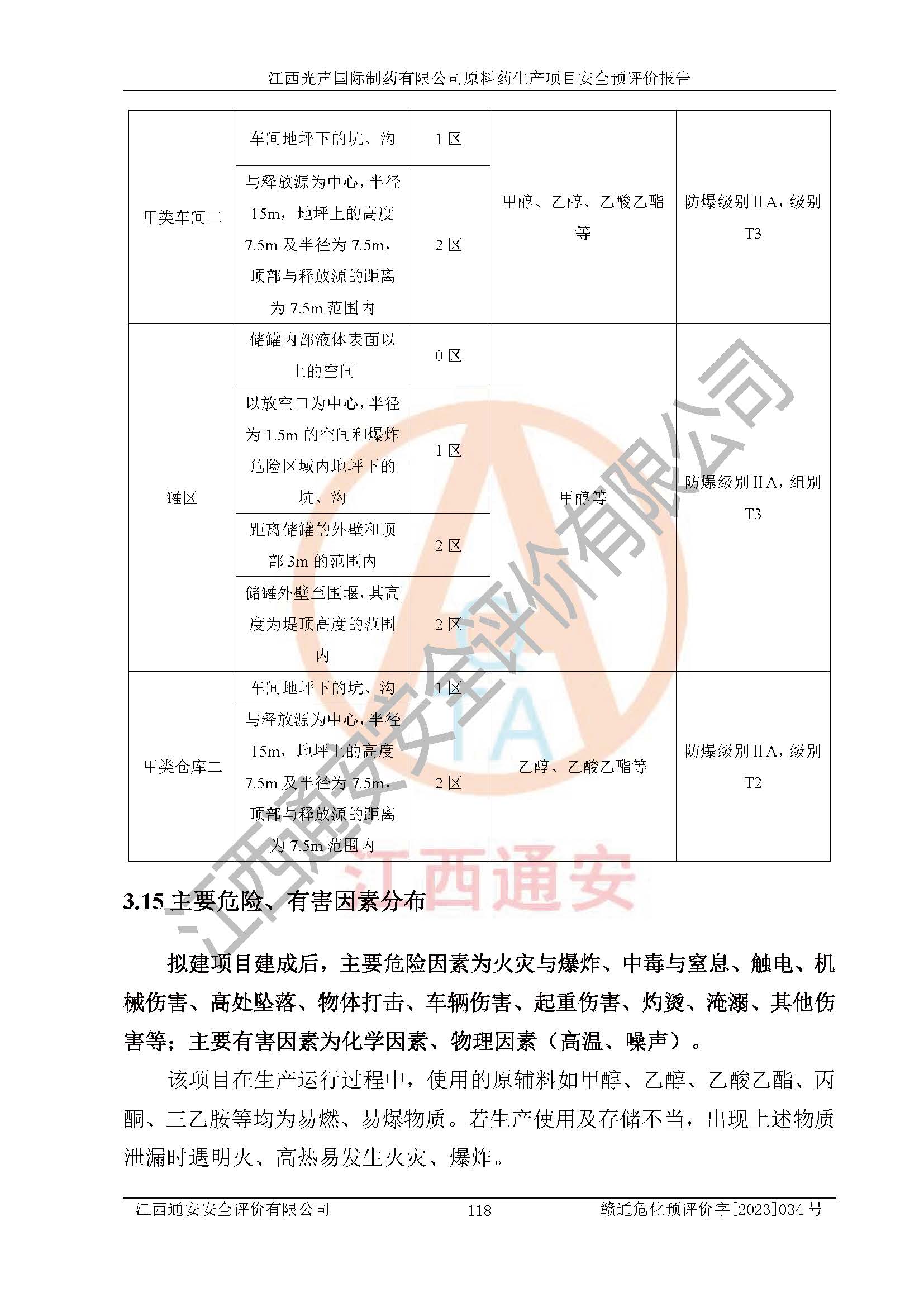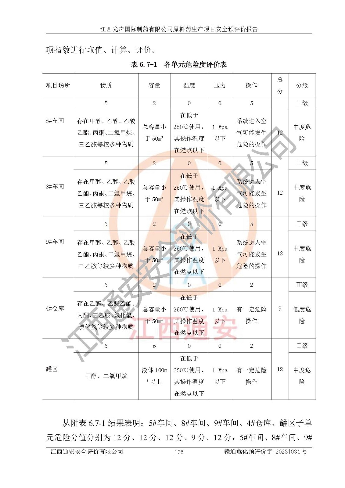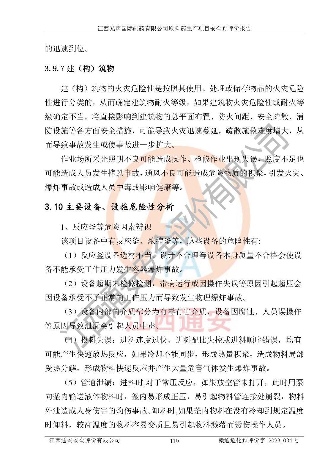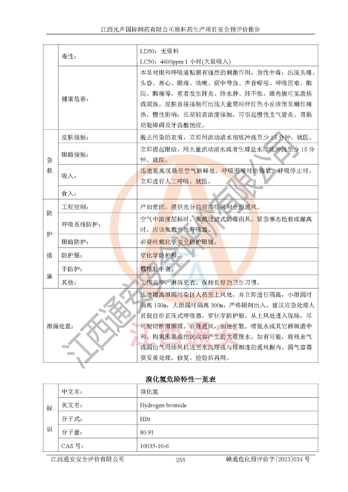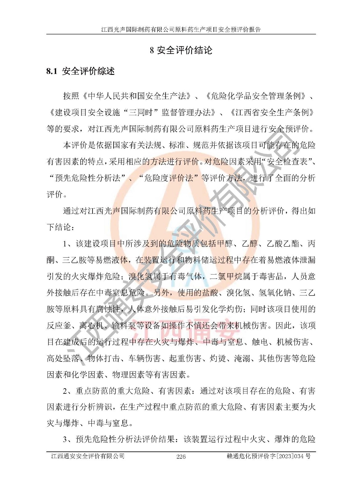 通過對江西光聲**制藥有限公司原料藥生產(chǎn)項目的危險、有害因素分析及定性、定量分析,結果為: 1、該建設項目中所涉及到的危險物質包括甲醇、乙醇、乙酸乙酯、**、三乙胺等易燃液體,在裝置運行和物料儲運過程中存在著易燃液體泄漏引發(fā)的火災爆炸危險;溴化氫屬于有毒氣體,二氯甲烷屬于毒害品,人員意外接觸后存在中毒窒息危險。另外,使用的鹽酸、溴化氫、氫氧化鈉、三乙胺等原料具有腐蝕性,人體意外接觸后易引發(fā)化學灼傷;同時該項目使用的反應釜、離心機、輸料泵等設備如操作不慎還會帶來機械傷害。因此,該項目在建成后的運行過程中存在火災與爆炸、中毒與窒息、觸電、機械傷害、高處墜落、物體打擊、**傷害、起重傷害、灼燙、淹溺、其他傷害等危險因素和化學因素、物理因素等有害因素。 2、重點防范的重大危險、有害因素:通過對該項目存在的危險、有害因素進行分析辨識,在生產(chǎn)過程中重點防范的重大危險、有害因素主要為火災與爆炸、中毒與窒息。 3、預先危險性分析法評價結果:該裝置運行過程中火災、爆炸的危險性等級為Ⅳ級,電氣火災、觸電、中毒窒息、灼燙的危險性為Ⅲ級,機械傷害、高處墜落、**傷害、起重傷害、淹溺、噪聲危害的危險性等級為Ⅱ級。因此,火災、爆炸是該裝置需重點防范的危險有害因素。而引發(fā)火災、爆炸的主要因素是甲醇、乙醇、乙酸乙酯以及三乙胺等可燃物質的泄漏及各類點火源的存在。企業(yè)在今后生產(chǎn)過程中,應將可燃物質的泄漏以及消除點火源做為重點加以控制。 4、危險度評價法的分析結果:該項目5#車間、8#車間、9#車間、罐區(qū)單元的危險等級分別為II級,屬中度危險;4#倉庫單元危險等級分別為Ⅲ級,屬低度危險。 5、重大危險源辨識結果:依據(jù)《危險化學品重大危險源辨識》(GB18218-2018),該擬建項目不構成危險化學品重大危險源。 6、根據(jù)**安全監(jiān)管總局辦公廳《關于公布首批重點監(jiān)管的危險化工工藝目錄的通知》(安監(jiān)總管三[2009]116號)和《**安全監(jiān)管總局關于公布第二批重點監(jiān)管危險化工工藝目錄和調(diào)整首批重點監(jiān)管危險化工工藝中部分典型工藝的通知》安監(jiān)總管三[2013]3號的規(guī)定,該擬建項目不涉及危險化工工藝。 7、特殊危險化學品辨識:該擬建項目涉及的甲醇、乙酸乙酯屬于重點監(jiān)管的危險化學品;擬建項目涉及的**、鹽酸屬于易制毒化學品,涉及的甲醇、乙醇屬于特別管控危險化學品,不涉及監(jiān)控化學品,不涉及易制爆化學品。 綜上所述:江西光聲**制藥有限公司原料藥生產(chǎn)項目符合**、省有關安全生產(chǎn)的法律法規(guī)、規(guī)章、標準、規(guī)范的要求,在以后的初步設計、施工圖設計和建設施工、安裝調(diào)試及生產(chǎn)運行中,如能嚴格執(zhí)行**有關安全生產(chǎn)法律、法規(guī)和有關標準、規(guī)范,認真采納本報告書中安全對策措施及建議,真正做到安全設施與主體工程同時設計、同時施工、同時投入生產(chǎn)和使用的“三同時”,工程的危險、有害因素可得到**控制,風險在可接受范圍內(nèi),具有**的本質安全水平;本建設項目從安全方面分析可行。 |