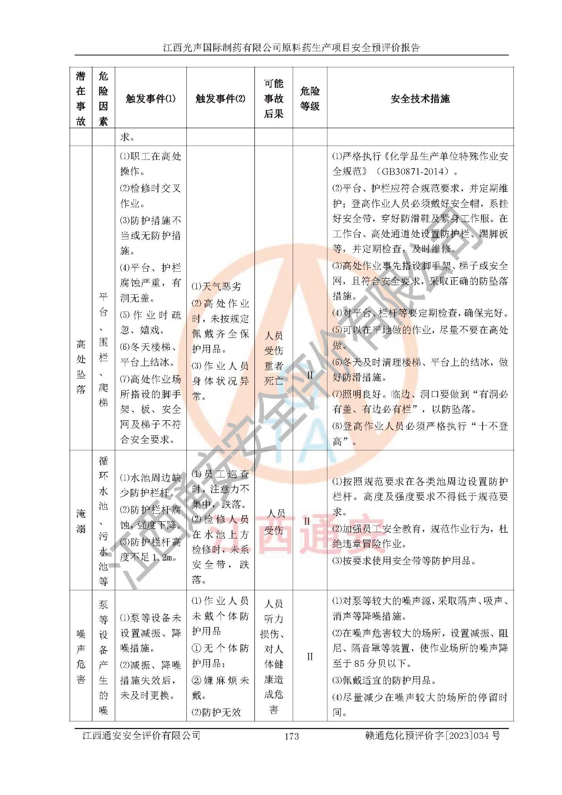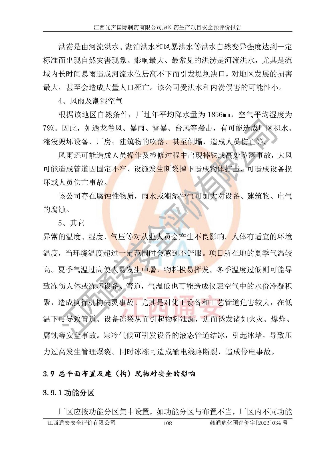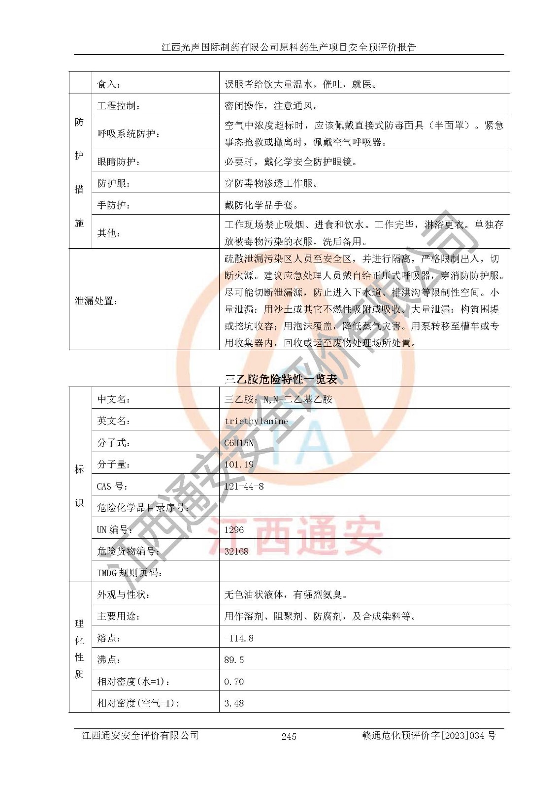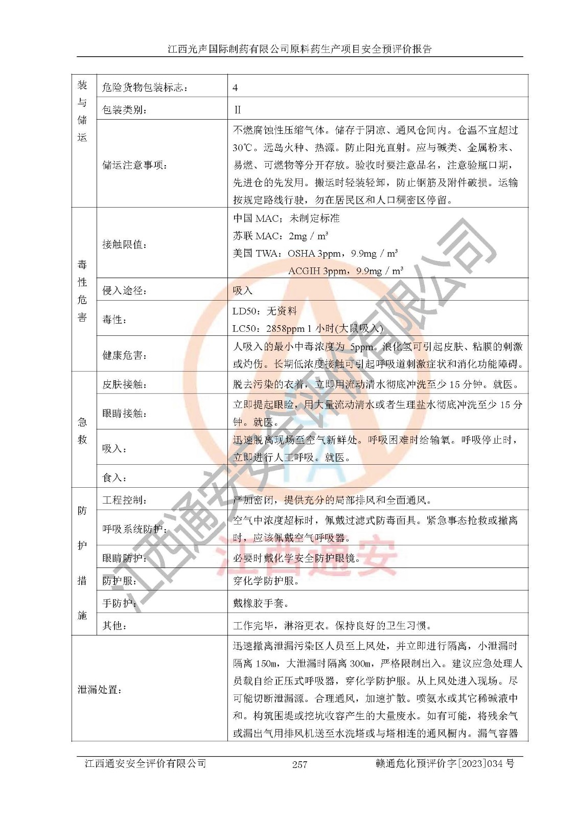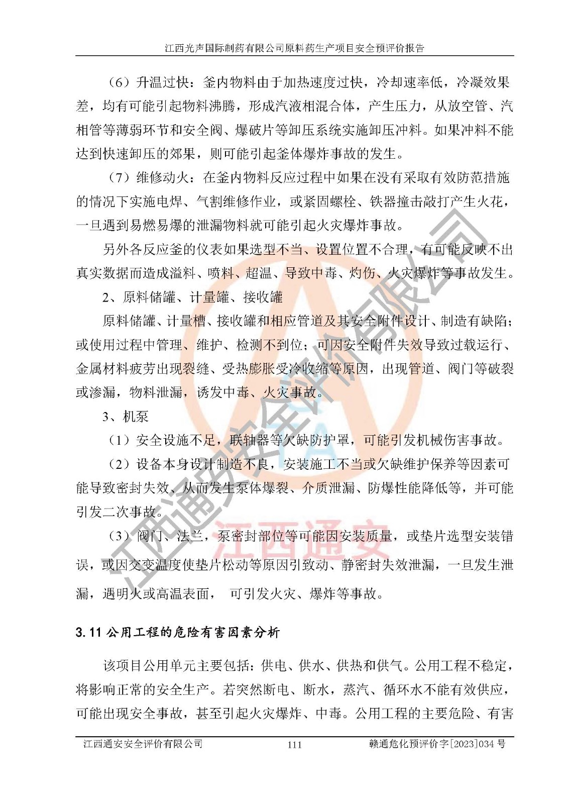 通過對江西光聲**制藥有限公司原料藥生產(chǎn)項目的危險、有害因素分析及定性、定量分析,結果為: 1、該建設項目中所涉及到的危險物質包括甲醇、乙醇、乙酸乙酯、**、三乙胺等易燃液體,在裝置運行和物料儲運過程中存在著易燃液體泄漏引發(fā)的火災爆炸危險;溴化氫屬于有毒氣體,二氯甲烷屬于毒害品,人員意外接觸后存在中毒窒息危險。另外,使用的鹽酸、溴化氫、氫氧化鈉、三乙胺等原料具有腐蝕性,人體意外接觸后易引發(fā)化學灼傷;同時該項目使用的反應釜、離心機、輸料泵等設備如操作不慎還會帶來機械傷害。因此,該項目在建成后的運行過程中存在火災與爆炸、中毒與窒息、觸電、機械傷害、高處墜落、物體打擊、**傷害、起重傷害、灼燙、淹溺、其他傷害等危險因素和化學因素、物理因素等有害因素。 2、重點防范的重大危險、有害因素:通過對該項目存在的危險、有害因素進行分析辨識,在生產(chǎn)過程中重點防范的重大危險、有害因素主要為火災與爆炸、中毒與窒息。 3、預先危險性分析法評價結果:該裝置運行過程中火災、爆炸的危險性等級為Ⅳ級,電氣火災、觸電、中毒窒息、灼燙的危險性為Ⅲ級,機械傷害、高處墜落、**傷害、起重傷害、淹溺、噪聲危害的危險性等級為Ⅱ級。因此,火災、爆炸是該裝置需重點防范的危險有害因素。而引發(fā)火災、爆炸的主要因素是甲醇、乙醇、乙酸乙酯以及三乙胺等可燃物質的泄漏及各類點火源的存在。企業(yè)在今后生產(chǎn)過程中,應將可燃物質的泄漏以及消除點火源做為重點加以控制。 4、危險度評價法的分析結果:該項目5#車間、8#車間、9#車間、罐區(qū)單元的危險等級分別為II級,屬中度危險;4#倉庫單元危險等級分別為Ⅲ級,屬低度危險。 5、重大危險源辨識結果:依據(jù)《危險化學品重大危險源辨識》(GB18218-2018),該擬建項目不構成危險化學品重大危險源。 6、根據(jù)**安全監(jiān)管總局辦公廳《關于公布首批重點監(jiān)管的危險化工工藝目錄的通知》(安監(jiān)總管三[2009]116號)和《**安全監(jiān)管總局關于公布第二批重點監(jiān)管危險化工工藝目錄和調(diào)整首批重點監(jiān)管危險化工工藝中部分典型工藝的通知》安監(jiān)總管三[2013]3號的規(guī)定,該擬建項目不涉及危險化工工藝。 7、特殊危險化學品辨識:該擬建項目涉及的甲醇、乙酸乙酯屬于重點監(jiān)管的危險化學品;擬建項目涉及的**、鹽酸屬于易制毒化學品,涉及的甲醇、乙醇屬于特別管控危險化學品,不涉及監(jiān)控化學品,不涉及易制爆化學品。 綜上所述:江西光聲**制藥有限公司原料藥生產(chǎn)項目符合**、省有關安全生產(chǎn)的法律法規(guī)、規(guī)章、標準、規(guī)范的要求,在以后的初步設計、施工圖設計和建設施工、安裝調(diào)試及生產(chǎn)運行中,如能嚴格執(zhí)行**有關安全生產(chǎn)法律、法規(guī)和有關標準、規(guī)范,認真采納本報告書中安全對策措施及建議,真正做到安全設施與主體工程同時設計、同時施工、同時投入生產(chǎn)和使用的“三同時”,工程的危險、有害因素可得到**控制,風險在可接受范圍內(nèi),具有**的本質安全水平;本建設項目從安全方面分析可行。 |