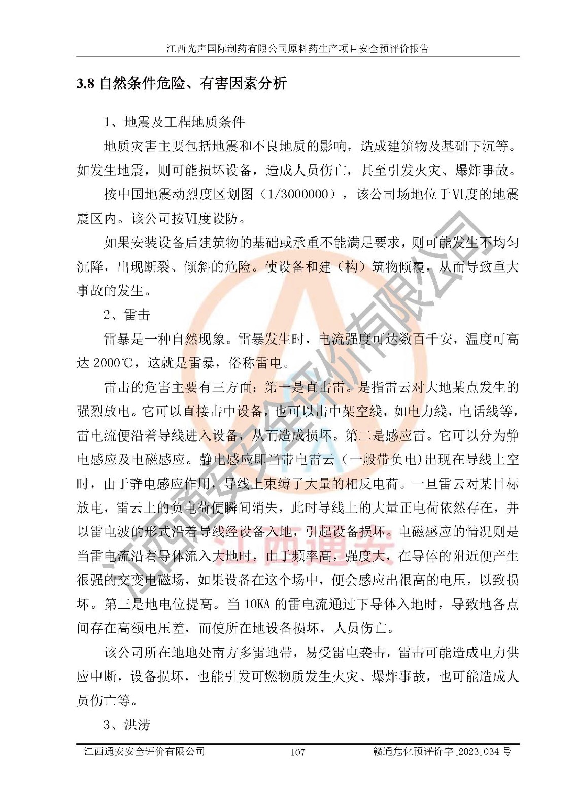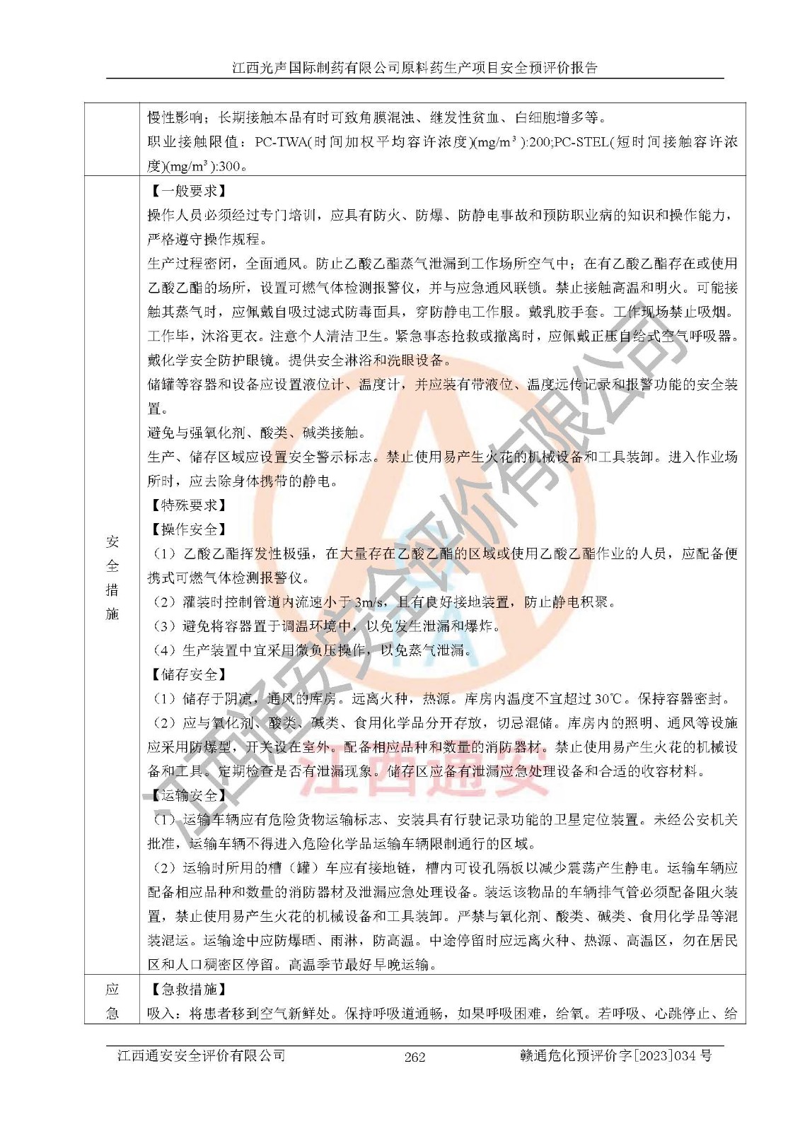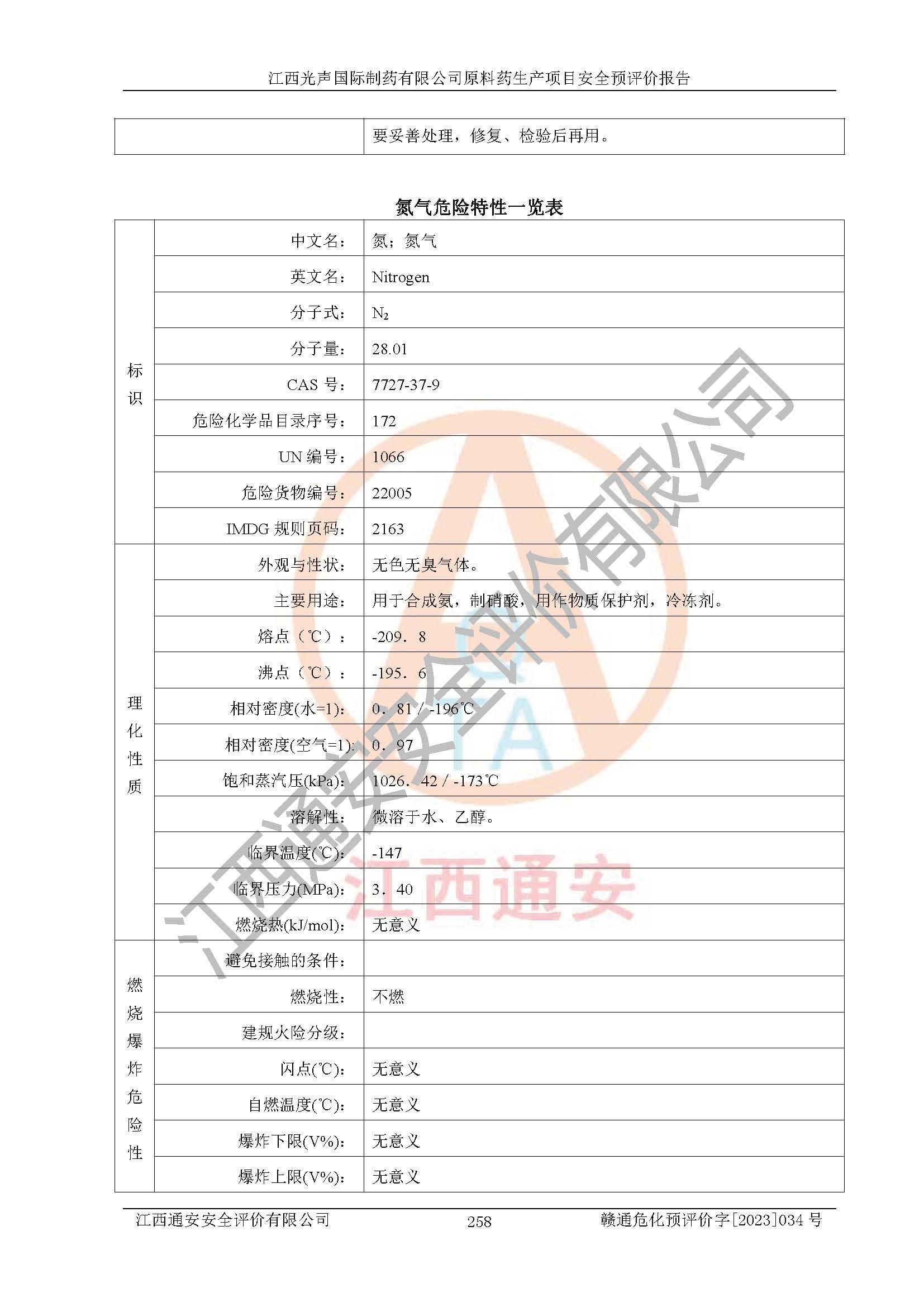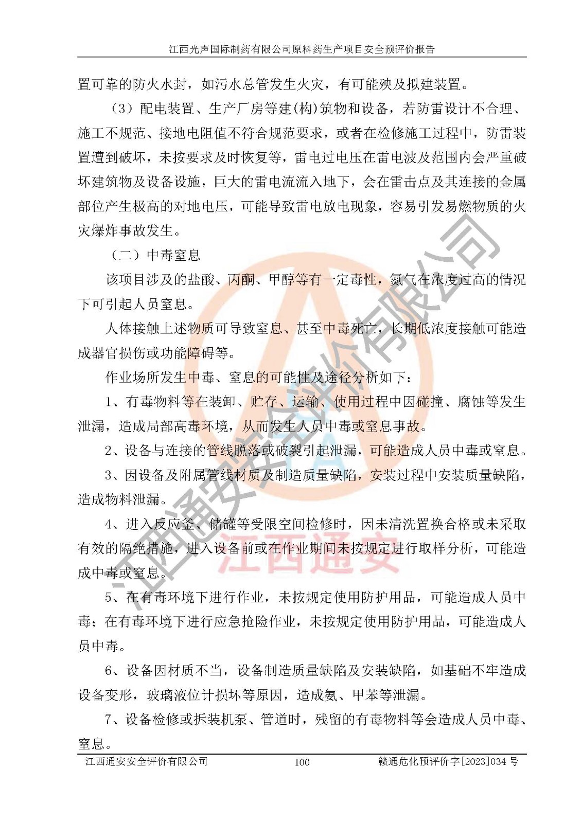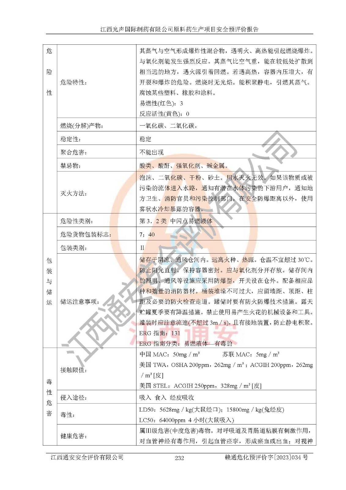 通過對江西光聲**制藥有限公司原料藥生產(chǎn)項目的危險、有害因素分析及定性、定量分析,結果為: 1、該建設項目中所涉及到的危險物質包括甲醇、乙醇、乙酸乙酯、**、三乙胺等易燃液體,在裝置運行和物料儲運過程中存在著易燃液體泄漏引發(fā)的火災爆炸危險;溴化氫屬于有毒氣體,二氯甲烷屬于毒害品,人員意外接觸后存在中毒窒息危險。另外,使用的鹽酸、溴化氫、氫氧化鈉、三乙胺等原料具有腐蝕性,人體意外接觸后易引發(fā)化學灼傷;同時該項目使用的反應釜、離心機、輸料泵等設備如操作不慎還會帶來機械傷害。因此,該項目在建成后的運行過程中存在火災與爆炸、中毒與窒息、觸電、機械傷害、高處墜落、物體打擊、**傷害、起重傷害、灼燙、淹溺、其他傷害等危險因素和化學因素、物理因素等有害因素。 2、重點防范的重大危險、有害因素:通過對該項目存在的危險、有害因素進行分析辨識,在生產(chǎn)過程中重點防范的重大危險、有害因素主要為火災與爆炸、中毒與窒息。 3、預先危險性分析法評價結果:該裝置運行過程中火災、爆炸的危險性等級為Ⅳ級,電氣火災、觸電、中毒窒息、灼燙的危險性為Ⅲ級,機械傷害、高處墜落、**傷害、起重傷害、淹溺、噪聲危害的危險性等級為Ⅱ級。因此,火災、爆炸是該裝置需重點防范的危險有害因素。而引發(fā)火災、爆炸的主要因素是甲醇、乙醇、乙酸乙酯以及三乙胺等可燃物質的泄漏及各類點火源的存在。企業(yè)在今后生產(chǎn)過程中,應將可燃物質的泄漏以及消除點火源做為重點加以控制。 4、危險度評價法的分析結果:該項目5#車間、8#車間、9#車間、罐區(qū)單元的危險等級分別為II級,屬中度危險;4#倉庫單元危險等級分別為Ⅲ級,屬低度危險。 5、重大危險源辨識結果:依據(jù)《危險化學品重大危險源辨識》(GB18218-2018),該擬建項目不構成危險化學品重大危險源。 6、根據(jù)**安全監(jiān)管總局辦公廳《關于公布首批重點監(jiān)管的危險化工工藝目錄的通知》(安監(jiān)總管三[2009]116號)和《**安全監(jiān)管總局關于公布第二批重點監(jiān)管危險化工工藝目錄和調(diào)整首批重點監(jiān)管危險化工工藝中部分典型工藝的通知》安監(jiān)總管三[2013]3號的規(guī)定,該擬建項目不涉及危險化工工藝。 7、特殊危險化學品辨識:該擬建項目涉及的甲醇、乙酸乙酯屬于重點監(jiān)管的危險化學品;擬建項目涉及的**、鹽酸屬于易制毒化學品,涉及的甲醇、乙醇屬于特別管控危險化學品,不涉及監(jiān)控化學品,不涉及易制爆化學品。 綜上所述:江西光聲**制藥有限公司原料藥生產(chǎn)項目符合**、省有關安全生產(chǎn)的法律法規(guī)、規(guī)章、標準、規(guī)范的要求,在以后的初步設計、施工圖設計和建設施工、安裝調(diào)試及生產(chǎn)運行中,如能嚴格執(zhí)行**有關安全生產(chǎn)法律、法規(guī)和有關標準、規(guī)范,認真采納本報告書中安全對策措施及建議,真正做到安全設施與主體工程同時設計、同時施工、同時投入生產(chǎn)和使用的“三同時”,工程的危險、有害因素可得到**控制,風險在可接受范圍內(nèi),具有**的本質安全水平;本建設項目從安全方面分析可行。 |