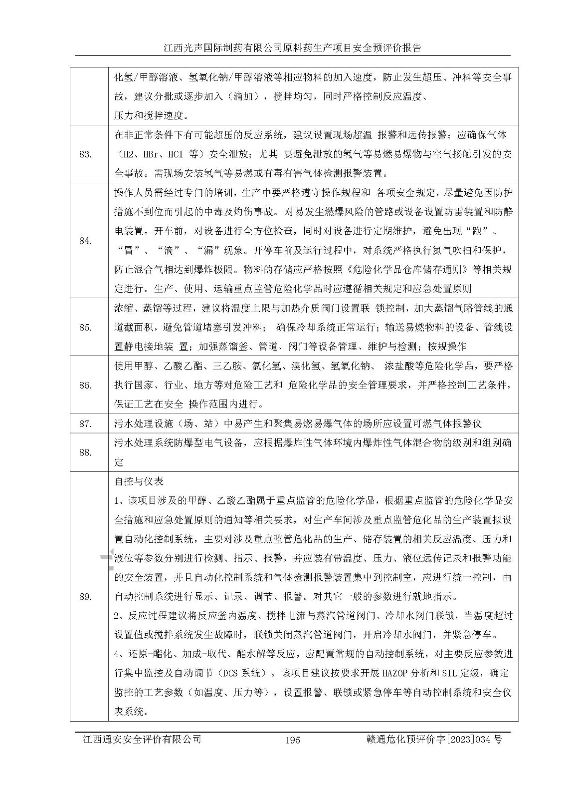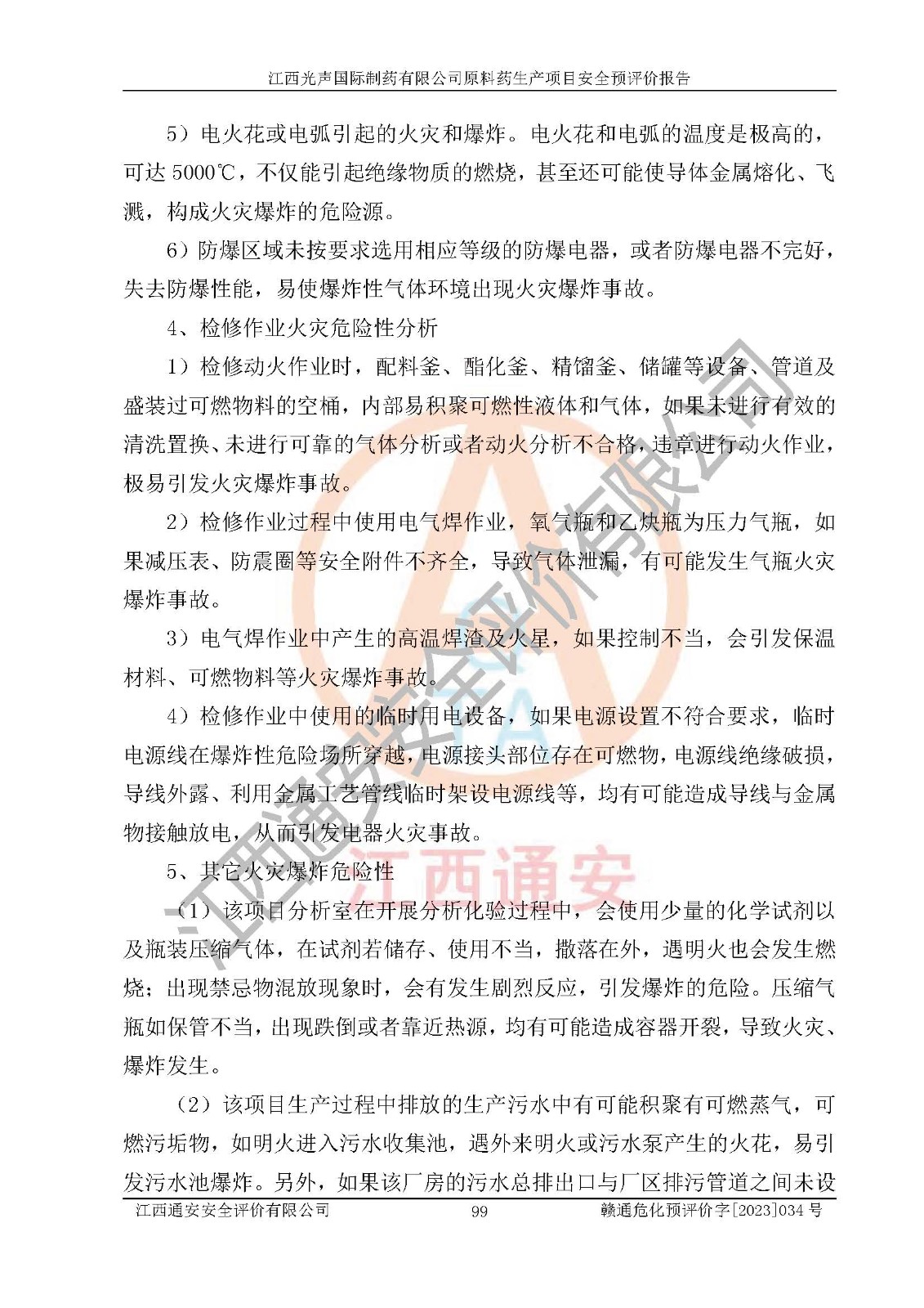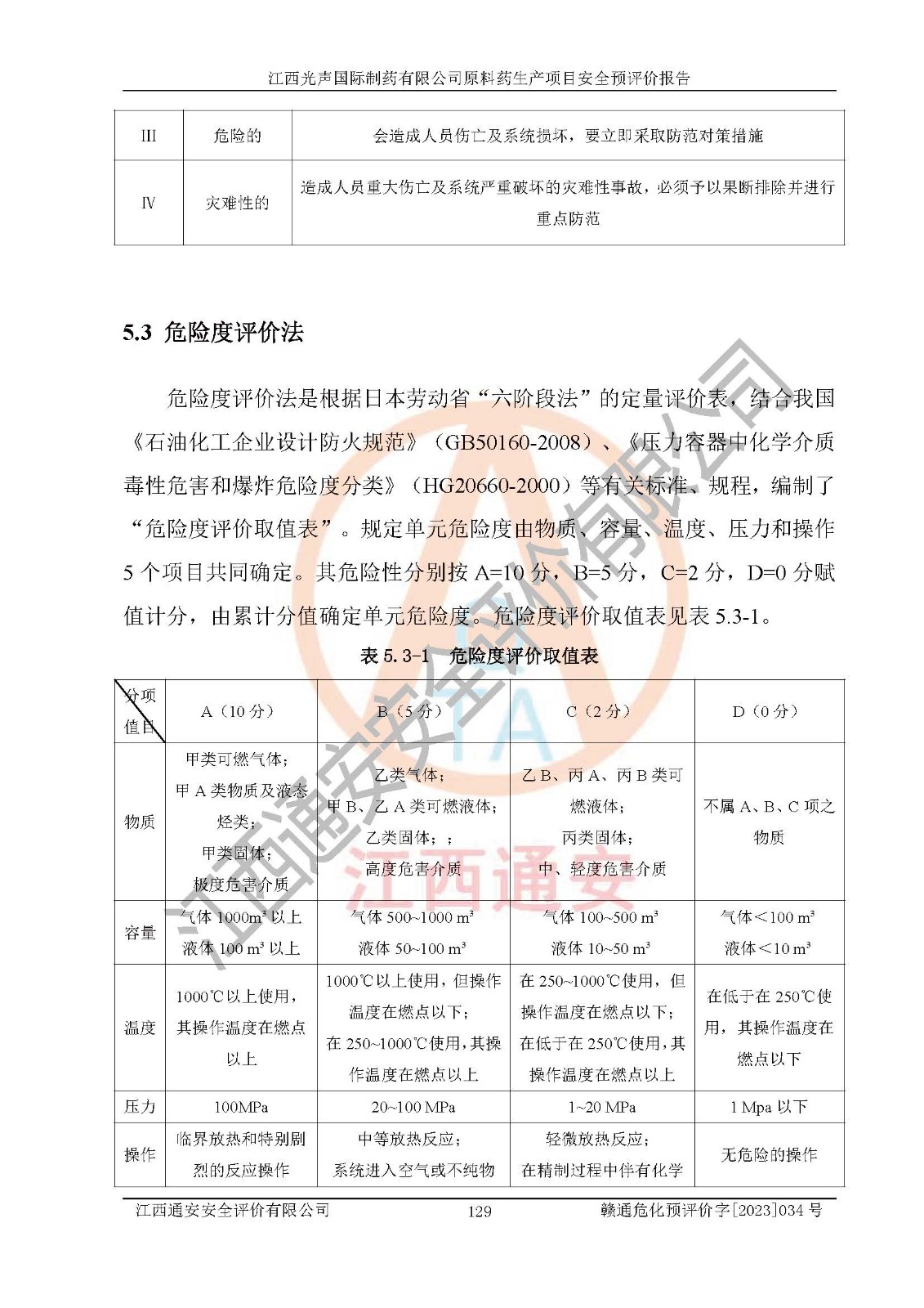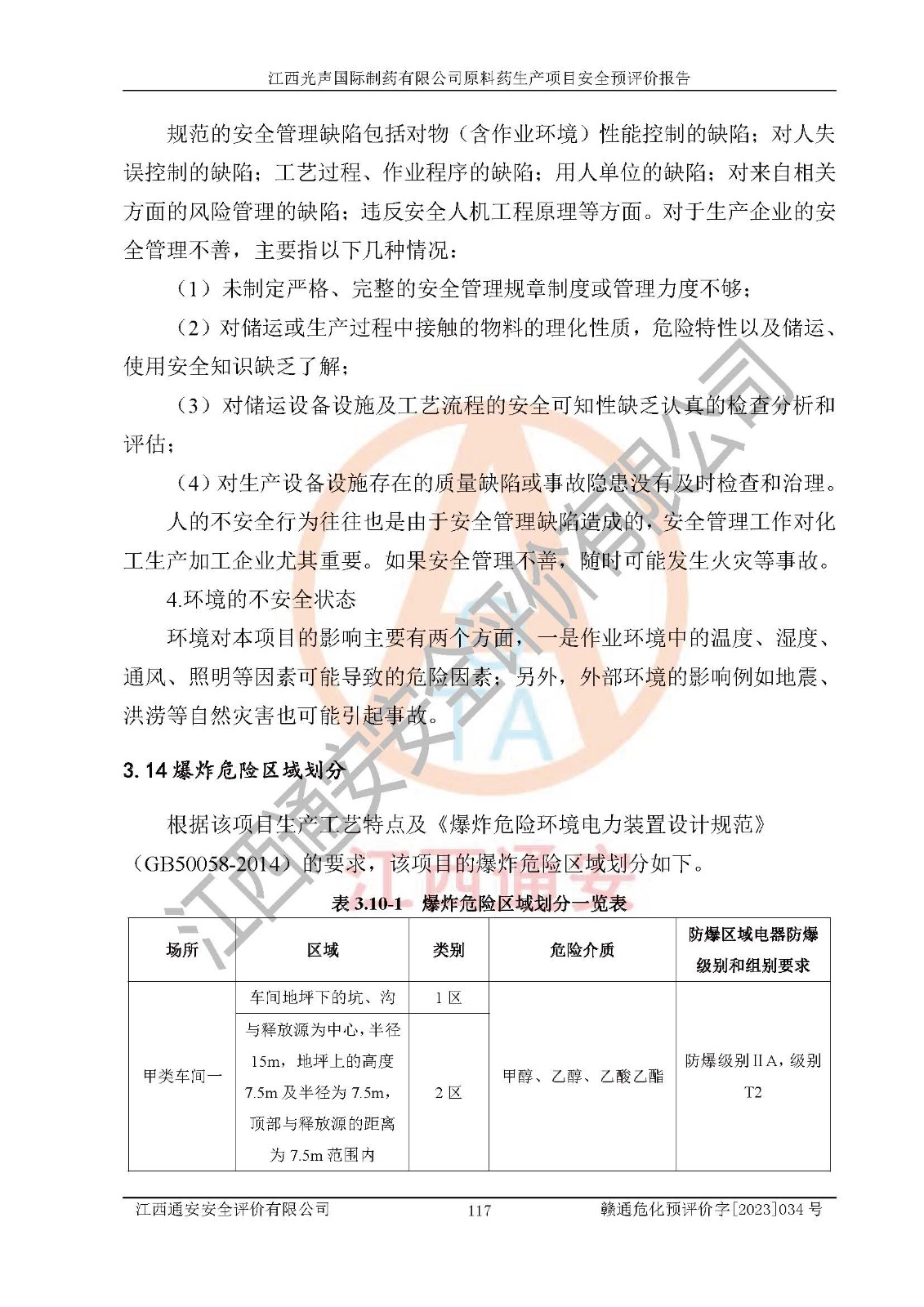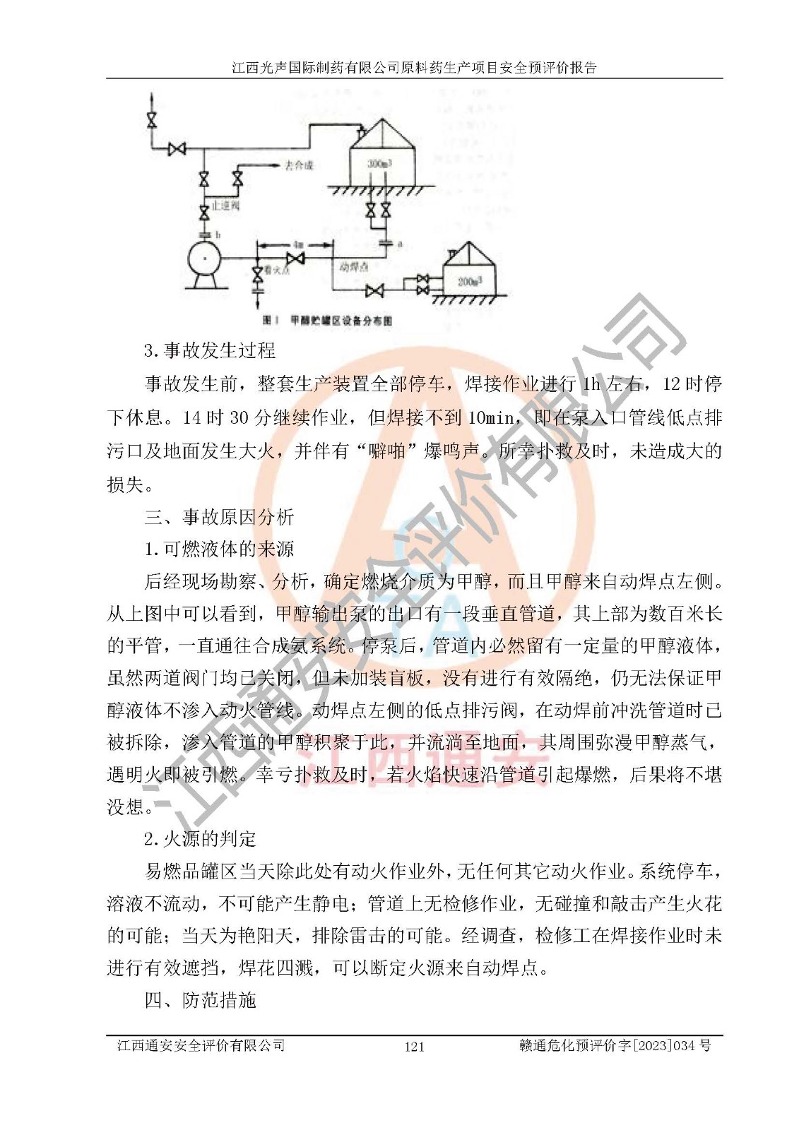 通過對江西光聲**制藥有限公司原料藥生產(chǎn)項目的危險、有害因素分析及定性、定量分析,結果為: 1、該建設項目中所涉及到的危險物質包括甲醇、乙醇、乙酸乙酯、**、三乙胺等易燃液體,在裝置運行和物料儲運過程中存在著易燃液體泄漏引發(fā)的火災爆炸危險;溴化氫屬于有毒氣體,二氯甲烷屬于毒害品,人員意外接觸后存在中毒窒息危險。另外,使用的鹽酸、溴化氫、氫氧化鈉、三乙胺等原料具有腐蝕性,人體意外接觸后易引發(fā)化學灼傷;同時該項目使用的反應釜、離心機、輸料泵等設備如操作不慎還會帶來機械傷害。因此,該項目在建成后的運行過程中存在火災與爆炸、中毒與窒息、觸電、機械傷害、高處墜落、物體打擊、**傷害、起重傷害、灼燙、淹溺、其他傷害等危險因素和化學因素、物理因素等有害因素。 2、重點防范的重大危險、有害因素:通過對該項目存在的危險、有害因素進行分析辨識,在生產(chǎn)過程中重點防范的重大危險、有害因素主要為火災與爆炸、中毒與窒息。 3、預先危險性分析法評價結果:該裝置運行過程中火災、爆炸的危險性等級為Ⅳ級,電氣火災、觸電、中毒窒息、灼燙的危險性為Ⅲ級,機械傷害、高處墜落、**傷害、起重傷害、淹溺、噪聲危害的危險性等級為Ⅱ級。因此,火災、爆炸是該裝置需重點防范的危險有害因素。而引發(fā)火災、爆炸的主要因素是甲醇、乙醇、乙酸乙酯以及三乙胺等可燃物質的泄漏及各類點火源的存在。企業(yè)在今后生產(chǎn)過程中,應將可燃物質的泄漏以及消除點火源做為重點加以控制。 4、危險度評價法的分析結果:該項目5#車間、8#車間、9#車間、罐區(qū)單元的危險等級分別為II級,屬中度危險;4#倉庫單元危險等級分別為Ⅲ級,屬低度危險。 5、重大危險源辨識結果:依據(jù)《危險化學品重大危險源辨識》(GB18218-2018),該擬建項目不構成危險化學品重大危險源。 6、根據(jù)**安全監(jiān)管總局辦公廳《關于公布首批重點監(jiān)管的危險化工工藝目錄的通知》(安監(jiān)總管三[2009]116號)和《**安全監(jiān)管總局關于公布第二批重點監(jiān)管危險化工工藝目錄和調(diào)整首批重點監(jiān)管危險化工工藝中部分典型工藝的通知》安監(jiān)總管三[2013]3號的規(guī)定,該擬建項目不涉及危險化工工藝。 7、特殊危險化學品辨識:該擬建項目涉及的甲醇、乙酸乙酯屬于重點監(jiān)管的危險化學品;擬建項目涉及的**、鹽酸屬于易制毒化學品,涉及的甲醇、乙醇屬于特別管控危險化學品,不涉及監(jiān)控化學品,不涉及易制爆化學品。 綜上所述:江西光聲**制藥有限公司原料藥生產(chǎn)項目符合**、省有關安全生產(chǎn)的法律法規(guī)、規(guī)章、標準、規(guī)范的要求,在以后的初步設計、施工圖設計和建設施工、安裝調(diào)試及生產(chǎn)運行中,如能嚴格執(zhí)行**有關安全生產(chǎn)法律、法規(guī)和有關標準、規(guī)范,認真采納本報告書中安全對策措施及建議,真正做到安全設施與主體工程同時設計、同時施工、同時投入生產(chǎn)和使用的“三同時”,工程的危險、有害因素可得到**控制,風險在可接受范圍內(nèi),具有**的本質安全水平;本建設項目從安全方面分析可行。 |