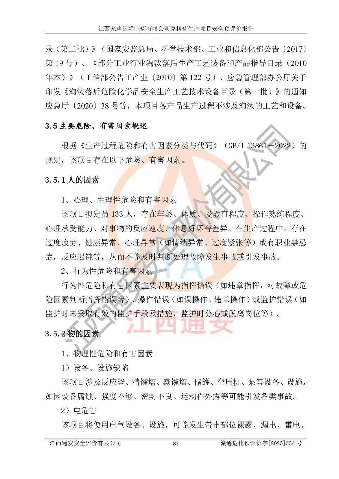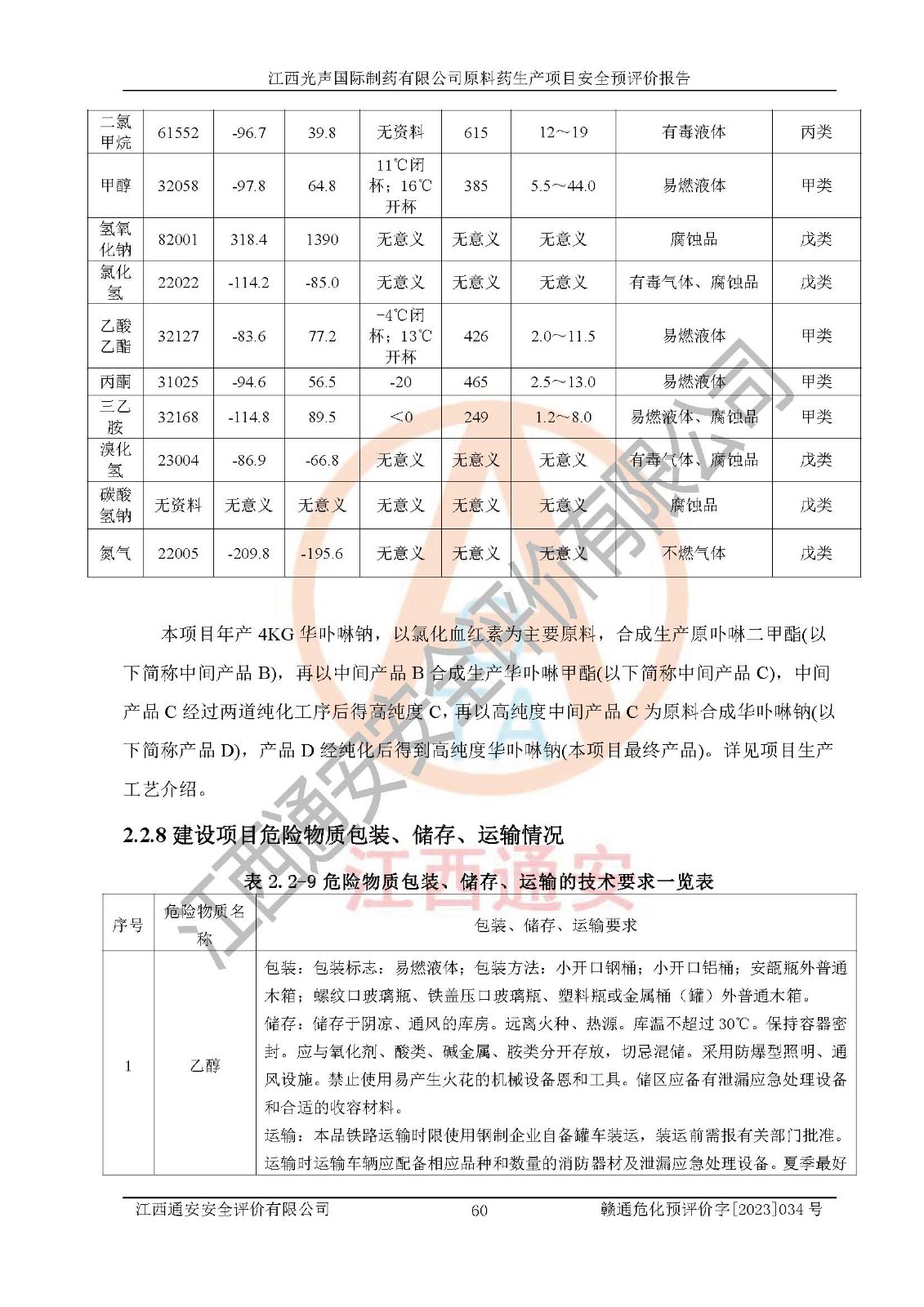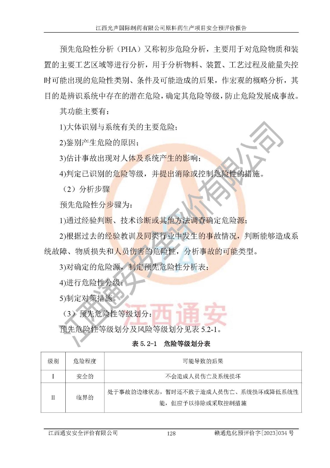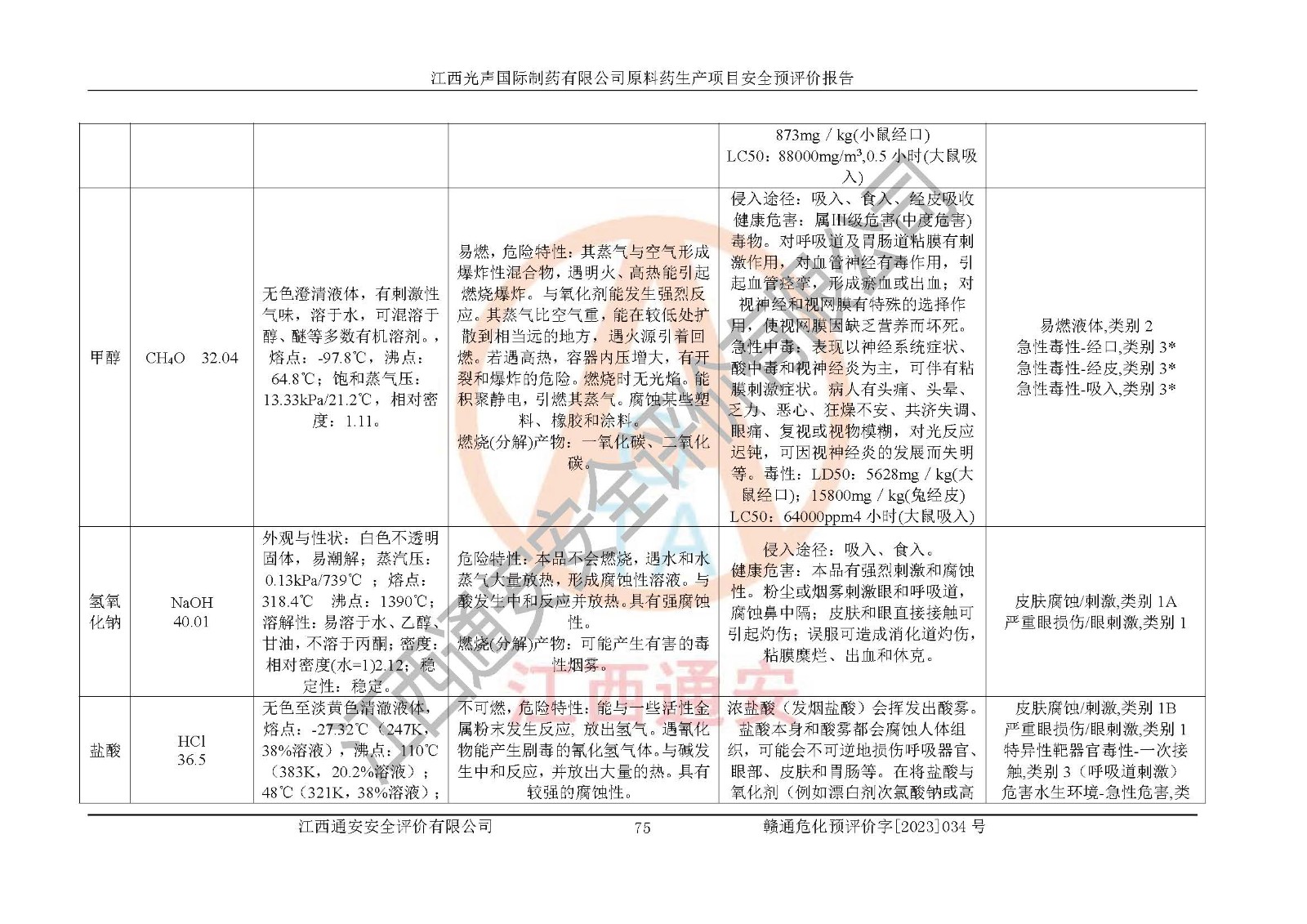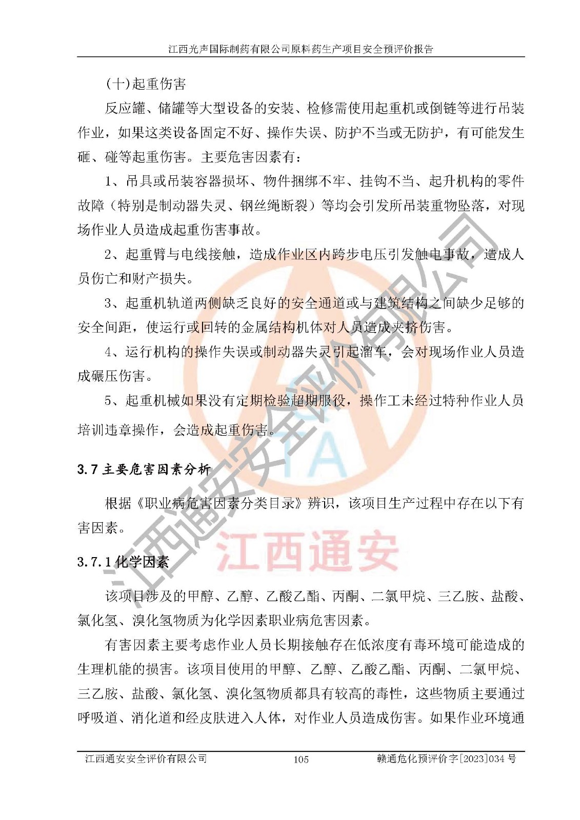 通過對江西光聲**制藥有限公司原料藥生產(chǎn)項目的危險、有害因素分析及定性、定量分析,結果為: 1、該建設項目中所涉及到的危險物質包括甲醇、乙醇、乙酸乙酯、**、三乙胺等易燃液體,在裝置運行和物料儲運過程中存在著易燃液體泄漏引發(fā)的火災爆炸危險;溴化氫屬于有毒氣體,二氯甲烷屬于毒害品,人員意外接觸后存在中毒窒息危險。另外,使用的鹽酸、溴化氫、氫氧化鈉、三乙胺等原料具有腐蝕性,人體意外接觸后易引發(fā)化學灼傷;同時該項目使用的反應釜、離心機、輸料泵等設備如操作不慎還會帶來機械傷害。因此,該項目在建成后的運行過程中存在火災與爆炸、中毒與窒息、觸電、機械傷害、高處墜落、物體打擊、**傷害、起重傷害、灼燙、淹溺、其他傷害等危險因素和化學因素、物理因素等有害因素。 2、重點防范的重大危險、有害因素:通過對該項目存在的危險、有害因素進行分析辨識,在生產(chǎn)過程中重點防范的重大危險、有害因素主要為火災與爆炸、中毒與窒息。 3、預先危險性分析法評價結果:該裝置運行過程中火災、爆炸的危險性等級為Ⅳ級,電氣火災、觸電、中毒窒息、灼燙的危險性為Ⅲ級,機械傷害、高處墜落、**傷害、起重傷害、淹溺、噪聲危害的危險性等級為Ⅱ級。因此,火災、爆炸是該裝置需重點防范的危險有害因素。而引發(fā)火災、爆炸的主要因素是甲醇、乙醇、乙酸乙酯以及三乙胺等可燃物質的泄漏及各類點火源的存在。企業(yè)在今后生產(chǎn)過程中,應將可燃物質的泄漏以及消除點火源做為重點加以控制。 4、危險度評價法的分析結果:該項目5#車間、8#車間、9#車間、罐區(qū)單元的危險等級分別為II級,屬中度危險;4#倉庫單元危險等級分別為Ⅲ級,屬低度危險。 5、重大危險源辨識結果:依據(jù)《危險化學品重大危險源辨識》(GB18218-2018),該擬建項目不構成危險化學品重大危險源。 6、根據(jù)**安全監(jiān)管總局辦公廳《關于公布首批重點監(jiān)管的危險化工工藝目錄的通知》(安監(jiān)總管三[2009]116號)和《**安全監(jiān)管總局關于公布第二批重點監(jiān)管危險化工工藝目錄和調(diào)整首批重點監(jiān)管危險化工工藝中部分典型工藝的通知》安監(jiān)總管三[2013]3號的規(guī)定,該擬建項目不涉及危險化工工藝。 7、特殊危險化學品辨識:該擬建項目涉及的甲醇、乙酸乙酯屬于重點監(jiān)管的危險化學品;擬建項目涉及的**、鹽酸屬于易制毒化學品,涉及的甲醇、乙醇屬于特別管控危險化學品,不涉及監(jiān)控化學品,不涉及易制爆化學品。 綜上所述:江西光聲**制藥有限公司原料藥生產(chǎn)項目符合**、省有關安全生產(chǎn)的法律法規(guī)、規(guī)章、標準、規(guī)范的要求,在以后的初步設計、施工圖設計和建設施工、安裝調(diào)試及生產(chǎn)運行中,如能嚴格執(zhí)行**有關安全生產(chǎn)法律、法規(guī)和有關標準、規(guī)范,認真采納本報告書中安全對策措施及建議,真正做到安全設施與主體工程同時設計、同時施工、同時投入生產(chǎn)和使用的“三同時”,工程的危險、有害因素可得到**控制,風險在可接受范圍內(nèi),具有**的本質安全水平;本建設項目從安全方面分析可行。 |