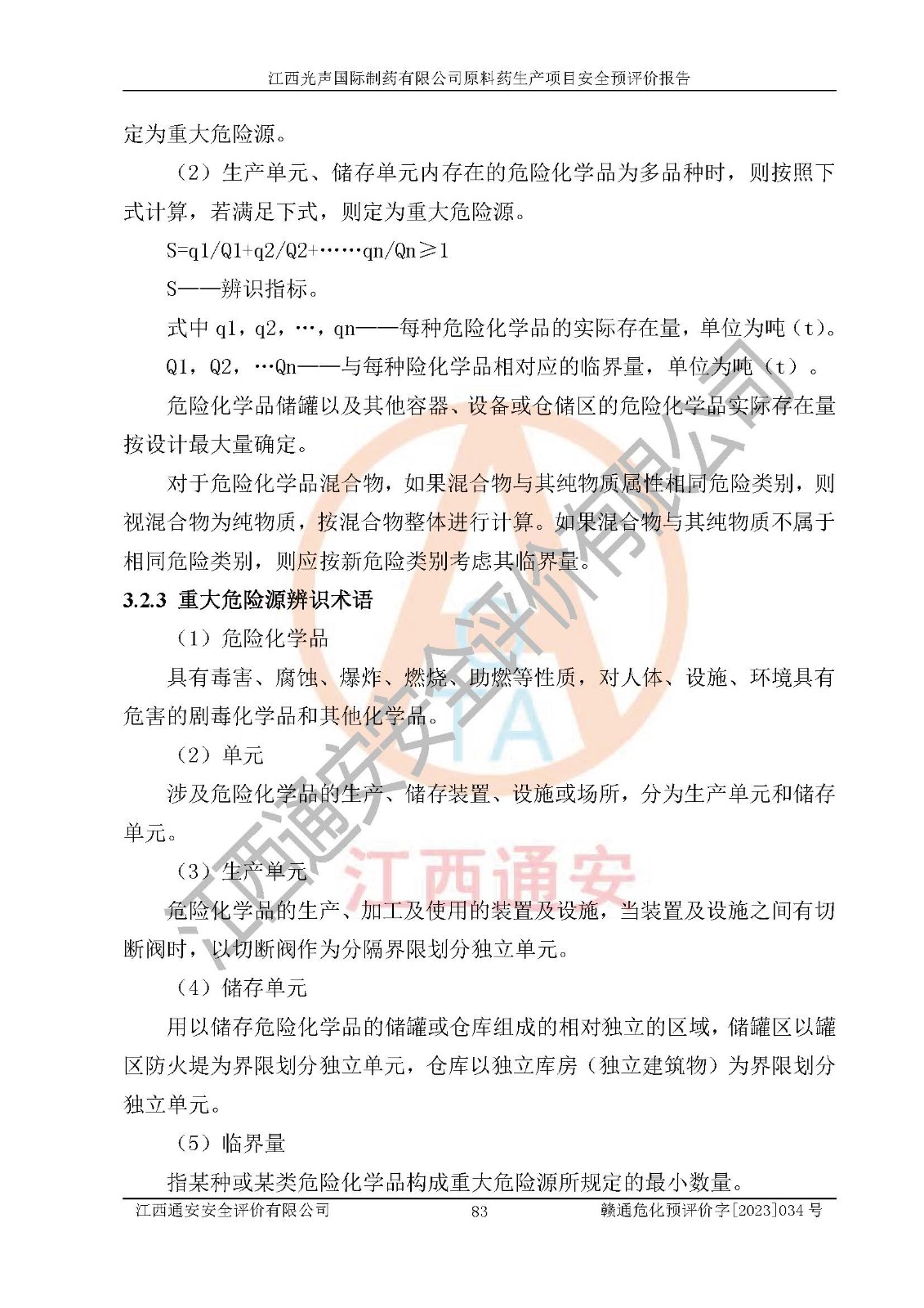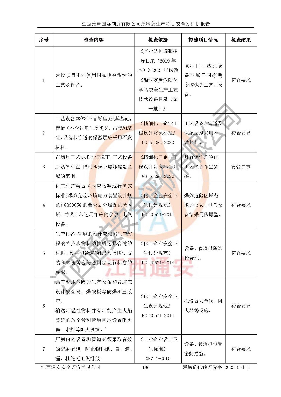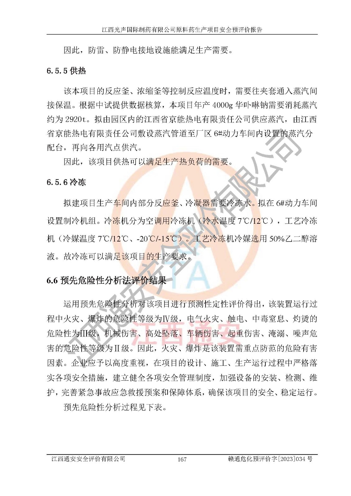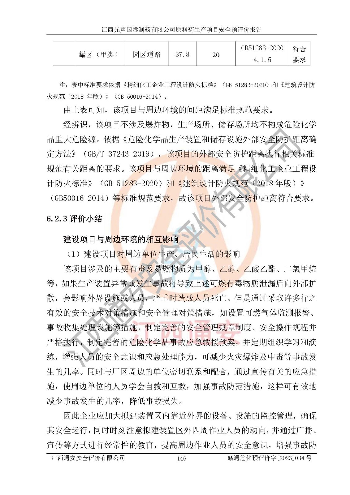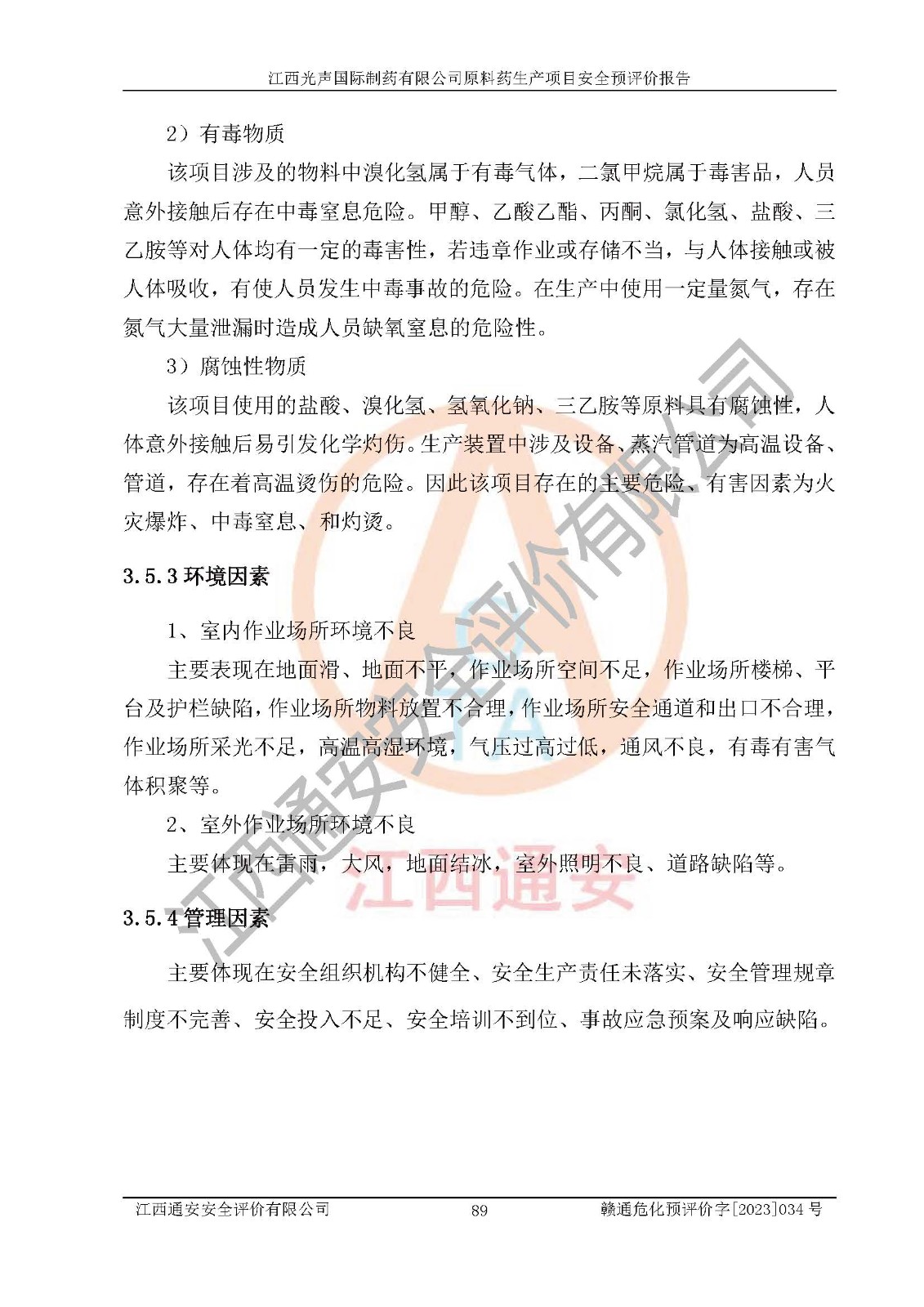 通過對江西光聲**制藥有限公司原料藥生產(chǎn)項目的危險、有害因素分析及定性、定量分析,結果為: 1、該建設項目中所涉及到的危險物質包括甲醇、乙醇、乙酸乙酯、**、三乙胺等易燃液體,在裝置運行和物料儲運過程中存在著易燃液體泄漏引發(fā)的火災爆炸危險;溴化氫屬于有毒氣體,二氯甲烷屬于毒害品,人員意外接觸后存在中毒窒息危險。另外,使用的鹽酸、溴化氫、氫氧化鈉、三乙胺等原料具有腐蝕性,人體意外接觸后易引發(fā)化學灼傷;同時該項目使用的反應釜、離心機、輸料泵等設備如操作不慎還會帶來機械傷害。因此,該項目在建成后的運行過程中存在火災與爆炸、中毒與窒息、觸電、機械傷害、高處墜落、物體打擊、**傷害、起重傷害、灼燙、淹溺、其他傷害等危險因素和化學因素、物理因素等有害因素。 2、重點防范的重大危險、有害因素:通過對該項目存在的危險、有害因素進行分析辨識,在生產(chǎn)過程中重點防范的重大危險、有害因素主要為火災與爆炸、中毒與窒息。 3、預先危險性分析法評價結果:該裝置運行過程中火災、爆炸的危險性等級為Ⅳ級,電氣火災、觸電、中毒窒息、灼燙的危險性為Ⅲ級,機械傷害、高處墜落、**傷害、起重傷害、淹溺、噪聲危害的危險性等級為Ⅱ級。因此,火災、爆炸是該裝置需重點防范的危險有害因素。而引發(fā)火災、爆炸的主要因素是甲醇、乙醇、乙酸乙酯以及三乙胺等可燃物質的泄漏及各類點火源的存在。企業(yè)在今后生產(chǎn)過程中,應將可燃物質的泄漏以及消除點火源做為重點加以控制。 4、危險度評價法的分析結果:該項目5#車間、8#車間、9#車間、罐區(qū)單元的危險等級分別為II級,屬中度危險;4#倉庫單元危險等級分別為Ⅲ級,屬低度危險。 5、重大危險源辨識結果:依據(jù)《危險化學品重大危險源辨識》(GB18218-2018),該擬建項目不構成危險化學品重大危險源。 6、根據(jù)**安全監(jiān)管總局辦公廳《關于公布首批重點監(jiān)管的危險化工工藝目錄的通知》(安監(jiān)總管三[2009]116號)和《**安全監(jiān)管總局關于公布第二批重點監(jiān)管危險化工工藝目錄和調(diào)整首批重點監(jiān)管危險化工工藝中部分典型工藝的通知》安監(jiān)總管三[2013]3號的規(guī)定,該擬建項目不涉及危險化工工藝。 7、特殊危險化學品辨識:該擬建項目涉及的甲醇、乙酸乙酯屬于重點監(jiān)管的危險化學品;擬建項目涉及的**、鹽酸屬于易制毒化學品,涉及的甲醇、乙醇屬于特別管控危險化學品,不涉及監(jiān)控化學品,不涉及易制爆化學品。 綜上所述:江西光聲**制藥有限公司原料藥生產(chǎn)項目符合**、省有關安全生產(chǎn)的法律法規(guī)、規(guī)章、標準、規(guī)范的要求,在以后的初步設計、施工圖設計和建設施工、安裝調(diào)試及生產(chǎn)運行中,如能嚴格執(zhí)行**有關安全生產(chǎn)法律、法規(guī)和有關標準、規(guī)范,認真采納本報告書中安全對策措施及建議,真正做到安全設施與主體工程同時設計、同時施工、同時投入生產(chǎn)和使用的“三同時”,工程的危險、有害因素可得到**控制,風險在可接受范圍內(nèi),具有**的本質安全水平;本建設項目從安全方面分析可行。 |
