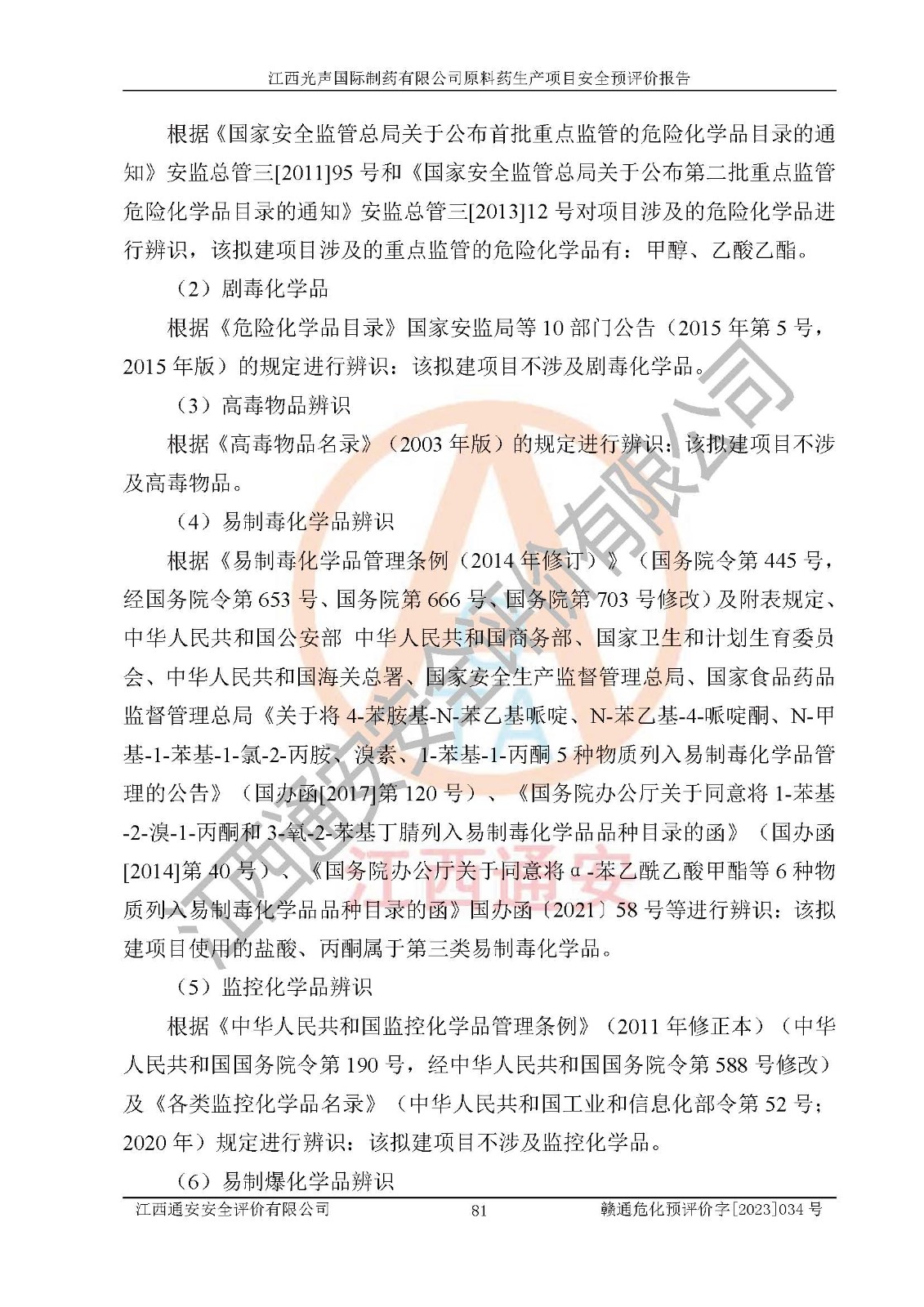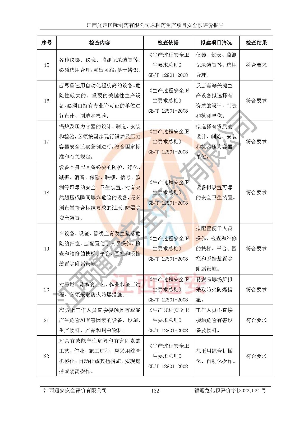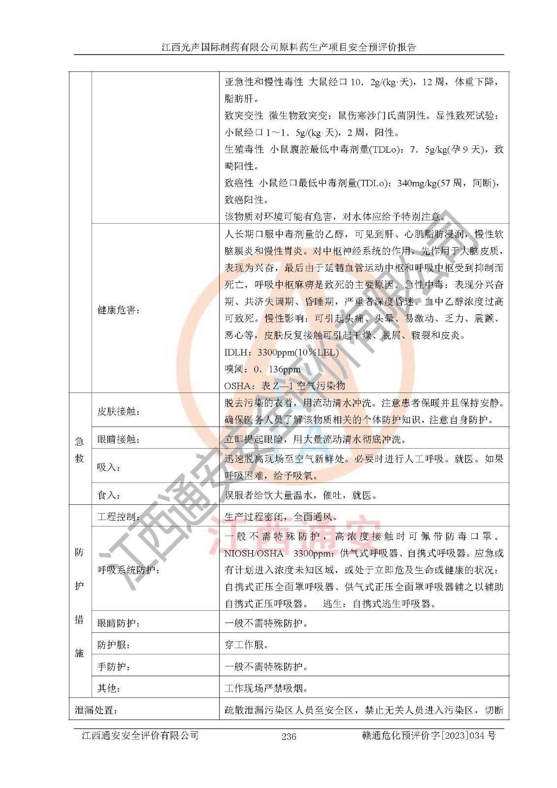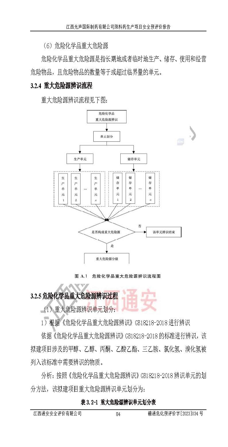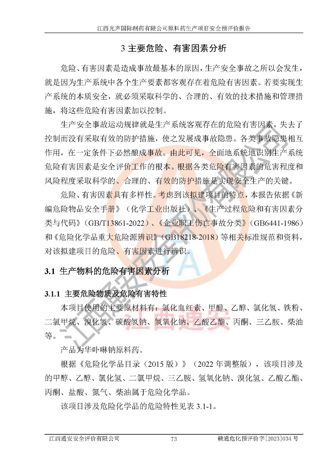 通過對江西光聲**制藥有限公司原料藥生產(chǎn)項目的危險、有害因素分析及定性、定量分析,結果為: 1、該建設項目中所涉及到的危險物質包括甲醇、乙醇、乙酸乙酯、**、三乙胺等易燃液體,在裝置運行和物料儲運過程中存在著易燃液體泄漏引發(fā)的火災爆炸危險;溴化氫屬于有毒氣體,二氯甲烷屬于毒害品,人員意外接觸后存在中毒窒息危險。另外,使用的鹽酸、溴化氫、氫氧化鈉、三乙胺等原料具有腐蝕性,人體意外接觸后易引發(fā)化學灼傷;同時該項目使用的反應釜、離心機、輸料泵等設備如操作不慎還會帶來機械傷害。因此,該項目在建成后的運行過程中存在火災與爆炸、中毒與窒息、觸電、機械傷害、高處墜落、物體打擊、**傷害、起重傷害、灼燙、淹溺、其他傷害等危險因素和化學因素、物理因素等有害因素。 2、重點防范的重大危險、有害因素:通過對該項目存在的危險、有害因素進行分析辨識,在生產(chǎn)過程中重點防范的重大危險、有害因素主要為火災與爆炸、中毒與窒息。 3、預先危險性分析法評價結果:該裝置運行過程中火災、爆炸的危險性等級為Ⅳ級,電氣火災、觸電、中毒窒息、灼燙的危險性為Ⅲ級,機械傷害、高處墜落、**傷害、起重傷害、淹溺、噪聲危害的危險性等級為Ⅱ級。因此,火災、爆炸是該裝置需重點防范的危險有害因素。而引發(fā)火災、爆炸的主要因素是甲醇、乙醇、乙酸乙酯以及三乙胺等可燃物質的泄漏及各類點火源的存在。企業(yè)在今后生產(chǎn)過程中,應將可燃物質的泄漏以及消除點火源做為重點加以控制。 4、危險度評價法的分析結果:該項目5#車間、8#車間、9#車間、罐區(qū)單元的危險等級分別為II級,屬中度危險;4#倉庫單元危險等級分別為Ⅲ級,屬低度危險。 5、重大危險源辨識結果:依據(jù)《危險化學品重大危險源辨識》(GB18218-2018),該擬建項目不構成危險化學品重大危險源。 6、根據(jù)**安全監(jiān)管總局辦公廳《關于公布首批重點監(jiān)管的危險化工工藝目錄的通知》(安監(jiān)總管三[2009]116號)和《**安全監(jiān)管總局關于公布第二批重點監(jiān)管危險化工工藝目錄和調(diào)整首批重點監(jiān)管危險化工工藝中部分典型工藝的通知》安監(jiān)總管三[2013]3號的規(guī)定,該擬建項目不涉及危險化工工藝。 7、特殊危險化學品辨識:該擬建項目涉及的甲醇、乙酸乙酯屬于重點監(jiān)管的危險化學品;擬建項目涉及的**、鹽酸屬于易制毒化學品,涉及的甲醇、乙醇屬于特別管控危險化學品,不涉及監(jiān)控化學品,不涉及易制爆化學品。 綜上所述:江西光聲**制藥有限公司原料藥生產(chǎn)項目符合**、省有關安全生產(chǎn)的法律法規(guī)、規(guī)章、標準、規(guī)范的要求,在以后的初步設計、施工圖設計和建設施工、安裝調(diào)試及生產(chǎn)運行中,如能嚴格執(zhí)行**有關安全生產(chǎn)法律、法規(guī)和有關標準、規(guī)范,認真采納本報告書中安全對策措施及建議,真正做到安全設施與主體工程同時設計、同時施工、同時投入生產(chǎn)和使用的“三同時”,工程的危險、有害因素可得到**控制,風險在可接受范圍內(nèi),具有**的本質安全水平;本建設項目從安全方面分析可行。 |