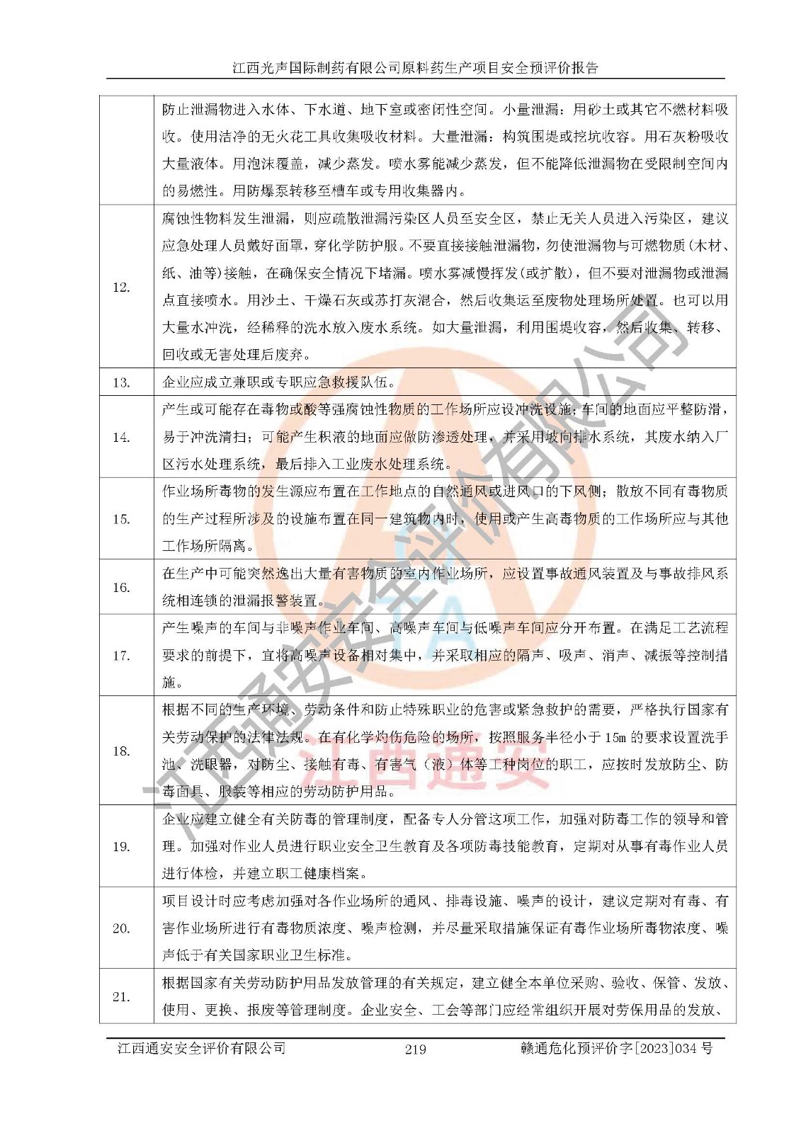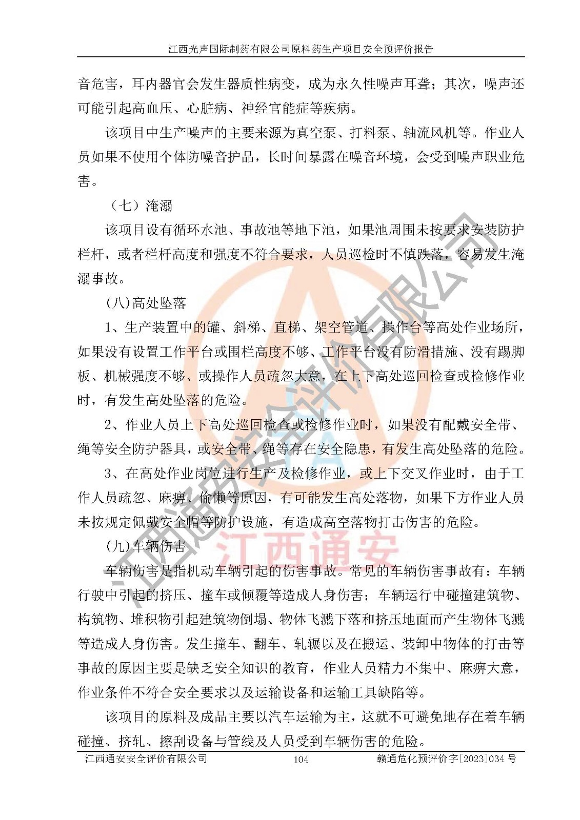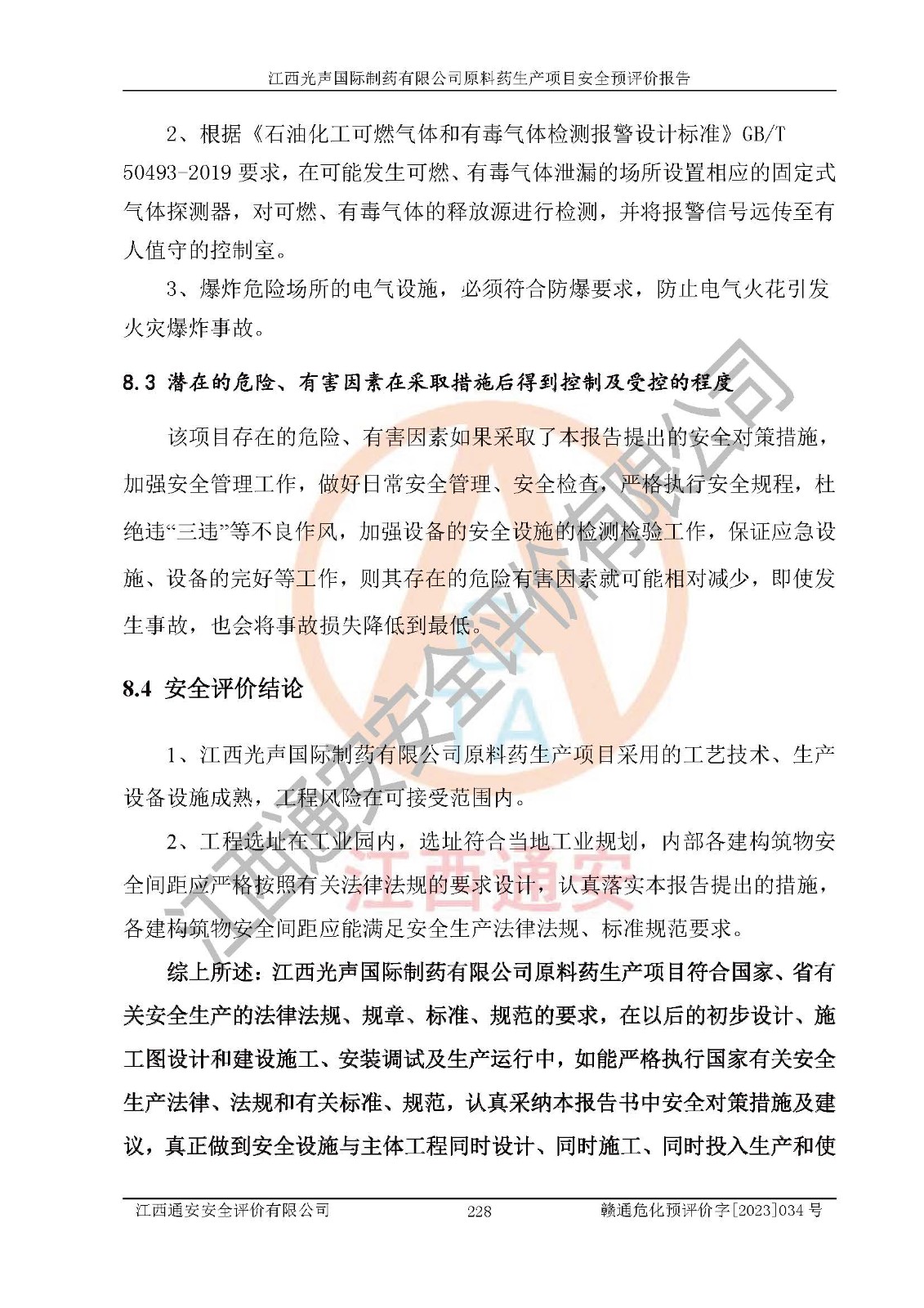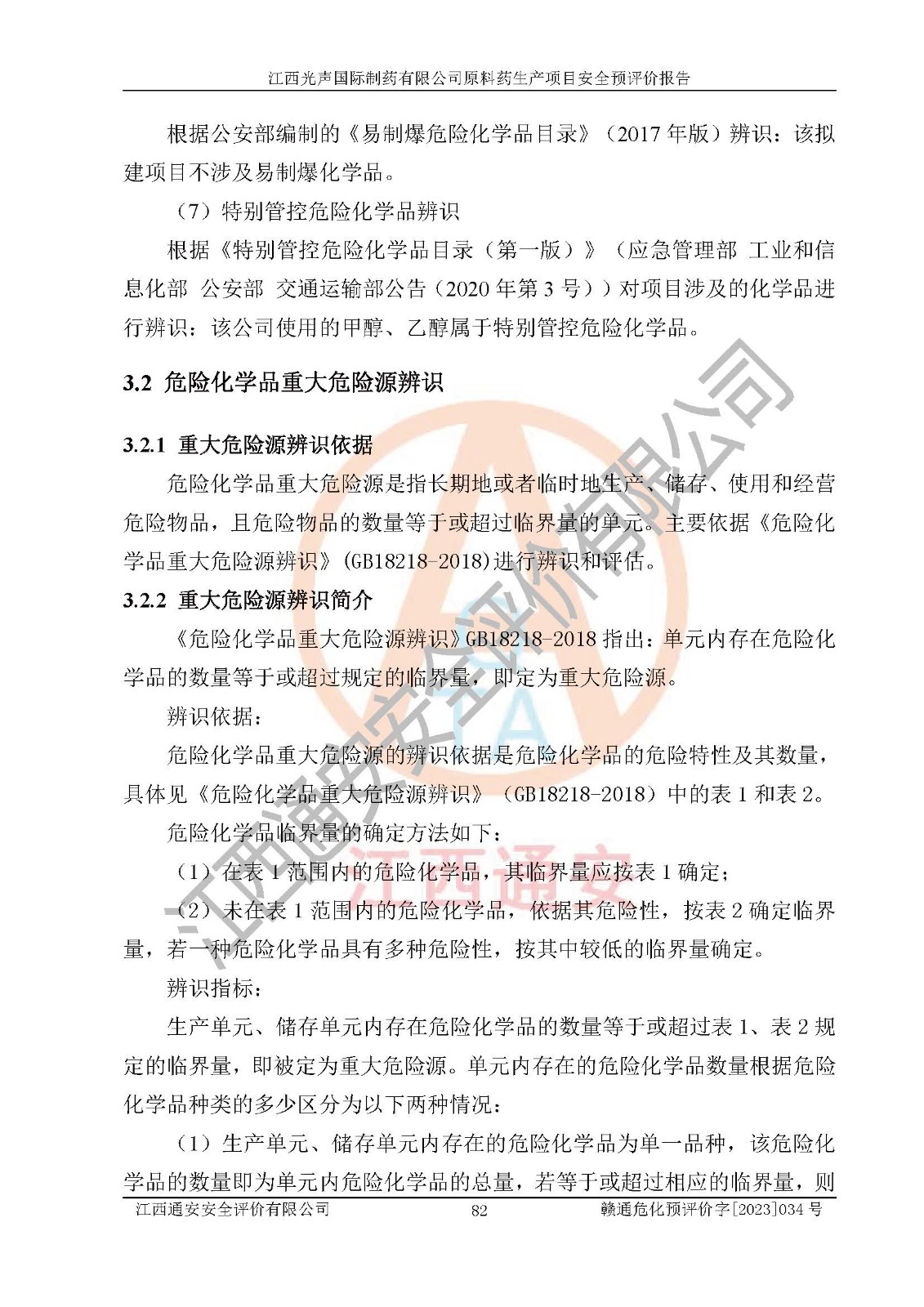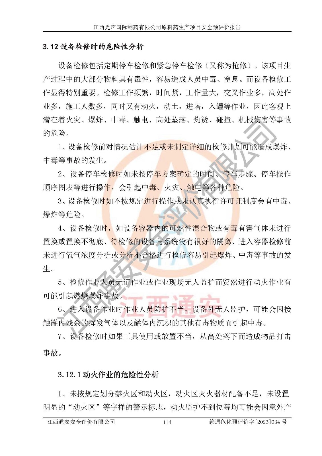 通過對江西光聲**制藥有限公司原料藥生產(chǎn)項目的危險、有害因素分析及定性、定量分析,結果為: 1、該建設項目中所涉及到的危險物質包括甲醇、乙醇、乙酸乙酯、**、三乙胺等易燃液體,在裝置運行和物料儲運過程中存在著易燃液體泄漏引發(fā)的火災爆炸危險;溴化氫屬于有毒氣體,二氯甲烷屬于毒害品,人員意外接觸后存在中毒窒息危險。另外,使用的鹽酸、溴化氫、氫氧化鈉、三乙胺等原料具有腐蝕性,人體意外接觸后易引發(fā)化學灼傷;同時該項目使用的反應釜、離心機、輸料泵等設備如操作不慎還會帶來機械傷害。因此,該項目在建成后的運行過程中存在火災與爆炸、中毒與窒息、觸電、機械傷害、高處墜落、物體打擊、**傷害、起重傷害、灼燙、淹溺、其他傷害等危險因素和化學因素、物理因素等有害因素。 2、重點防范的重大危險、有害因素:通過對該項目存在的危險、有害因素進行分析辨識,在生產(chǎn)過程中重點防范的重大危險、有害因素主要為火災與爆炸、中毒與窒息。 3、預先危險性分析法評價結果:該裝置運行過程中火災、爆炸的危險性等級為Ⅳ級,電氣火災、觸電、中毒窒息、灼燙的危險性為Ⅲ級,機械傷害、高處墜落、**傷害、起重傷害、淹溺、噪聲危害的危險性等級為Ⅱ級。因此,火災、爆炸是該裝置需重點防范的危險有害因素。而引發(fā)火災、爆炸的主要因素是甲醇、乙醇、乙酸乙酯以及三乙胺等可燃物質的泄漏及各類點火源的存在。企業(yè)在今后生產(chǎn)過程中,應將可燃物質的泄漏以及消除點火源做為重點加以控制。 4、危險度評價法的分析結果:該項目5#車間、8#車間、9#車間、罐區(qū)單元的危險等級分別為II級,屬中度危險;4#倉庫單元危險等級分別為Ⅲ級,屬低度危險。 5、重大危險源辨識結果:依據(jù)《危險化學品重大危險源辨識》(GB18218-2018),該擬建項目不構成危險化學品重大危險源。 6、根據(jù)**安全監(jiān)管總局辦公廳《關于公布首批重點監(jiān)管的危險化工工藝目錄的通知》(安監(jiān)總管三[2009]116號)和《**安全監(jiān)管總局關于公布第二批重點監(jiān)管危險化工工藝目錄和調(diào)整首批重點監(jiān)管危險化工工藝中部分典型工藝的通知》安監(jiān)總管三[2013]3號的規(guī)定,該擬建項目不涉及危險化工工藝。 7、特殊危險化學品辨識:該擬建項目涉及的甲醇、乙酸乙酯屬于重點監(jiān)管的危險化學品;擬建項目涉及的**、鹽酸屬于易制毒化學品,涉及的甲醇、乙醇屬于特別管控危險化學品,不涉及監(jiān)控化學品,不涉及易制爆化學品。 綜上所述:江西光聲**制藥有限公司原料藥生產(chǎn)項目符合**、省有關安全生產(chǎn)的法律法規(guī)、規(guī)章、標準、規(guī)范的要求,在以后的初步設計、施工圖設計和建設施工、安裝調(diào)試及生產(chǎn)運行中,如能嚴格執(zhí)行**有關安全生產(chǎn)法律、法規(guī)和有關標準、規(guī)范,認真采納本報告書中安全對策措施及建議,真正做到安全設施與主體工程同時設計、同時施工、同時投入生產(chǎn)和使用的“三同時”,工程的危險、有害因素可得到**控制,風險在可接受范圍內(nèi),具有**的本質安全水平;本建設項目從安全方面分析可行。 |