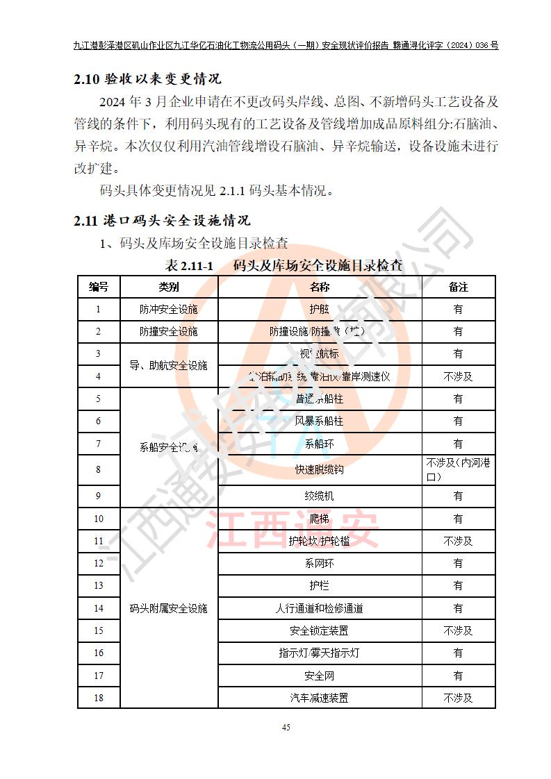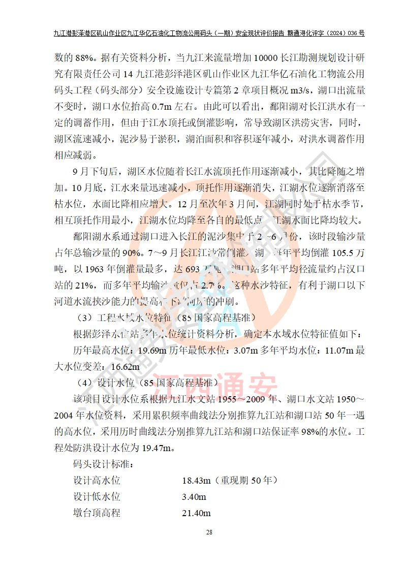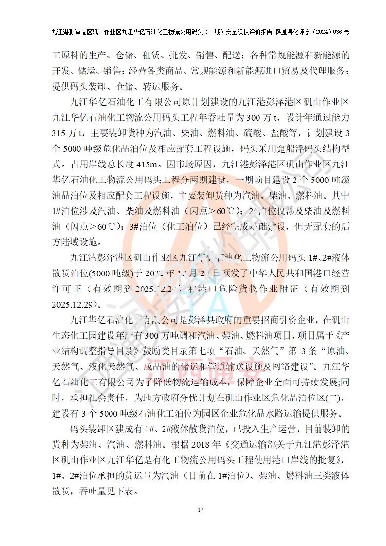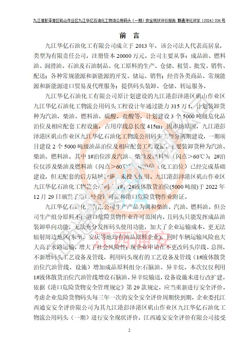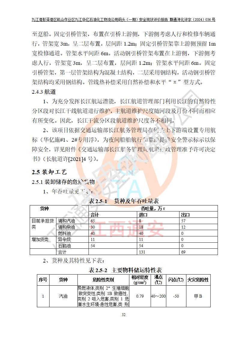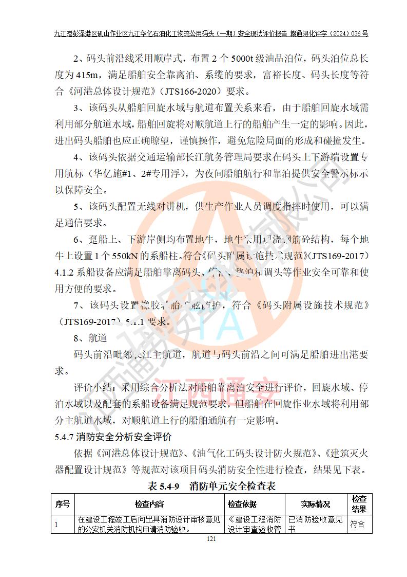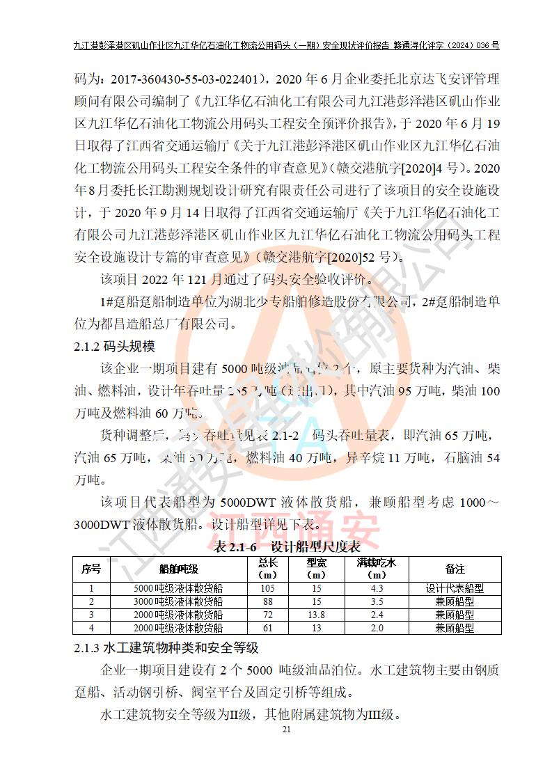 九江港彭澤港區(qū)磯山作業(yè)區(qū)九江華億石油化工物流公用碼頭(一期) 安全現(xiàn)狀評價報告