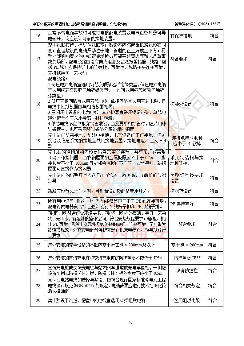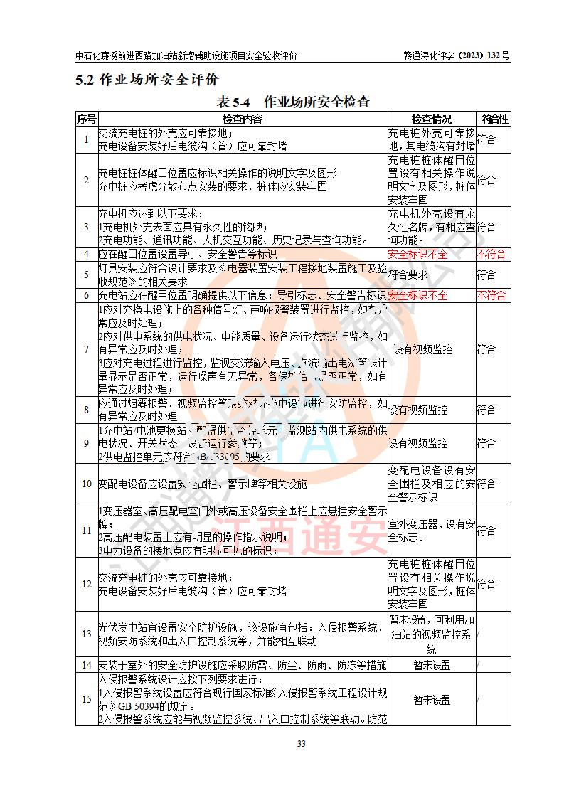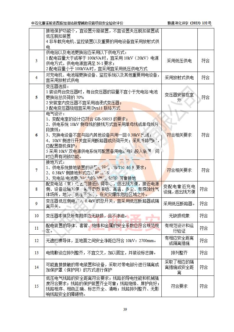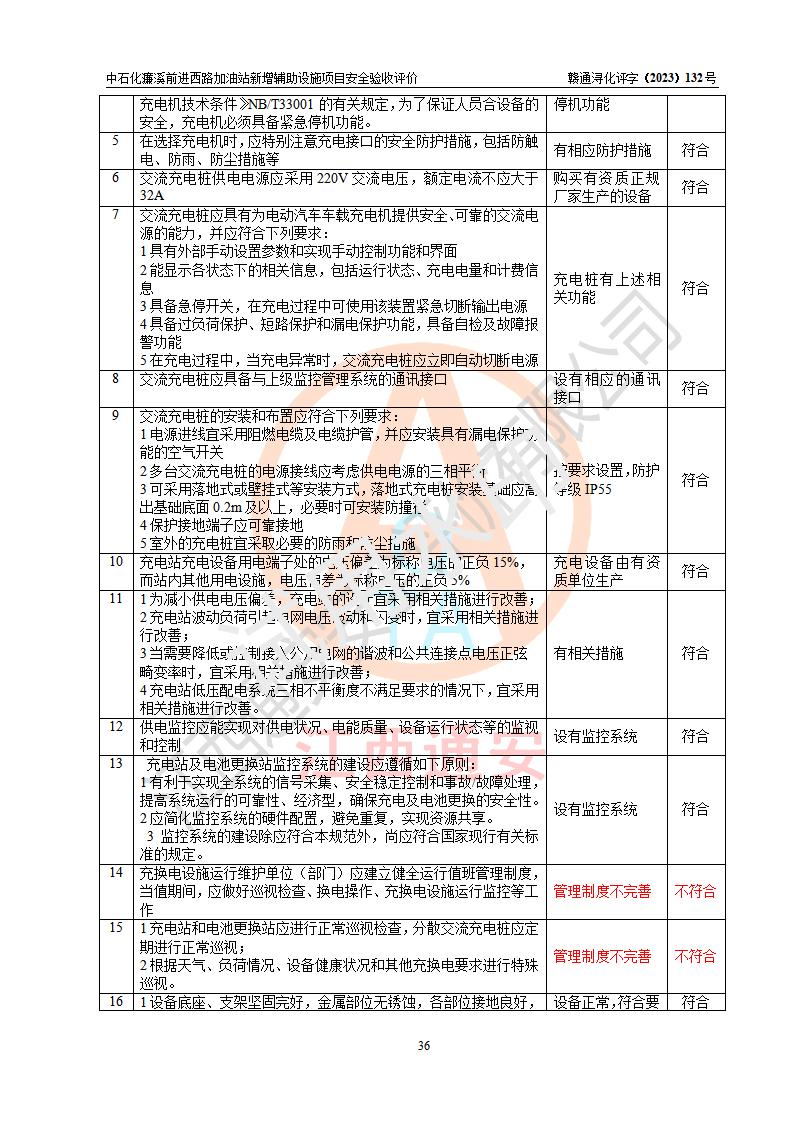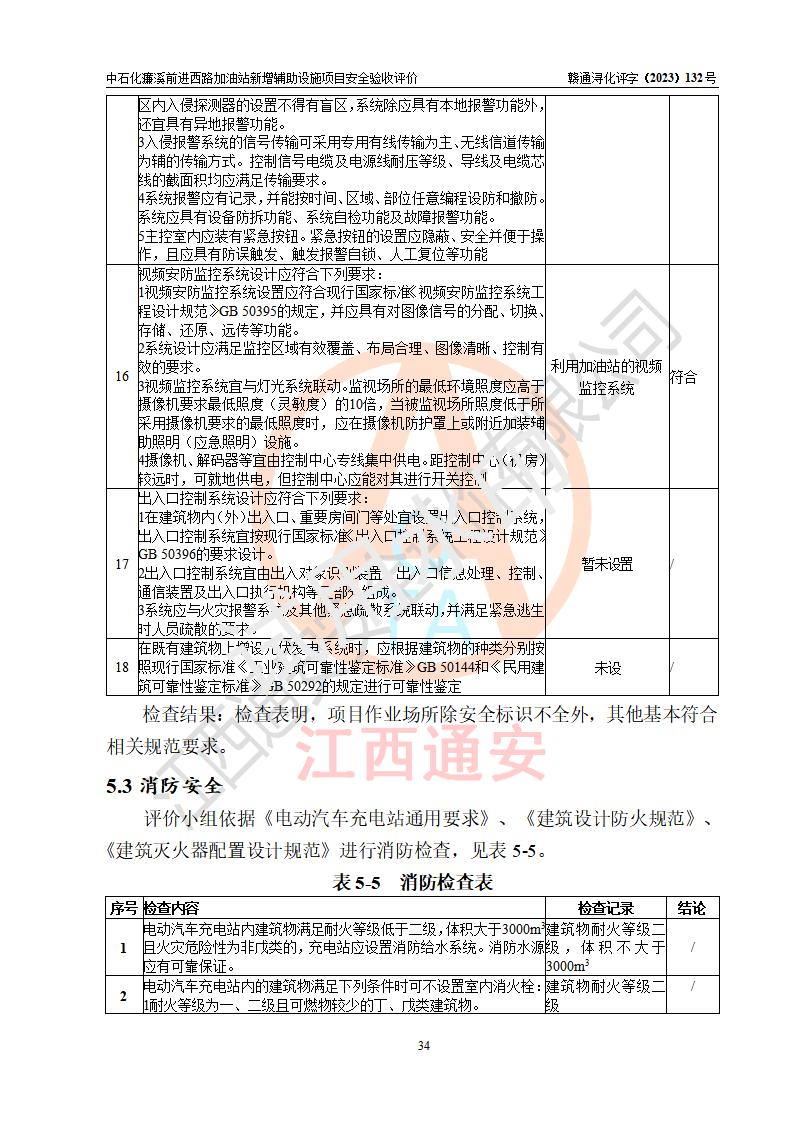 評(píng)價(jià)結(jié)論 | 中國石化銷售股份有限公司江西九江濂溪石油分公司前進(jìn)西路加油站新增輔助設(shè)施項(xiàng)目涉及的安全條件、安全生產(chǎn)條件、安全生產(chǎn)管理符合《電動(dòng)汽車充電站設(shè)計(jì)規(guī)范》、《汽車加油加氣加氫站技術(shù)標(biāo)準(zhǔn)》等**有關(guān)法規(guī)、標(biāo)準(zhǔn)、規(guī)范要求,能滿足經(jīng)營單位的安全條件,具備項(xiàng)目竣工驗(yàn)收的條件。 | |||