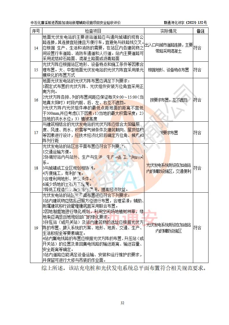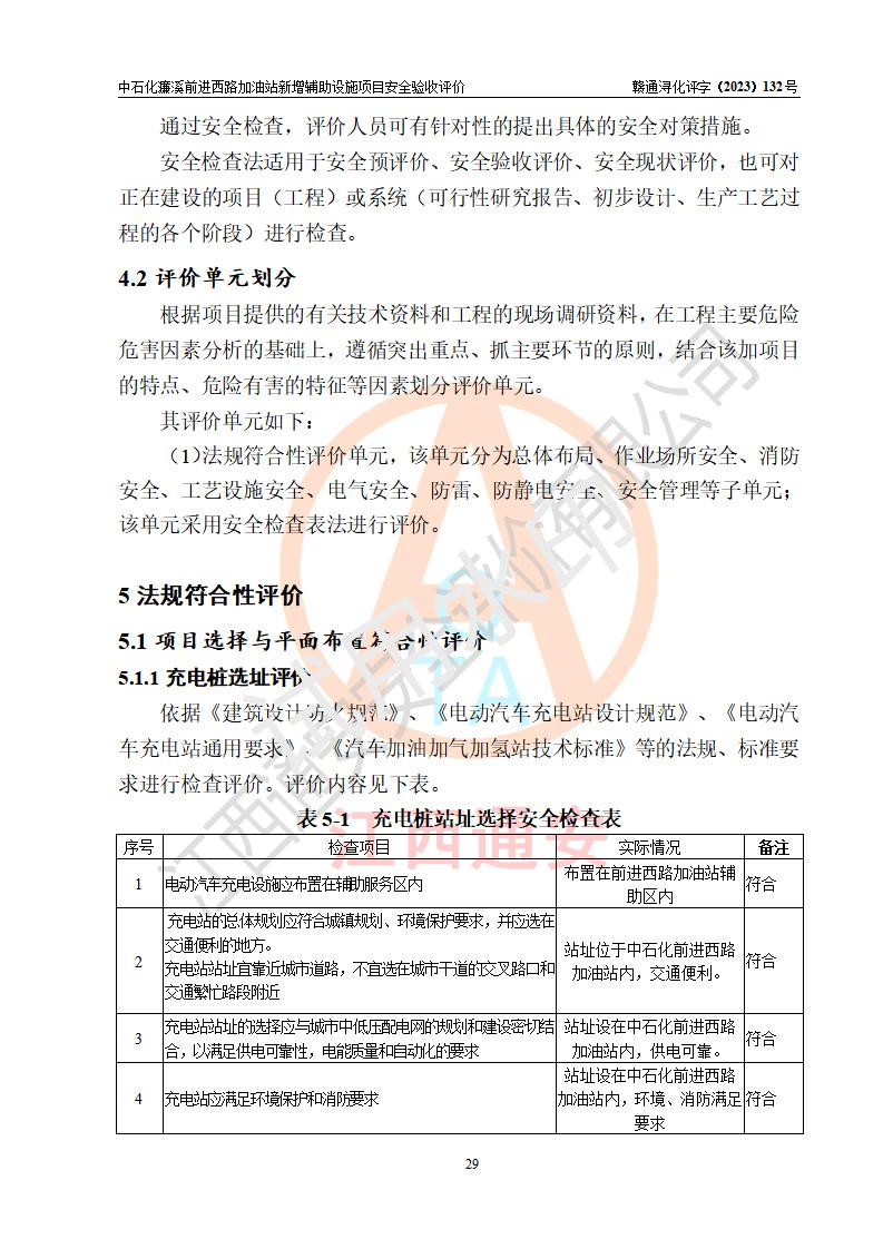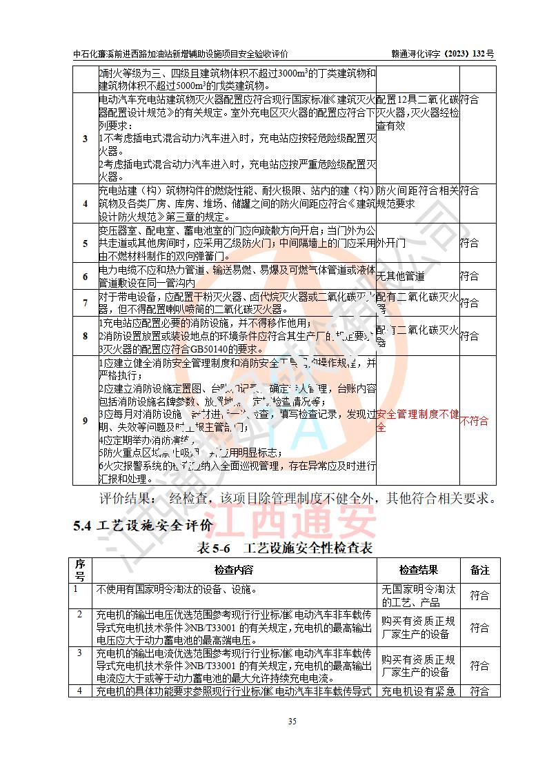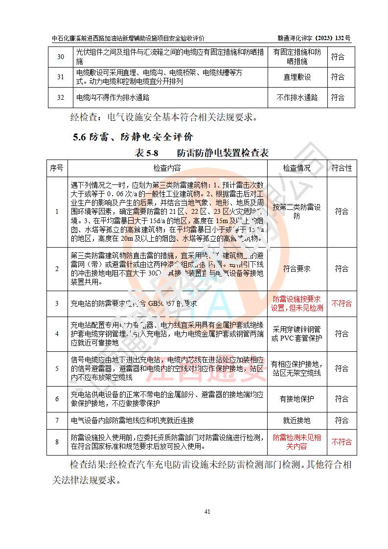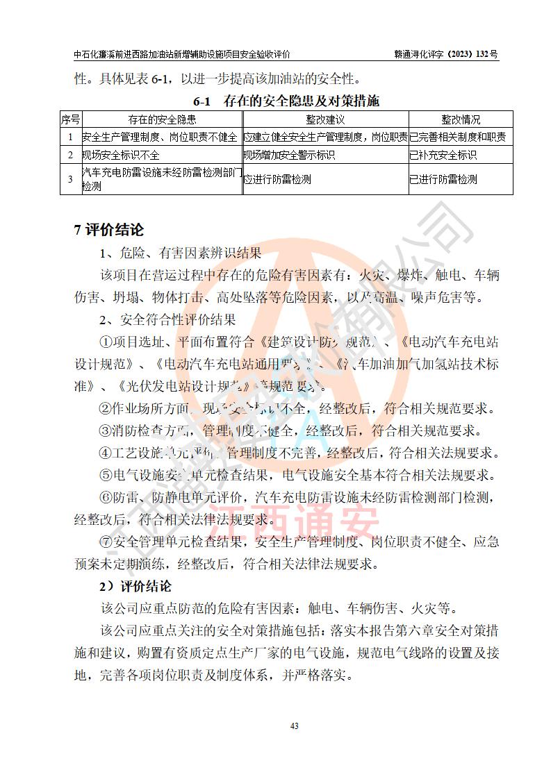 評(píng)價(jià)結(jié)論 | 中國石化銷售股份有限公司江西九江濂溪石油分公司前進(jìn)西路加油站新增輔助設(shè)施項(xiàng)目涉及的安全條件、安全生產(chǎn)條件、安全生產(chǎn)管理符合《電動(dòng)汽車充電站設(shè)計(jì)規(guī)范》、《汽車加油加氣加氫站技術(shù)標(biāo)準(zhǔn)》等**有關(guān)法規(guī)、標(biāo)準(zhǔn)、規(guī)范要求,能滿足經(jīng)營單位的安全條件,具備項(xiàng)目竣工驗(yàn)收的條件。 | |||