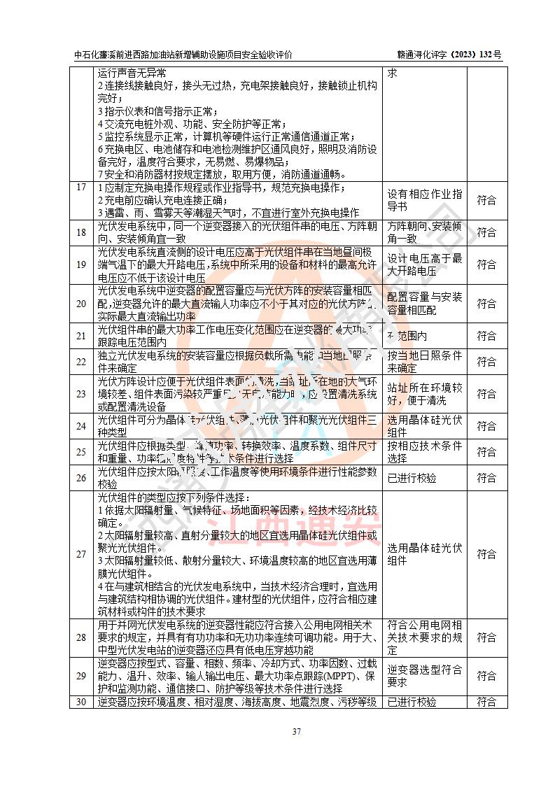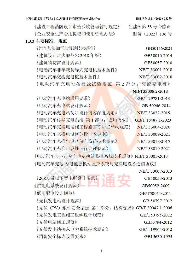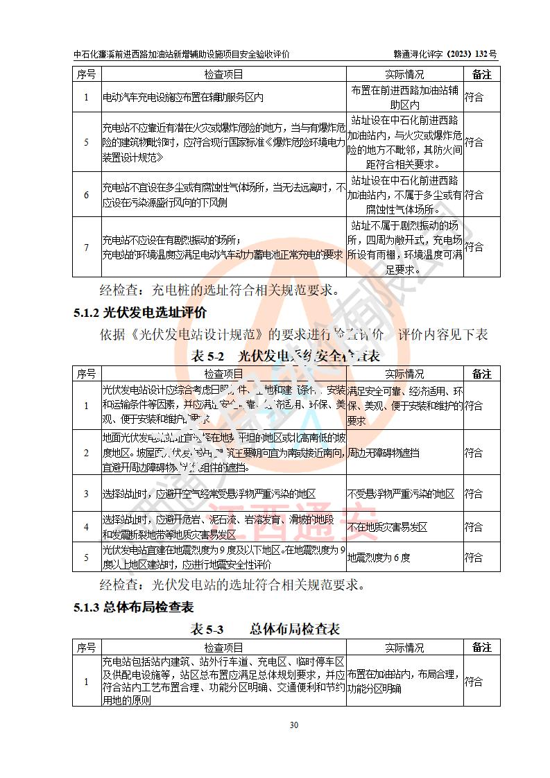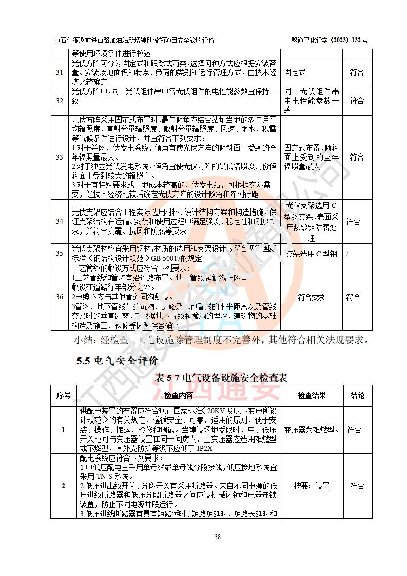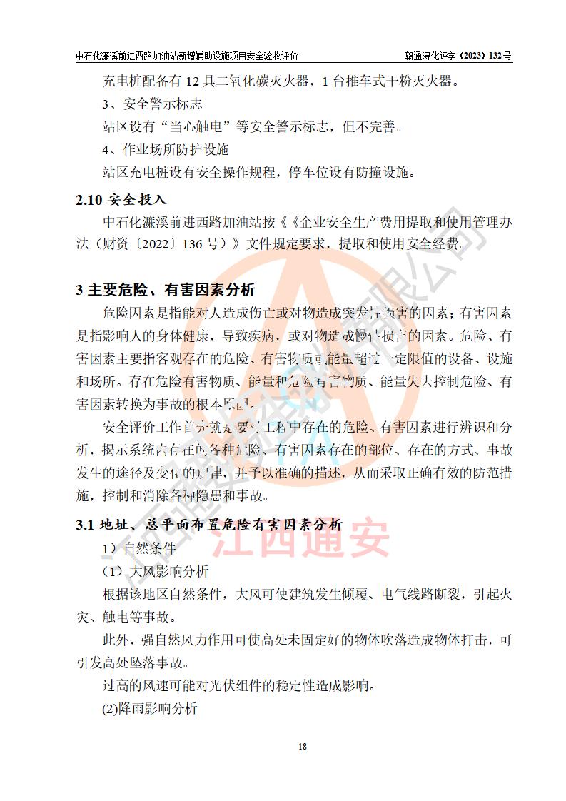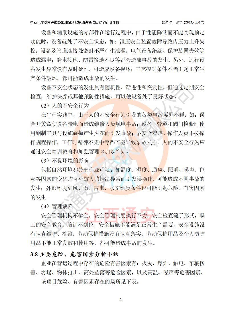 評(píng)價(jià)結(jié)論 | 中國石化銷售股份有限公司江西九江濂溪石油分公司前進(jìn)西路加油站新增輔助設(shè)施項(xiàng)目涉及的安全條件、安全生產(chǎn)條件、安全生產(chǎn)管理符合《電動(dòng)汽車充電站設(shè)計(jì)規(guī)范》、《汽車加油加氣加氫站技術(shù)標(biāo)準(zhǔn)》等**有關(guān)法規(guī)、標(biāo)準(zhǔn)、規(guī)范要求,能滿足經(jīng)營單位的安全條件,具備項(xiàng)目竣工驗(yàn)收的條件。 | |||