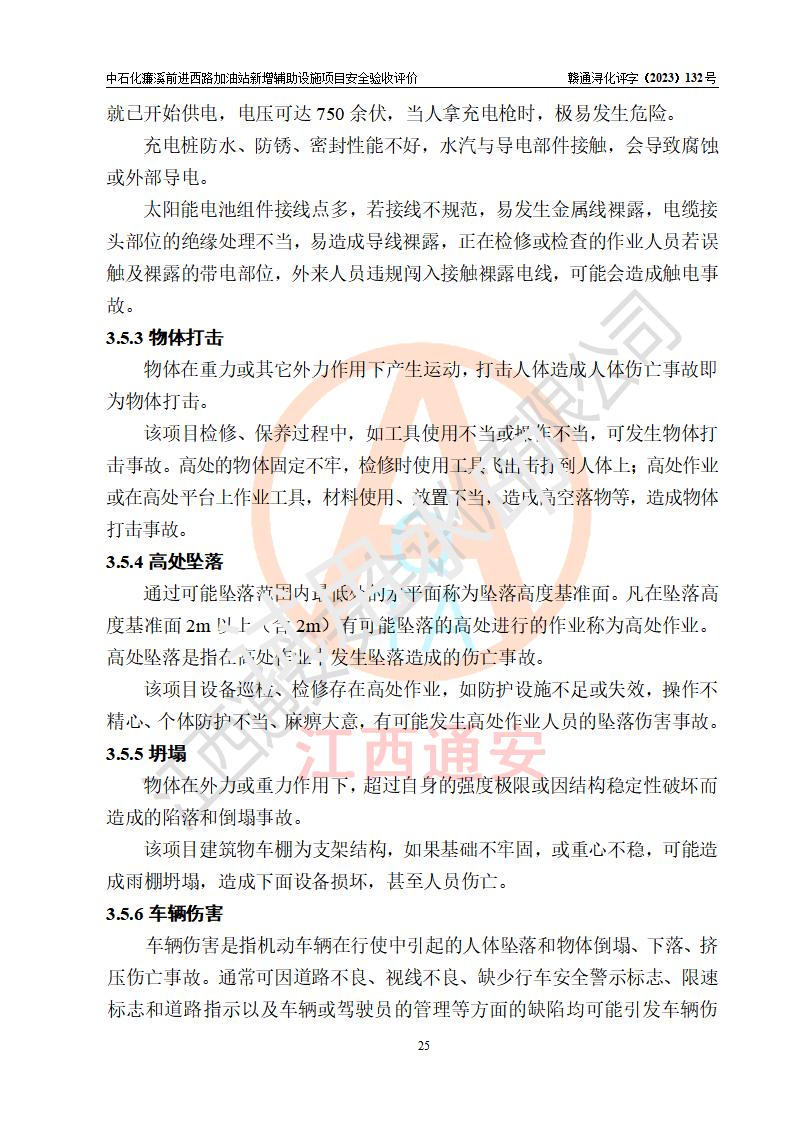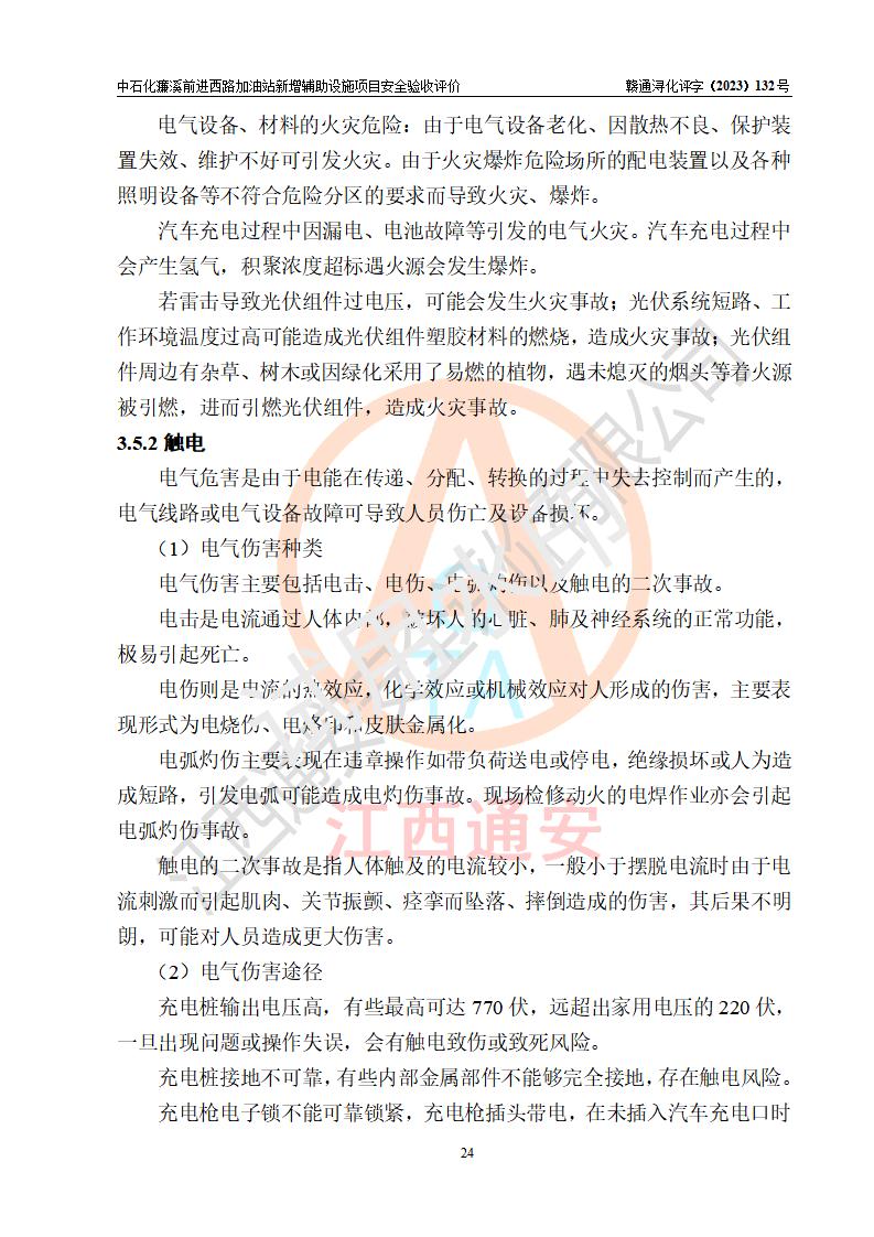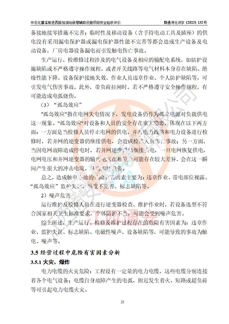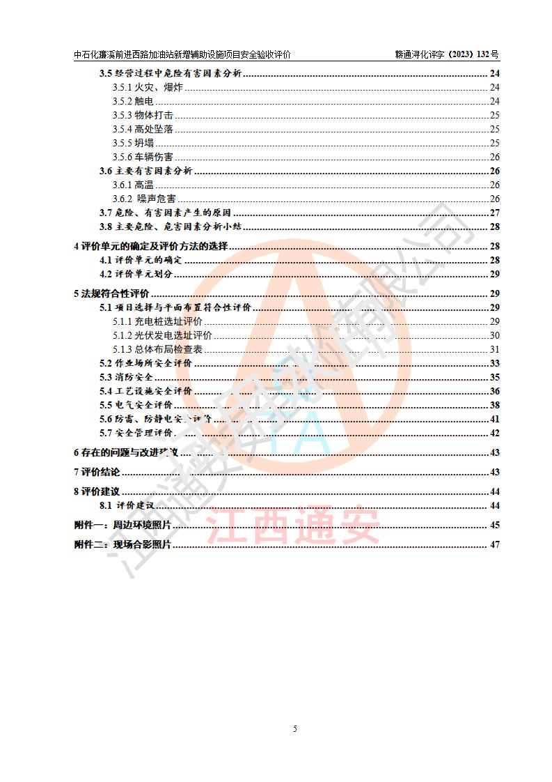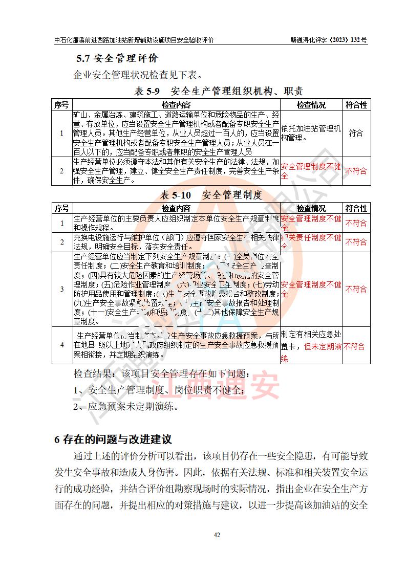 評(píng)價(jià)結(jié)論 | 中國石化銷售股份有限公司江西九江濂溪石油分公司前進(jìn)西路加油站新增輔助設(shè)施項(xiàng)目涉及的安全條件、安全生產(chǎn)條件、安全生產(chǎn)管理符合《電動(dòng)汽車充電站設(shè)計(jì)規(guī)范》、《汽車加油加氣加氫站技術(shù)標(biāo)準(zhǔn)》等**有關(guān)法規(guī)、標(biāo)準(zhǔn)、規(guī)范要求,能滿足經(jīng)營單位的安全條件,具備項(xiàng)目竣工驗(yàn)收的條件。 | |||