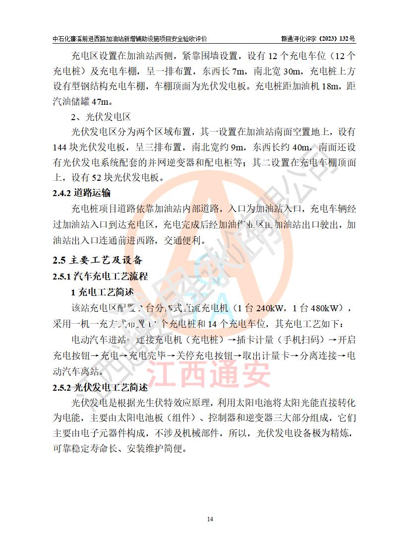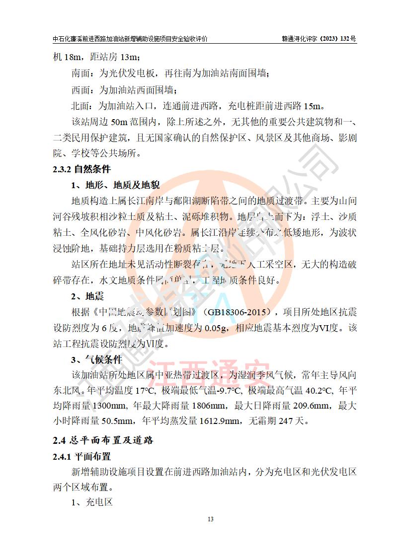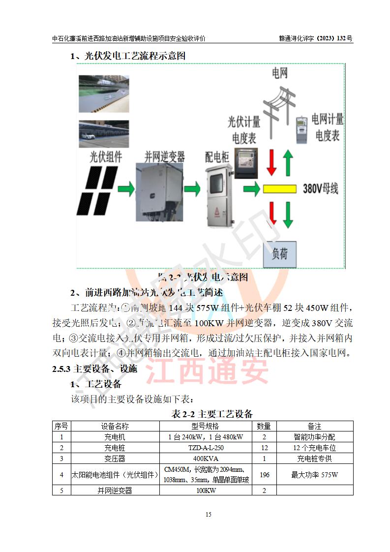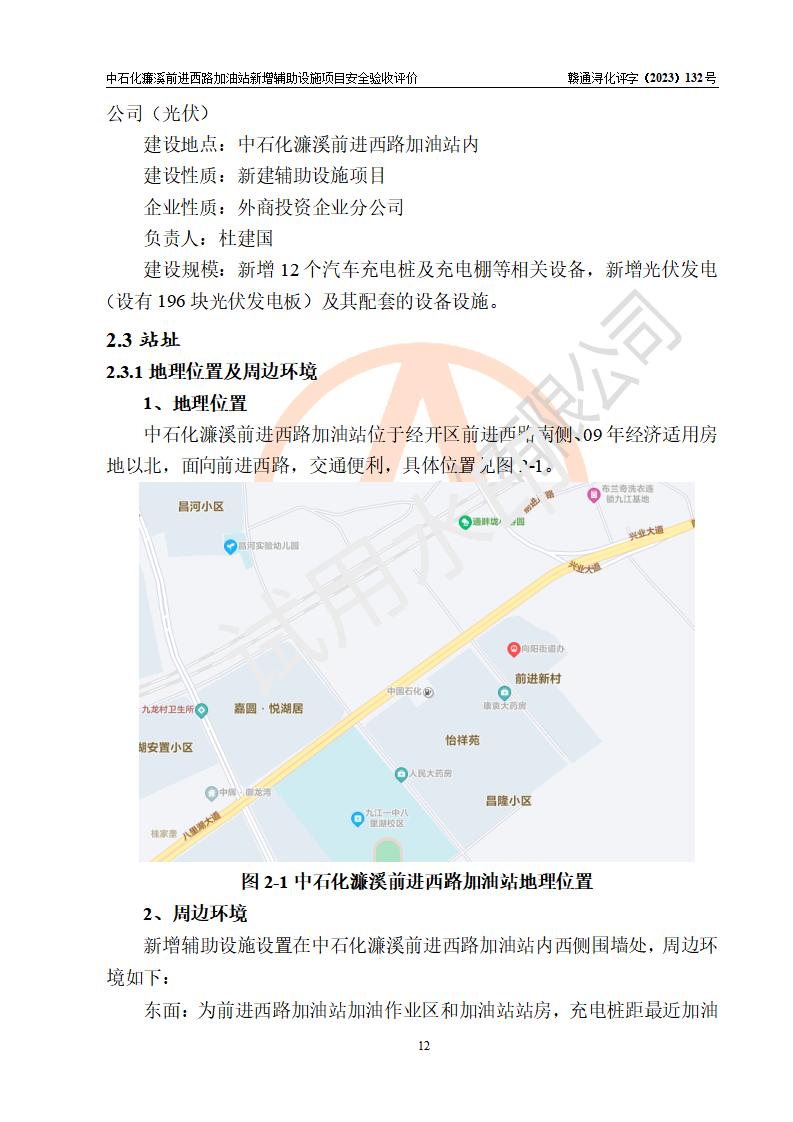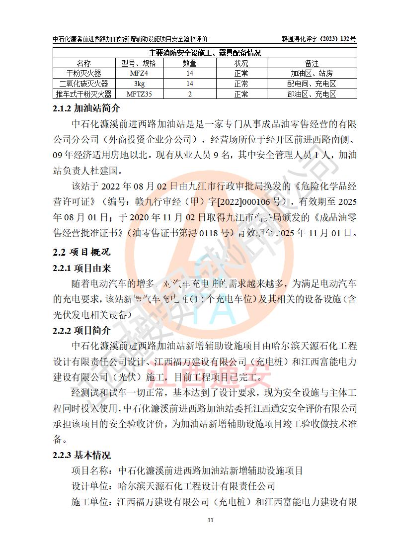 項(xiàng)目簡介 | 中國石化銷售股份有限公司江西九江濂溪石油分公司前進(jìn)西路加油站是一家專門從事成品油零售經(jīng)營的有限公司分公司(外商投資企業(yè)分公司),經(jīng)營場(chǎng)所位于江西省九江市經(jīng)開區(qū)前進(jìn)西路南側(cè)、09年經(jīng)濟(jì)適用房地以北?,F(xiàn)有從業(yè)人員9名,其中安全管理人員1人,加油站負(fù)責(zé)人杜建國。 該站于2022年08月02日由九江市行政審批局換發(fā)的《危險(xiǎn)化學(xué)品經(jīng)營許可證》(編號(hào):贛九行審經(jīng)(甲)字[2022]000106號(hào)),**期至2025年08月01日;于2020年11月02日取得九江市商務(wù)局頒發(fā)的《成品油零售經(jīng)營批準(zhǔn)證書》(油零售證書第潯0118號(hào))**期至2025年11月01日。 隨著電動(dòng)汽車的增多,對(duì)汽車充電樁的需求越來越多,為滿足電動(dòng)汽車的充電要求,該站新增汽車充電樁(12個(gè)充電車位)及其相關(guān)的設(shè)備設(shè)施,新增196塊光伏發(fā)電板及其相關(guān)的設(shè)備設(shè)施。 | |||