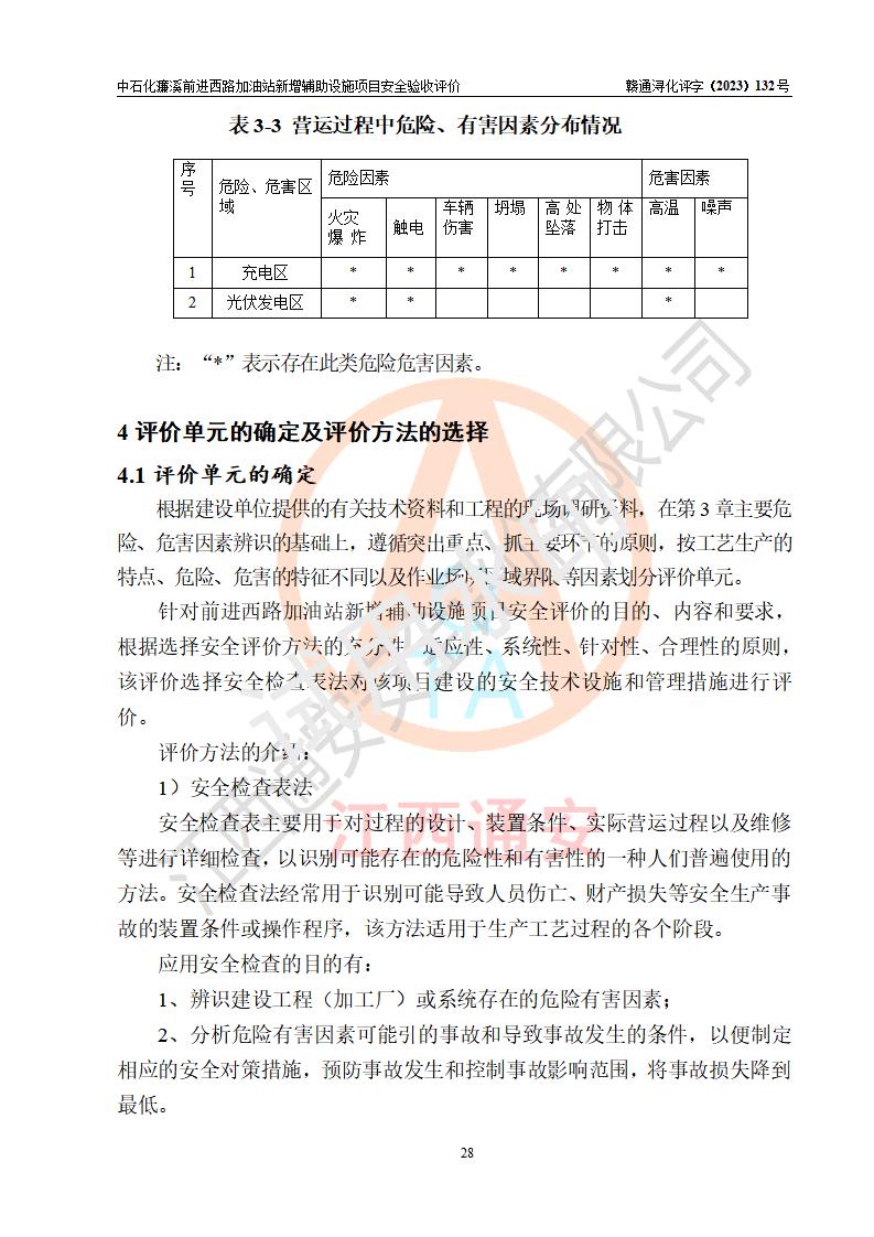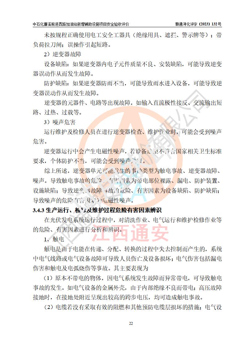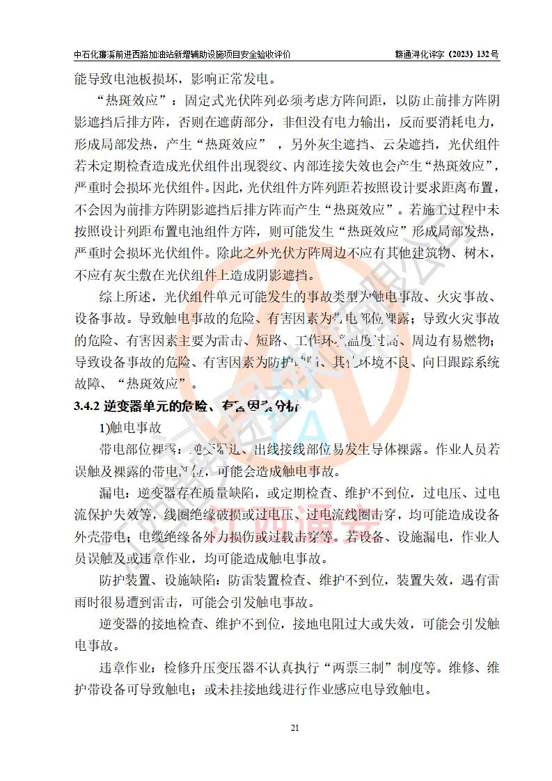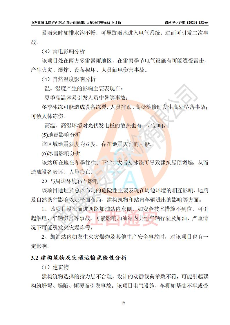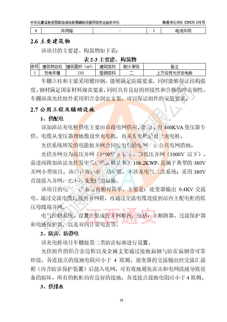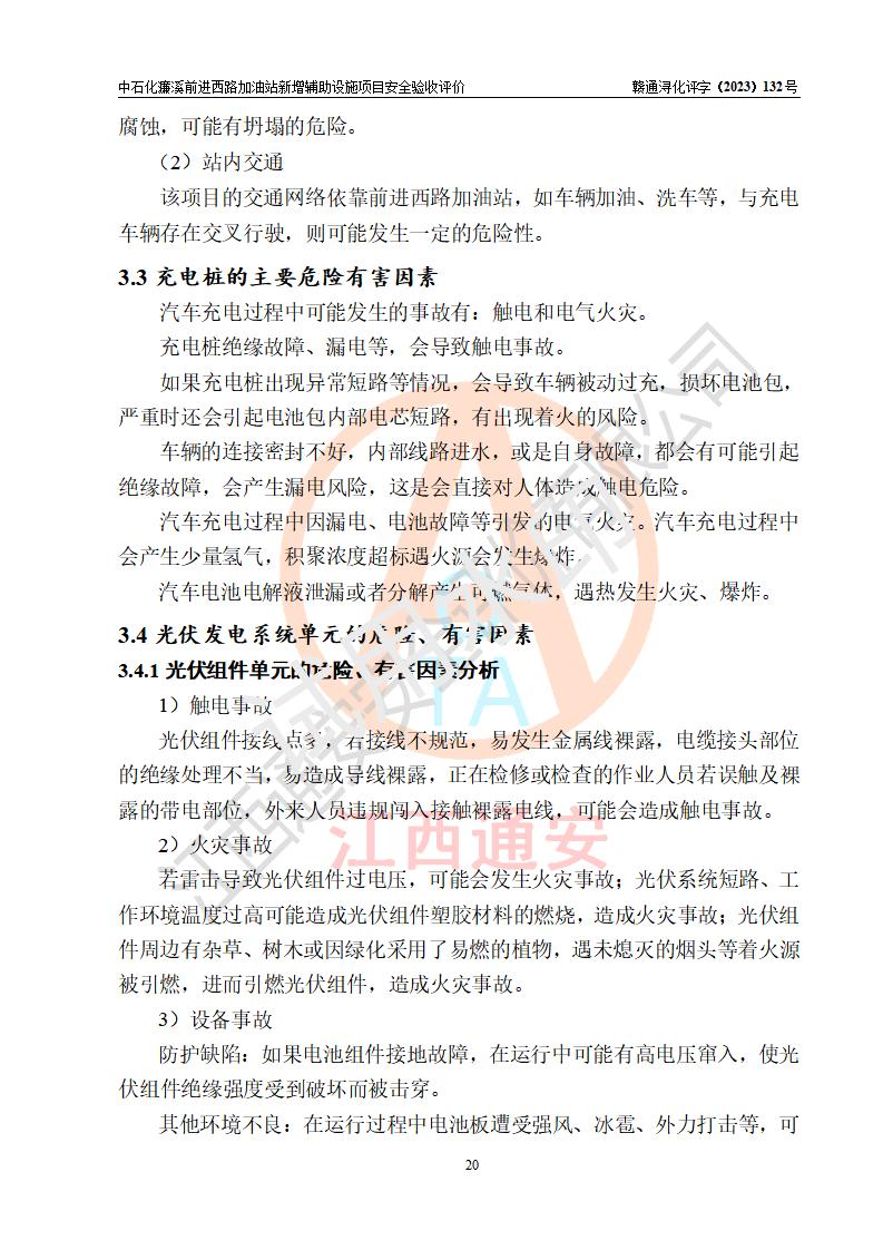 項(xiàng)目簡介 | 中國石化銷售股份有限公司江西九江濂溪石油分公司前進(jìn)西路加油站是一家專門從事成品油零售經(jīng)營的有限公司分公司(外商投資企業(yè)分公司),經(jīng)營場(chǎng)所位于江西省九江市經(jīng)開區(qū)前進(jìn)西路南側(cè)、09年經(jīng)濟(jì)適用房地以北?,F(xiàn)有從業(yè)人員9名,其中安全管理人員1人,加油站負(fù)責(zé)人杜建國。 該站于2022年08月02日由九江市行政審批局換發(fā)的《危險(xiǎn)化學(xué)品經(jīng)營許可證》(編號(hào):贛九行審經(jīng)(甲)字[2022]000106號(hào)),**期至2025年08月01日;于2020年11月02日取得九江市商務(wù)局頒發(fā)的《成品油零售經(jīng)營批準(zhǔn)證書》(油零售證書第潯0118號(hào))**期至2025年11月01日。 隨著電動(dòng)汽車的增多,對(duì)汽車充電樁的需求越來越多,為滿足電動(dòng)汽車的充電要求,該站新增汽車充電樁(12個(gè)充電車位)及其相關(guān)的設(shè)備設(shè)施,新增196塊光伏發(fā)電板及其相關(guān)的設(shè)備設(shè)施。 | |||