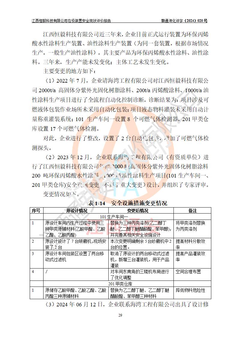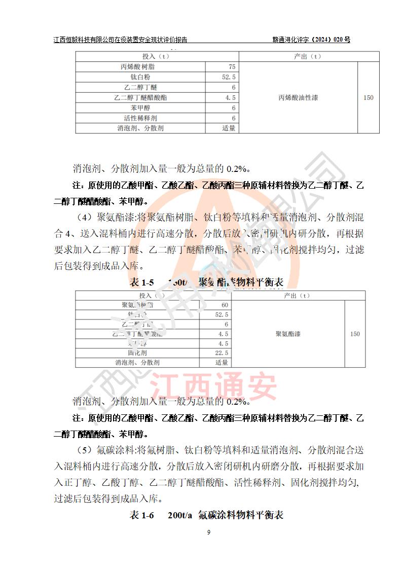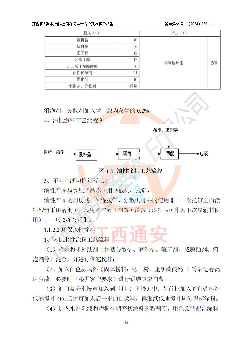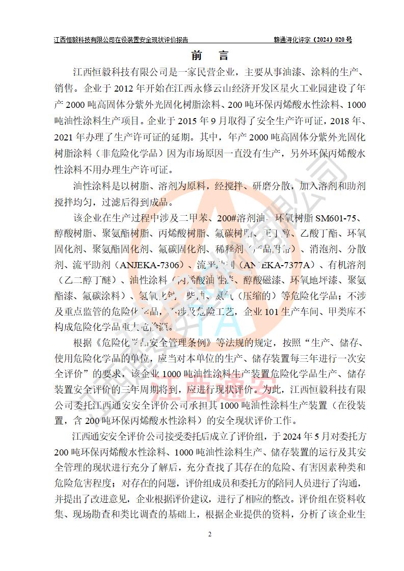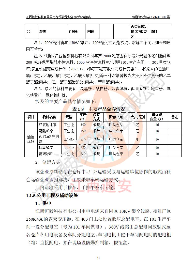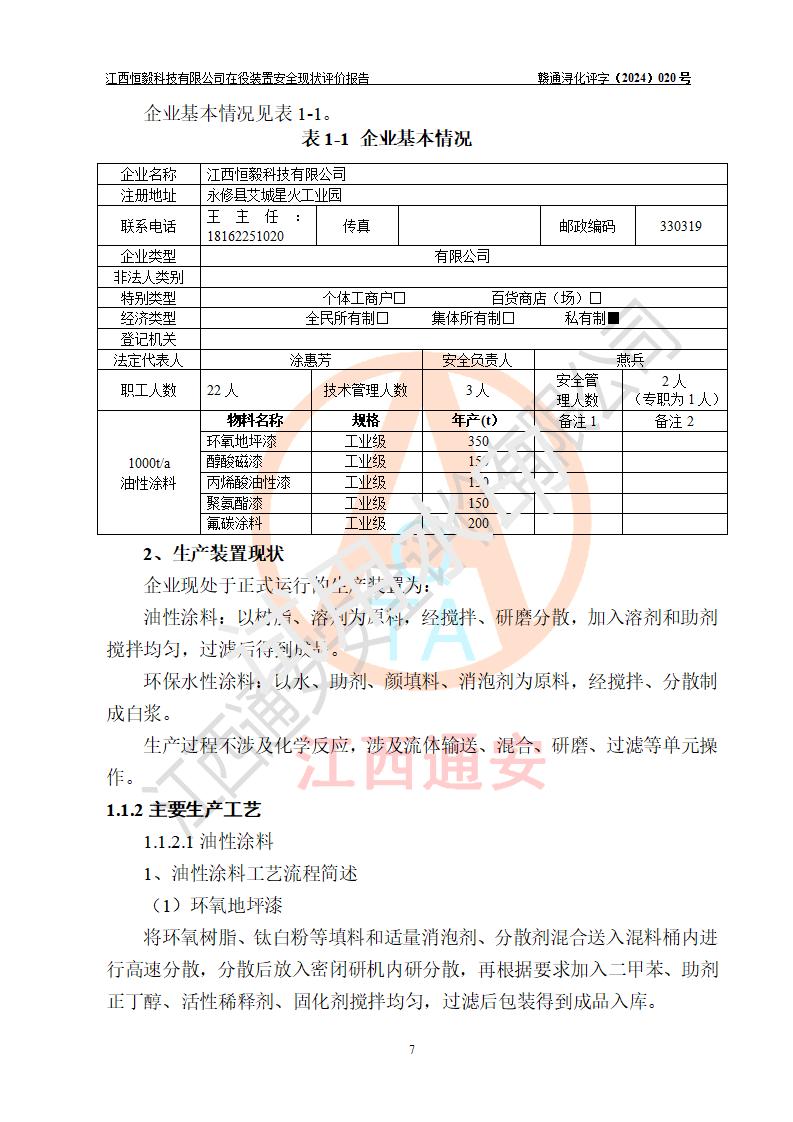 項(xiàng)目簡介 | 江西恒毅科技有限公司是一家民營企業(yè),主要從事油漆、涂料的生產(chǎn)、銷售。企業(yè)于2012年在江西永修云山經(jīng)濟(jì)開發(fā)區(qū)星火工業(yè)園建設(shè)年產(chǎn)2000噸高固體分紫外光固化樹脂涂料、200噸**丙烯酸水性涂料、1000噸油性涂料生產(chǎn)裝置。企業(yè)于2015年12月取得了安全生產(chǎn)許可證;2018年、2021年辦理了延期。其中,年產(chǎn)2000噸高固體分紫外光固化樹脂涂料(非危險(xiǎn)化學(xué)品)因?yàn)槭袌?chǎng)原因一直沒有生產(chǎn),本報(bào)告不予以介紹、評(píng)價(jià)。企業(yè)**丙烯酸水性涂料根據(jù)市場(chǎng)情況生產(chǎn)(有業(yè)務(wù)單需求才生產(chǎn)),一般生產(chǎn)油性涂料,很少生產(chǎn)**丙烯酸水性涂料,**丙烯酸水性涂料不用辦理生產(chǎn)許可證。 | ||||